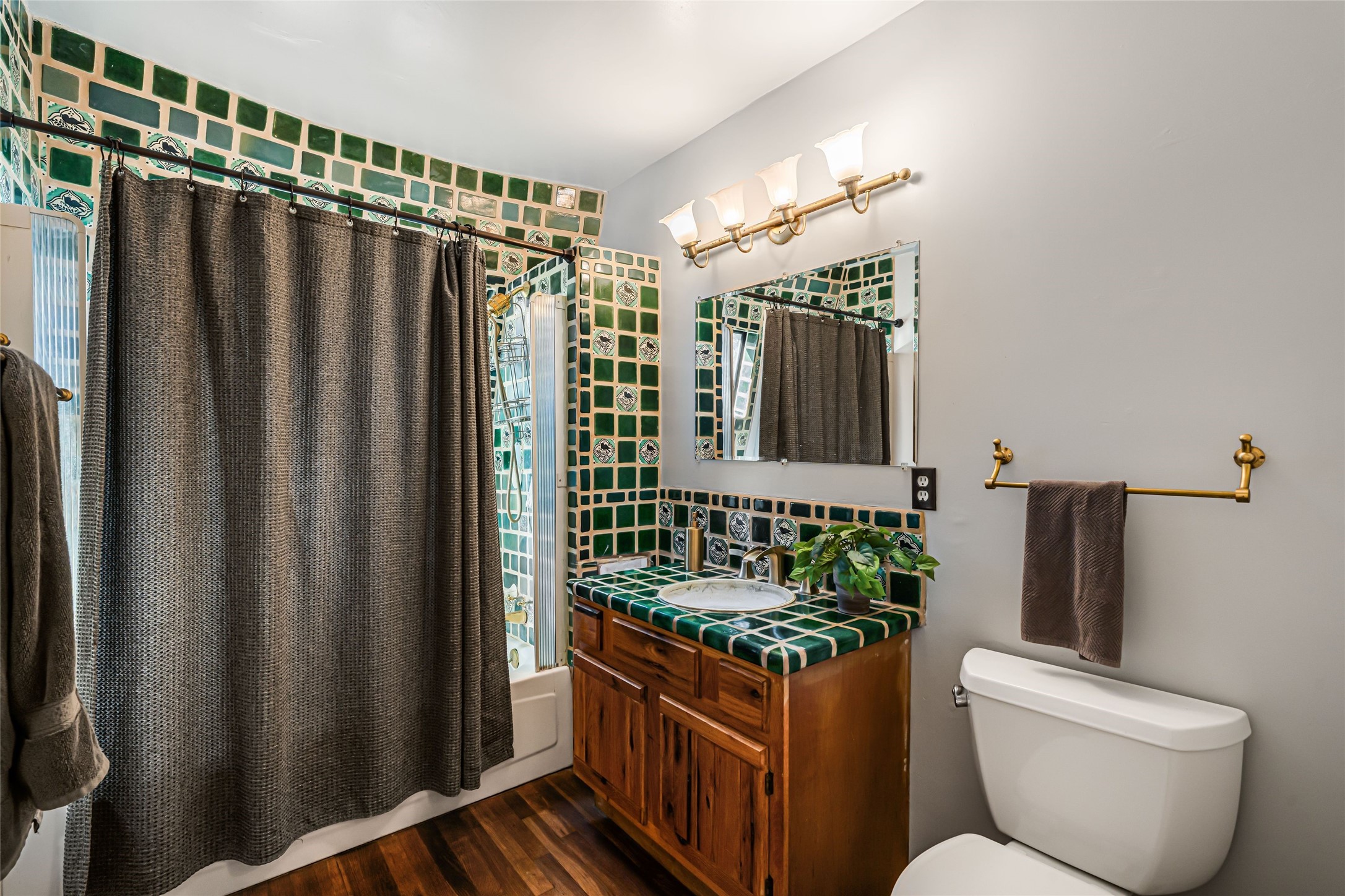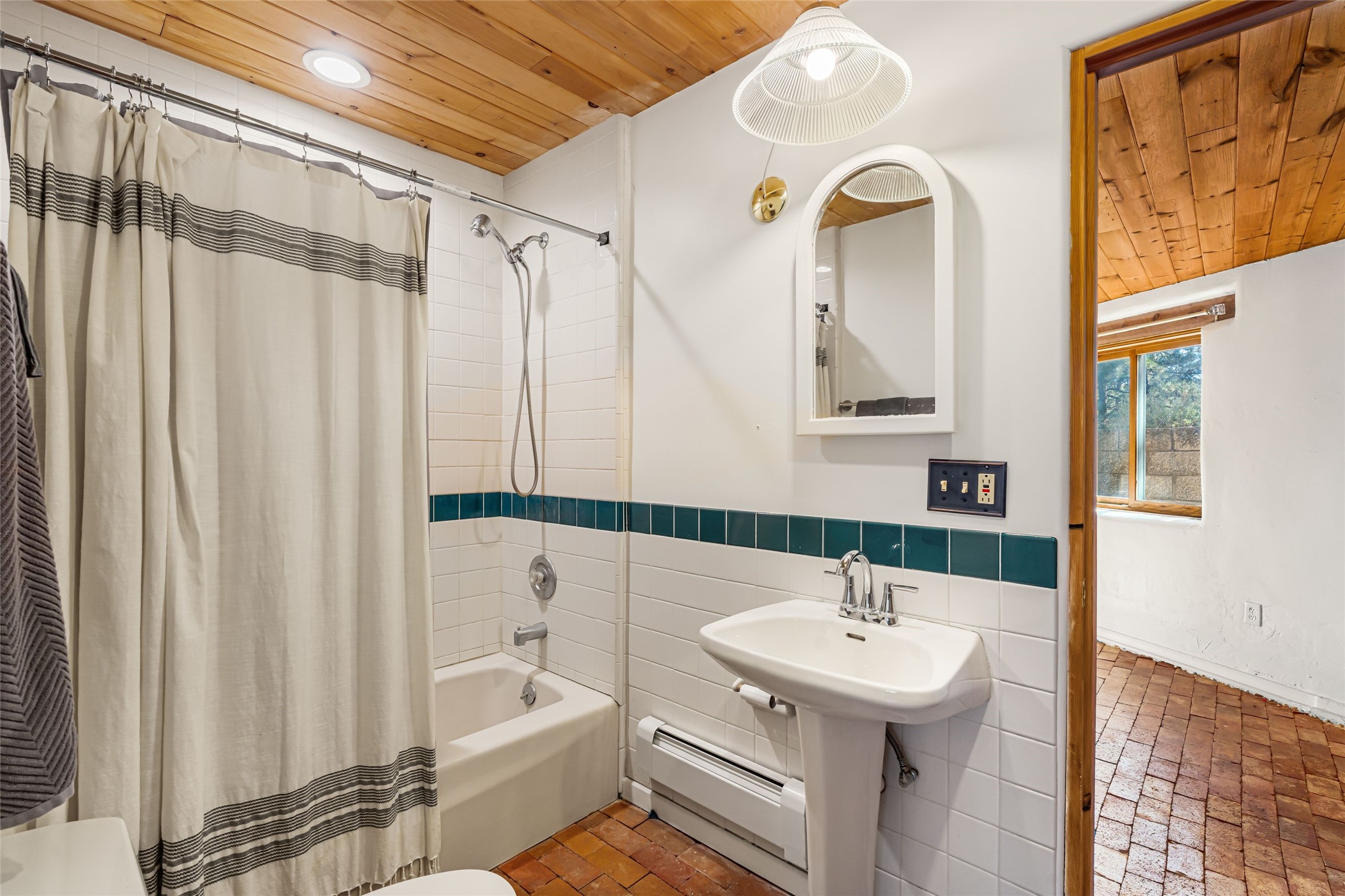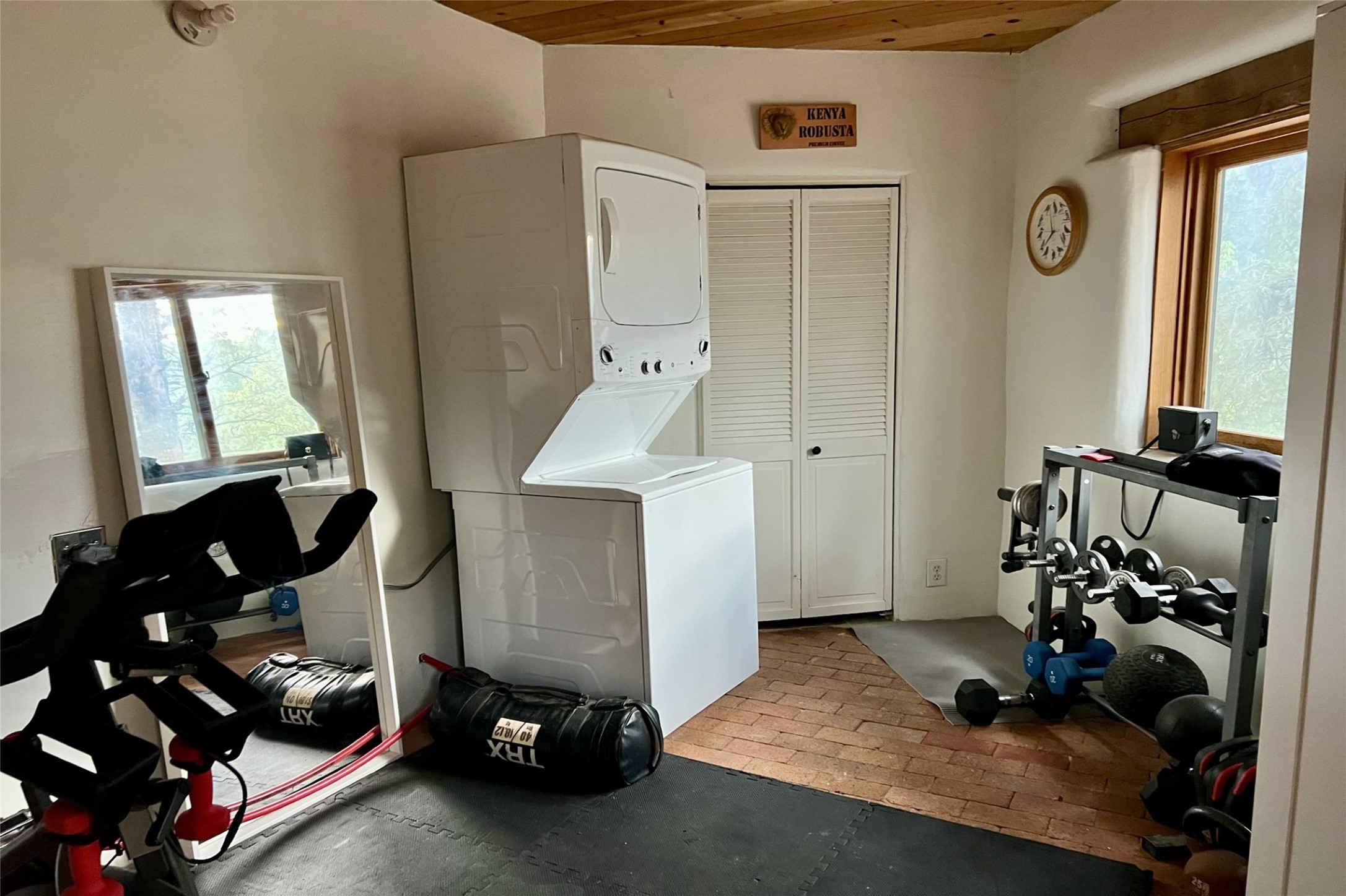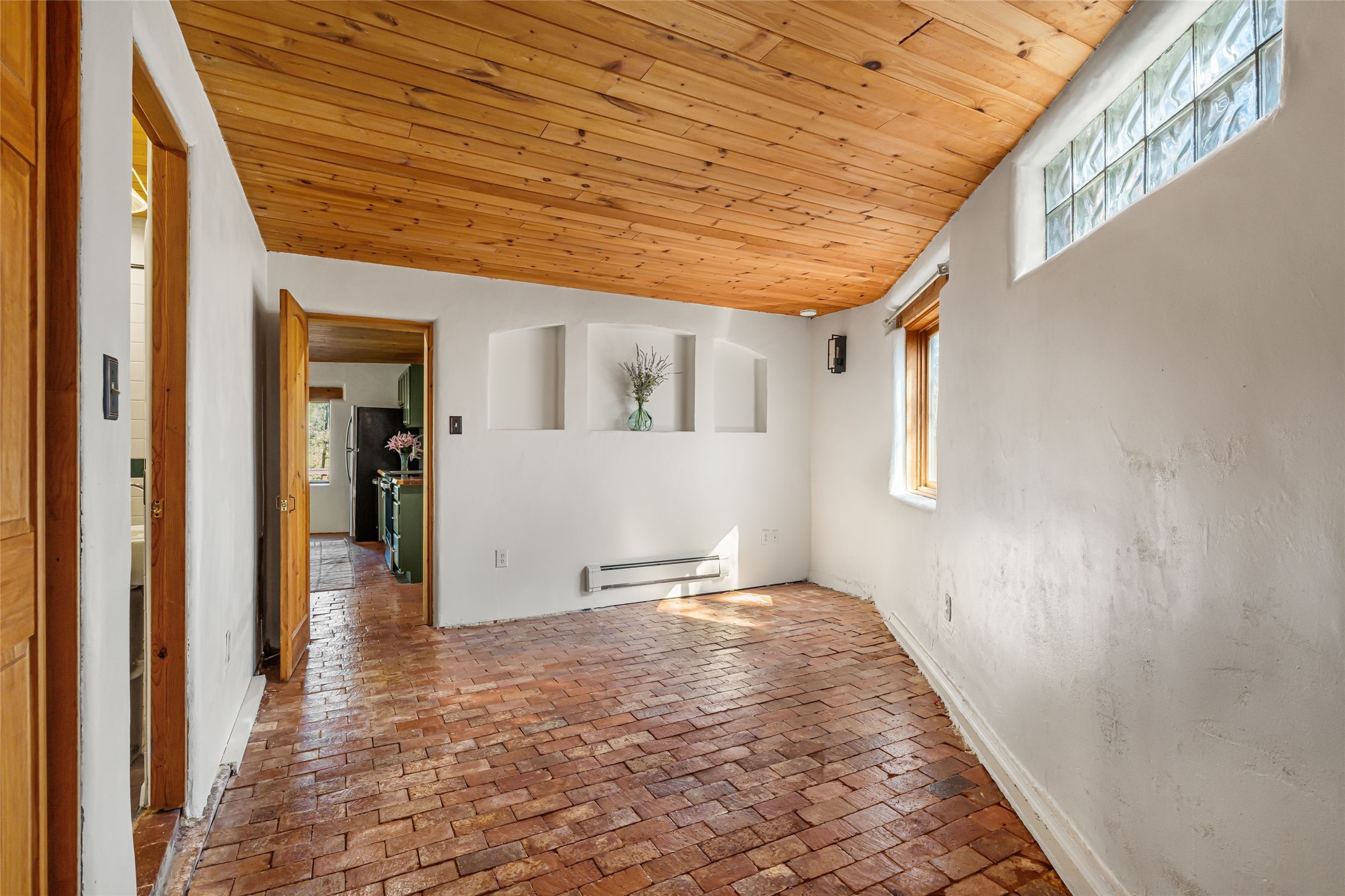 This mountain residence is located in a splendid setting on 2.7 forested acres in the tall pines off Old Santa Fe Trail. The three-level home offers a main house and guest house under the same roof and connected by a stairway internally, so it can be used as a single home or house and guest house. The main level consists of the living, kitchen, and dining rooms, primary bedroom, and bathroom. There are two enjoyable decks - a very large deck off the living room and another off the dining room. The upper level has two bedrooms, a sitting area, and bathroom. The lower lever is the two-bedroom, two-bath guest house with an open-concept living/kitchen/dining area, and which also has another wonderful large deck. The outdoor living is delightful! The topography is gentle, affording a great deal of usable land. Experience a beautiful mountain lifestyle only minutes from the Plaza.