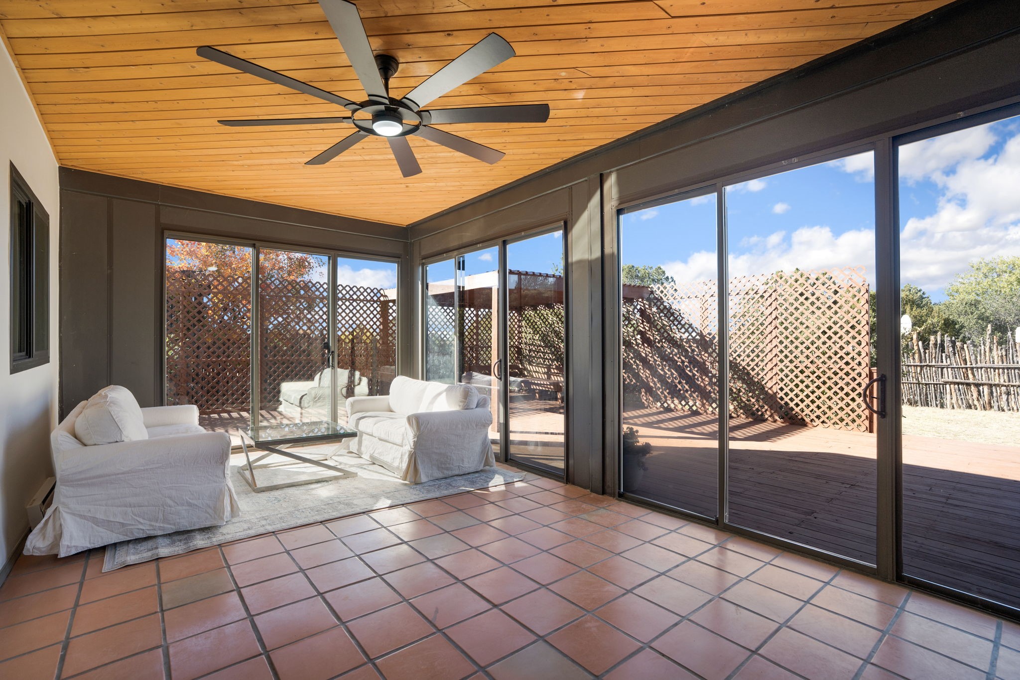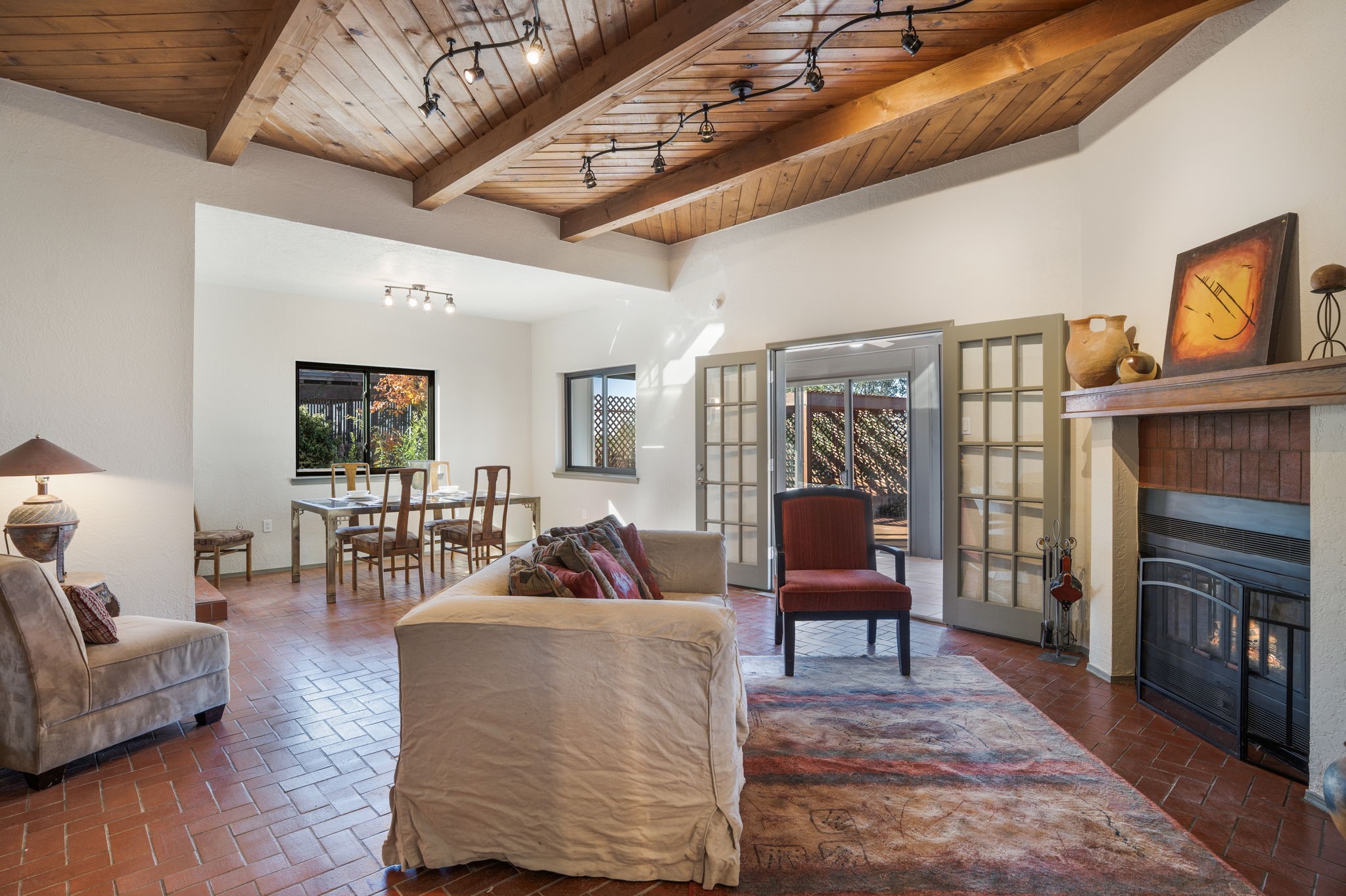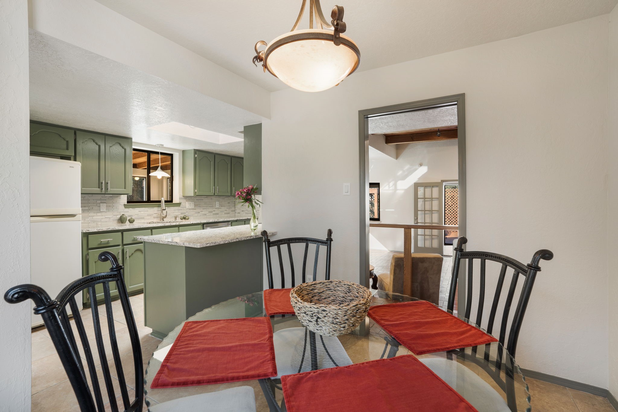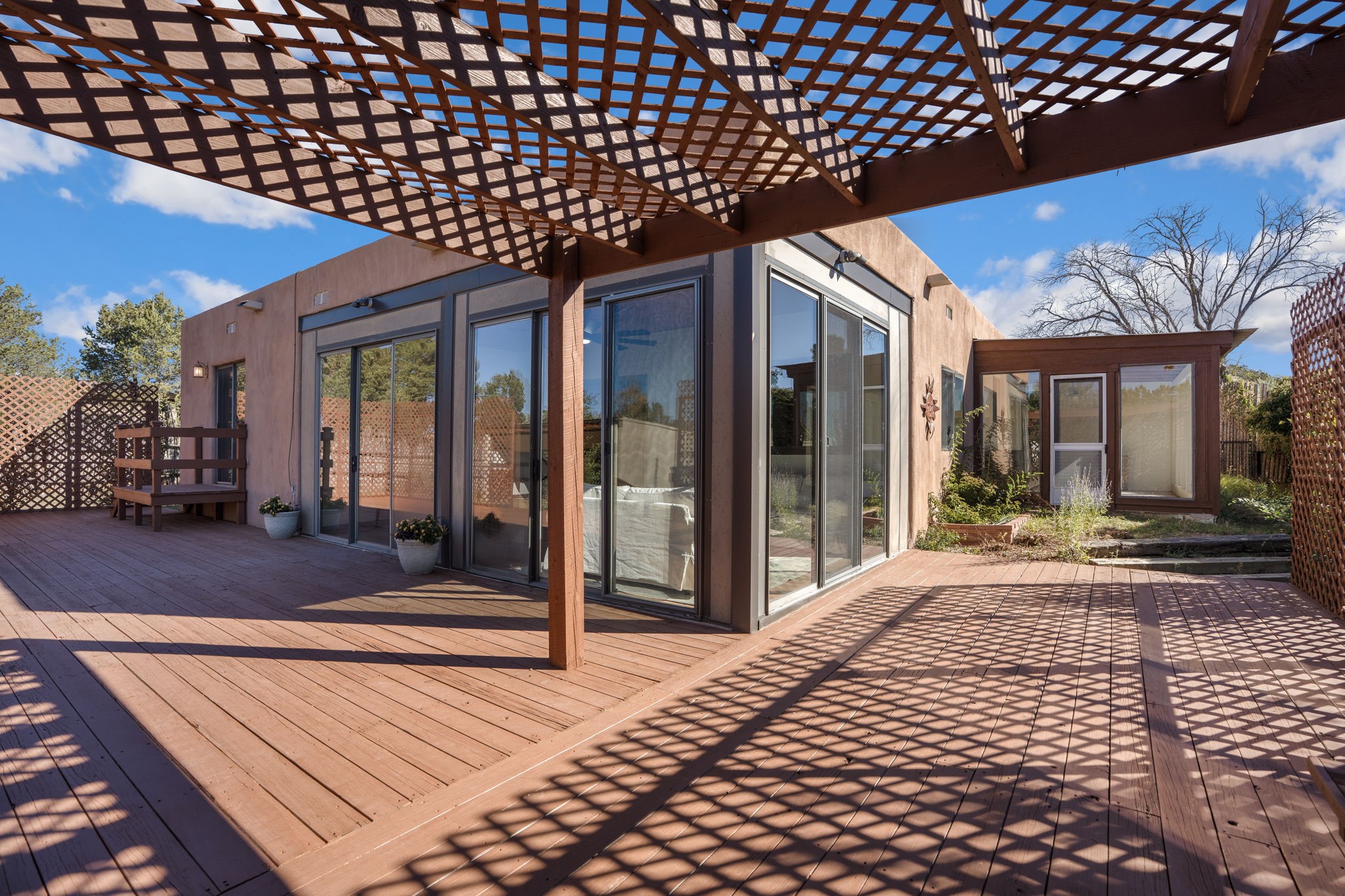 An exceptional opportunity awaits in one of Santa Fe's most cherished communities, DeVargas Heights. The floor plan is both practical and elegant with the separate dining room off the updated Kitchen, including new granite countertops. The inviting living area features a warm wood-beamed ceiling and a charming fireplace, setting a distinctly Santa Fe tone. Three bedrooms and two fully renovated bathrooms offer a blend of modern luxury and neighborhood charm.Enjoy year-round light in the large sunroom that provides a seamless transition to an expansive wrap-around deck and large backyard. Additional highlights include drivable access to the backyard and a flex room located conveniently off the garage, adaptable to your specific needs Best of all, this tranquil retreat is conveniently located less than 4 miles from the vibrant Santa Fe Plaza.