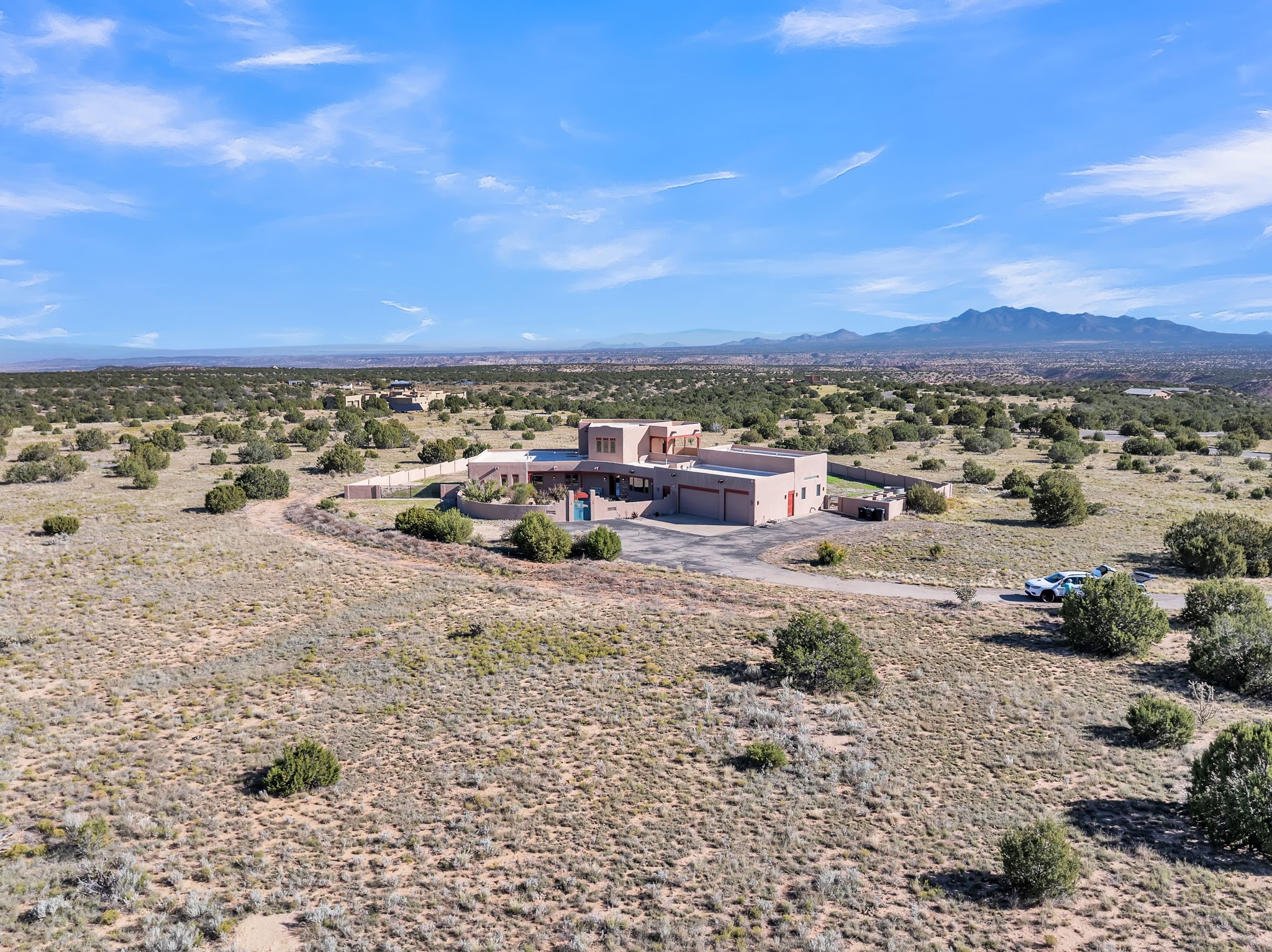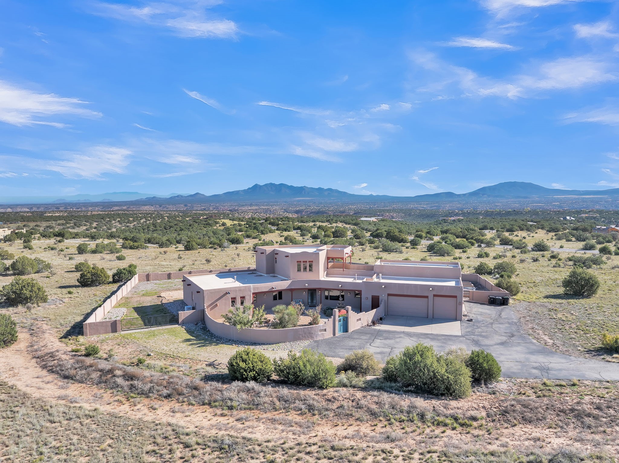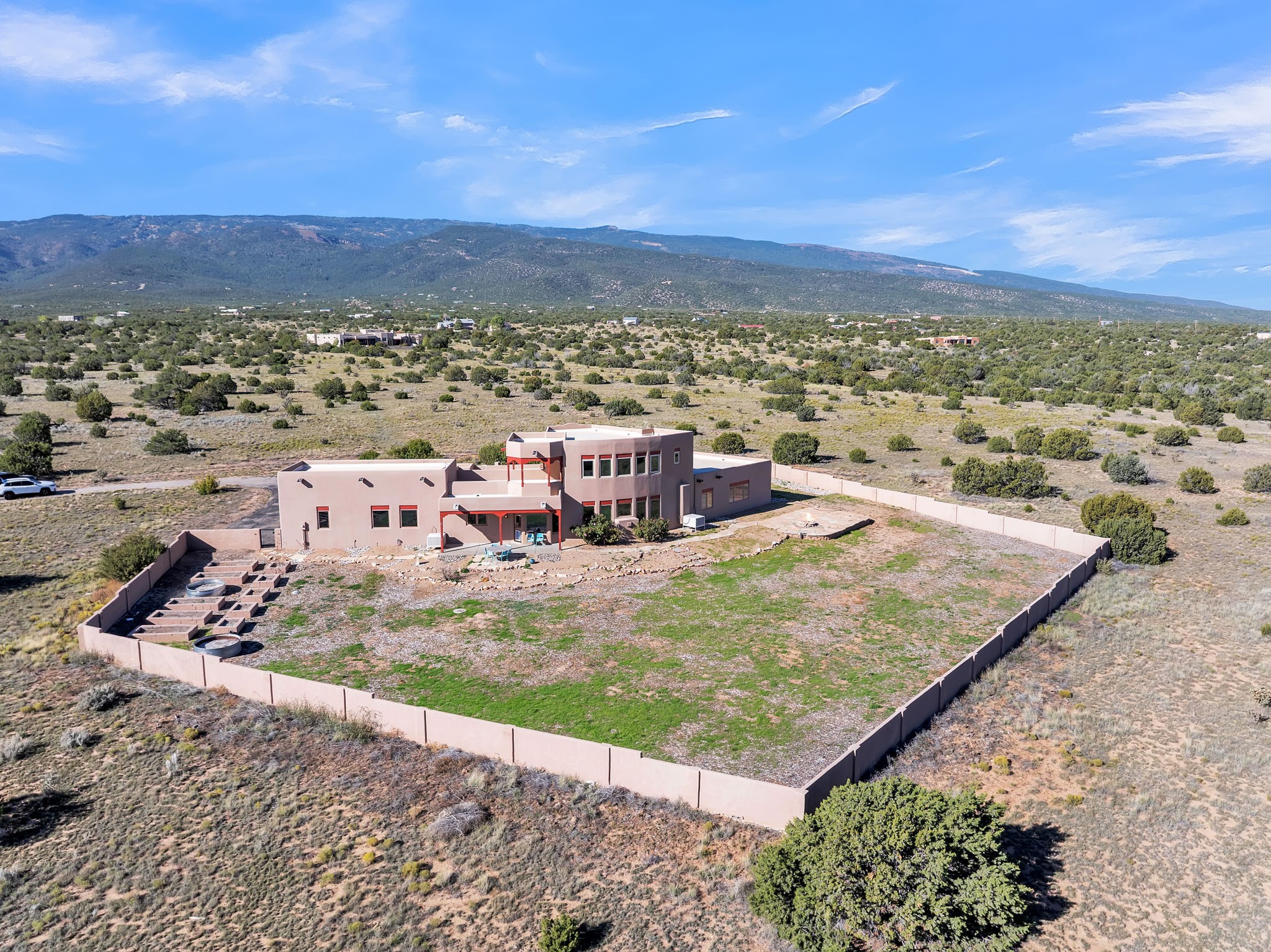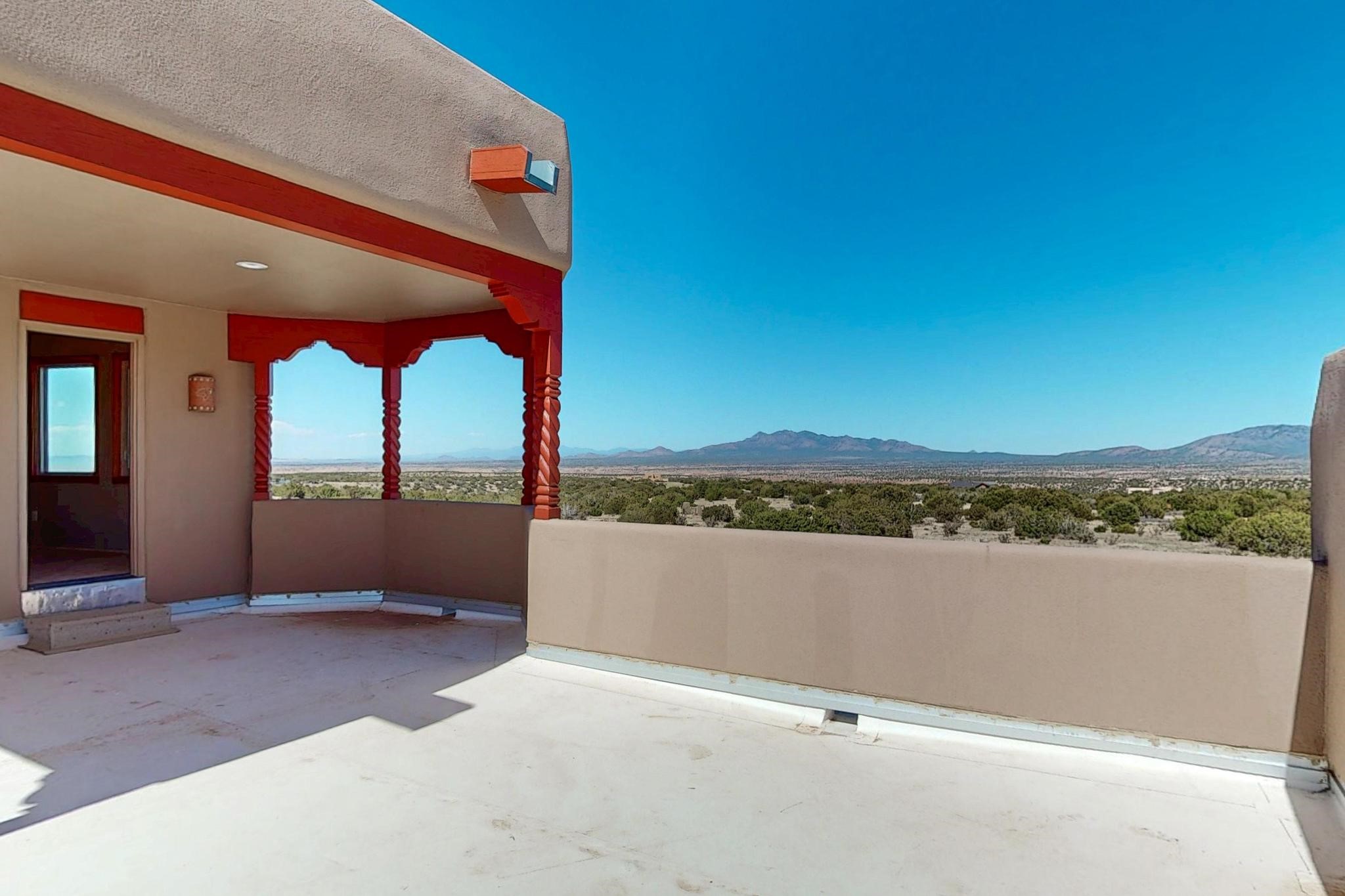 Welcome to 5 La Aguapa, Sandia Park, NM Experience luxury rural living in San Pedro Creek Estates! This custom 4,000+ sq ft home on 10.57 acres offers breathtaking views of five mountain ranges. Featuring 4 bedrooms, 4 baths, and two primary suites, this home combines comfort and elegance. The great room with soaring ceilings, a gas log fireplace, and panoramic views. The gourmet kitchen includes granite countertops, a built-in gas stove, pantry, and access to a workshop and three-car garage. Enjoy radiant heat, travertine tile flooring, a large utility room, and a walled backyard with access to Golden Open Space Los Duendes Trail. This is luxury rural living within reach.Situated on 10.57 acres in the prestigious San Pedro Creek Estates, this impressive 4,000+ square foot home offers refined comfort, privacy, and spectacular views of five separate mountain ranges. Featuring 4 bedroomsincluding two primary suites and 4 bathrooms, this thoughtfully designed home blends elegance with everyday functionality. The spacious great room showcases a gas log fireplace and sweeping views for miles, creating a warm and inviting central gathering space. The downstairs primary suite features a large walk-in closet and a generously sized bathroom, while the upstairs primary suite includes a private balcony the perfect spot to take in the serene landscape. Enjoy cooking in the large kitchen, complete with granite countertops, a built-in gas stove, ample cabinetry, a nice-sized pantry, and access to a spacious workshop and three-car garage perfect for hobbies, projects, or extra storage. The home is equipped with efficient radiant heat and features travertine tile throughout the downstairs, adding both beauty and functionality. A spacious utility room includes a sink and plenty of storage. Outside, you'll find a large walled-in backyard, ideal for relaxing, entertaining, or pets. The property also includes private gate access (key fob provided) to the Golden Open Space Los Duendes Trail, offering opportunities for hiking, biking, and horseback riding. Ideally located, this home is just 32 miles from Albuquerque, offering all the amenities of city living, 21 miles from Madrid, known for its artistic charm, and 50 miles from Santa Fe, celebrated for its rich culture and dining.POVEvery window frames a different view five mountain ranges that change colors with the seasons. It's peaceful, quiet, and filled with natural light. Mornings start with coffee on the balcony, and evenings end by the fire watching the sunset roll across the hills. There's room to breathe, create, and enjoy life at a slower pace yet you're still close enough to everything you need. It's truly the best of both worlds.
