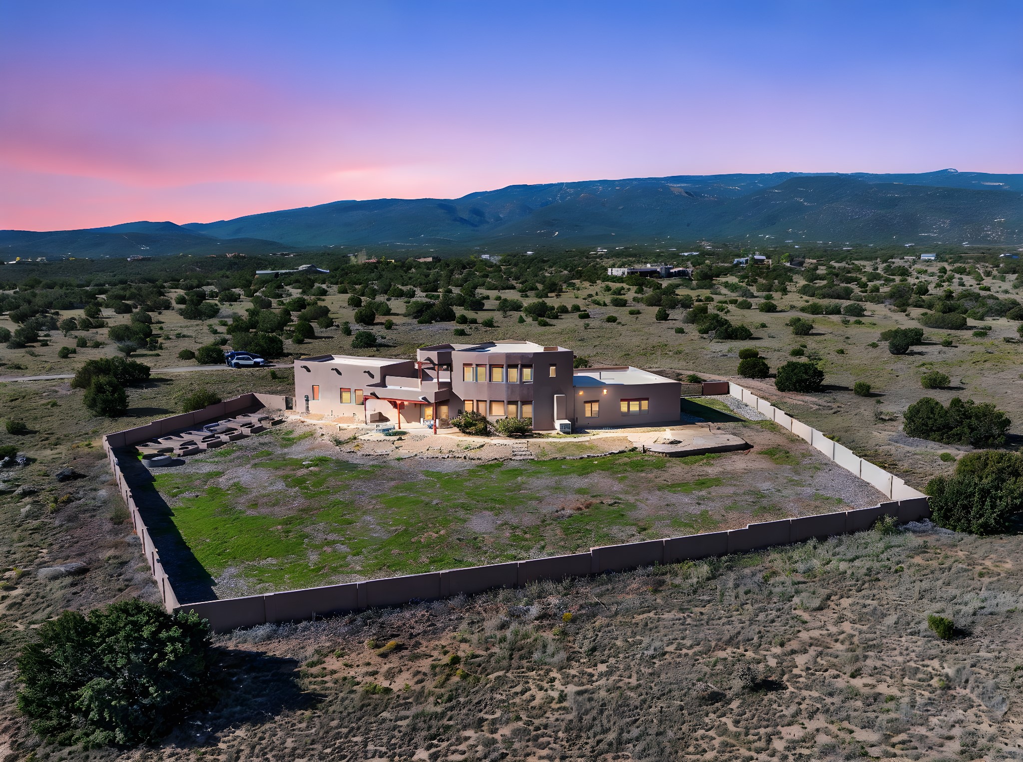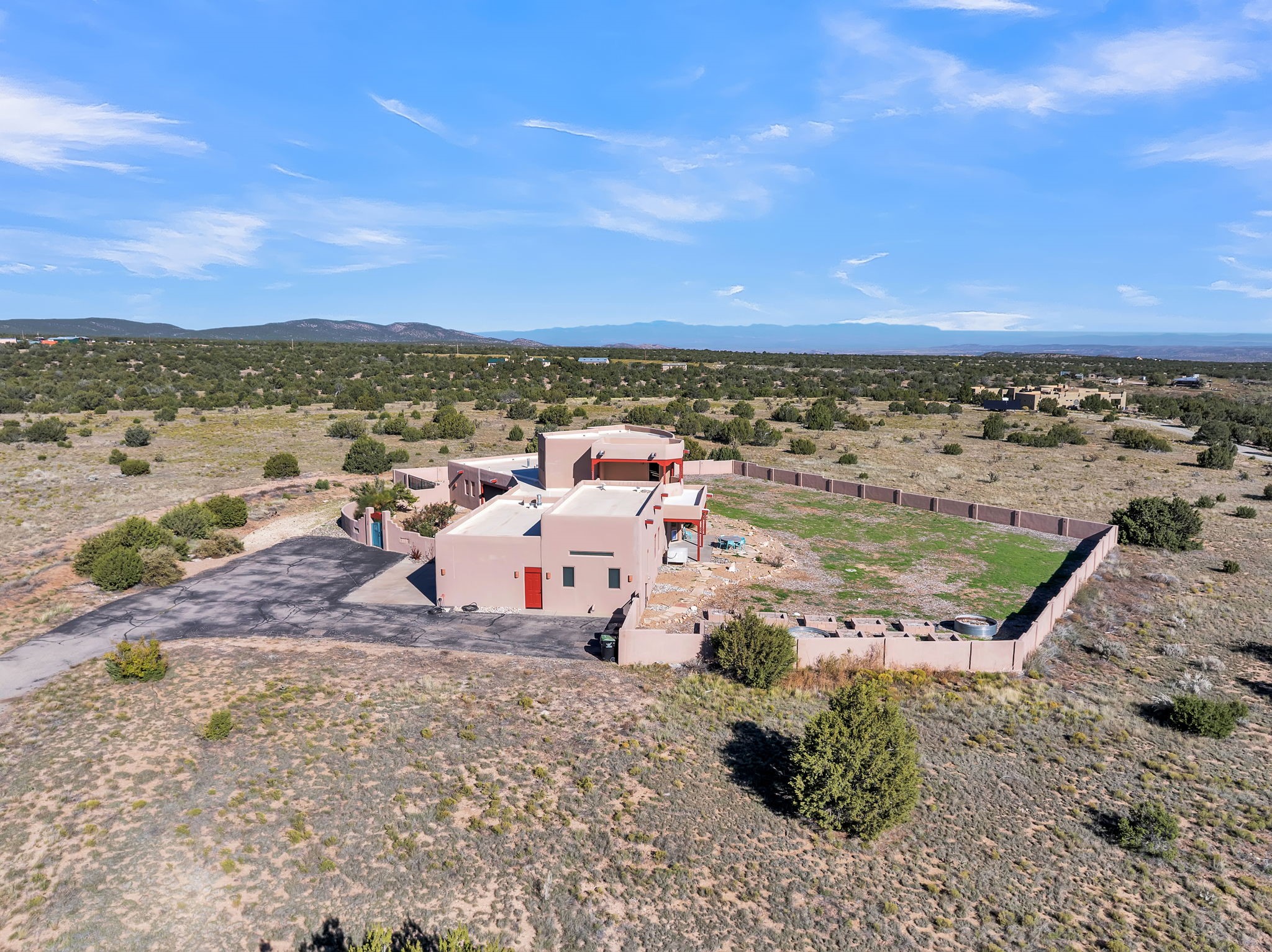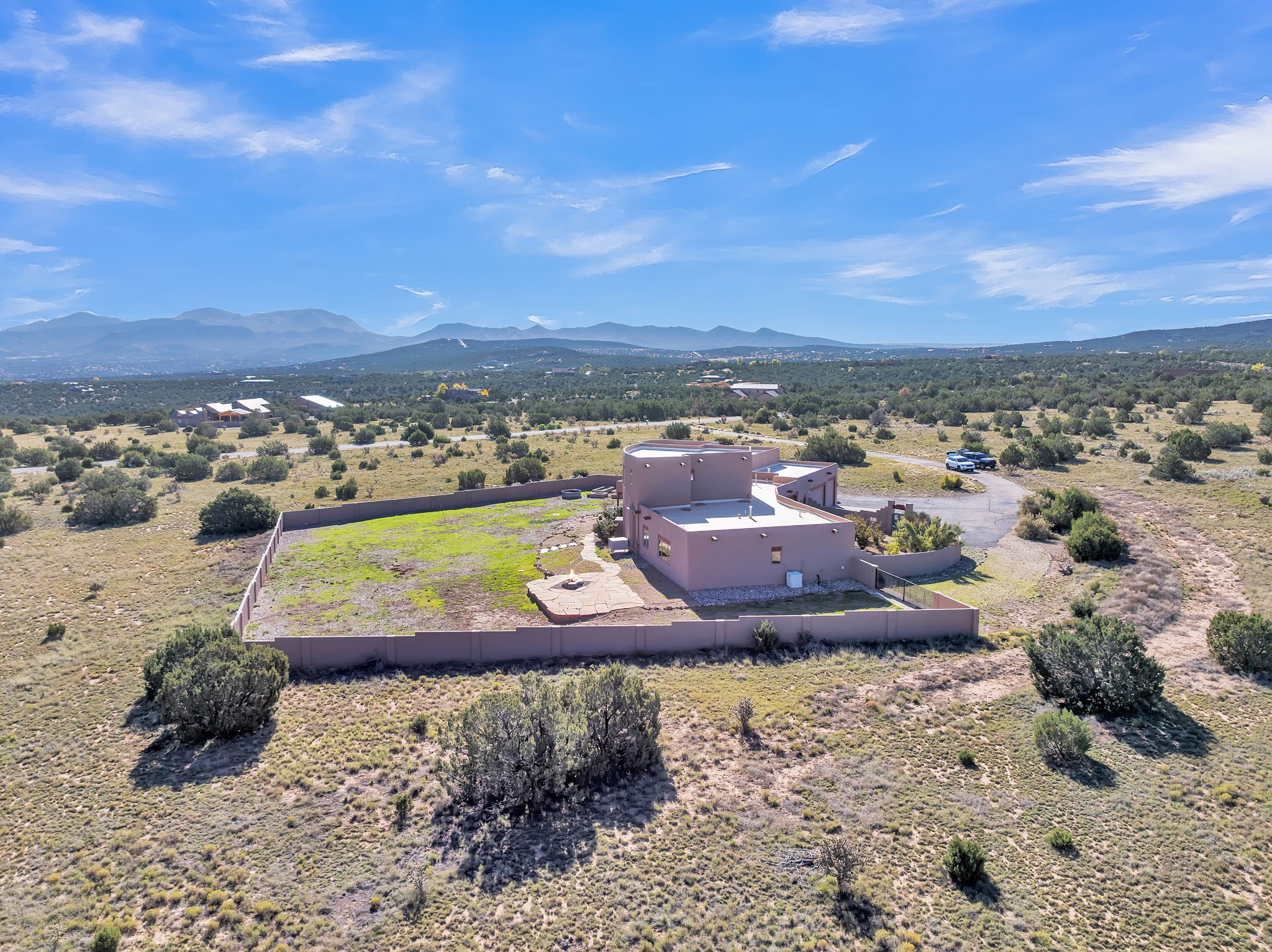 Welcome to 5 La Aguapa, Sandia Park, NM Experience luxury rural living in San Pedro Creek Estates! This custom 4,000+ sq ft home on 10.57 acres offers breathtaking views of five mountain ranges. Featuring 4 bedrooms, 4 baths, and two primary suites, this home combines comfort and elegance. The great room with soaring ceilings, a gas log fireplace, and panoramic views. The gourmet kitchen includes granite countertops, a built-in gas stove, pantry, and access to a workshop and three-car garage. Enjoy radiant heat, travertine tile flooring, a large utility room, and a walled backyard with access to Golden Open Space Los Duendes Trail. This is luxury rural living within reach.Situated on 10.57 acres in the prestigious San Pedro Creek Estates, this impressive 4,000+ square foot home offers refined comfort, privacy, and spectacular views of five separate mountain ranges. Featuring 4 bedroomsincluding two primary suites and 4 bathrooms, this thoughtfully designed home blends elegance with everyday functionality. The spacious great room showcases a gas log fireplace and sweeping views for miles, creating a warm and inviting central gathering space. The downstairs primary suite features a large walk-in closet and a generously sized bathroom, while the upstairs primary suite includes a private balcony the perfect spot to take in the serene landscape. Enjoy cooking in the large kitchen, complete with granite countertops, a built-in gas stove, ample cabinetry, a nice-sized pantry, and access to a spacious workshop and three-car garage perfect for hobbies, projects, or extra storage. The home is equipped with efficient radiant heat and features travertine tile throughout the downstairs, adding both beauty and functionality. A spacious utility room includes a sink and plenty of storage. Outside, you'll find a large walled-in backyard, ideal for relaxing, entertaining, or pets. The property also includes private gate access (key fob provided) to the Golden Open Space Los Duendes Trail, offering opportunities for hiking, biking, and horseback riding. Ideally located, this home is just 32 miles from Albuquerque, offering all the amenities of city living, 21 miles from Madrid, known for its artistic charm, and 50 miles from Santa Fe, celebrated for its rich culture and dining.POVEvery window frames a different view five mountain ranges that change colors with the seasons. It's peaceful, quiet, and filled with natural light. Mornings start with coffee on the balcony, and evenings end by the fire watching the sunset roll across the hills. There's room to breathe, create, and enjoy life at a slower pace yet you're still close enough to everything you need. It's truly the best of both worlds.