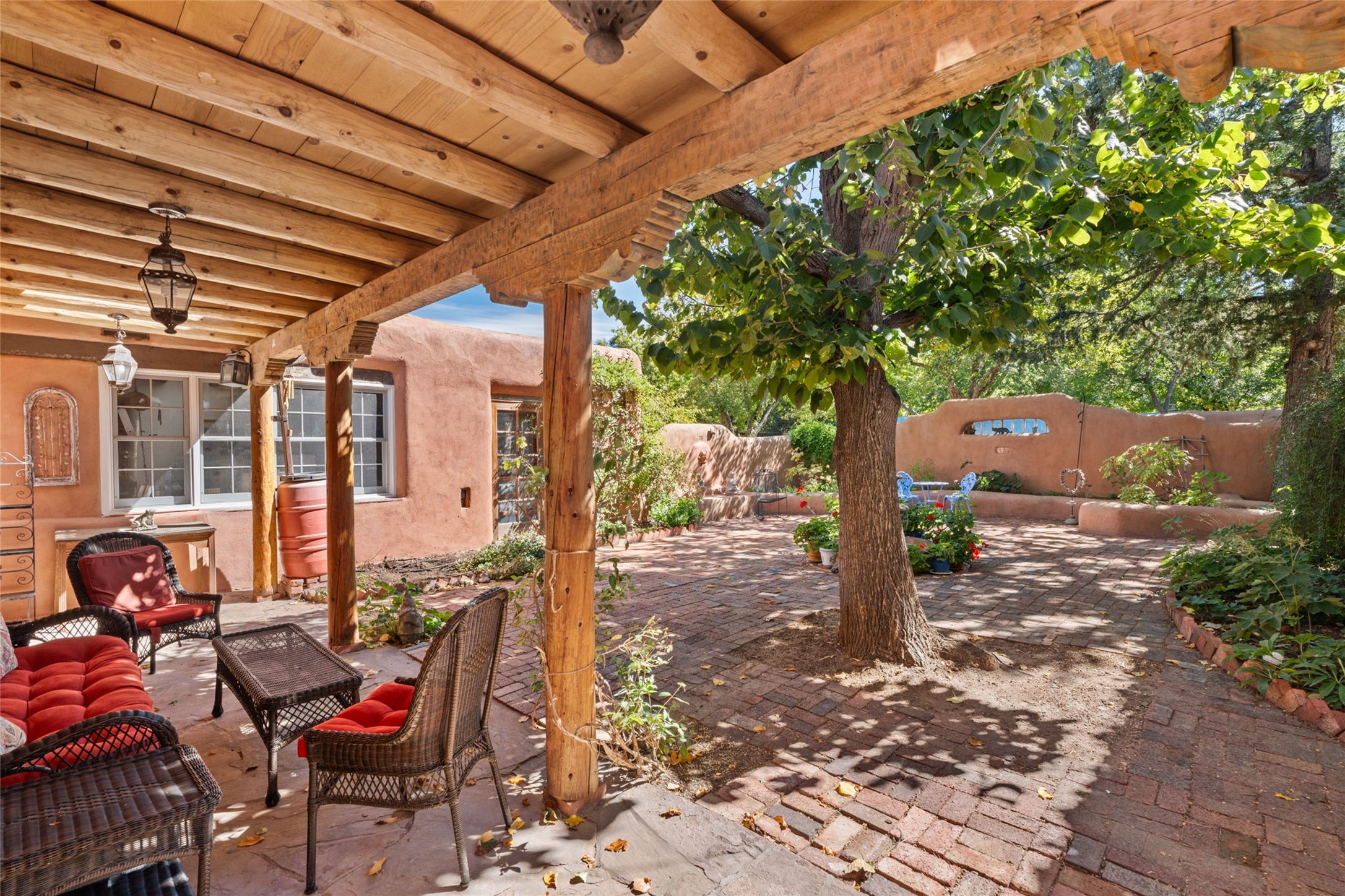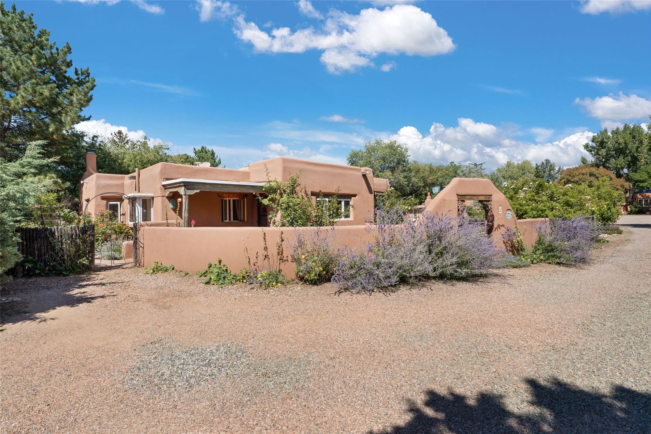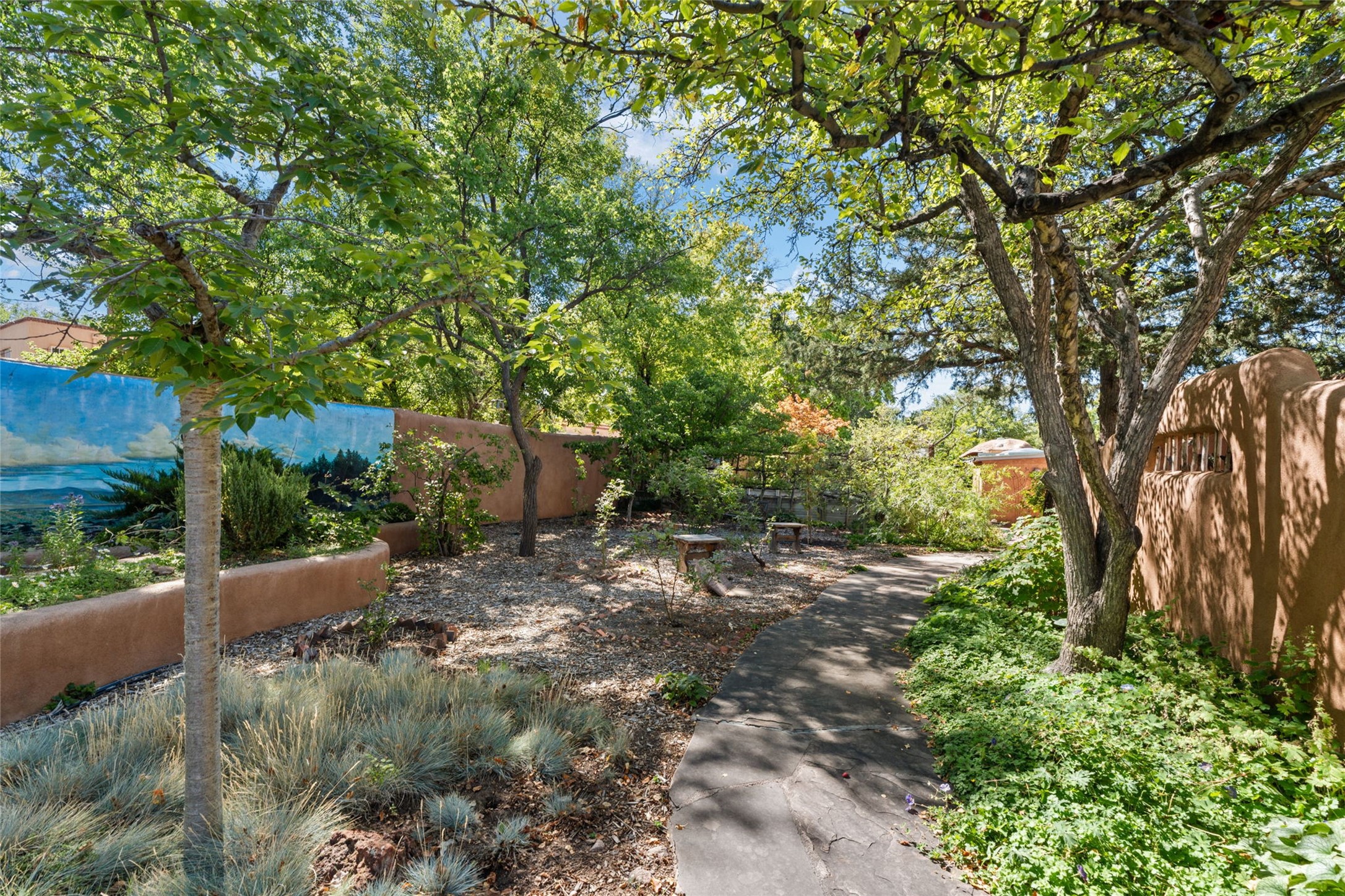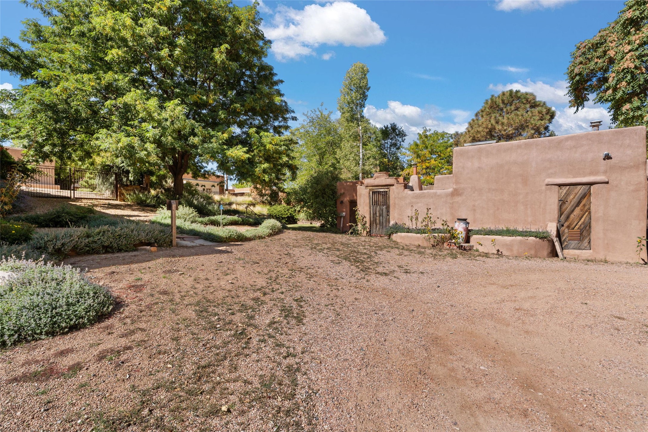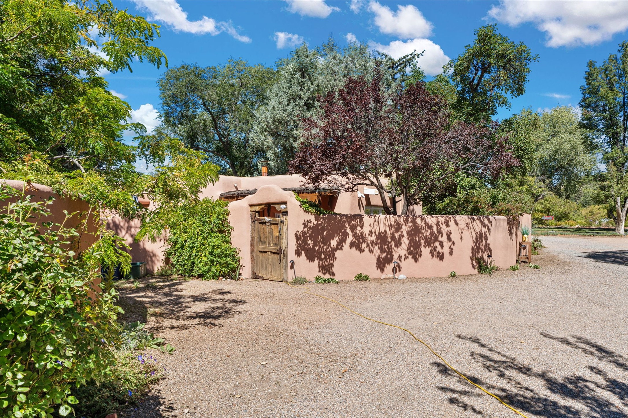 Envision the possibilities of this 3.27-acre estate, bridging iconic Canyon Road with the dirt stretch of East Alameda, directly beside the famed Compound Restaurant. This is a property of both heritage and horizon, anchored by a 3,829-square-foot historic residence on the Alameda side and a 4,424-square-foot commercial gallery on Canyon Road. Between these lies a hidden enclave of gardens, courtyards, and guest dwellings, including one designed by the celebrated Santa Fe builder Betty Stewart. The main residence, built in 1938 and recognized as a historically contributing building, has been lovingly preserved and enhanced by multiple generations of the same family. Within its adobe walls, you'll find four bedrooms, three full baths, an office, a laundry and craft room, a cedar-lined closet, and a sunroom, each space imbued with warmth & continuity of care. The Canyon Road gallery, leased through 2028, provides longevity and prestige in Santa Fe's most famous arts district. Throughout the grounds, mature trees and plantings and paths connect the various structures - serene, self-contained, and rich with character. The property enjoys full city utilities as well as two private wells, each yielding three acre-fee of water, an invaluable resource for maintaining the grounds or for future expansion. This extraordinary compound merges historic authenticity with modern versatility, one of the few remaining estates to unite Canyon Road and East Alameda in a single private holding. Whether envisioned as a multi-generational family retreat or a bespoke Eastside development, the site's dual access, exceptional size, and RC8AC zoning (allowing for 8 units per acre) make it a truly unique offering. Just moments from Santa Fe's galleries, dining, and cultural landmarks, yet profoundly secluded within its own walls and gardens, this property stands as both a legacy home and an expansive canvas for new possibilities in the heart of the city's most storied neighborhood.