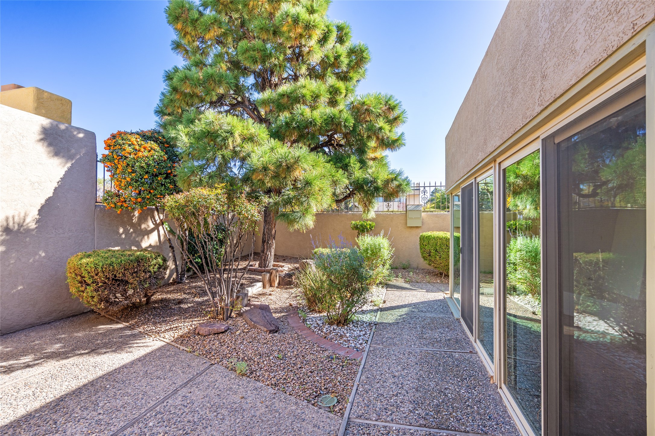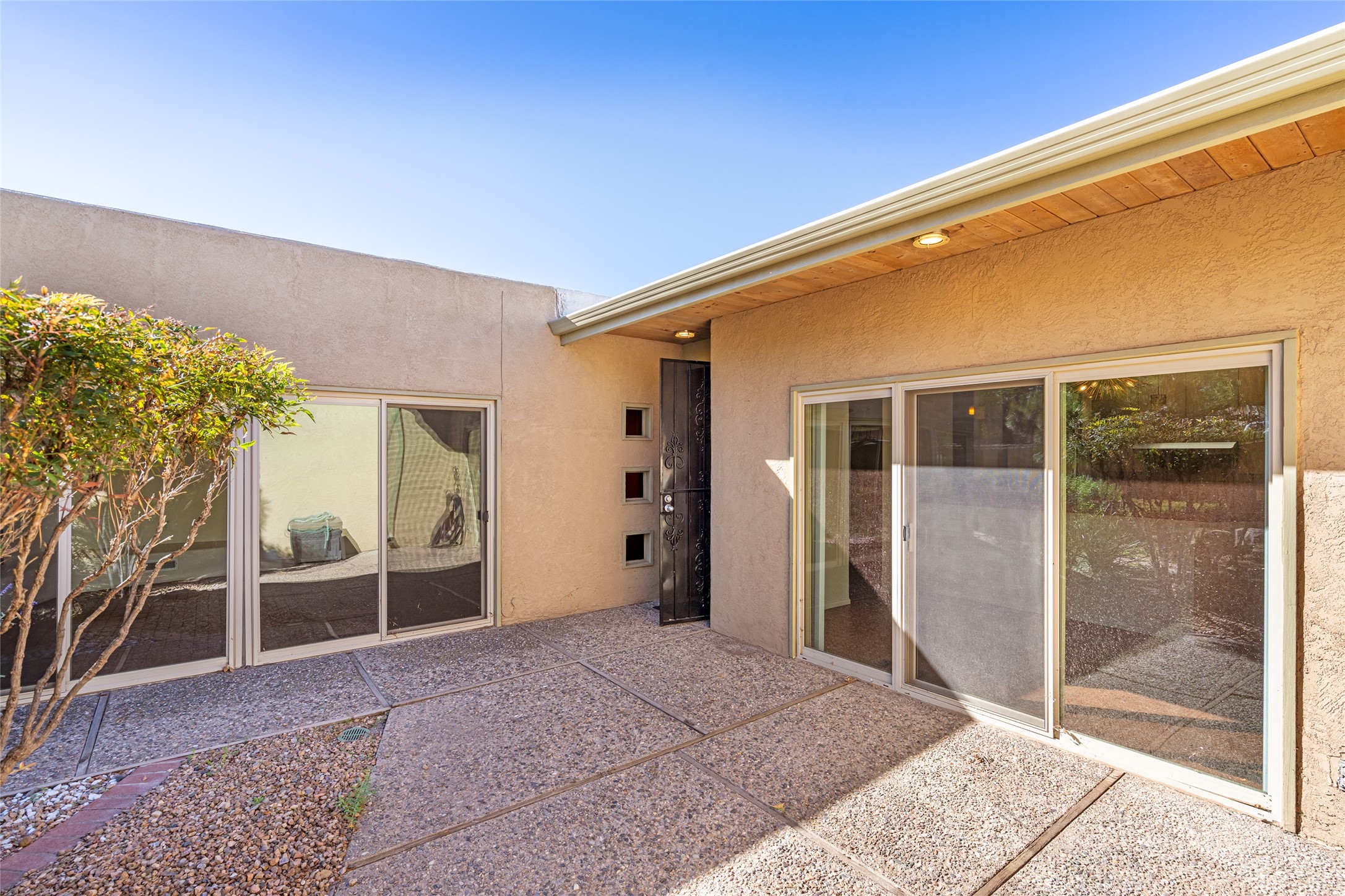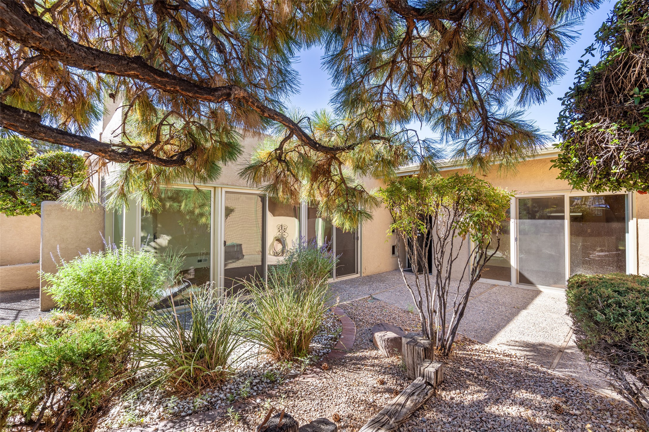 Look here--you're going to love this mid-century modern townhome in the heart of Nob Hill and nearby to lots of restaurants, retail, the Co-op & UNM. Designed with generous proportions and a distinctive retro vibe, this spacious home offers 3-4 bedrooms, 2.5 baths, and room to spread out in comfort. The inviting living room showcases brick floors, beamed and wood ceilings, and a classic kiva-style fireplace that anchors the space with warmth and authenticity. The dining room is highlighted by a beautifully painted mural--an artistic focal point that adds a touch of custom flair. The kitchen offers abundant cabinet and pantry space, plus a sunny breakfast nook framed by windows. Upstairs, the primary suite captures stunning Sandia Mountain views and includes an ensuite bath with dual sinks. Two additional bedrooms are generously sized and share a full bath. All the windows in the upstairs bedrooms are new double pane Pella windows and there are new Hunter Douglas window shades throughout. The lower level offers incredible flexibility, featuring a cozy study or library with a fireplace and built-in bookshelves, plus a large storage or bonus room and an oversized, 550 square foot two-car garage. Recent upgrades include a tankless water heater and a foam roof with transferable warranty. Cool timeless style meets easy living, tons of square footage, and unbeatable location near Albuquerque's favorite neighborhoods, this townhome delivers comfort, character, and enduring charm in one irresistible package.