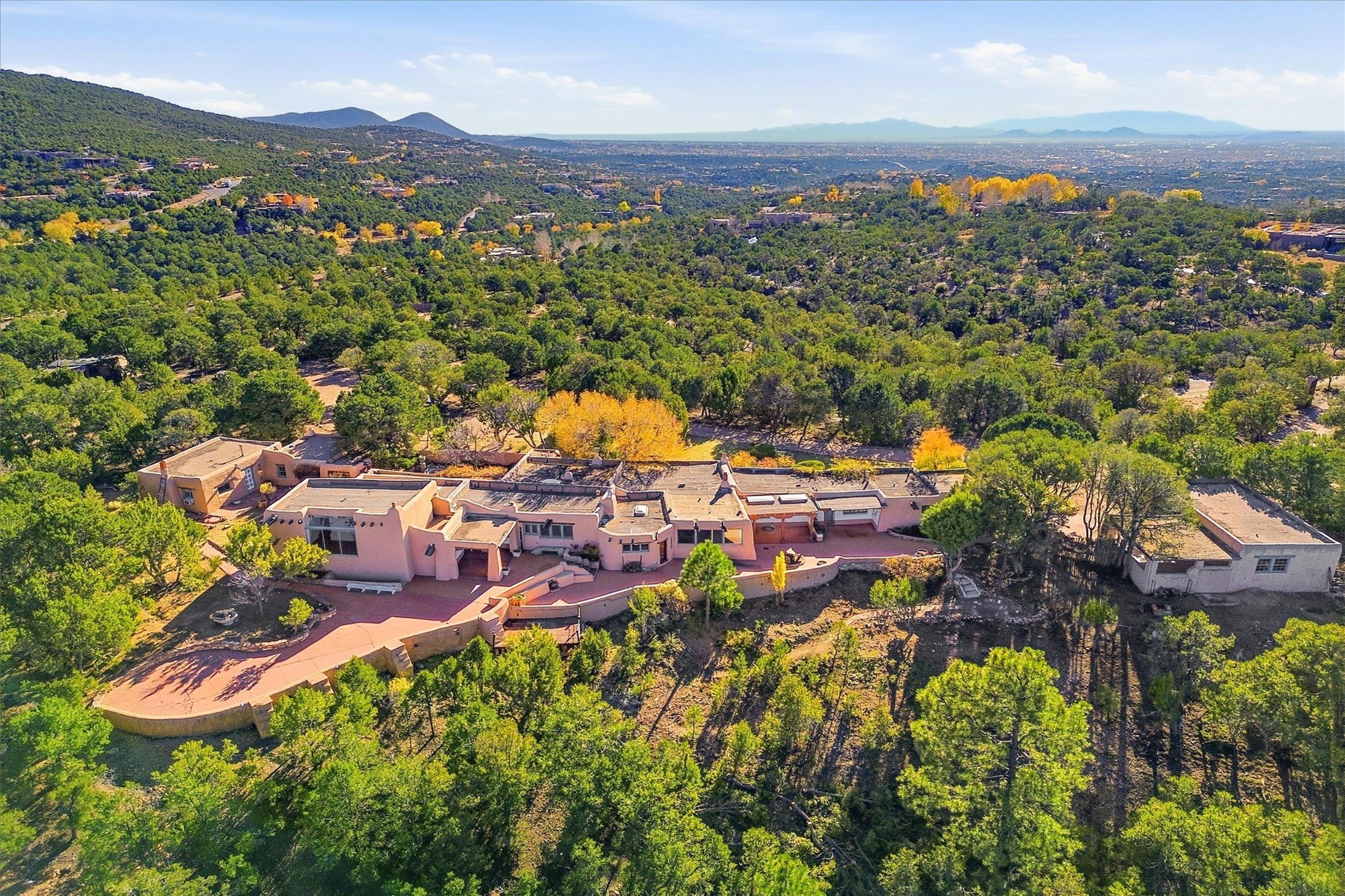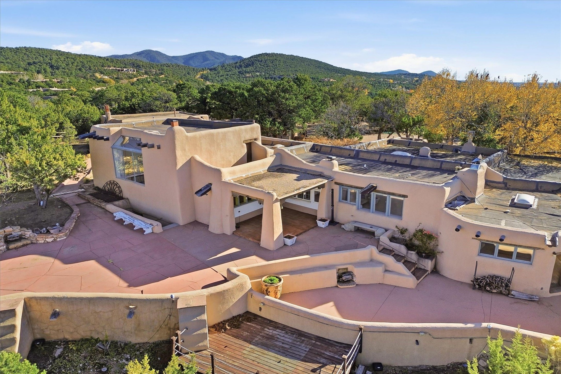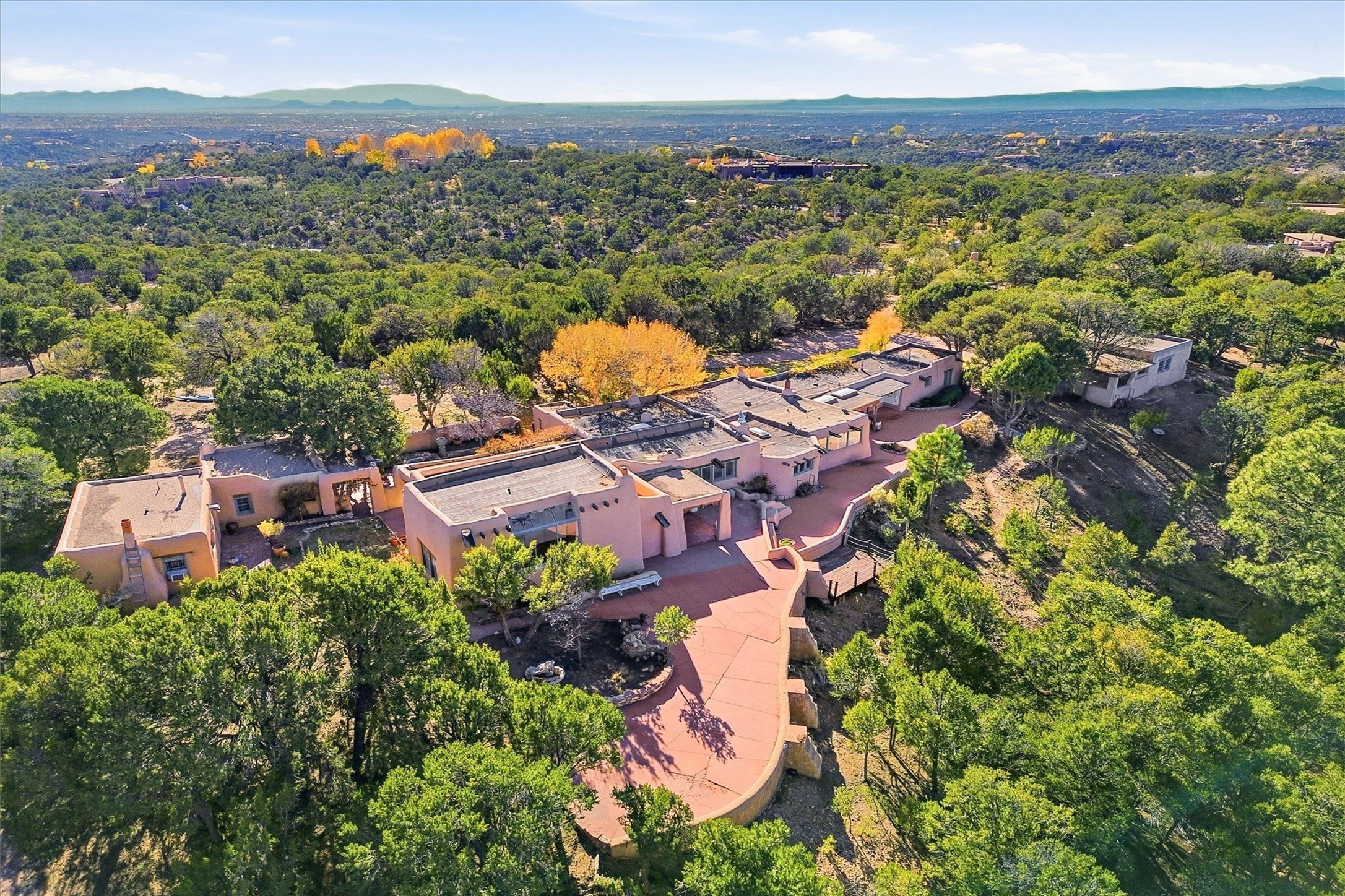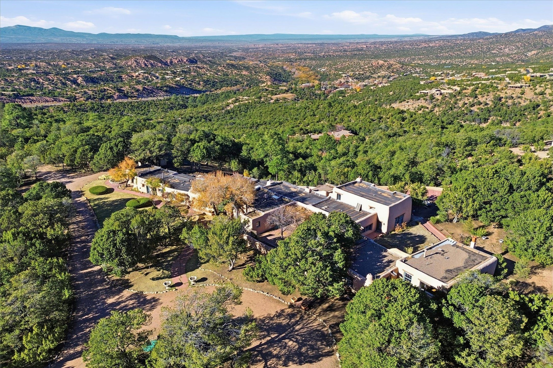 Set atop a private ridgeline with more than seven acres of pristine land, this remarkable residence is both a sanctuary and a celebration of Santa Fe's cultural and architectural heritage. According to prior sellers/listings, this home may have been designed in the 1920s by John Gaw Meem, one of New Mexico's most influential architects (buyer to verify). The home exemplifies the Spanish Pueblo Revival style that helped define Santa Fe's visual identity. Encompassing over 6,000 square feet, this classic triple-adobe hacienda is rich with craftsmanship and character. Hand-carved wooden doors, more than two centuries old, welcome you into spaces graced with flagstone and oak plank floors, massive vigas, and hand-hewn willow herringbone ceilings--each element adding warmth, texture, and timeless appeal. The main residence offers four bedrooms and four baths, complemented by two charming guest casitas. The bright kitchen features a breakfast nook that opens to multiple patios and courtyards, perfect for dining al fresco while taking in the far-reaching mountain views. Distinctive architectural moments define the home: a gracious adobe-arched dining room, coved ceilings, and divided-light windows that fill the interiors with natural light. According to prior sellers/listings, a studio--originally used in the 1930s by artist McHarg (buyer to verify) Davenport of The Rio Grande Painters--serves as a creative retreat with soaring split cedar ceilings, and access to a rooftop viewing area, ideal for sunsets and stargazing. The location is exceptional--completely private yet nearby Santa Fe's historic Plaza, the Santa Fe Opera and approximately 25 minutes to Ski Santa Fe. Disclaimer: Furnished photos are from 2023. Current photos are of unfurnished property. Seller has never resided in home. Property is being sold in AS-IS, in its current condition.