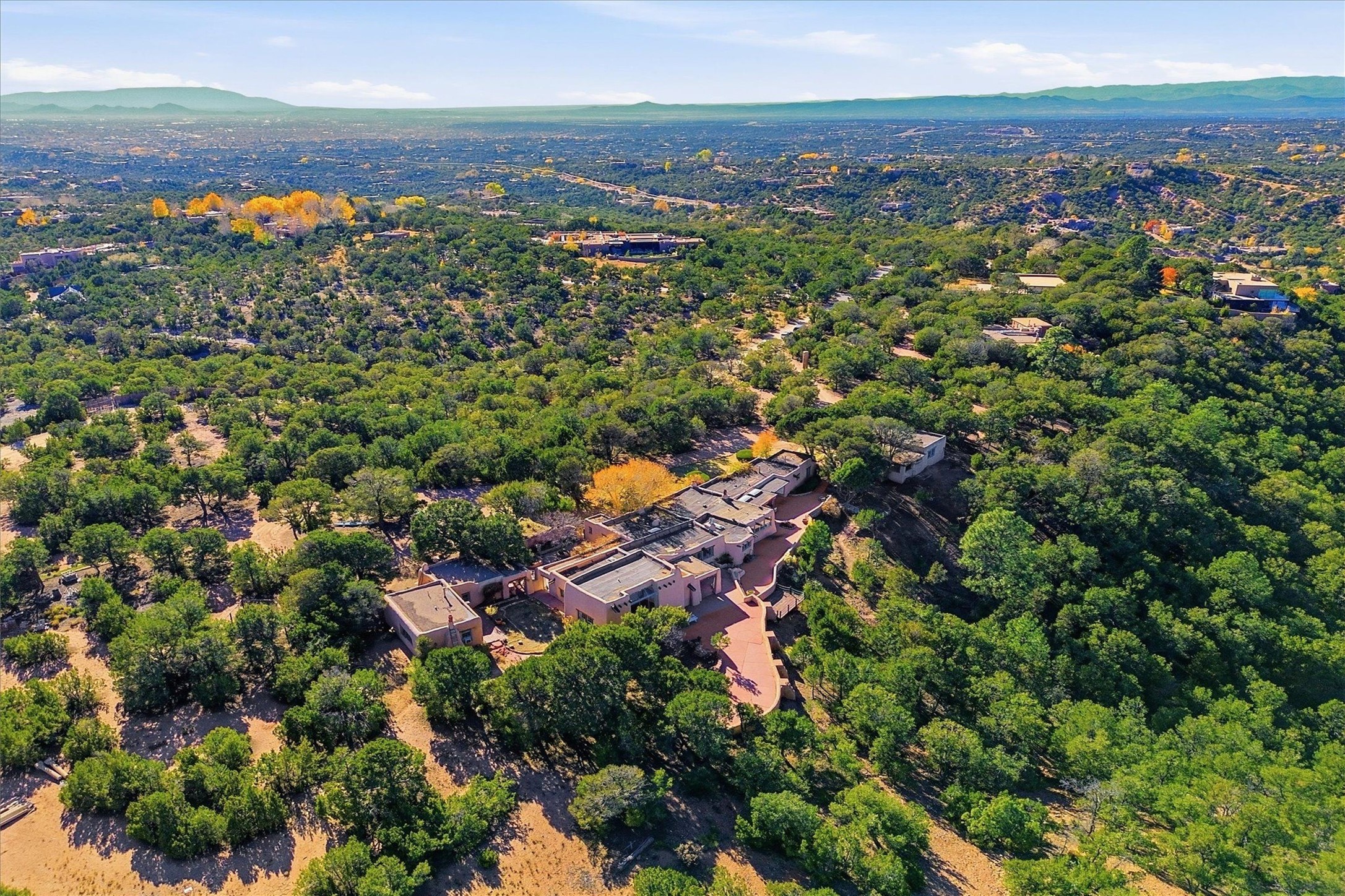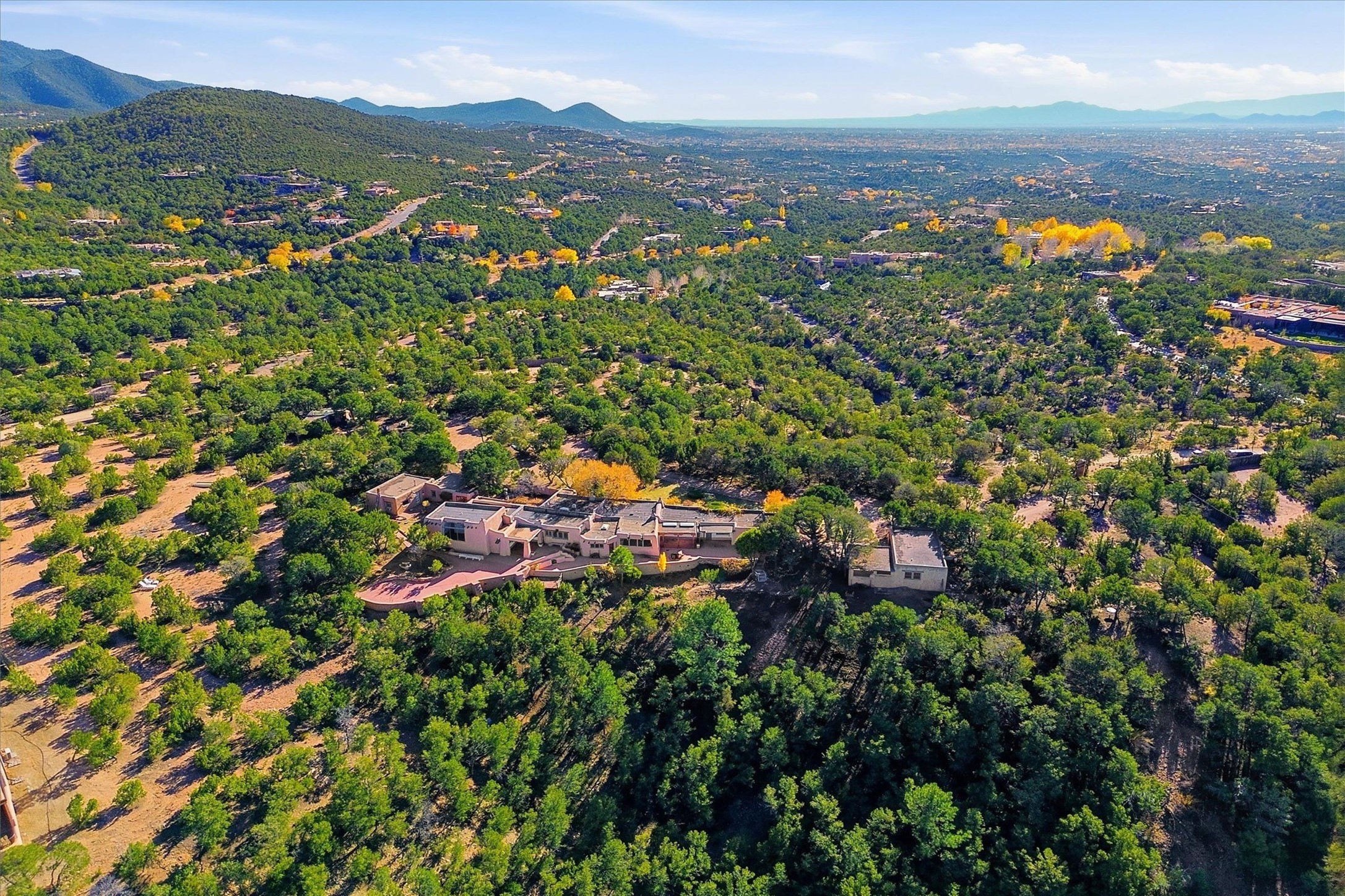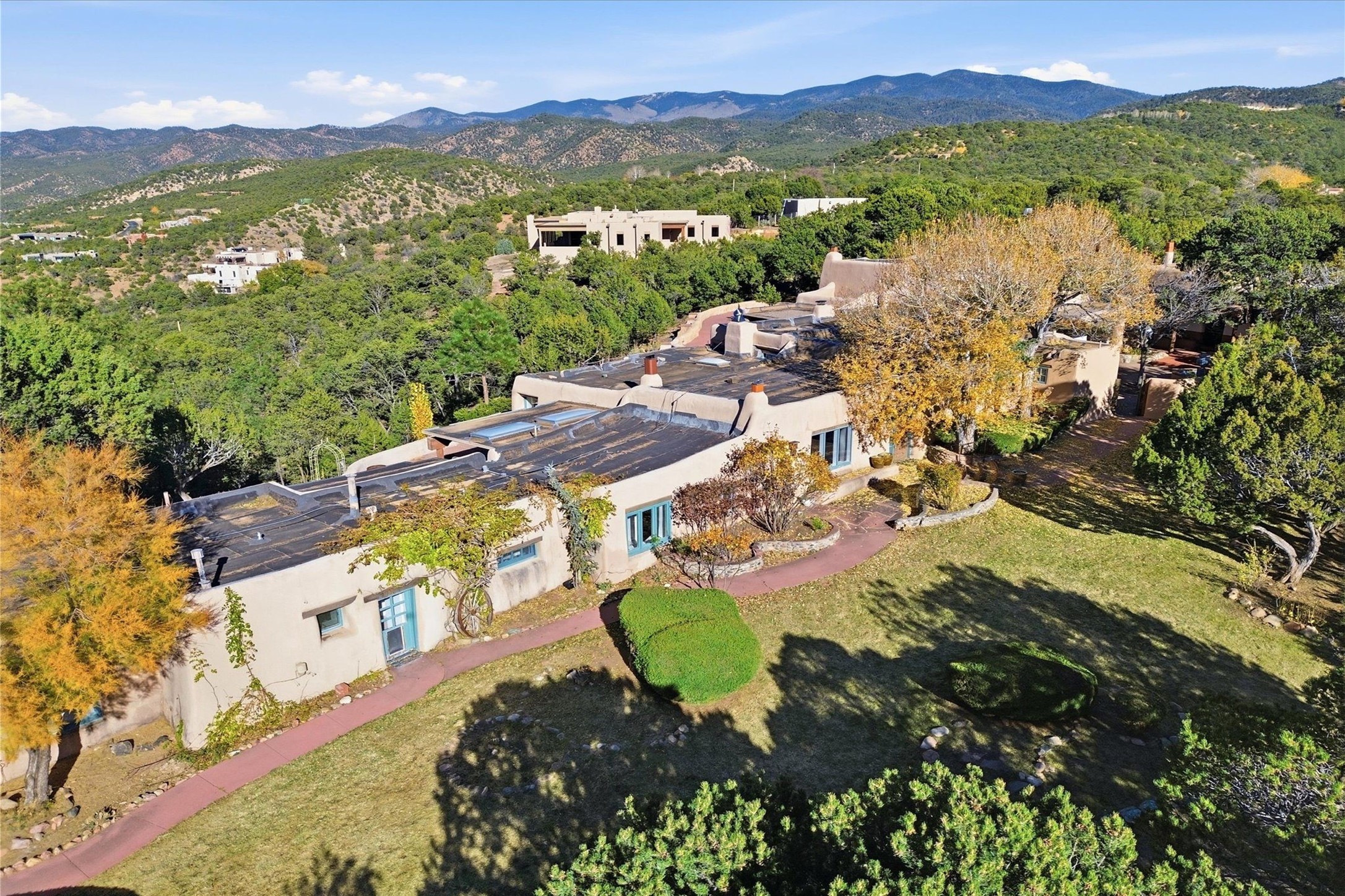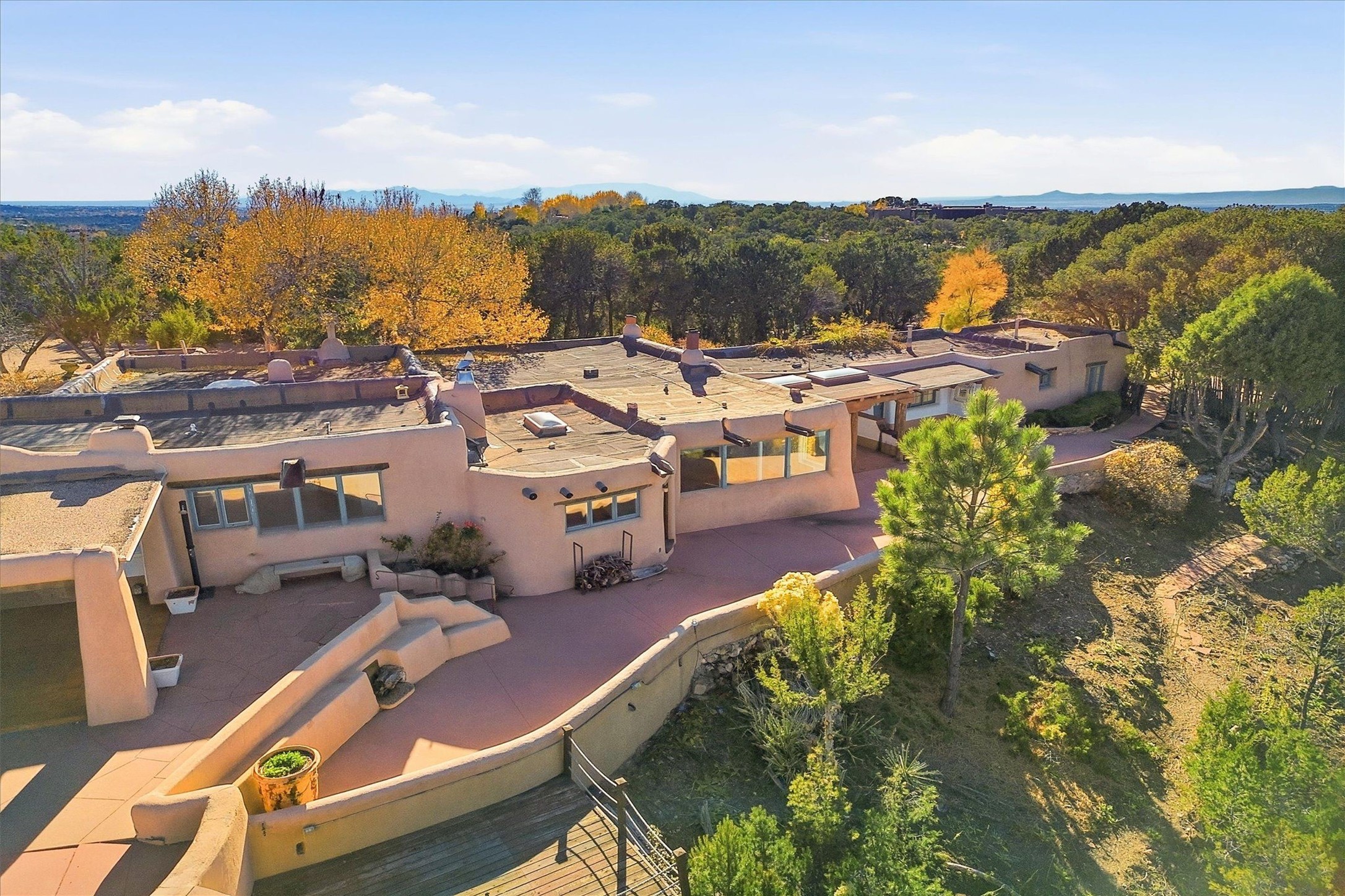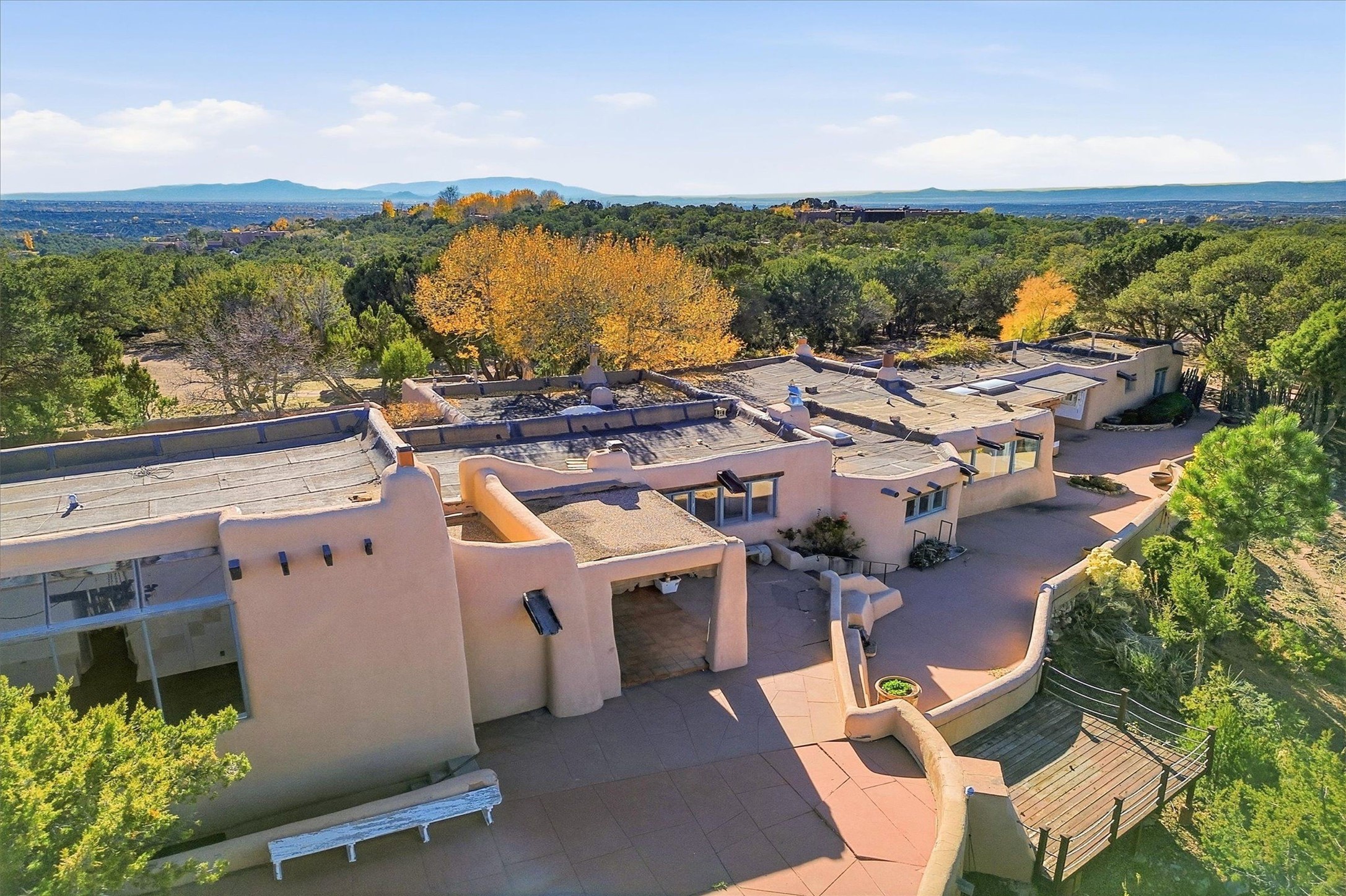 Set atop a private ridgeline with more than seven acres of pristine land, this remarkable residence is both a sanctuary and a celebration of Santa Fe's cultural and architectural heritage. According to prior sellers/listings, this home may have been designed in the 1920s by John Gaw Meem, one of New Mexico's most influential architects (buyer to verify). The home exemplifies the Spanish Pueblo Revival style that helped define Santa Fe's visual identity. Encompassing over 6,000 square feet, this classic triple-adobe hacienda is rich with craftsmanship and character. Hand-carved wooden doors, more than two centuries old, welcome you into spaces graced with flagstone and oak plank floors, massive vigas, and hand-hewn willow herringbone ceilings--each element adding warmth, texture, and timeless appeal. The main residence offers four bedrooms and four baths, complemented by two charming guest casitas. The bright kitchen features a breakfast nook that opens to multiple patios and courtyards, perfect for dining al fresco while taking in the far-reaching mountain views. Distinctive architectural moments define the home: a gracious adobe-arched dining room, coved ceilings, and divided-light windows that fill the interiors with natural light. According to prior sellers/listings, a studio--originally used in the 1930s by artist McHarg (buyer to verify) Davenport of The Rio Grande Painters--serves as a creative retreat with soaring split cedar ceilings, and access to a rooftop viewing area, ideal for sunsets and stargazing. The location is exceptional--completely private yet nearby Santa Fe's historic Plaza, the Santa Fe Opera and approximately 25 minutes to Ski Santa Fe. Disclaimer: Furnished photos are from 2023. Current photos are of unfurnished property. Seller has never resided in home. Property is being sold in AS-IS, in its current condition.