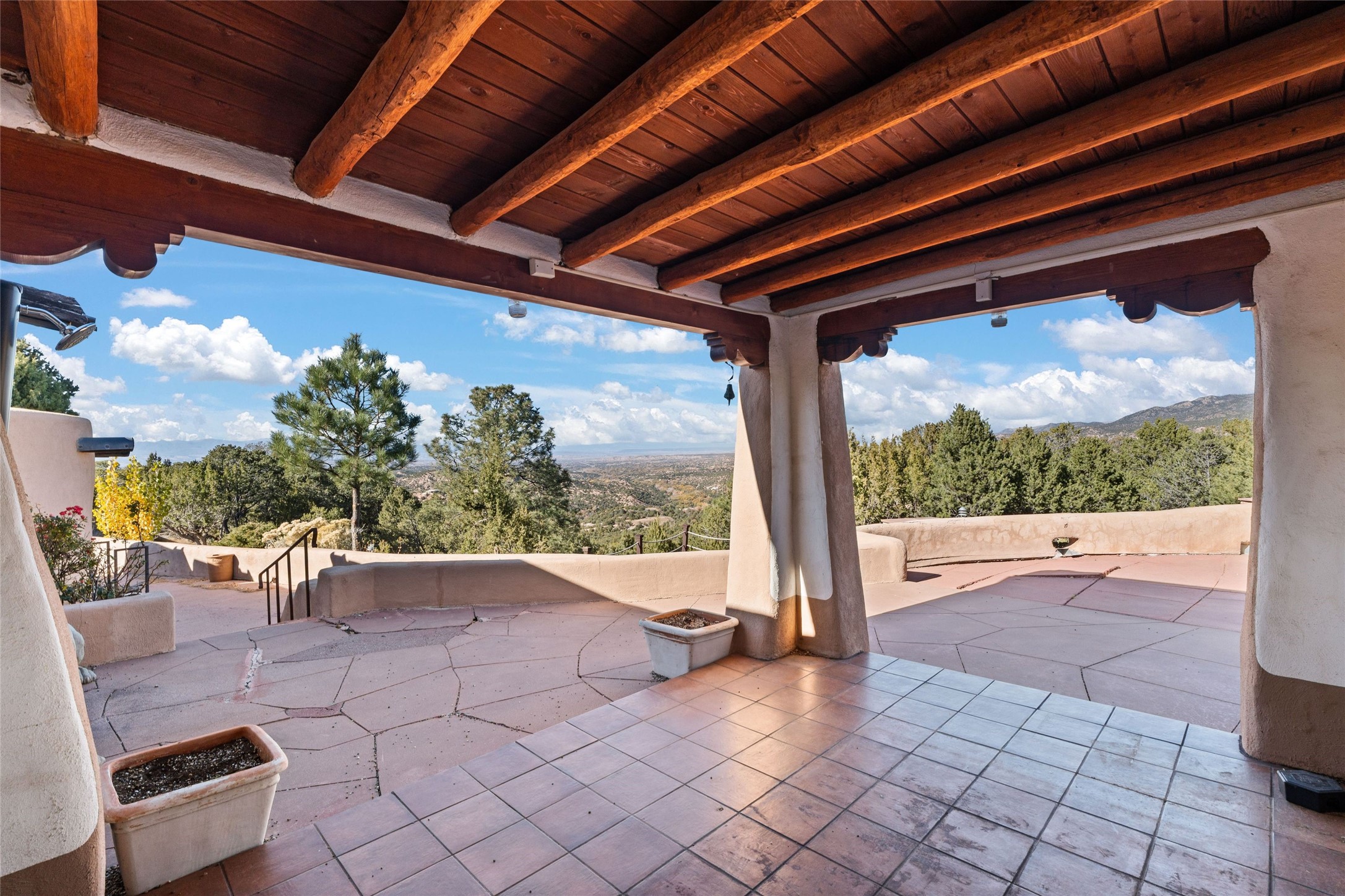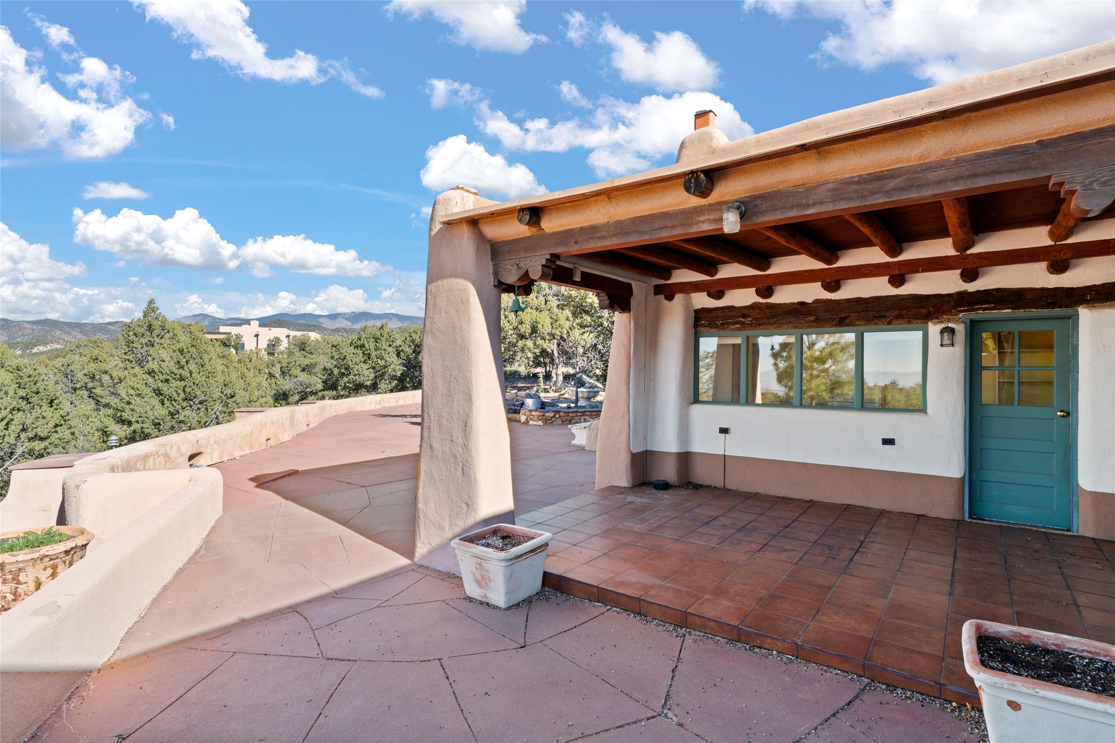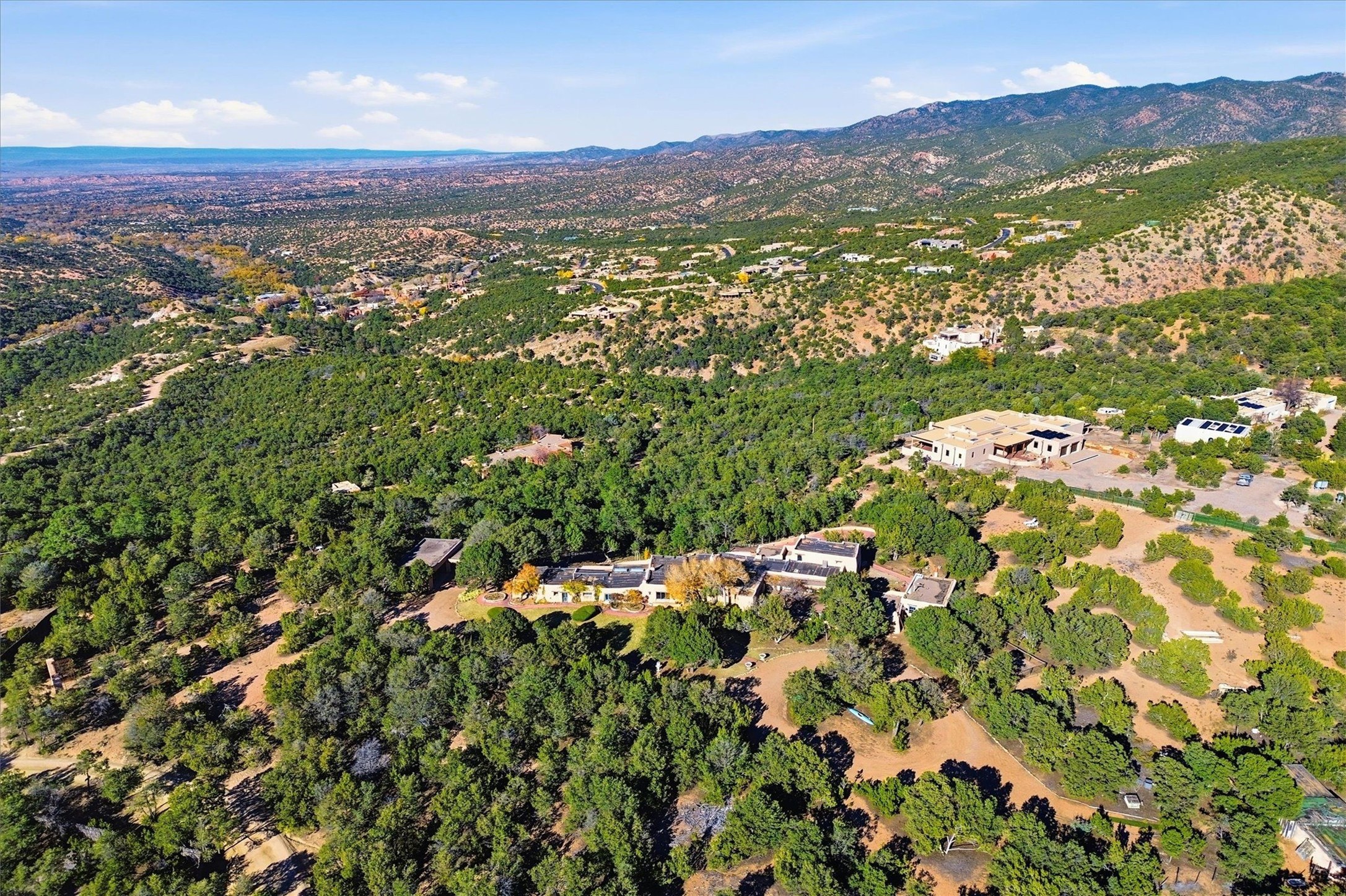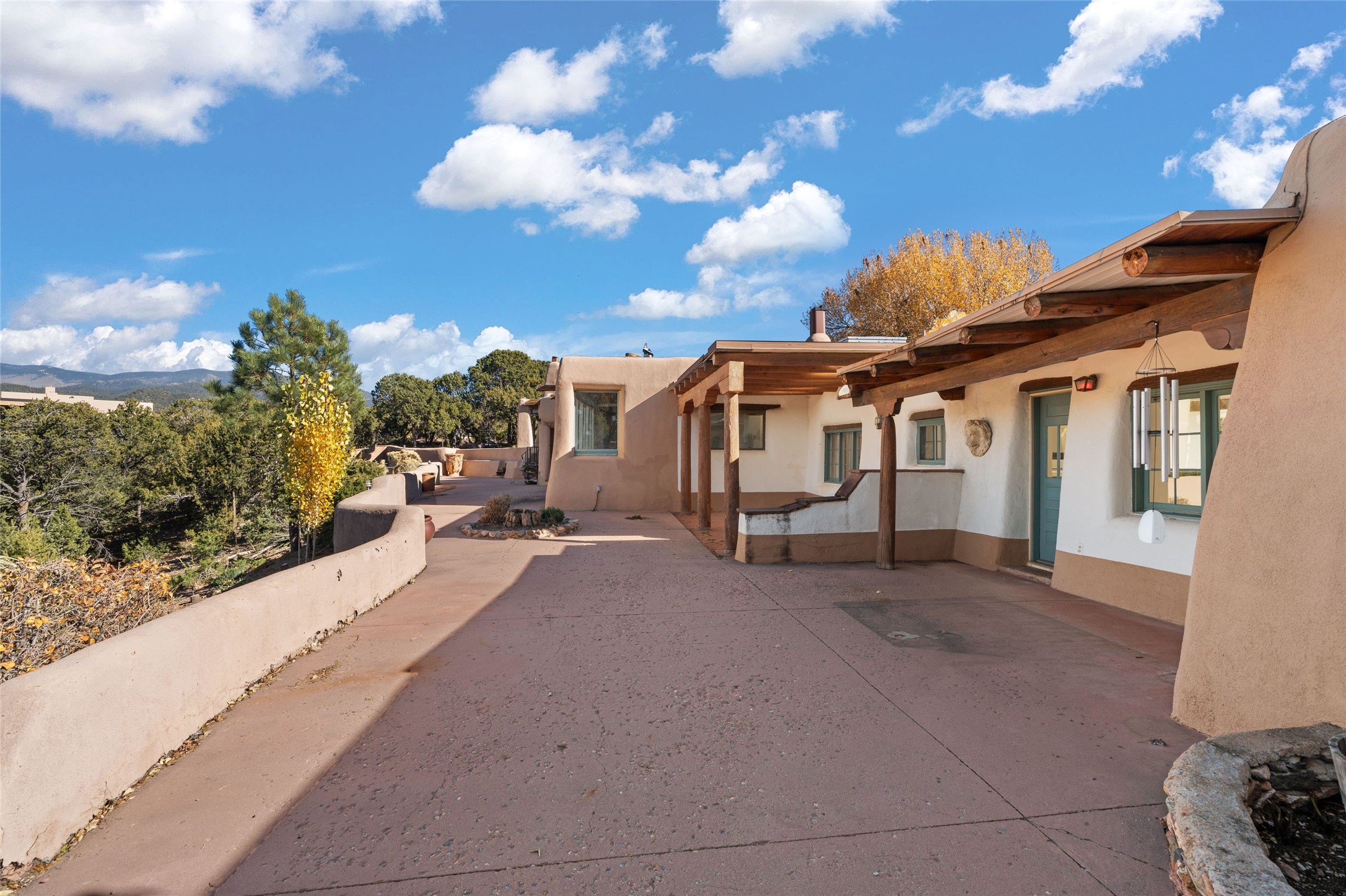 Set atop a private ridgeline with more than seven acres of pristine land, this remarkable residence is both a sanctuary and a celebration of Santa Fe's cultural and architectural heritage. According to prior sellers/listings, this home may have been designed in the 1920s by John Gaw Meem, one of New Mexico's most influential architects (buyer to verify). The home exemplifies the Spanish Pueblo Revival style that helped define Santa Fe's visual identity. Encompassing over 6,000 square feet, this classic triple-adobe hacienda is rich with craftsmanship and character. Hand-carved wooden doors, more than two centuries old, welcome you into spaces graced with flagstone and oak plank floors, massive vigas, and hand-hewn willow herringbone ceilings--each element adding warmth, texture, and timeless appeal. The main residence offers four bedrooms and four baths, complemented by two charming guest casitas. The bright kitchen features a breakfast nook that opens to multiple patios and courtyards, perfect for dining al fresco while taking in the far-reaching mountain views. Distinctive architectural moments define the home: a gracious adobe-arched dining room, coved ceilings, and divided-light windows that fill the interiors with natural light. According to prior sellers/listings, a studio--originally used in the 1930s by artist McHarg (buyer to verify) Davenport of The Rio Grande Painters--serves as a creative retreat with soaring split cedar ceilings, and access to a rooftop viewing area, ideal for sunsets and stargazing. The location is exceptional--completely private yet nearby Santa Fe's historic Plaza, the Santa Fe Opera and approximately 25 minutes to Ski Santa Fe. Disclaimer: Furnished photos are from 2023. Current photos are of unfurnished property. Seller has never resided in home. Property is being sold in AS-IS, in its current condition.