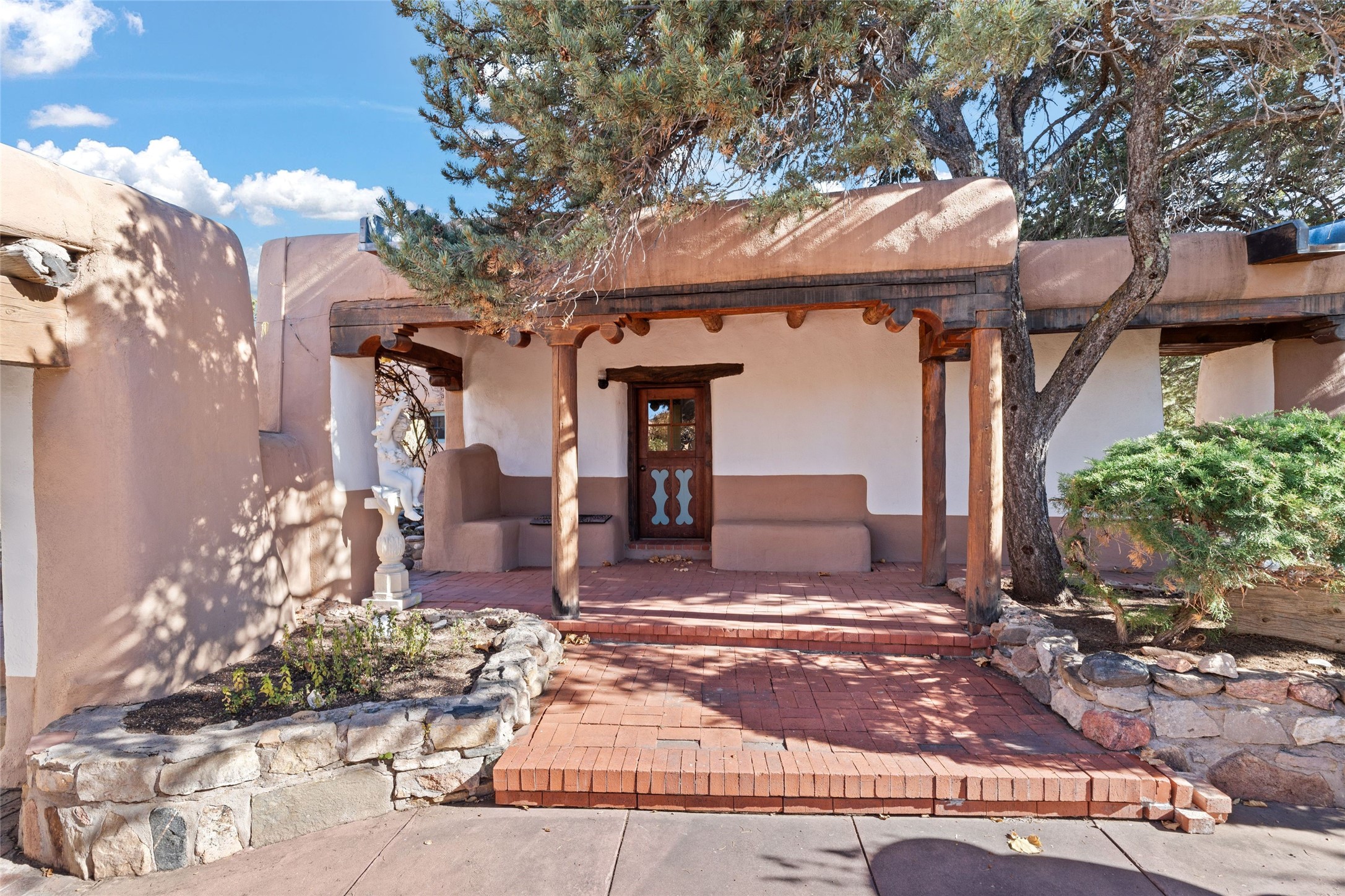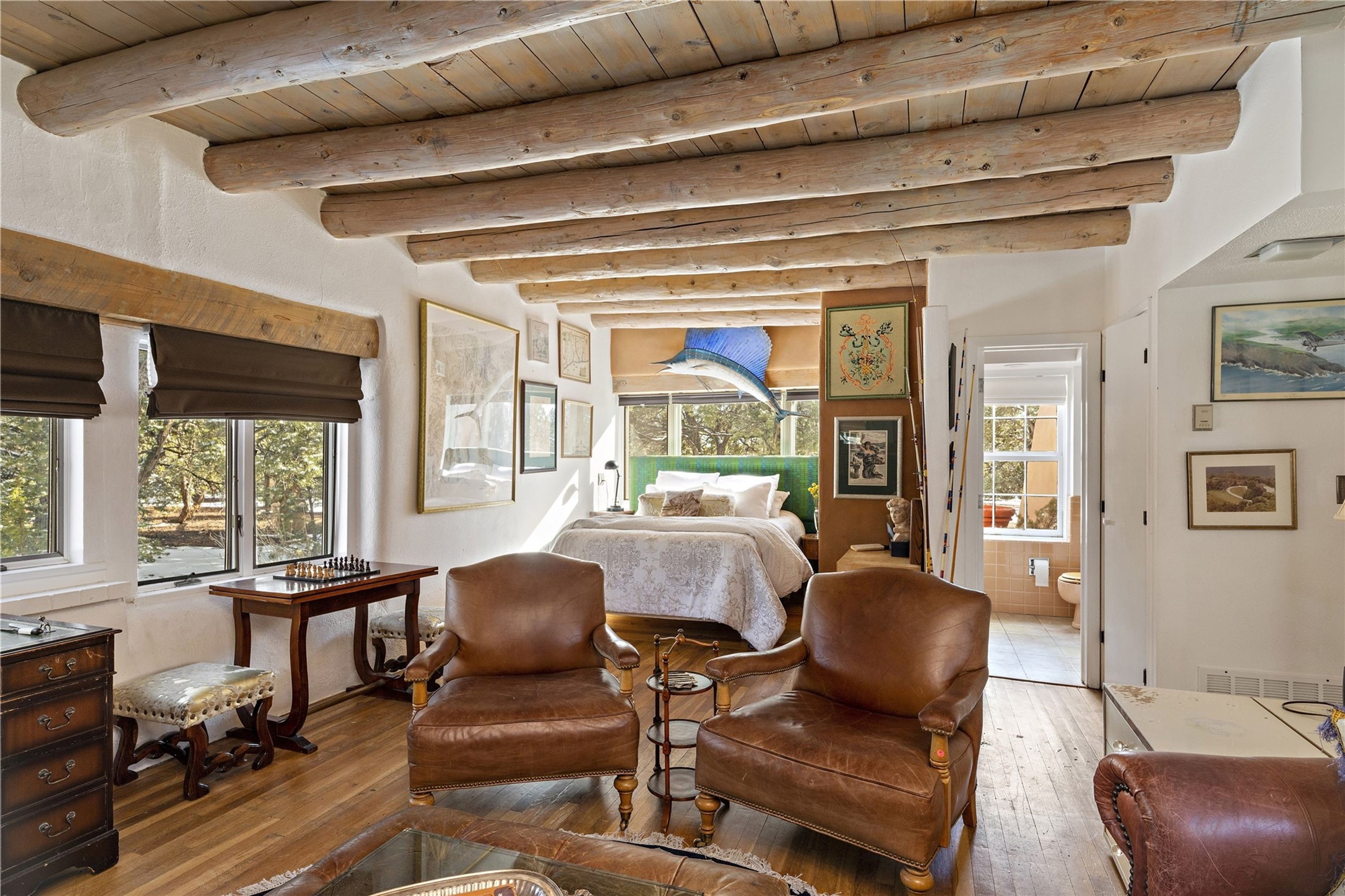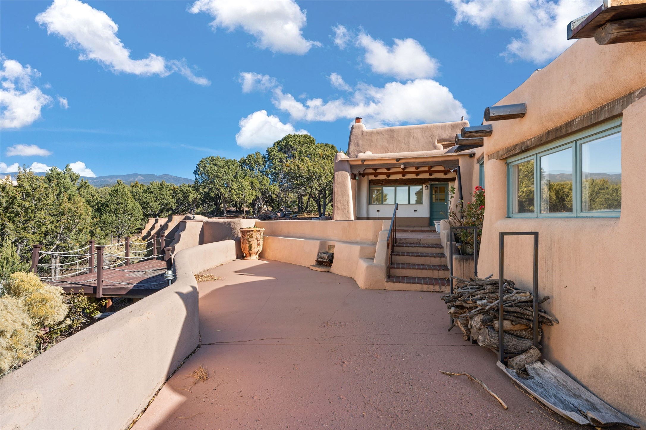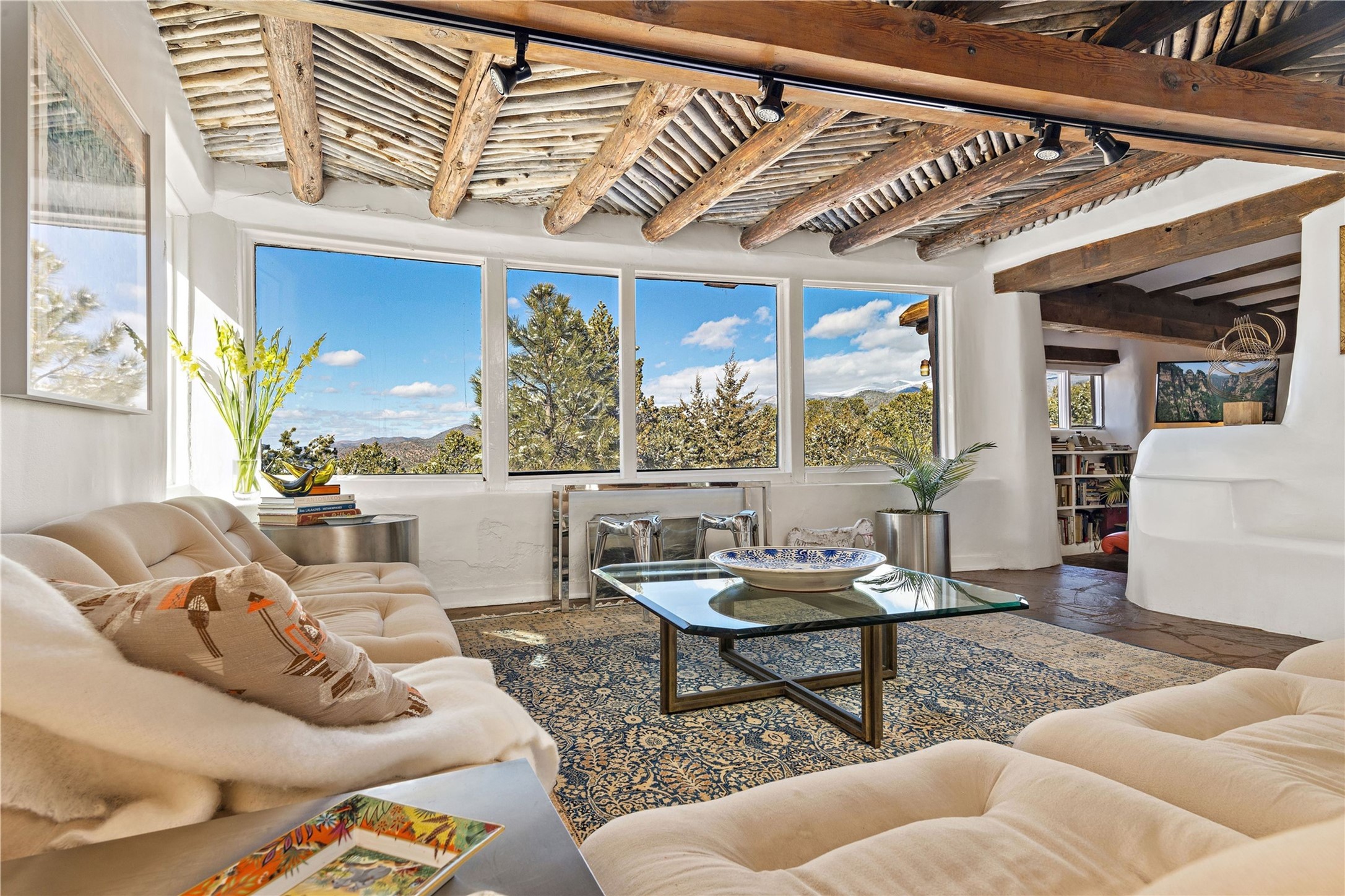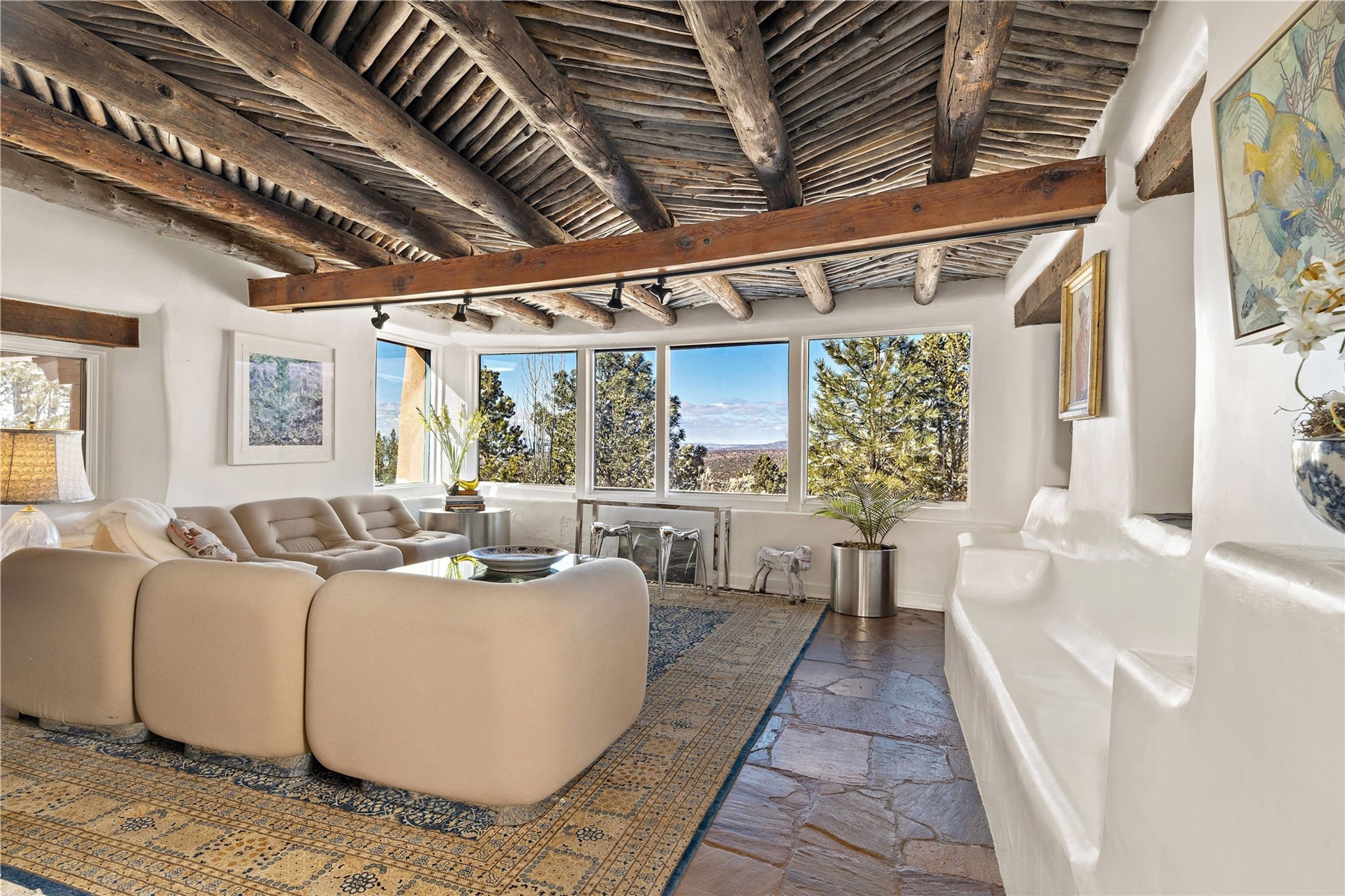 Set atop a private ridgeline with more than seven acres of pristine land, this remarkable residence is both a sanctuary and a celebration of Santa Fe's cultural and architectural heritage. According to prior sellers/listings, this home may have been designed in the 1920s by John Gaw Meem, one of New Mexico's most influential architects (buyer to verify). The home exemplifies the Spanish Pueblo Revival style that helped define Santa Fe's visual identity. Encompassing over 6,000 square feet, this classic triple-adobe hacienda is rich with craftsmanship and character. Hand-carved wooden doors, more than two centuries old, welcome you into spaces graced with flagstone and oak plank floors, massive vigas, and hand-hewn willow herringbone ceilings--each element adding warmth, texture, and timeless appeal. The main residence offers four bedrooms and four baths, complemented by two charming guest casitas. The bright kitchen features a breakfast nook that opens to multiple patios and courtyards, perfect for dining al fresco while taking in the far-reaching mountain views. Distinctive architectural moments define the home: a gracious adobe-arched dining room, coved ceilings, and divided-light windows that fill the interiors with natural light. According to prior sellers/listings, a studio--originally used in the 1930s by artist McHarg (buyer to verify) Davenport of The Rio Grande Painters--serves as a creative retreat with soaring split cedar ceilings, and access to a rooftop viewing area, ideal for sunsets and stargazing. The location is exceptional--completely private yet nearby Santa Fe's historic Plaza, the Santa Fe Opera and approximately 25 minutes to Ski Santa Fe. Disclaimer: Furnished photos are from 2023. Current photos are of unfurnished property. Seller has never resided in home. Property is being sold in AS-IS, in its current condition.