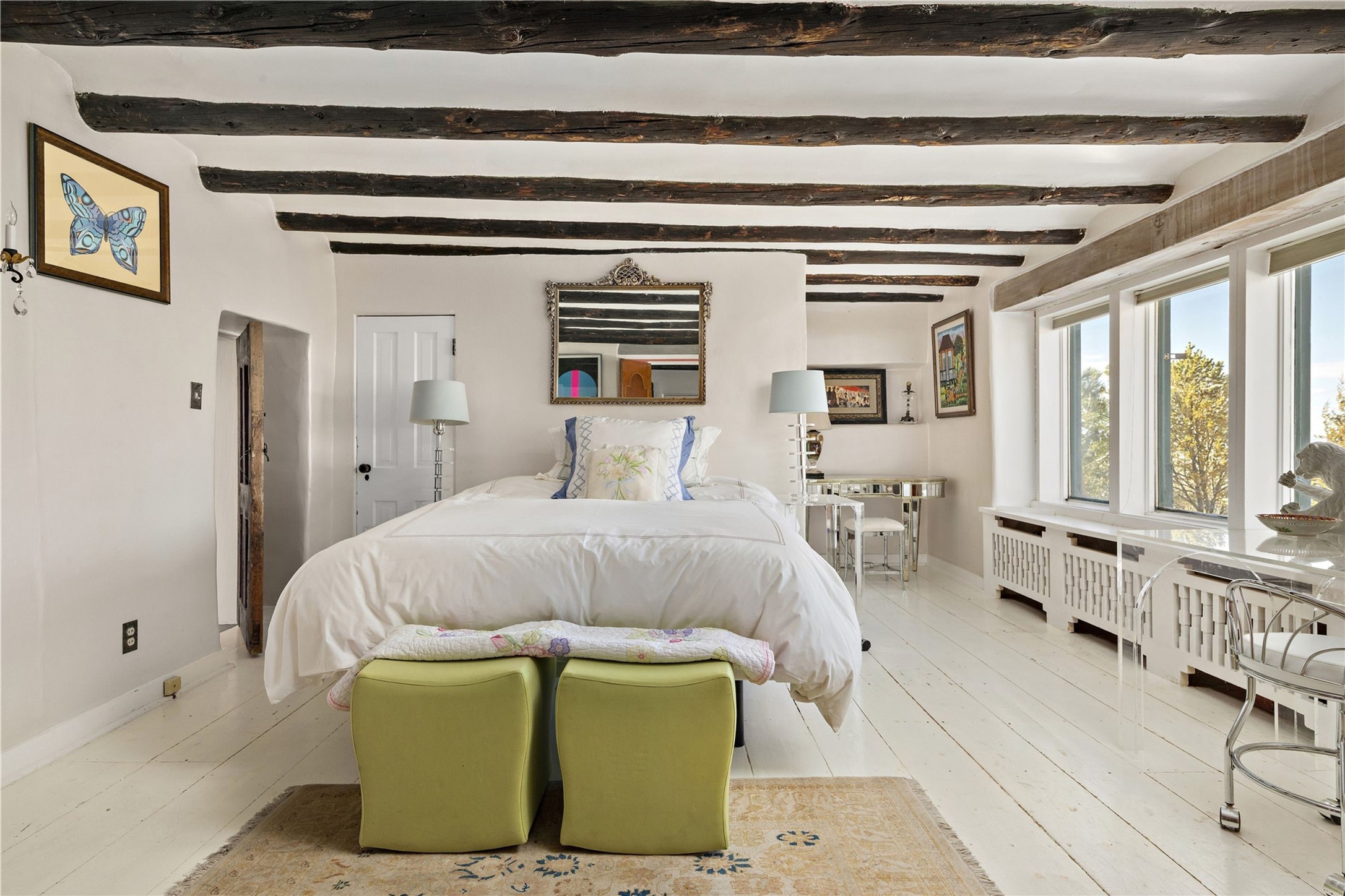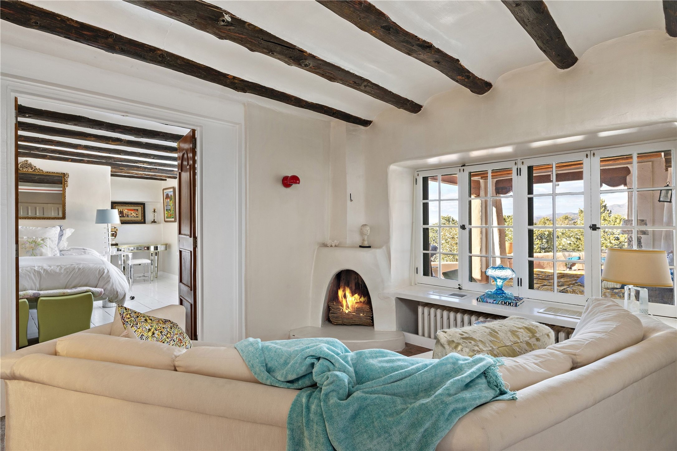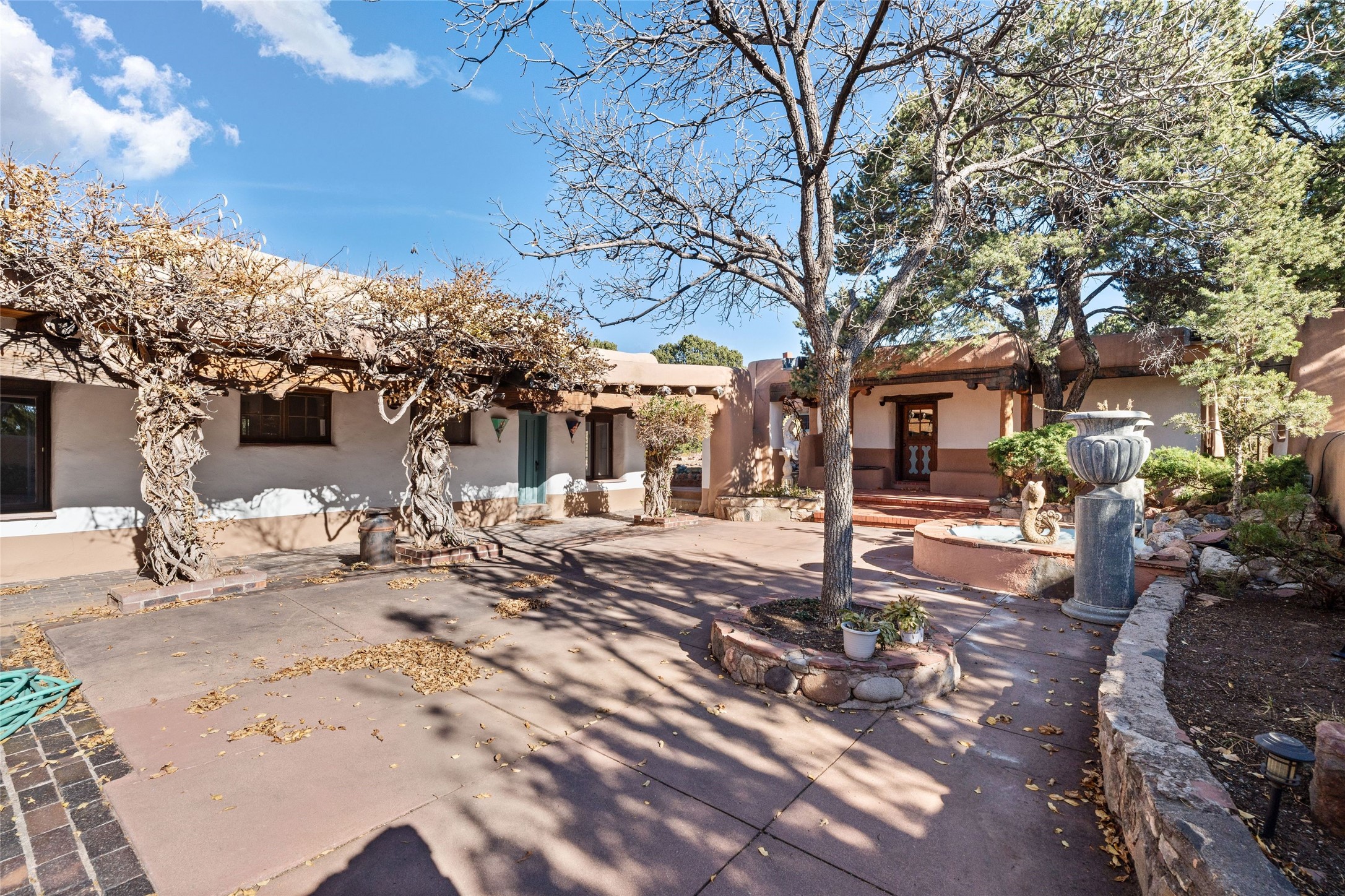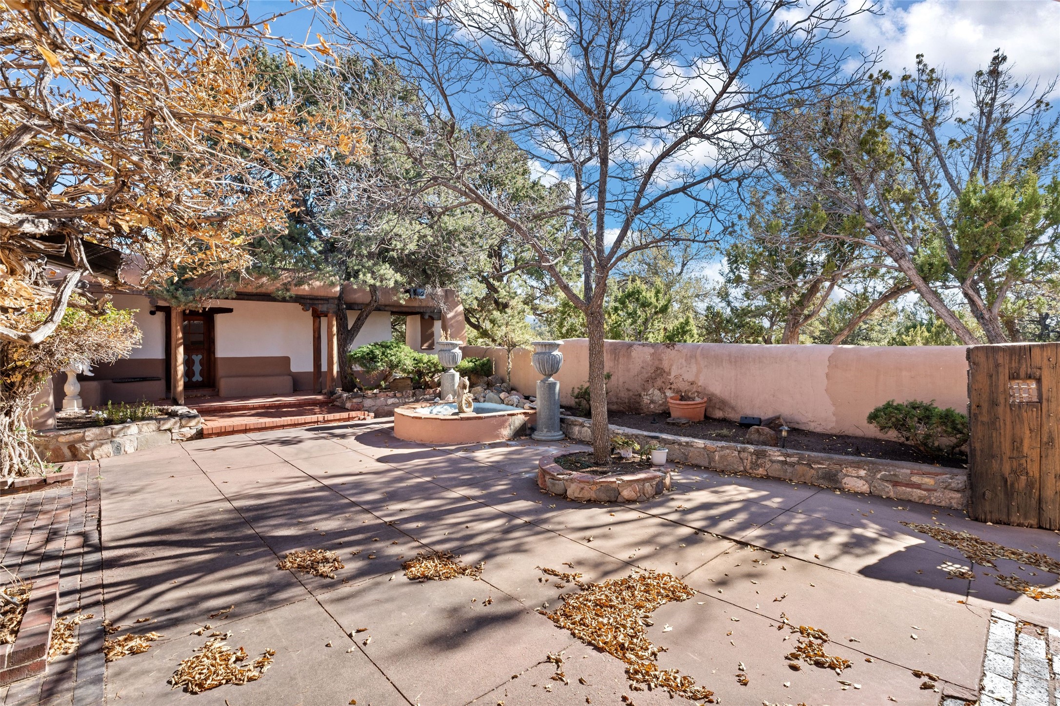 Set atop a private ridgeline with more than seven acres of pristine land, this remarkable residence is both a sanctuary and a celebration of Santa Fe's cultural and architectural heritage. According to prior sellers/listings, this home may have been designed in the 1920s by John Gaw Meem, one of New Mexico's most influential architects (buyer to verify). The home exemplifies the Spanish Pueblo Revival style that helped define Santa Fe's visual identity. Encompassing over 6,000 square feet, this classic triple-adobe hacienda is rich with craftsmanship and character. Hand-carved wooden doors, more than two centuries old, welcome you into spaces graced with flagstone and oak plank floors, massive vigas, and hand-hewn willow herringbone ceilings--each element adding warmth, texture, and timeless appeal. The main residence offers four bedrooms and four baths, complemented by two charming guest casitas. The bright kitchen features a breakfast nook that opens to multiple patios and courtyards, perfect for dining al fresco while taking in the far-reaching mountain views. Distinctive architectural moments define the home: a gracious adobe-arched dining room, coved ceilings, and divided-light windows that fill the interiors with natural light. According to prior sellers/listings, a studio--originally used in the 1930s by artist McHarg (buyer to verify) Davenport of The Rio Grande Painters--serves as a creative retreat with soaring split cedar ceilings, and access to a rooftop viewing area, ideal for sunsets and stargazing. The location is exceptional--completely private yet nearby Santa Fe's historic Plaza, the Santa Fe Opera and approximately 25 minutes to Ski Santa Fe. Disclaimer: Furnished photos are from 2023. Current photos are of unfurnished property. Seller has never resided in home. Property is being sold in AS-IS, in its current condition.