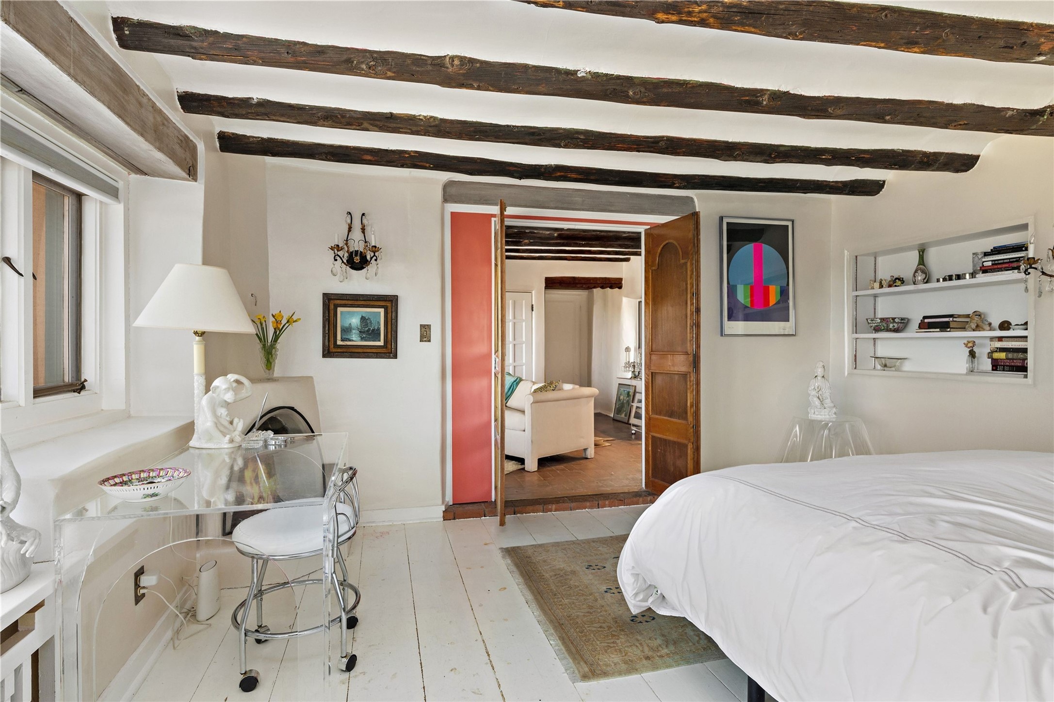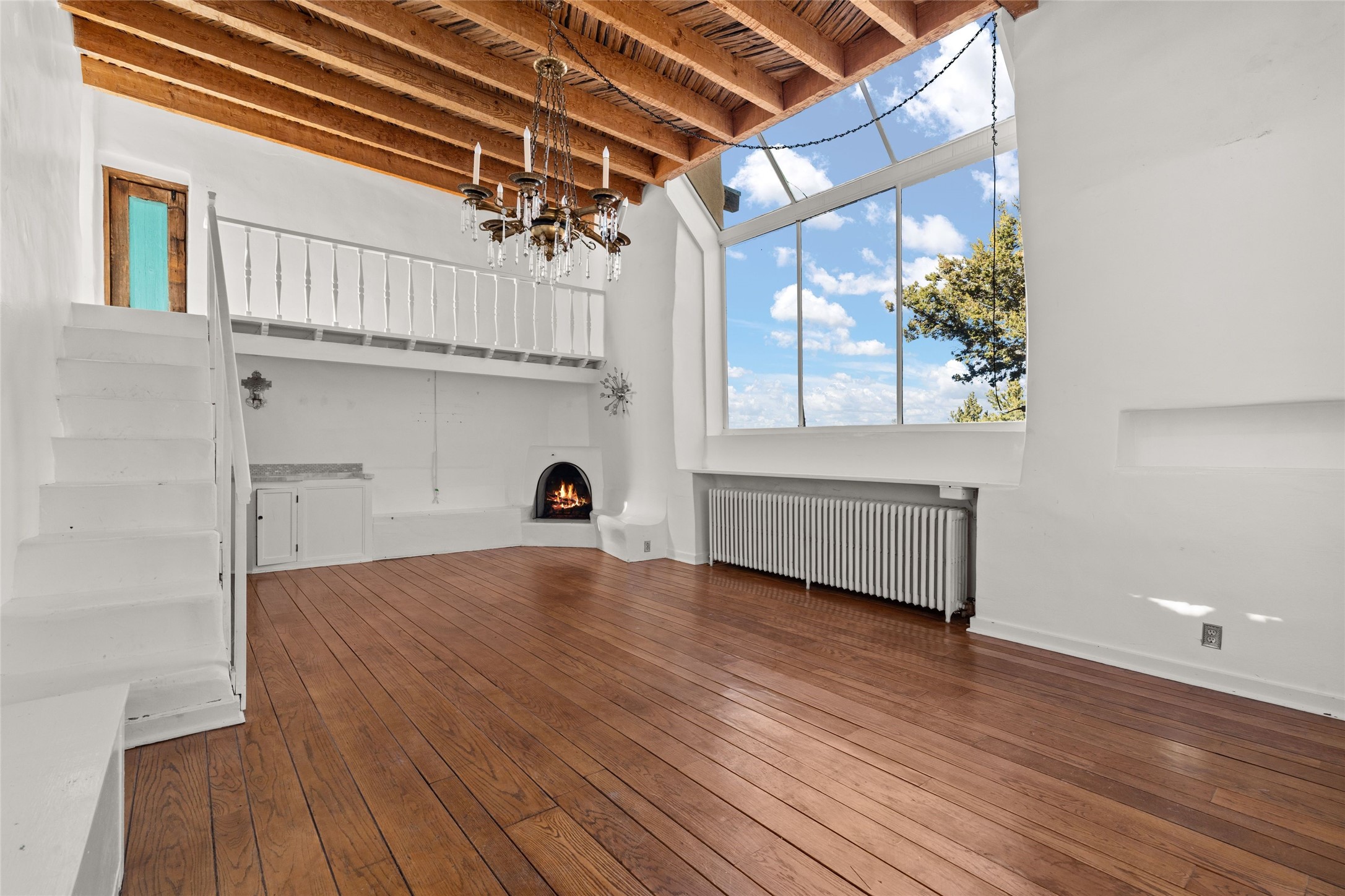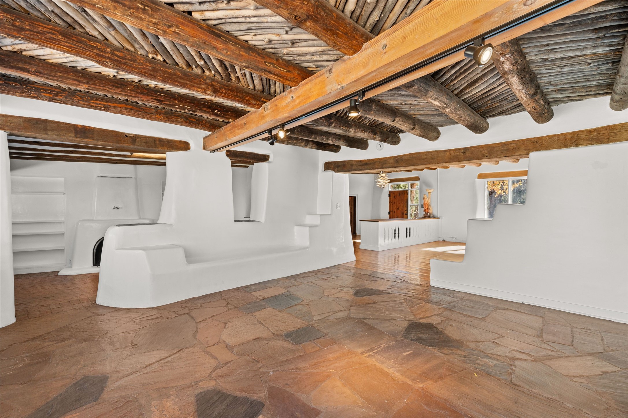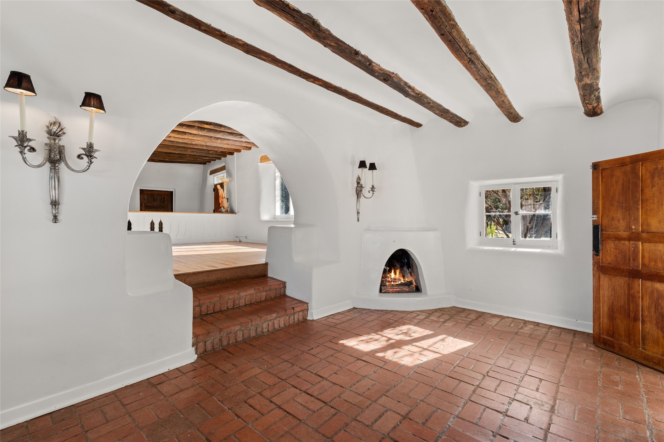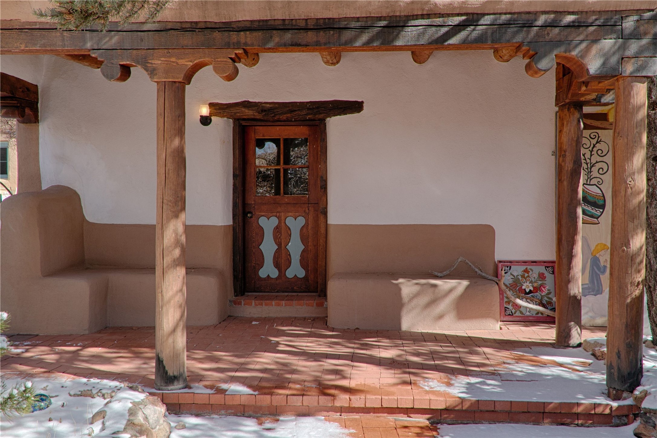 Set atop a private ridgeline with more than seven acres of pristine land, this remarkable residence is both a sanctuary and a celebration of Santa Fe's cultural and architectural heritage. According to prior sellers/listings, this home may have been designed in the 1920s by John Gaw Meem, one of New Mexico's most influential architects (buyer to verify). The home exemplifies the Spanish Pueblo Revival style that helped define Santa Fe's visual identity. Encompassing over 6,000 square feet, this classic triple-adobe hacienda is rich with craftsmanship and character. Hand-carved wooden doors, more than two centuries old, welcome you into spaces graced with flagstone and oak plank floors, massive vigas, and hand-hewn willow herringbone ceilings--each element adding warmth, texture, and timeless appeal. The main residence offers four bedrooms and four baths, complemented by two charming guest casitas. The bright kitchen features a breakfast nook that opens to multiple patios and courtyards, perfect for dining al fresco while taking in the far-reaching mountain views. Distinctive architectural moments define the home: a gracious adobe-arched dining room, coved ceilings, and divided-light windows that fill the interiors with natural light. According to prior sellers/listings, a studio--originally used in the 1930s by artist McHarg (buyer to verify) Davenport of The Rio Grande Painters--serves as a creative retreat with soaring split cedar ceilings, and access to a rooftop viewing area, ideal for sunsets and stargazing. The location is exceptional--completely private yet nearby Santa Fe's historic Plaza, the Santa Fe Opera and approximately 25 minutes to Ski Santa Fe. Disclaimer: Furnished photos are from 2023. Current photos are of unfurnished property. Seller has never resided in home. Property is being sold in AS-IS, in its current condition.