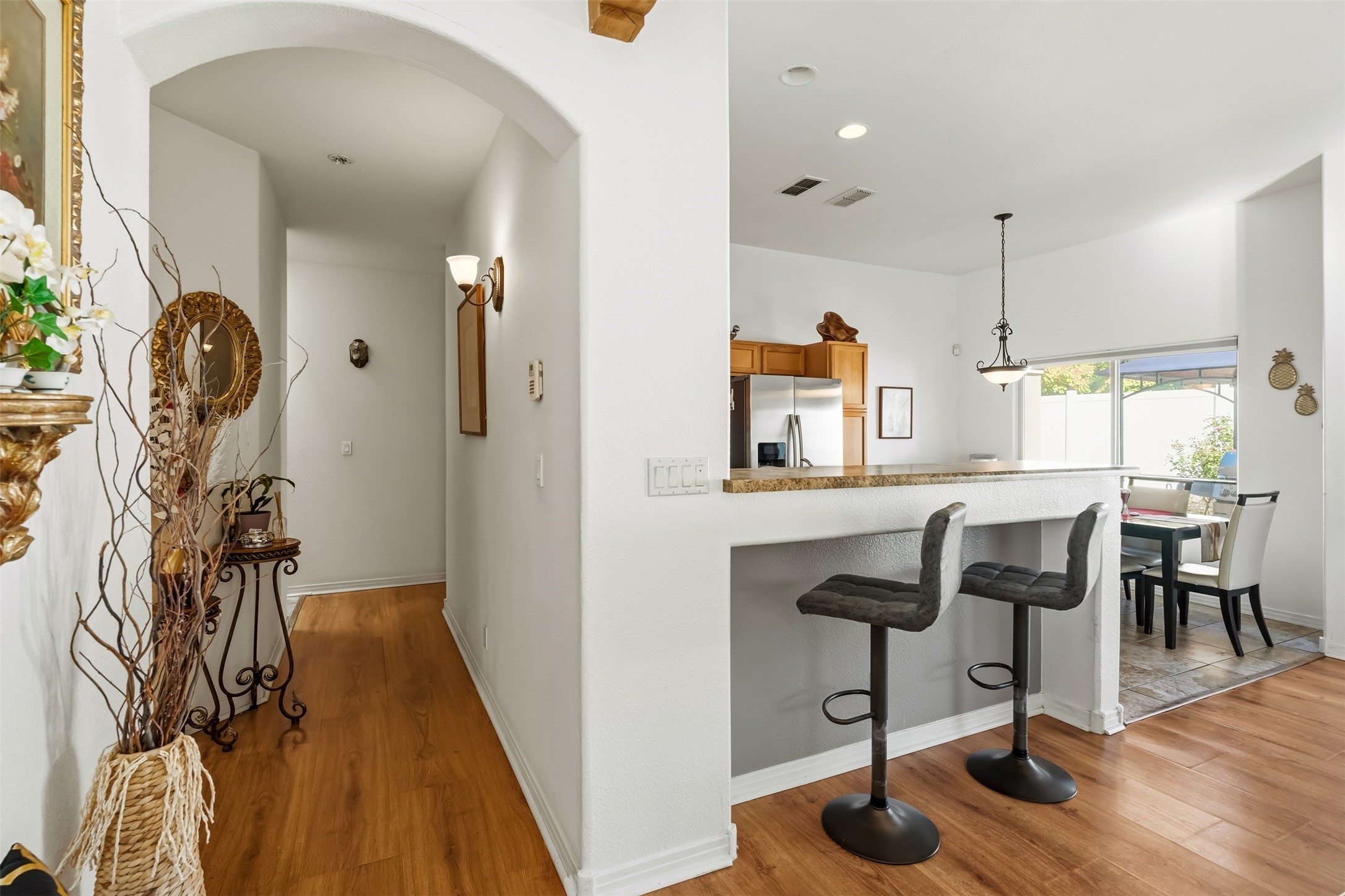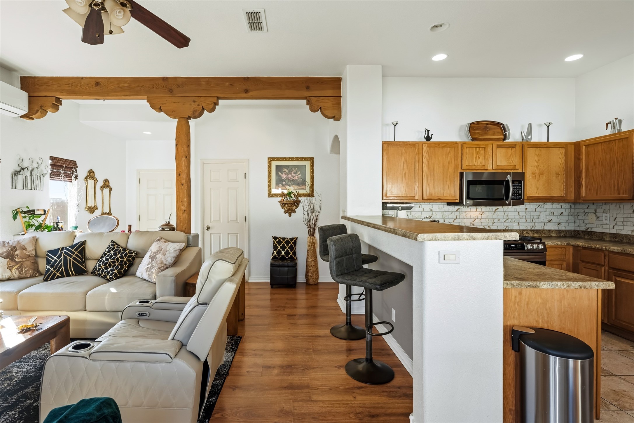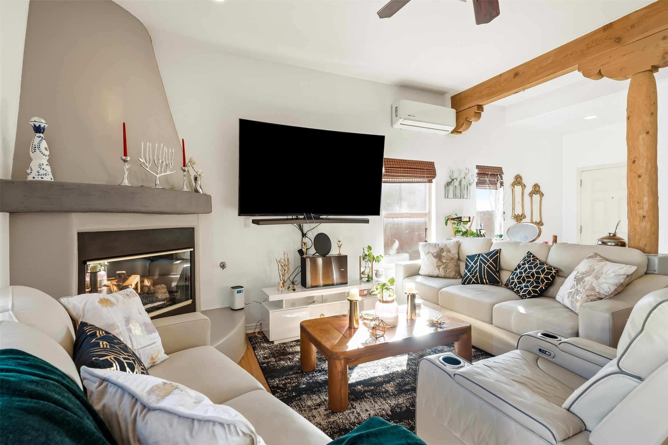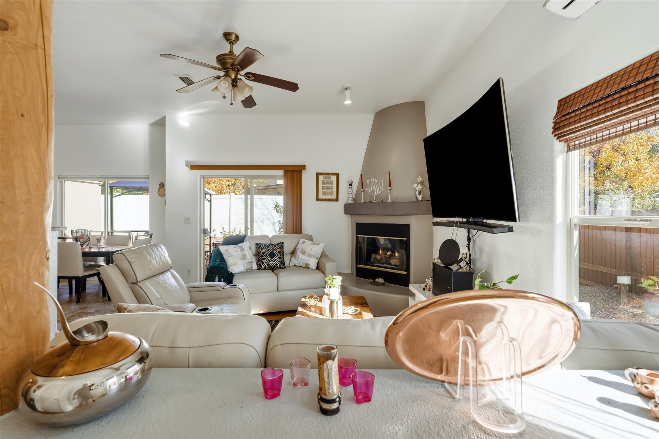 Impeccably maintained and move-in ready, this 3-bedroom, 2-bathroom residence in Tierra Contenta combines comfort, character, and convenience. The expansive living area boasts vaulted ceilings and a welcoming gas kiva fireplace, ideal for both relaxation and entertaining. Constructed in 2006, this single-level home encompasses approximately 1,359 square feet, a two-car garage, and numerous thoughtful updates.Stove, refrigerator, and microwave were recently replaced, and a mini split was installed in 2021, providing enhanced year-round comfort. Roof maintenance was completed in 2024, ensuring peace of mind and longevity.The recently landscaped yard features rose bushes, an apple tree, pine, locust, and sycamore trees, providing a tranquil outdoor retreat. With Pueblo-style stucco exterior, tile and laminate flooring, forced-air heating, and evaporative cooling, the property offers both functionality and aesthetic appeal. Situated near schools, parks, and shopping, this home presents an exceptional opportunity in a vibrant and expanding Santa Fe community.