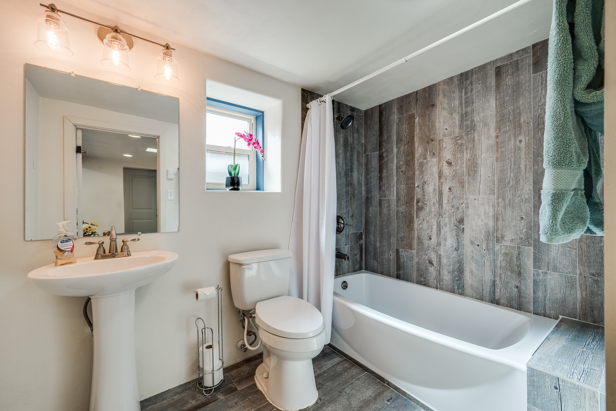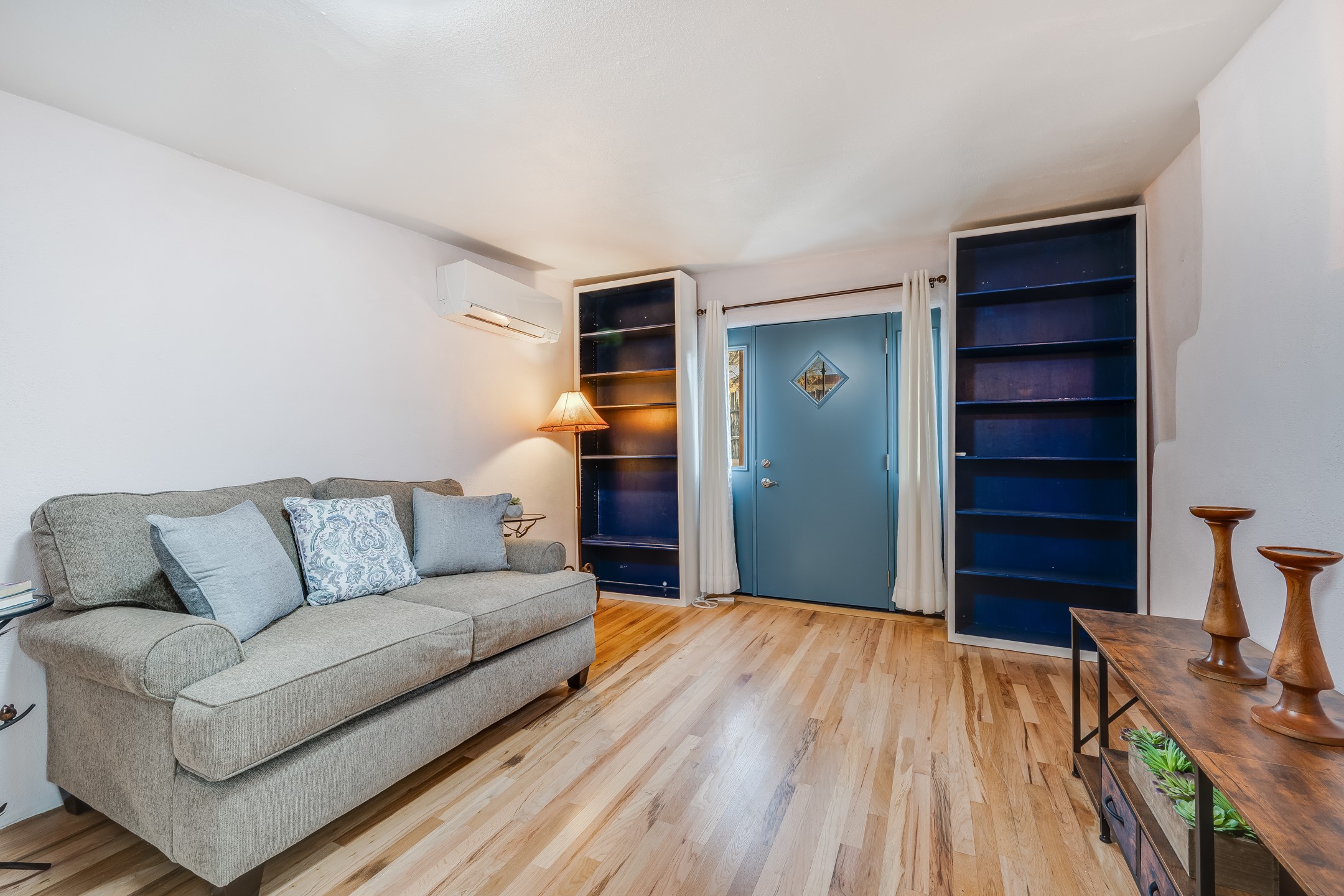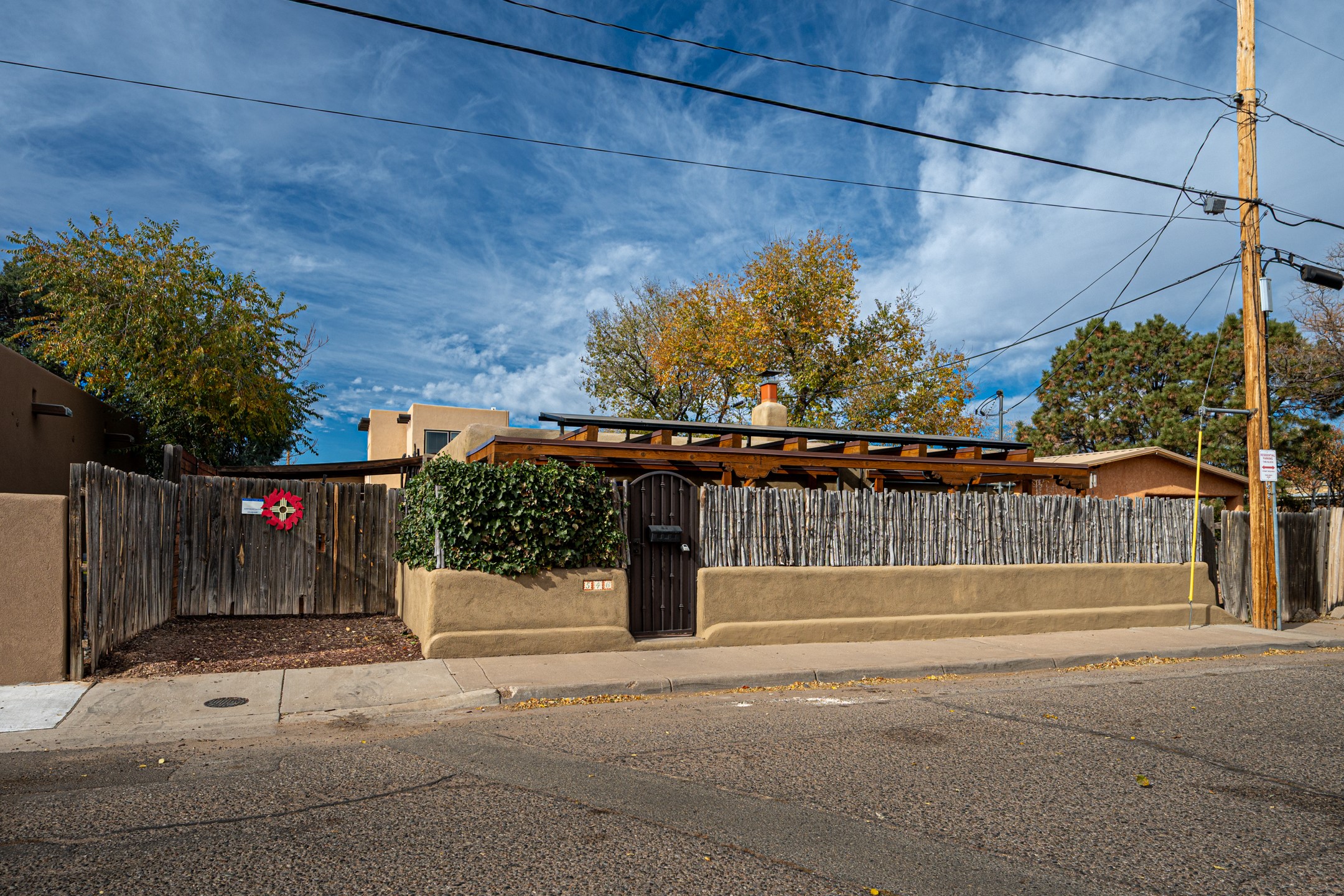 Located in the vibrant Railyard neighborhood just steps from the bustling Santa Fe Farmers Market and the Railyard Park, this charming single level abode offers 1,885 square feet of interior living space, manicured grounds, and exceptional proximity to all things Santa Fe. The floorpan features three spacious bedrooms and two bathrooms, as well as a detached studio with bath and kitchenette for additional living space, artistic endeavors, or work. Timeless New Mexican architecture is showcased throughout, with hand-carved vigas and beams, wood floors, and kiva fireplaces--one gas and one wood-burning. The main kitchen is outfitted with stainless steel appliances, stone countertops, and allows for a seamless flow into the dining and living areas- perfect for everyday living or entertaining guests. Skylights, newer windows and French doors bathe the interior with natural light while a SOLAR PV system adds a touch of sustainability. With a fully fenced yard, the uber private outdoor retreat is complemented by a hot tub and mature fruit and shade trees, a storage shed, and water feature. This downtown oasis is the ideal full-time residence, vacation home, or income-generating property. Whole Foods Market, local shops, parks, and restaurants are just a short distance away, adding convenience to its unique charm. Unparalleled flexibility of use in one of Santa Fe's most accessible and desirable areas at a compelling price point is a true one-of-a-kind opportunity.