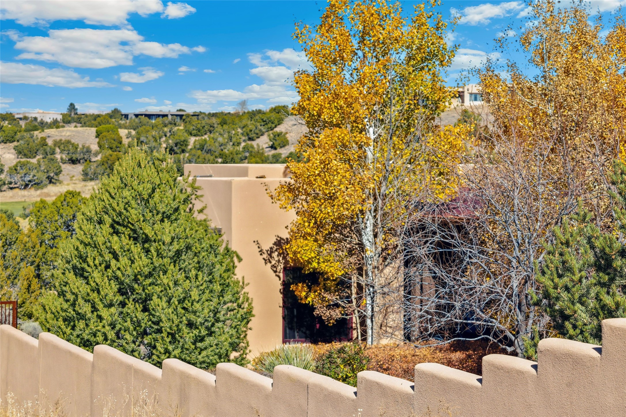 Experience a rare Northern New Mexican architectural gem in the heart of the famed Las Campanas community. Sited on an expansive, premier golf course lot with a park-like ambiance, this extraordinary 4-bedroom residence seamlessly blends iconic Santa Fe warmth with sophisticated modern design. From the lush aspen-lined entrance and wrap-around porch, the home invites you through four sets of French doors into a private front courtyard. Inside, the open-concept living and dining rooms captivate with soaring pitched ceilings, reclaimed wood beams, and a commanding stone fireplace. Newly installed retractable glass walls frame majestic views of the golf course and the Sangre de Cristo and Jemez mountains, creating a seamless, luxury indoor and outdoor living experience. The chef's kitchen is an entertainer's dream, featuring a massive stone-topped island, premium Thermador appliances, and a breakfast bar with direct access to the outdoor BBQ. Retreat to the secluded owner's suite--a sanctuary of peace offering a spa-like bath with a deep soaking tub, dual vanities, and private access to a tranquil outdoor spa. Designed for versatility, the floor plan includes a dedicated office with rich built-ins, two spacious guest bedrooms which share a bath, and a fully independent guest ensuite that serves as a secondary primary suite. Outside, the expansive living areas are surrounded by mature aspens, with over 1,700 square feet of covered portals, creating an unrivaled setting for grand gatherings or quiet reflection. With a recently updated roof, refreshed bathrooms, and meticulous craftsmanship, this one-of-a-kind home represents the absolute pinnacle of Santa Fe living.