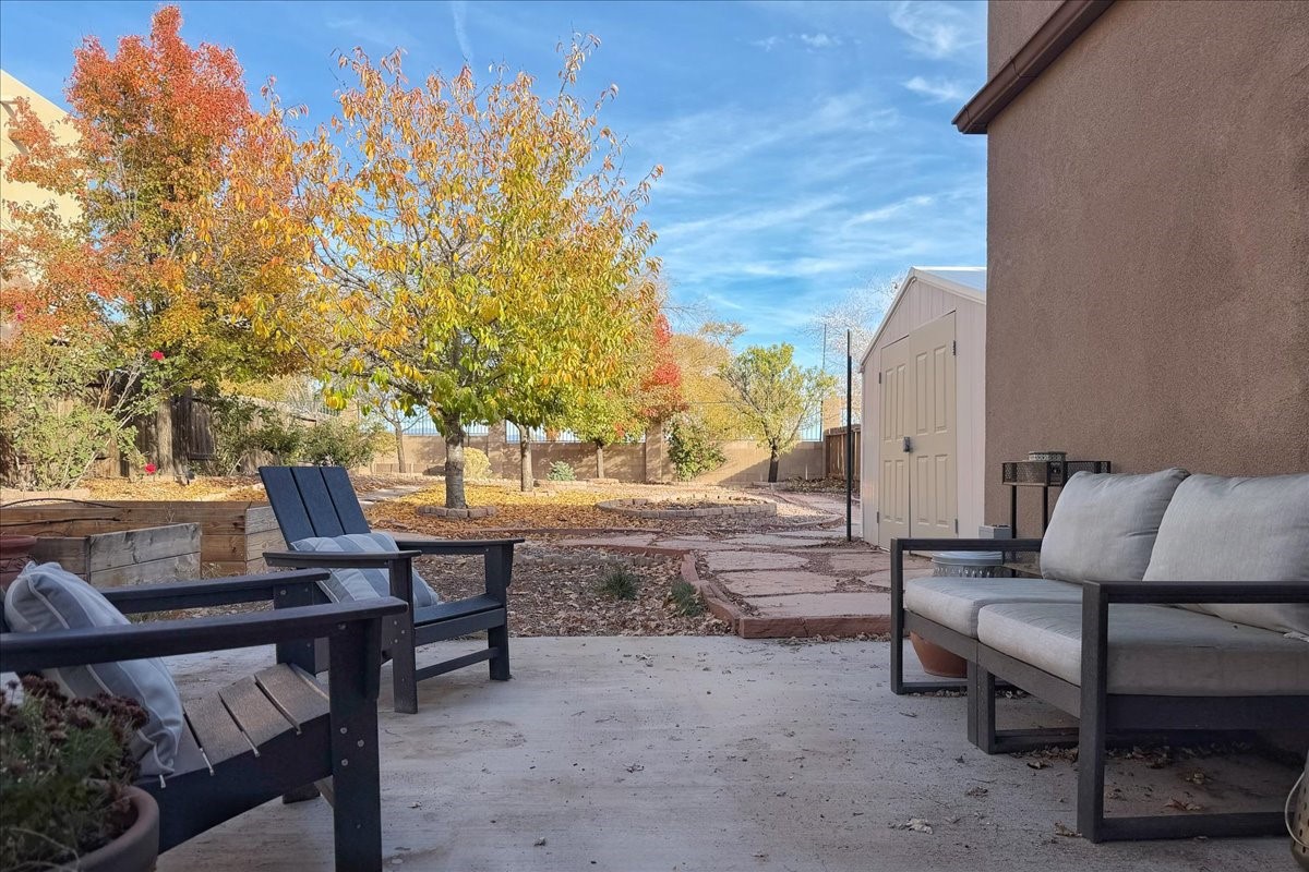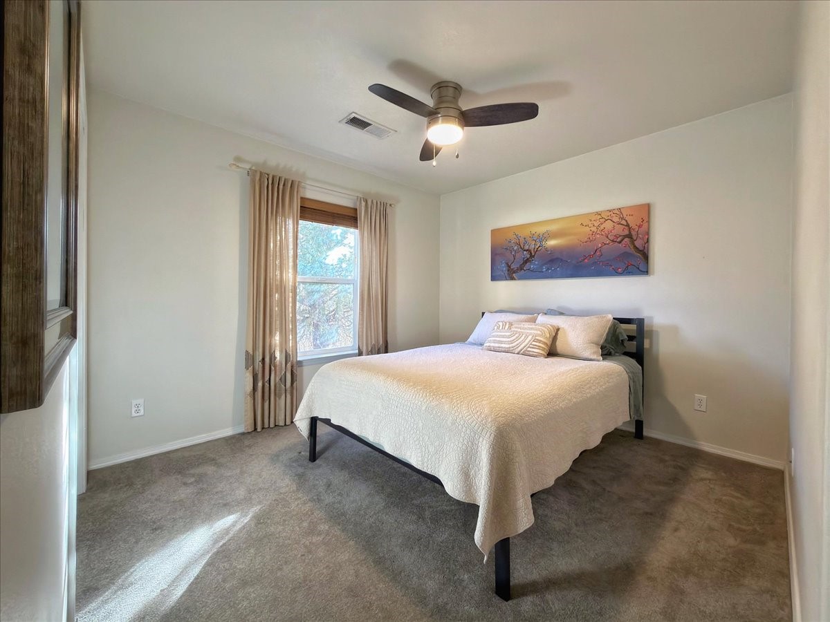 This charming single-level, three-bedroom, two-bath home is perfectly situated in a cul-de-sac, offering privacy and comfort. The spacious living area is filled with natural light, creating an open and welcoming atmosphere. The kitchen features granite countertops and new appliances. The bedrooms are spacious and versatile, ideal for guests, a home office, or a flex room. There are energy-efficient solar panels on the roof. Outside, the large lot includes beautiful rose bushes, raised garden beds, and a storage shed. Conveniently located close to highways, restaurants, and shopping.