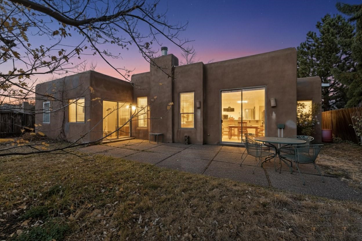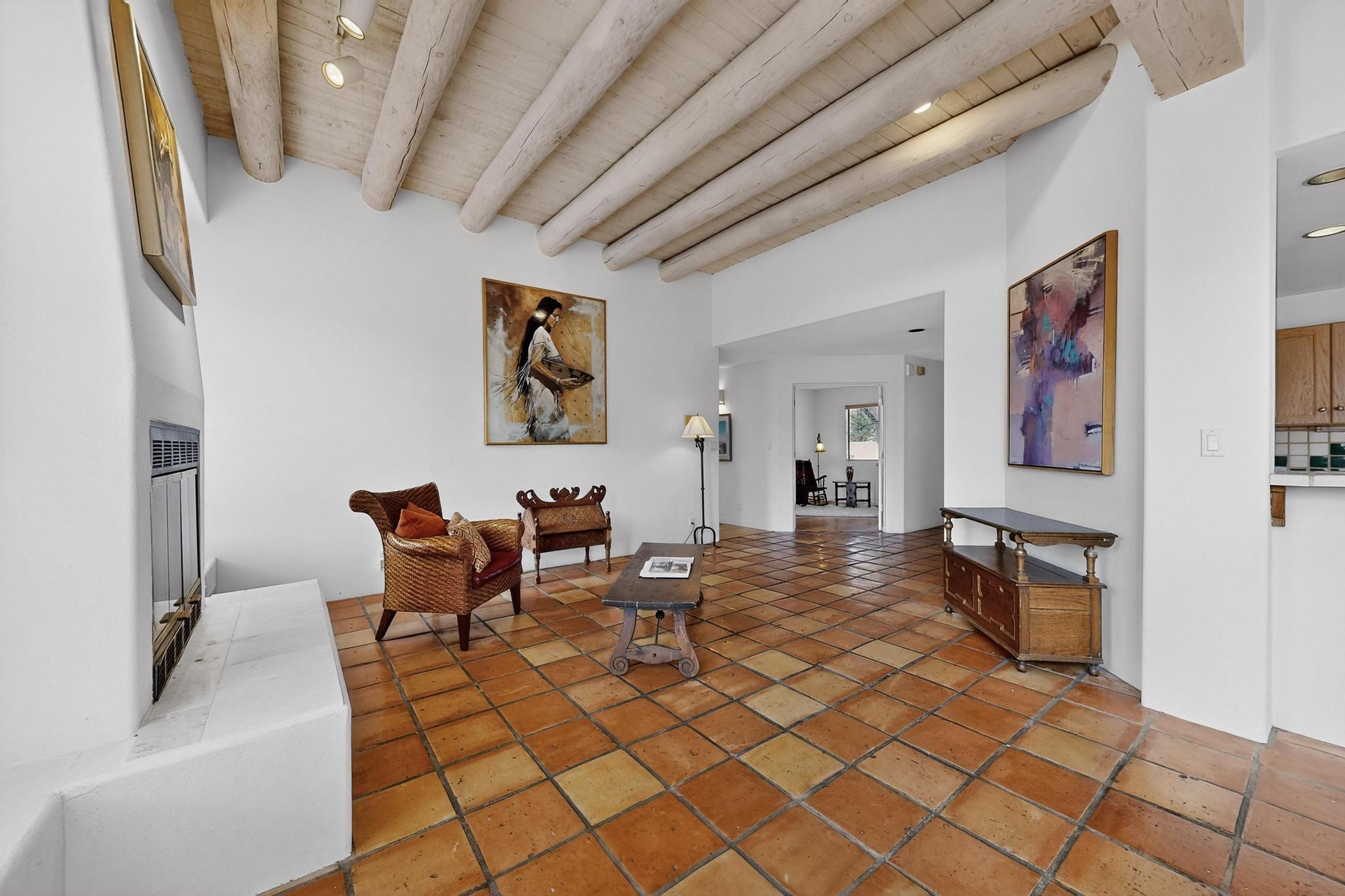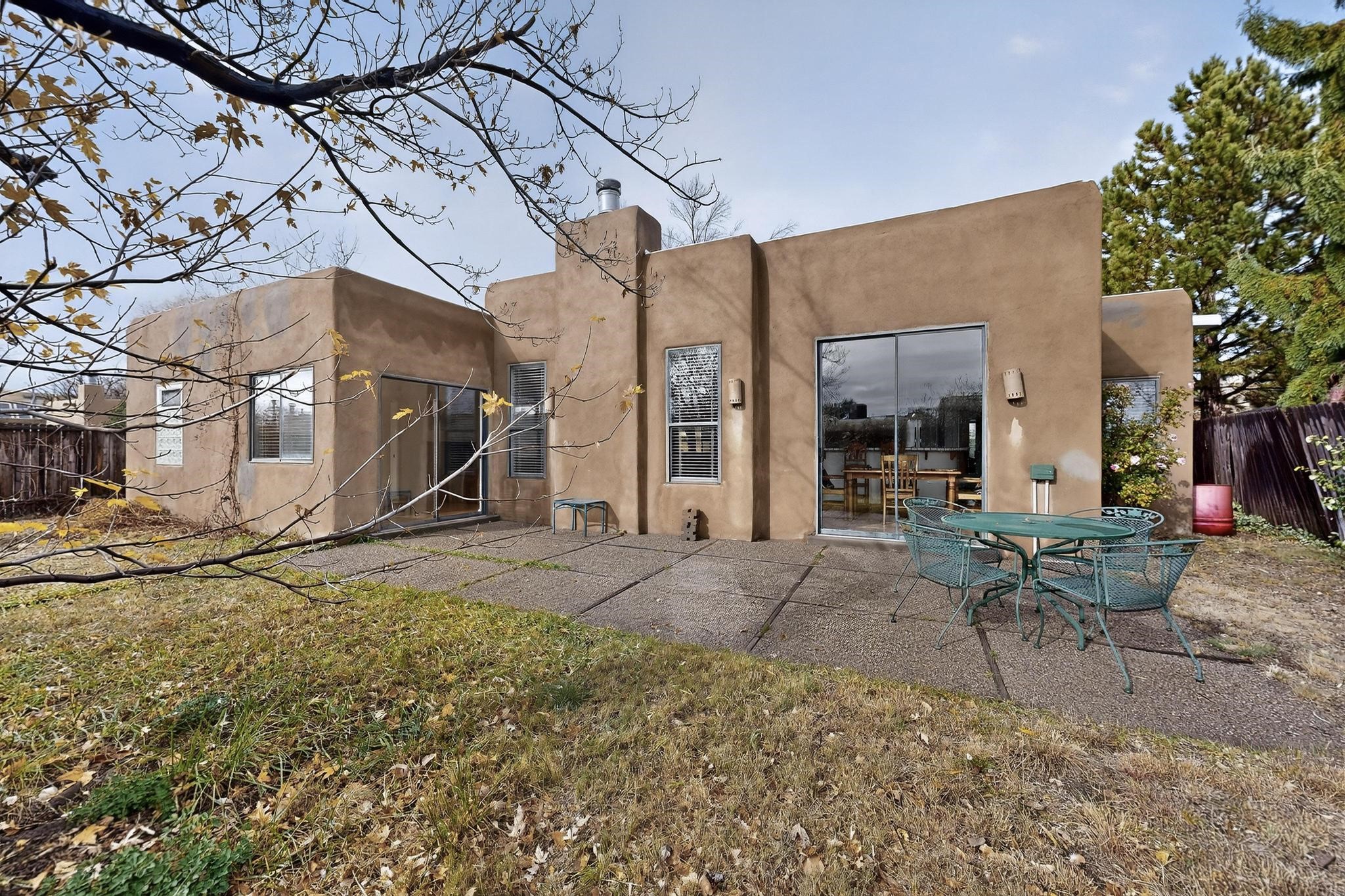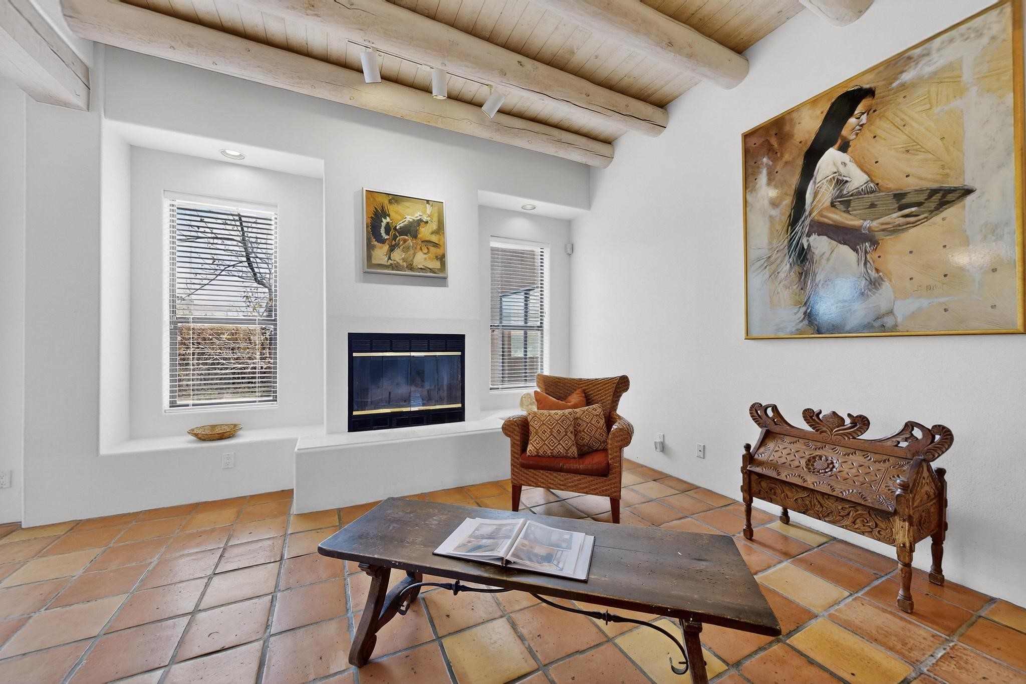 Discover this beautiful single-level home filled with natural light and nestled in the serene Plaza Del Castillo neighborhood. Enter through a walled private courtyard into a space rich with Santa Fe character, featuring high tongue-and-groove ceilings with vigas, a cozy wood-burning fireplace, and a blend of Saltillo tile and wood flooring.Skylights brighten the home, which also offers two full bathrooms, two dining areas, and a spacious primary suite with its own seating area--ideal for a reading nook or quiet retreat.Warm, inviting, and full of Southwestern charm, this home is ready to be enjoyed!