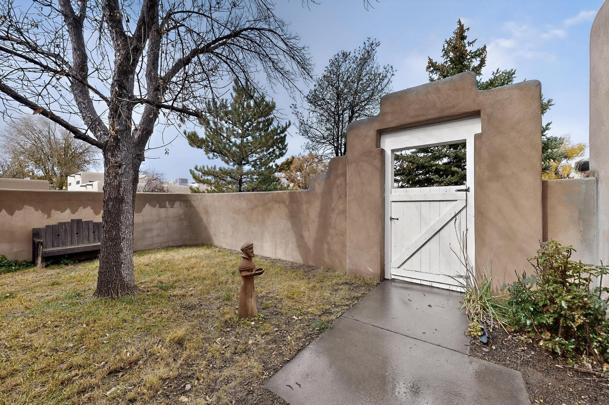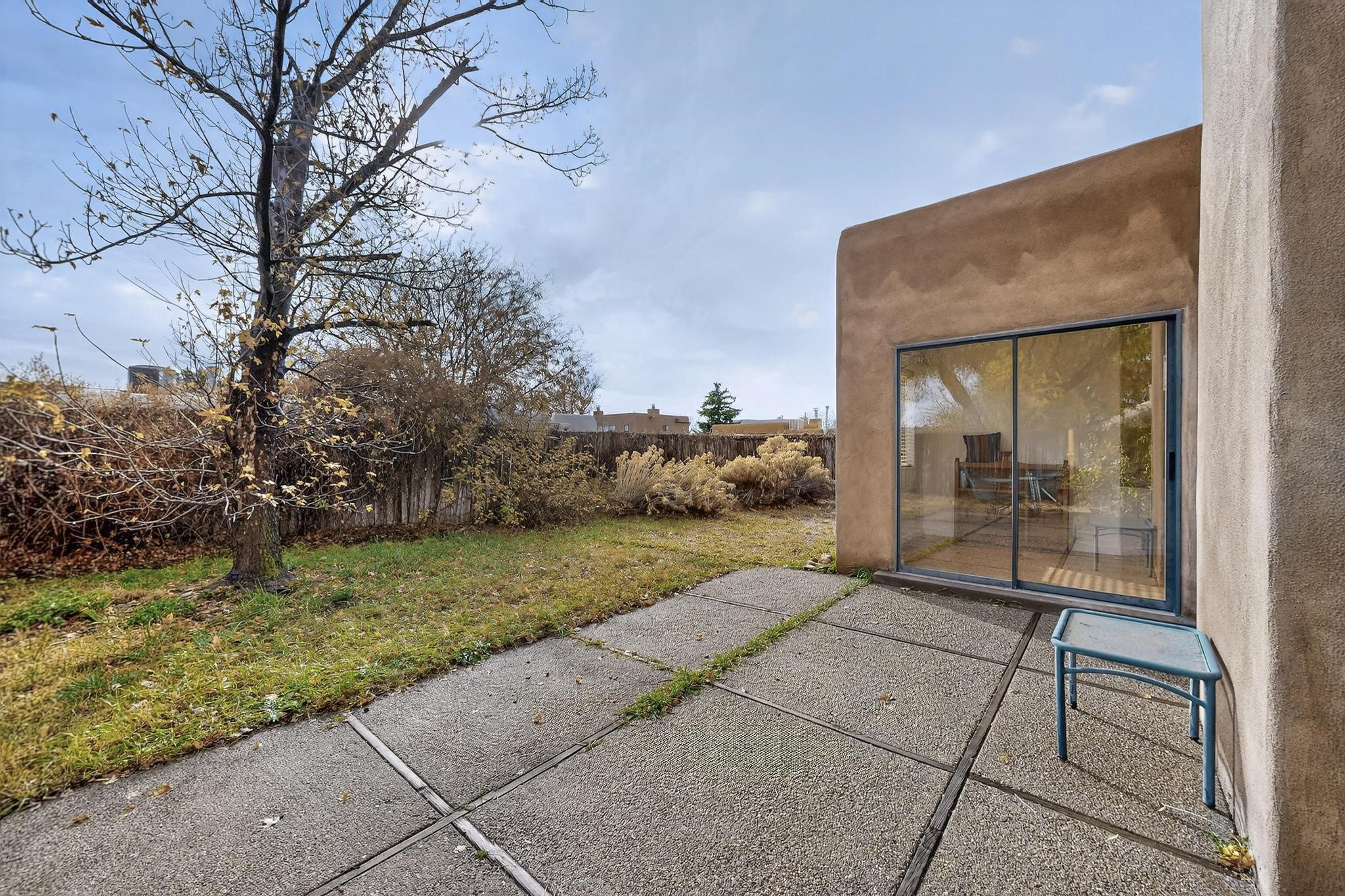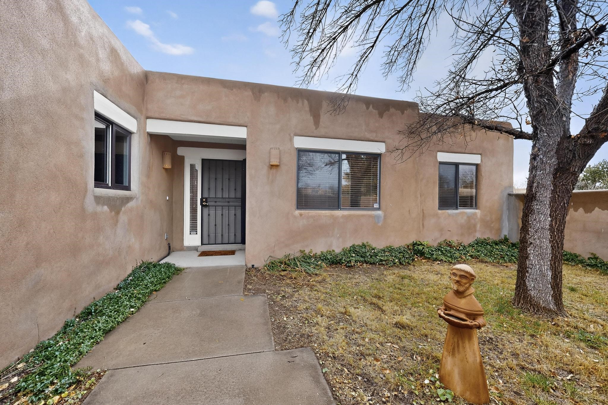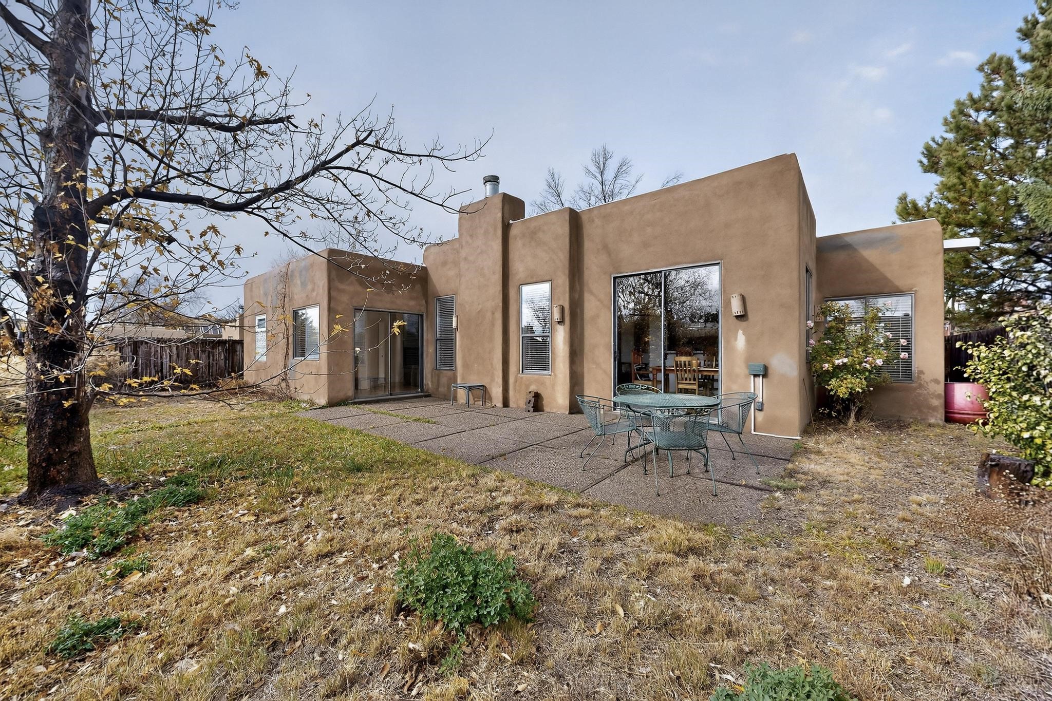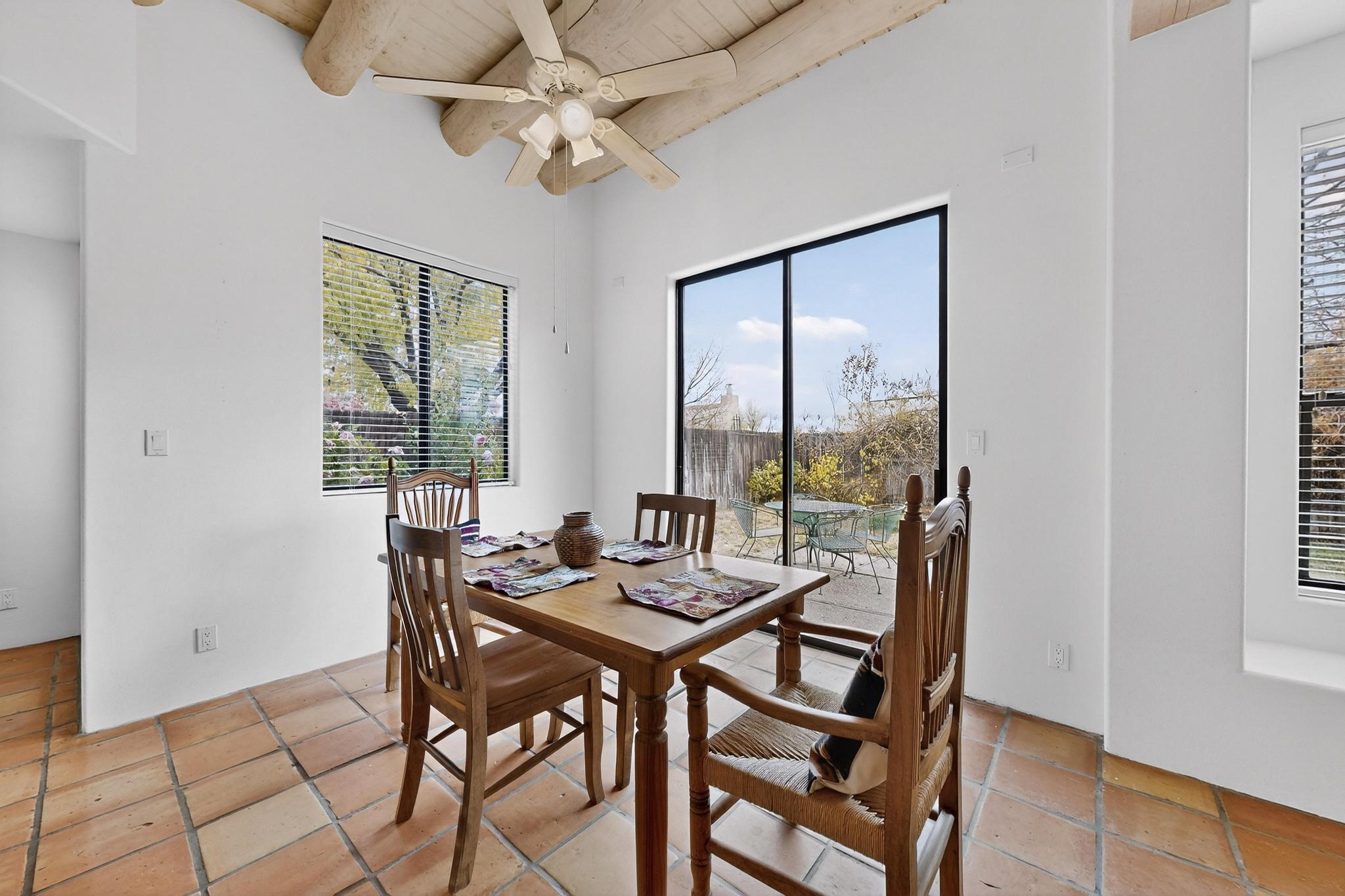 Discover this beautiful single-level home filled with natural light and nestled in the serene Plaza Del Castillo neighborhood. Enter through a walled private courtyard into a space rich with Santa Fe character, featuring high tongue-and-groove ceilings with vigas, a cozy wood-burning fireplace, and a blend of Saltillo tile and wood flooring.Skylights brighten the home, which also offers two full bathrooms, two dining areas, and a spacious primary suite with its own seating area--ideal for a reading nook or quiet retreat.Warm, inviting, and full of Southwestern charm, this home is ready to be enjoyed!
