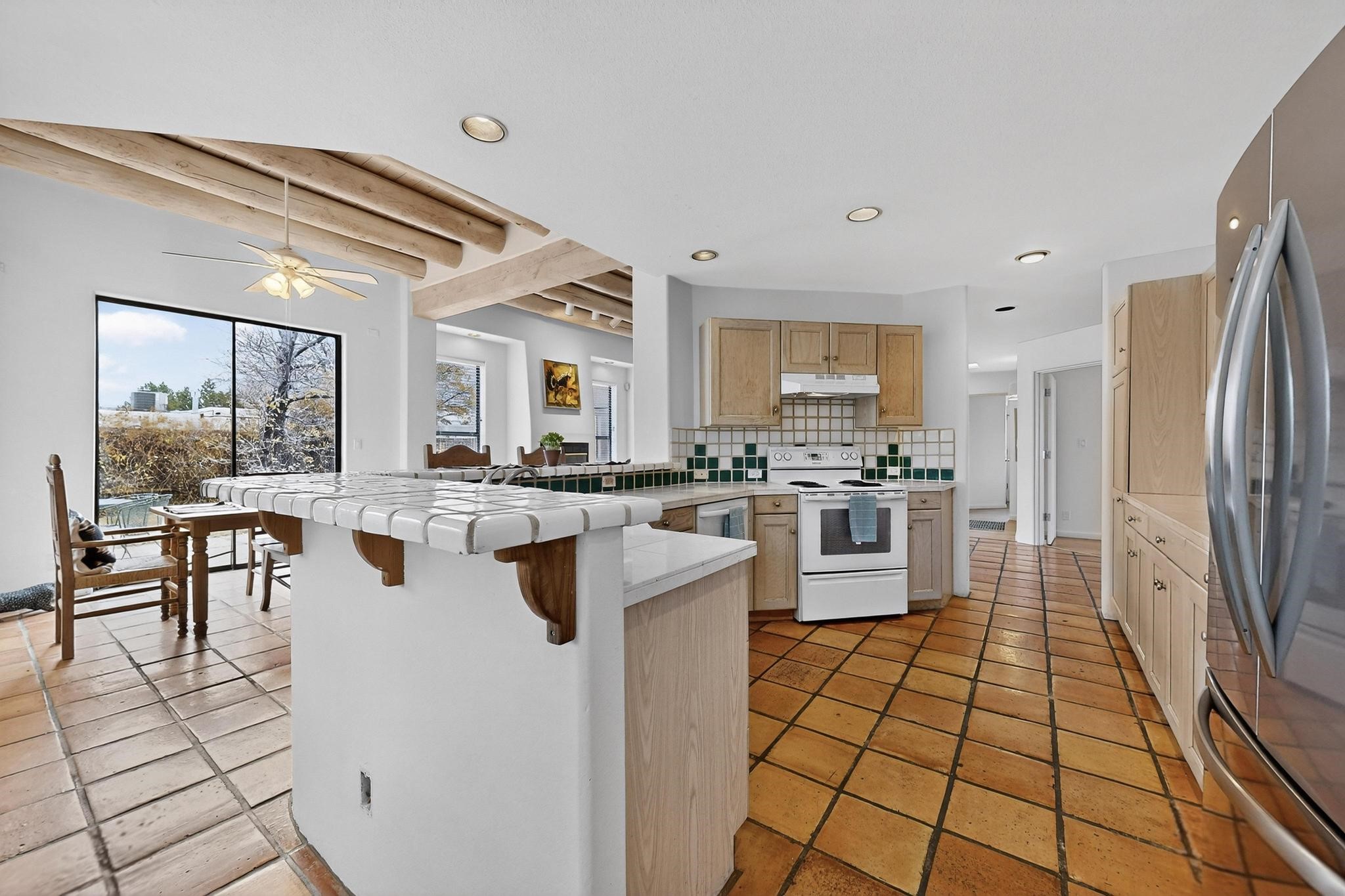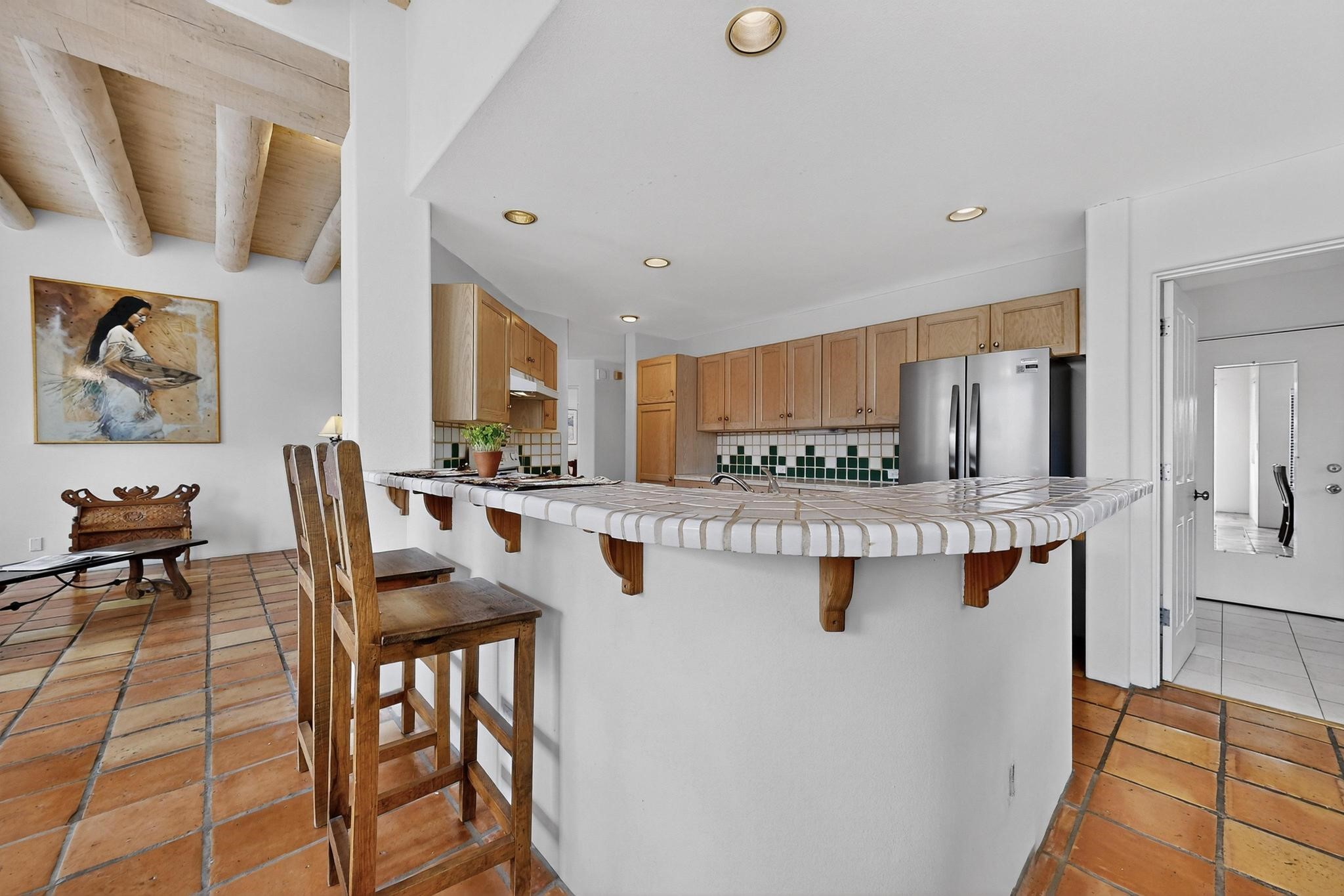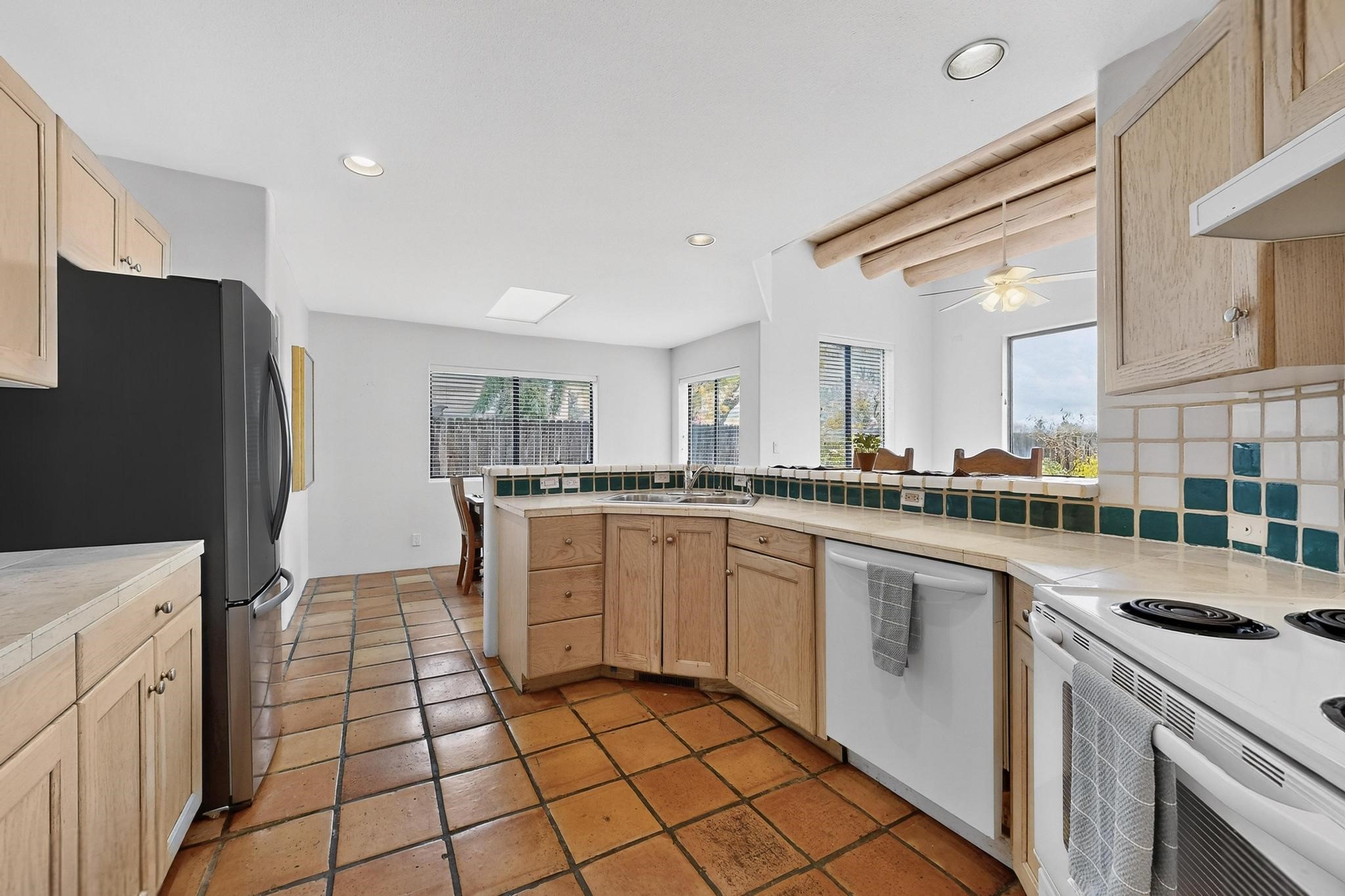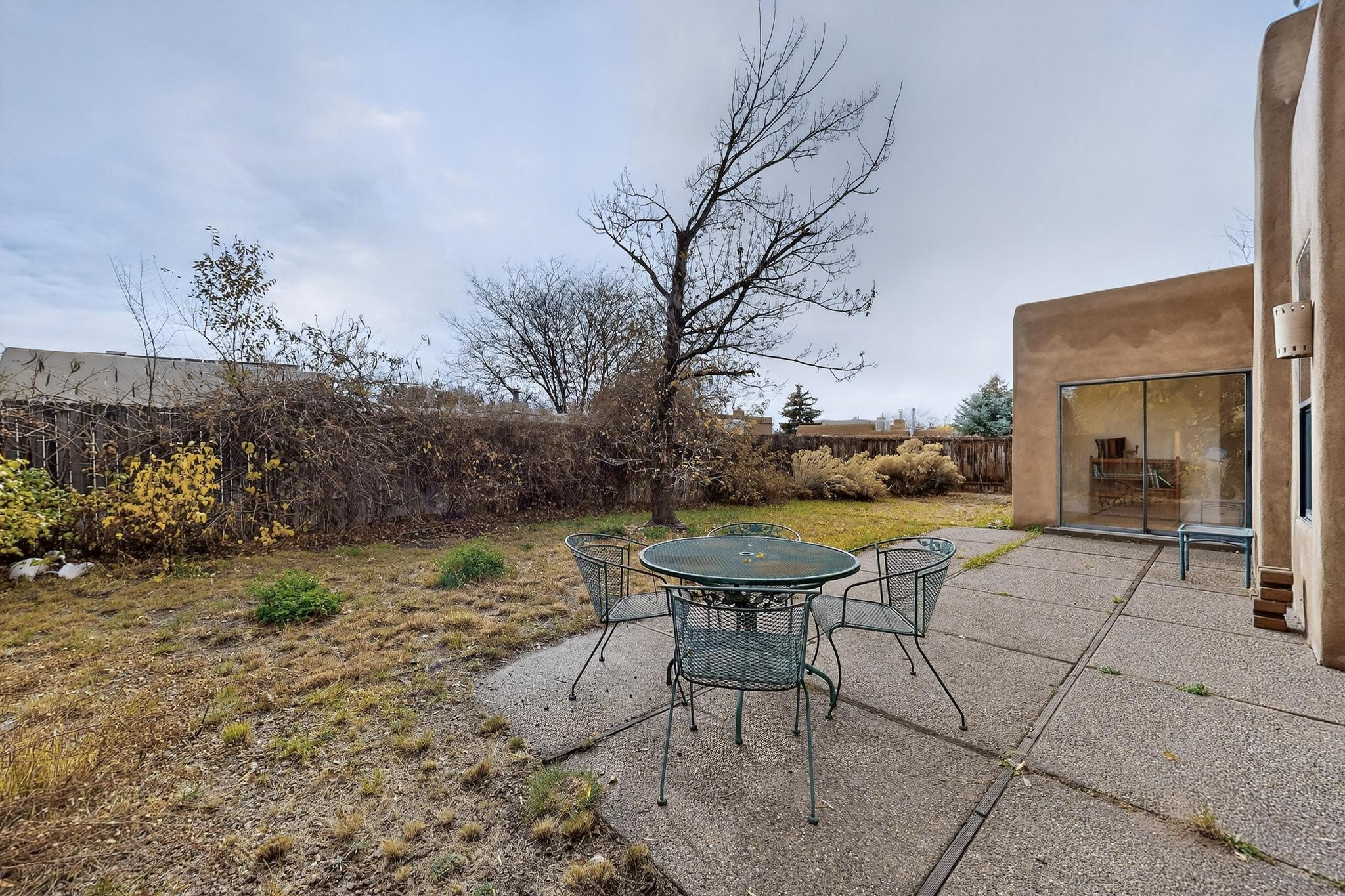 Discover this beautiful single-level home filled with natural light and nestled in the serene Plaza Del Castillo neighborhood. Enter through a walled private courtyard into a space rich with Santa Fe character, featuring high tongue-and-groove ceilings with vigas, a cozy wood-burning fireplace, and a blend of Saltillo tile and wood flooring.Skylights brighten the home, which also offers two full bathrooms, two dining areas, and a spacious primary suite with its own seating area--ideal for a reading nook or quiet retreat.Warm, inviting, and full of Southwestern charm, this home is ready to be enjoyed!