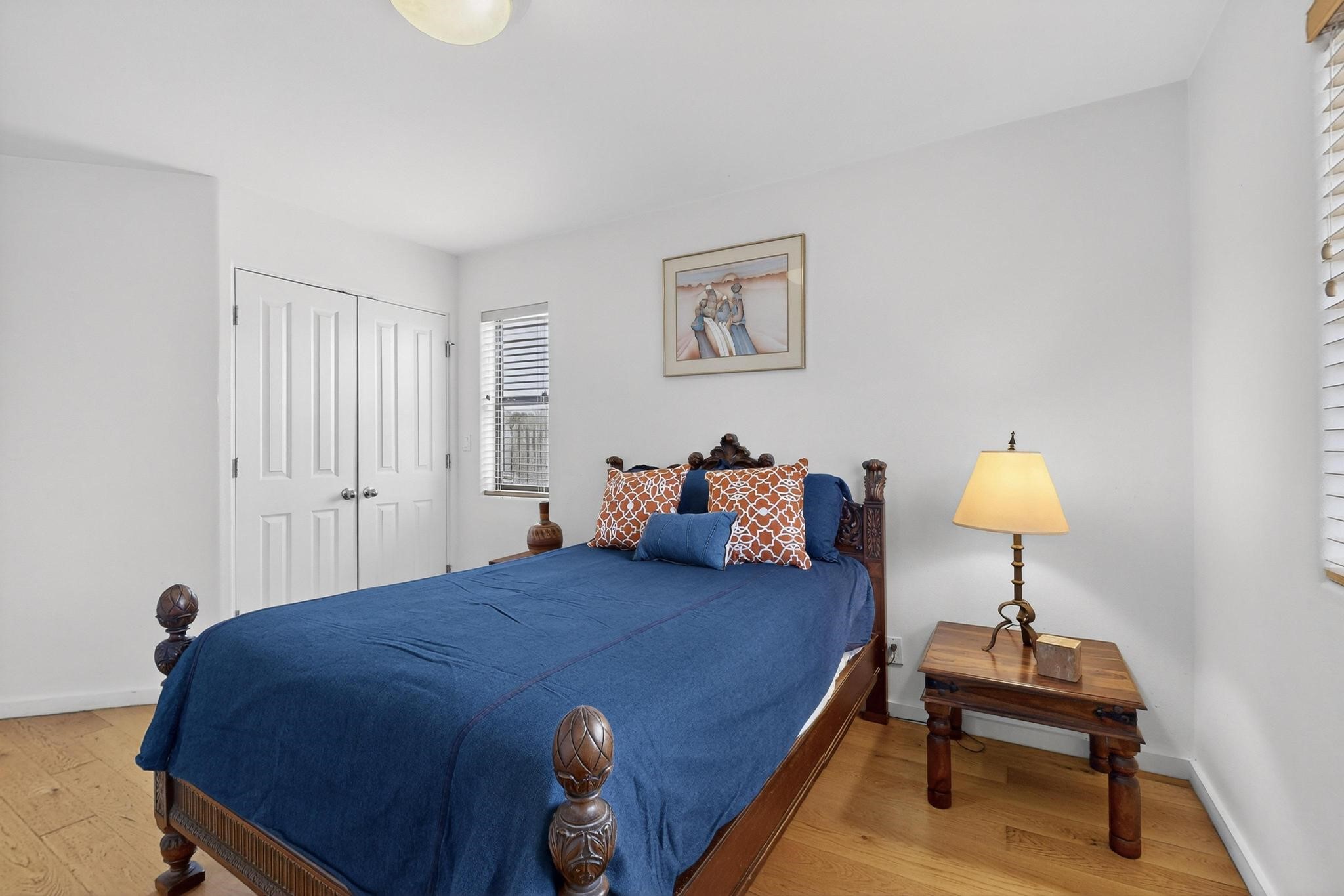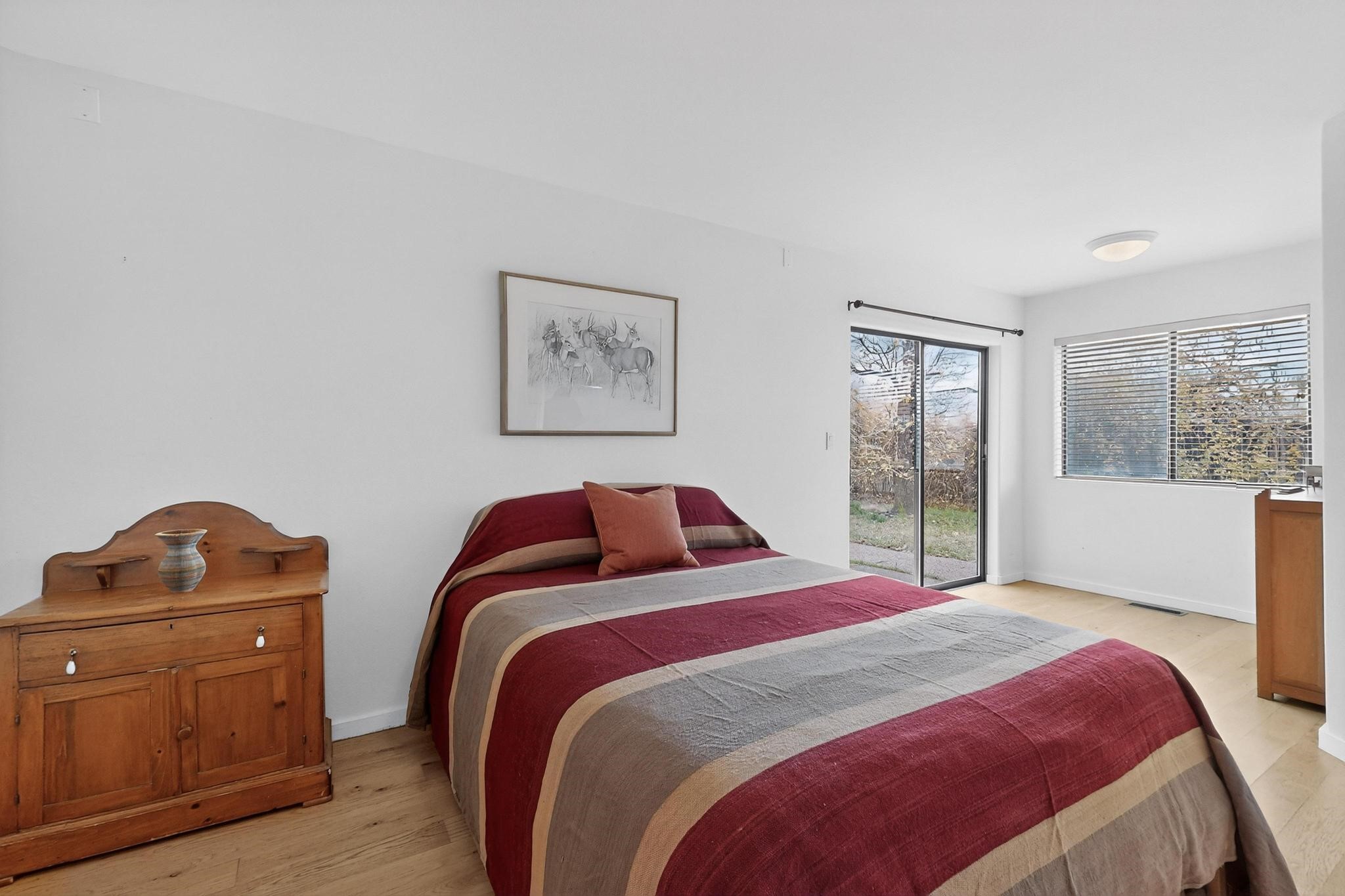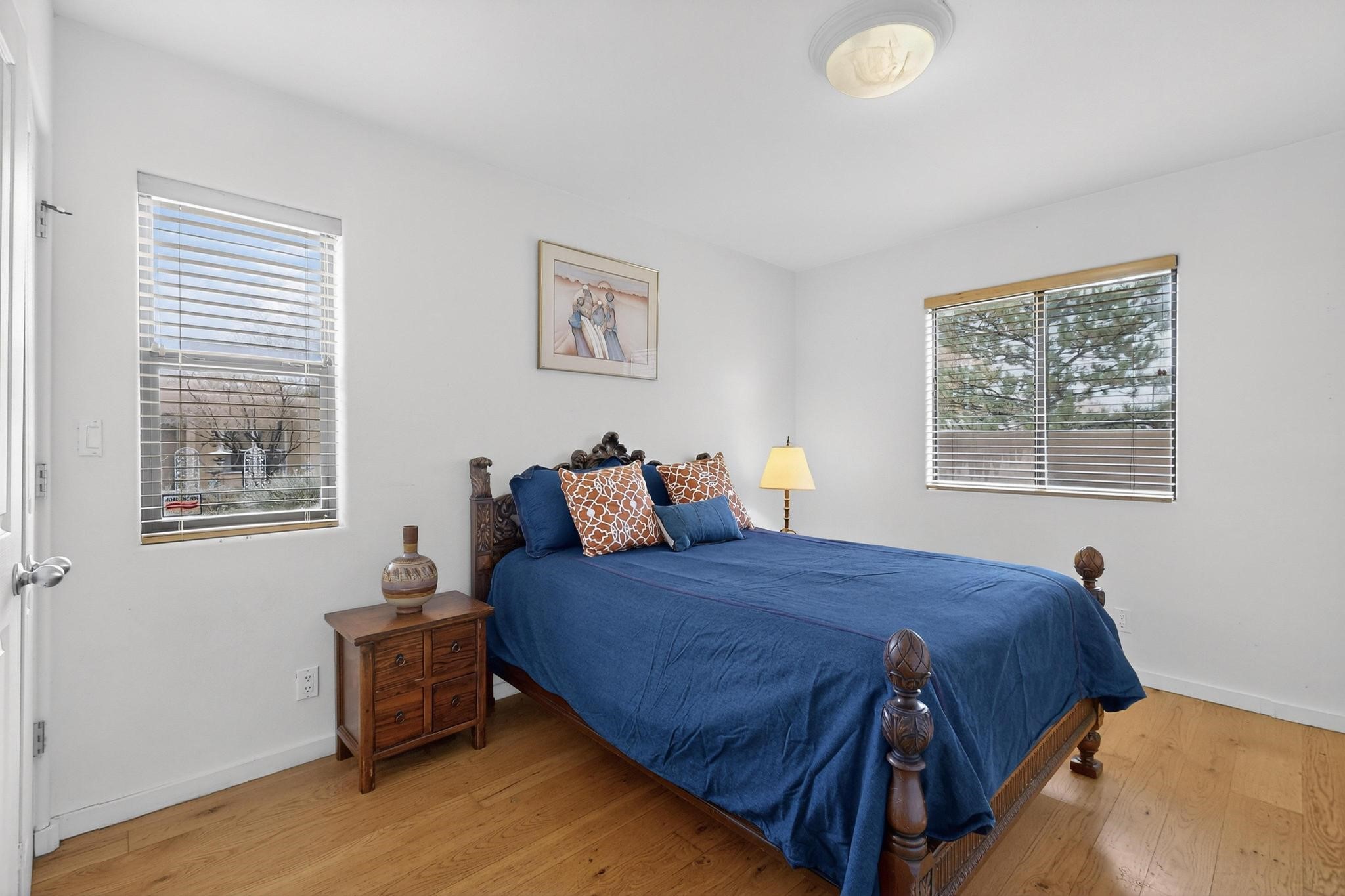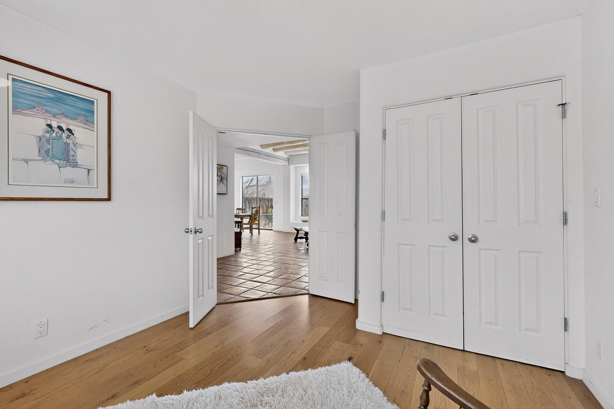 Discover this beautiful single-level home filled with natural light and nestled in the serene Plaza Del Castillo neighborhood. Enter through a walled private courtyard into a space rich with Santa Fe character, featuring high tongue-and-groove ceilings with vigas, a cozy wood-burning fireplace, and a blend of Saltillo tile and wood flooring.Skylights brighten the home, which also offers two full bathrooms, two dining areas, and a spacious primary suite with its own seating area--ideal for a reading nook or quiet retreat.Warm, inviting, and full of Southwestern charm, this home is ready to be enjoyed!