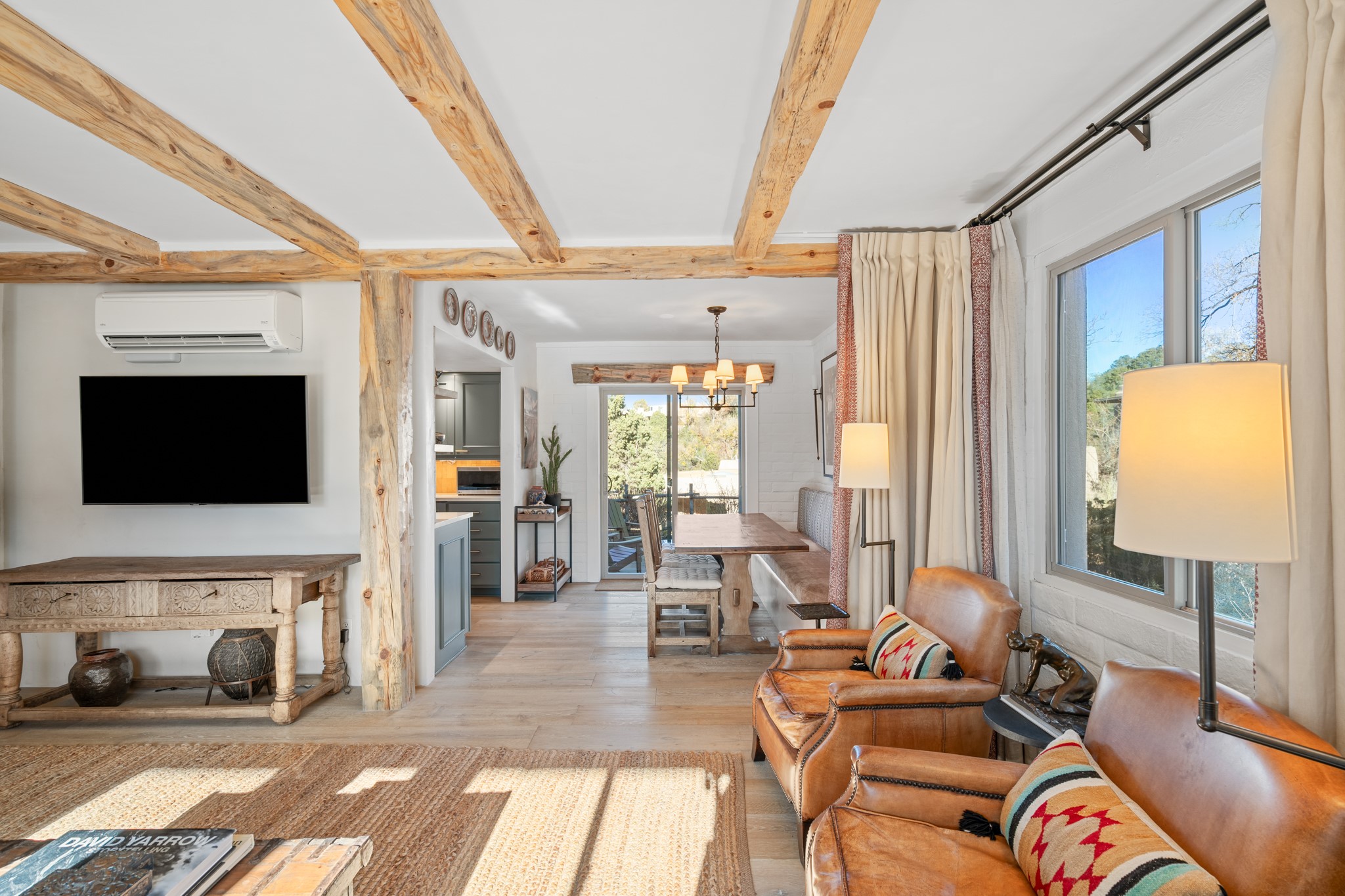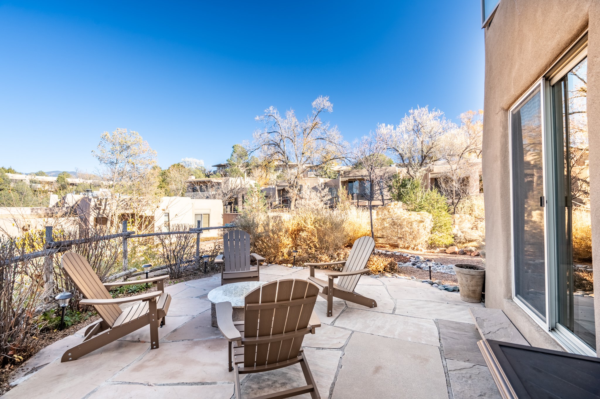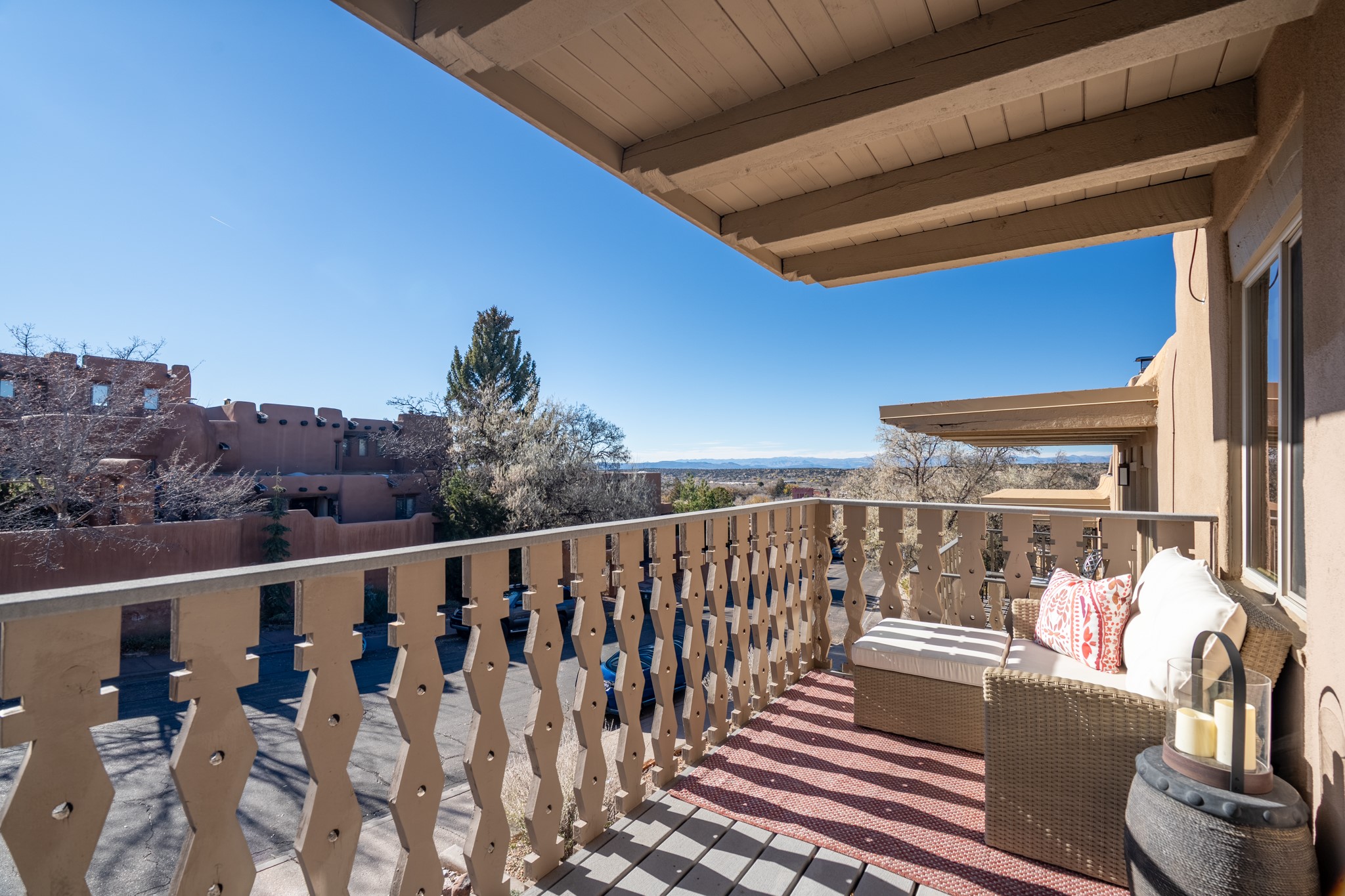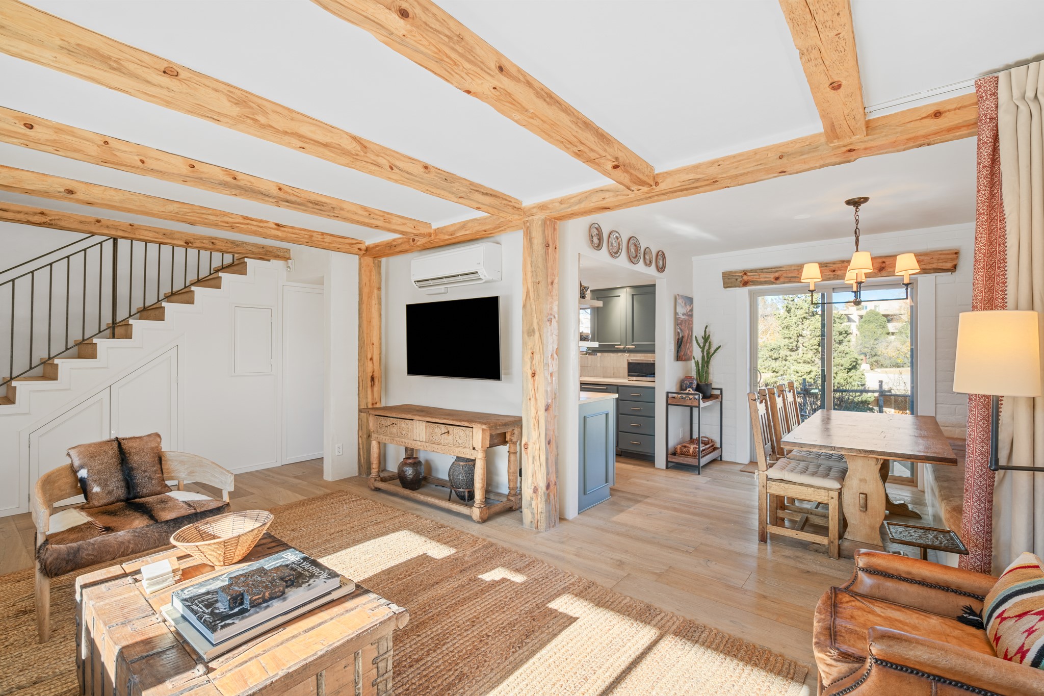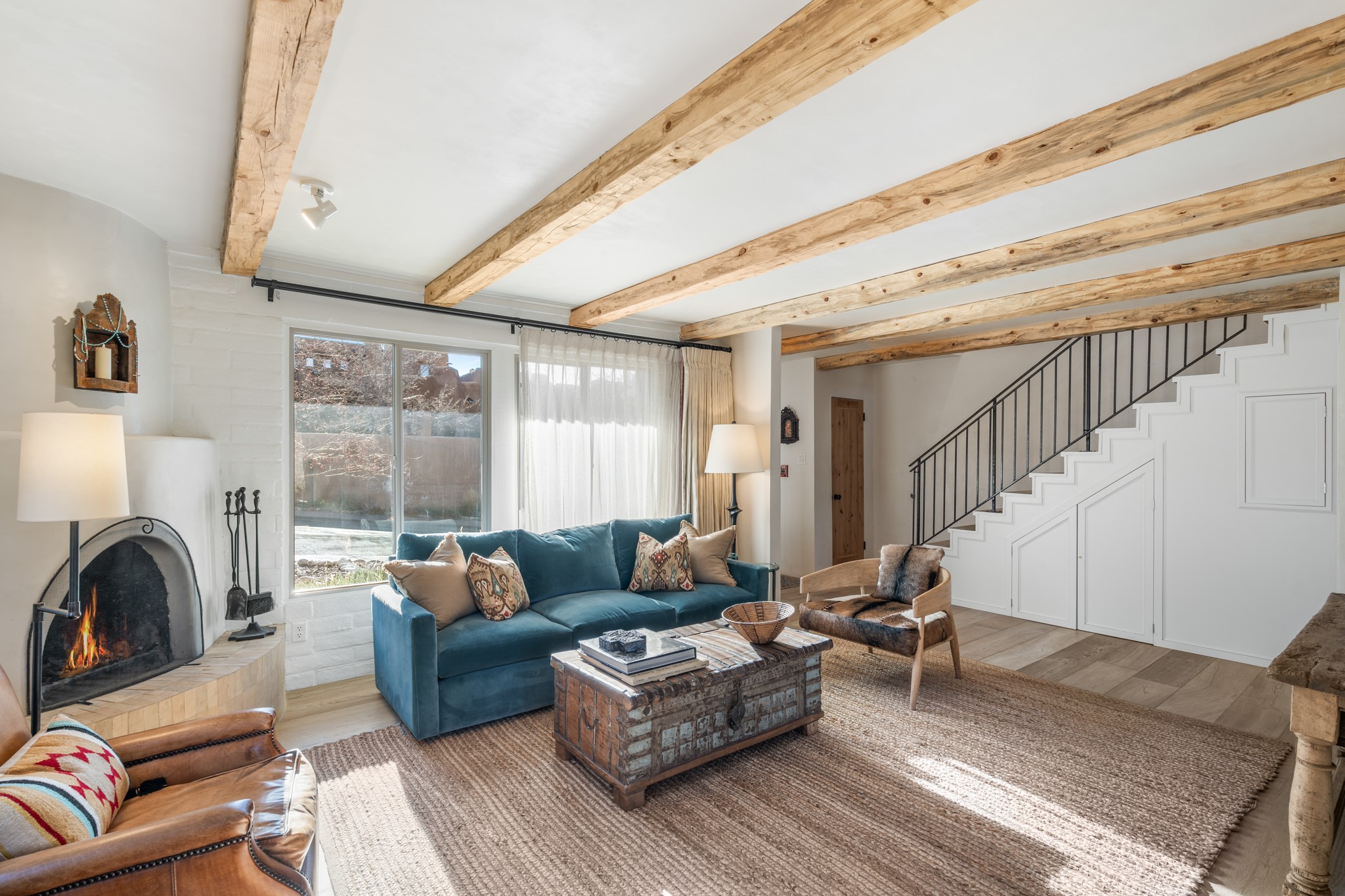 Exceptional Location & Impeccable Renovation in the Heart of Santa FeDiscover a beautifully transformed end-unit residence just moments from the Santa Fe Plaza, Canyon Road, Fort Marcy Park, and miles of scenic walking trails. This light-filled, open-concept home offers effortless living, plentiful parking, and two private outdoor spaces with sweeping mountain views, including breathtaking Jemez sunset views from the upstairs balcony.Every detail has been thoughtfully curated in this complete professional renovation. The home features engineered wood flooring, hand-troweled plaster walls throughout, custom solid wood doors, and new wood beams added to both levels for authentic Santa Fe warmth. The kitchen and half bath showcase new quartz countertops, custom cabinetry, paneled appliances, and modern fixtures. The kiva fireplace has been elegantly re-tiled, and new solar tubes illuminate the bathrooms and stairway.Additional upgrades include a tankless water heater, mini-splits, new light fixtures, and travertine tile in the bathroom. A professionally landscaped yard with irrigation enhances both beauty and ease of maintenance. The property also features a new roof with a 25-year warranty, offering peace of mind for years to come.With abundant windows, mountain views, and two inviting outdoor living spaces, this home offers an exceptional blend of comfort and convenience. Ideally located near downtown and Fort Marcy Park, which includes a gym with classes, pickleball courts, a pool, playground, and dog park, provides endless lifestyle opportunities. Luxury vacation rentals are permitted, offering outstanding flexibility for both owners and investors.