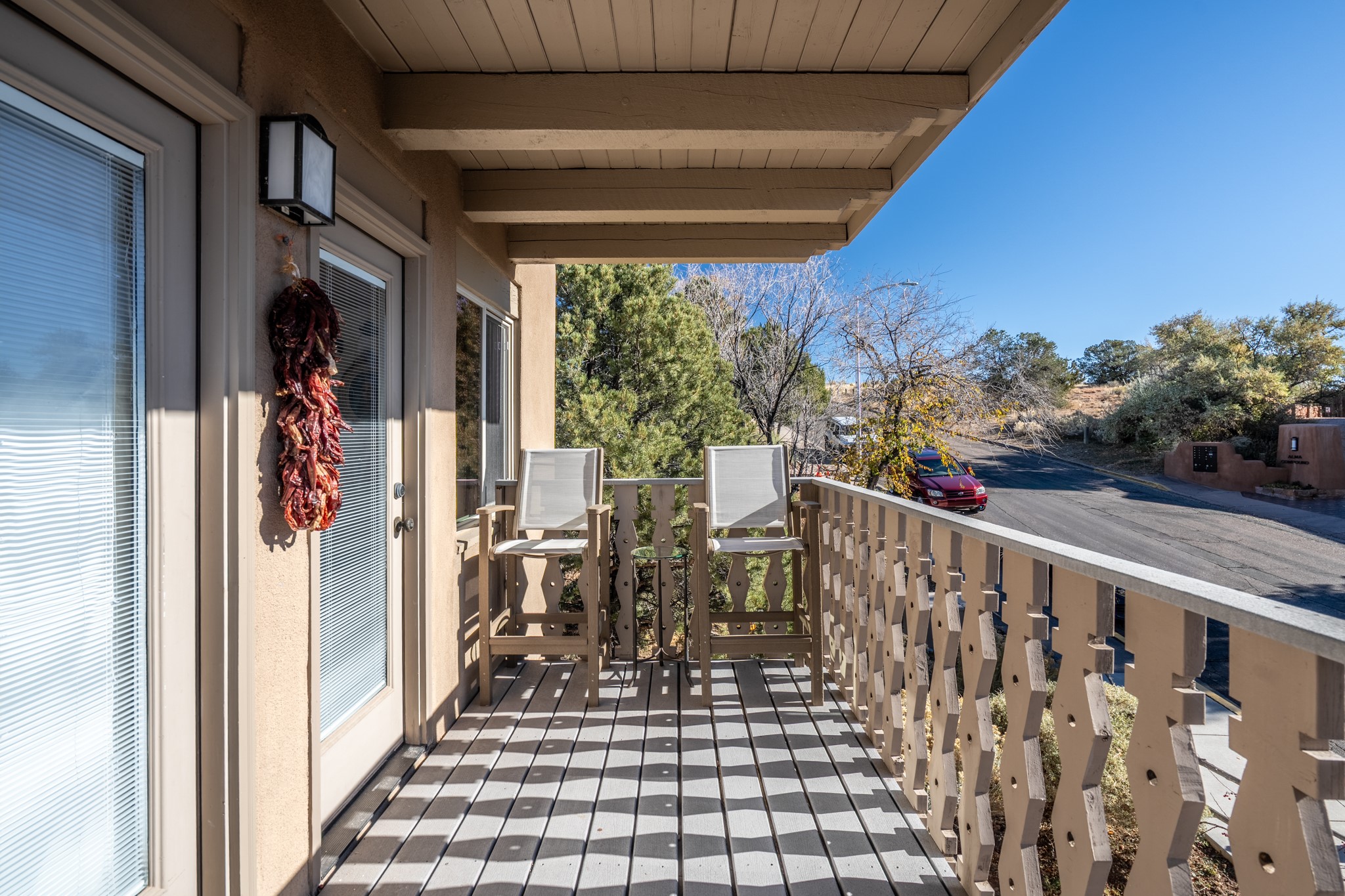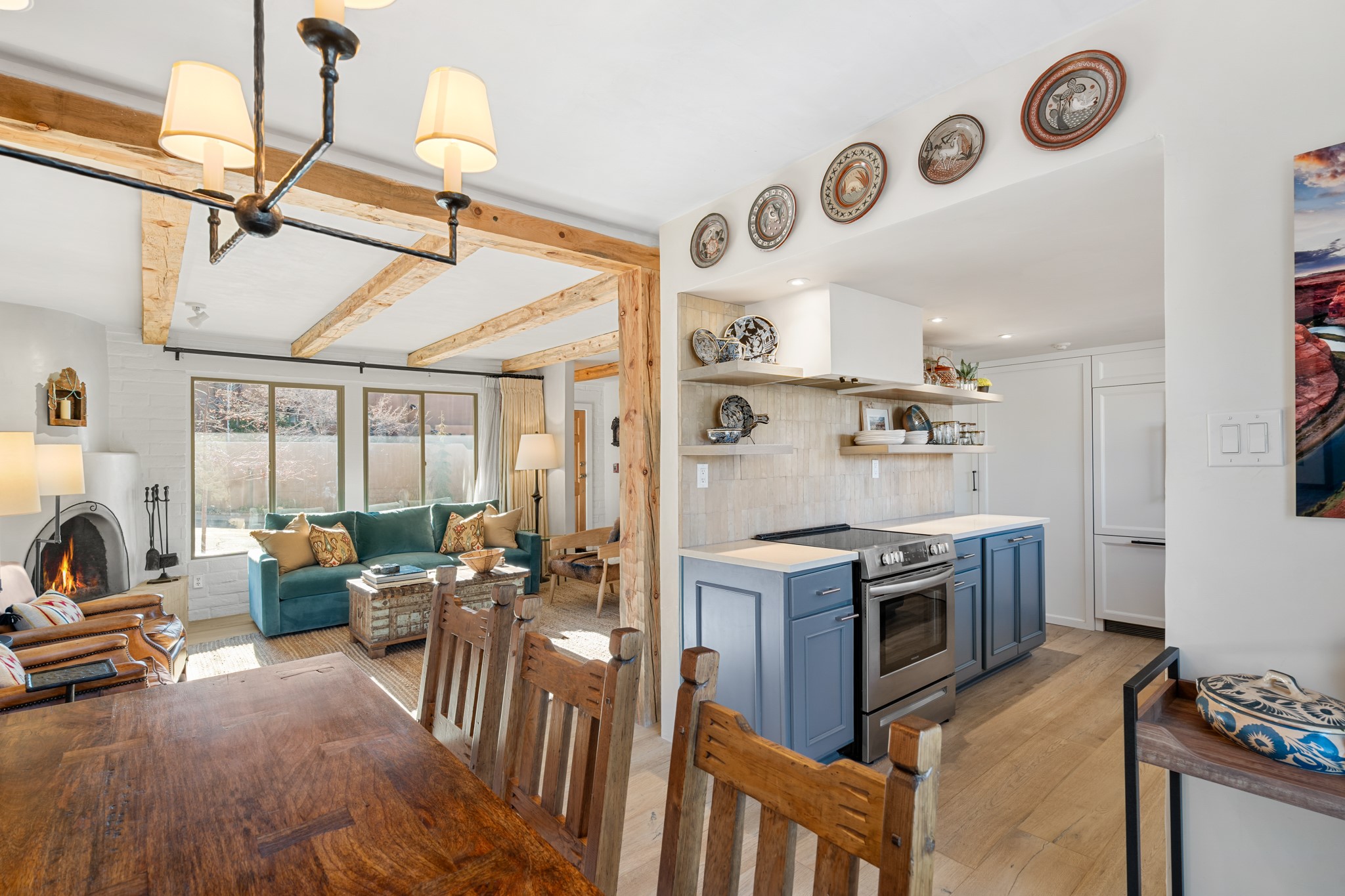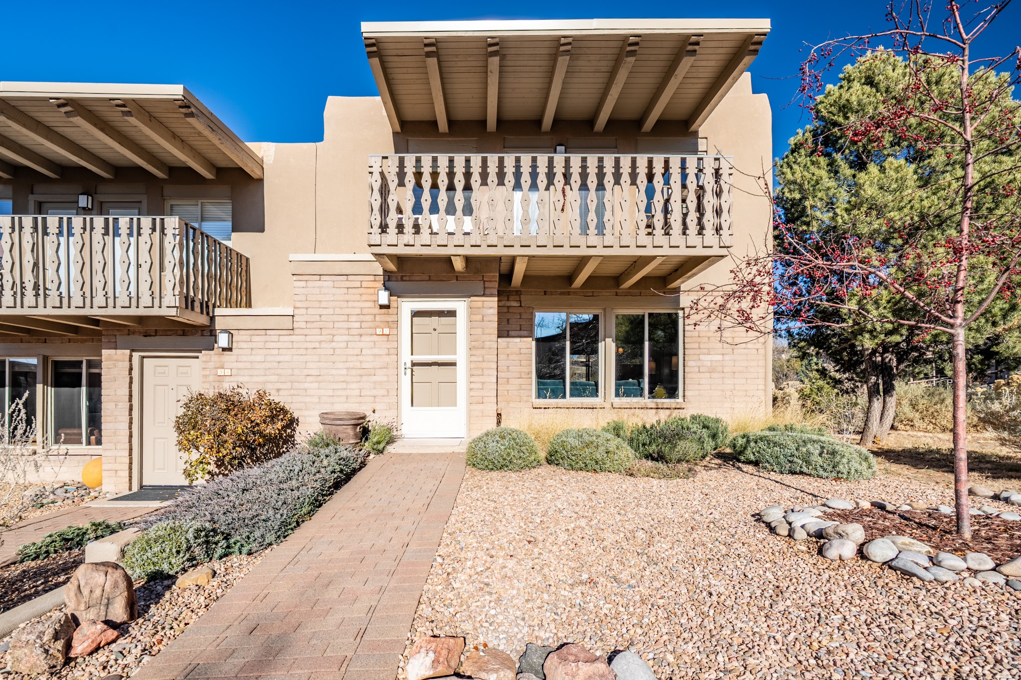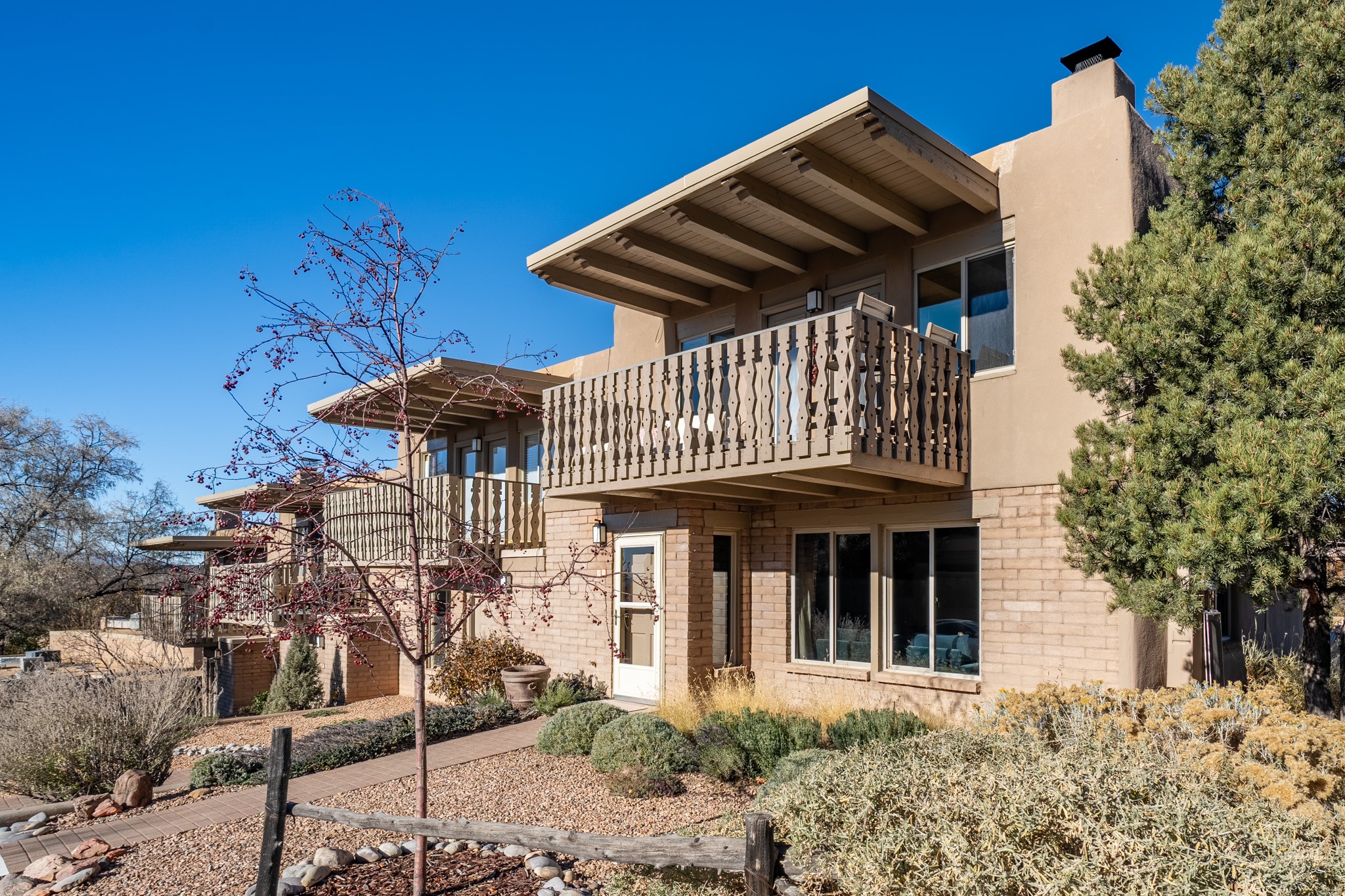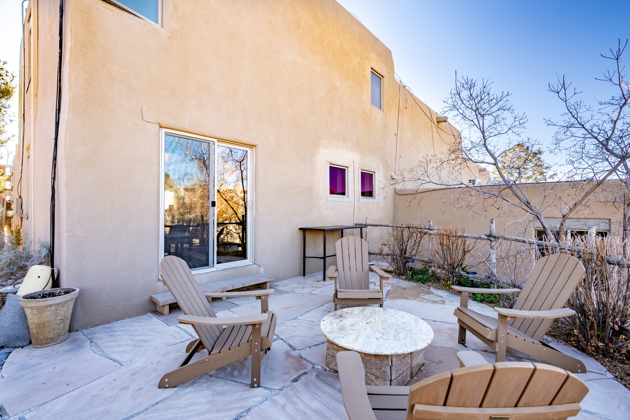 Exceptional Location & Impeccable Renovation in the Heart of Santa FeDiscover a beautifully transformed end-unit residence just moments from the Santa Fe Plaza, Canyon Road, Fort Marcy Park, and miles of scenic walking trails. This light-filled, open-concept home offers effortless living, plentiful parking, and two private outdoor spaces with sweeping mountain views, including breathtaking Jemez sunset views from the upstairs balcony.Every detail has been thoughtfully curated in this complete professional renovation. The home features engineered wood flooring, hand-troweled plaster walls throughout, custom solid wood doors, and new wood beams added to both levels for authentic Santa Fe warmth. The kitchen and half bath showcase new quartz countertops, custom cabinetry, paneled appliances, and modern fixtures. The kiva fireplace has been elegantly re-tiled, and new solar tubes illuminate the bathrooms and stairway.Additional upgrades include a tankless water heater, mini-splits, new light fixtures, and travertine tile in the bathroom. A professionally landscaped yard with irrigation enhances both beauty and ease of maintenance. The property also features a new roof with a 25-year warranty, offering peace of mind for years to come.With abundant windows, mountain views, and two inviting outdoor living spaces, this home offers an exceptional blend of comfort and convenience. Ideally located near downtown and Fort Marcy Park, which includes a gym with classes, pickleball courts, a pool, playground, and dog park, provides endless lifestyle opportunities. Luxury vacation rentals are permitted, offering outstanding flexibility for both owners and investors.