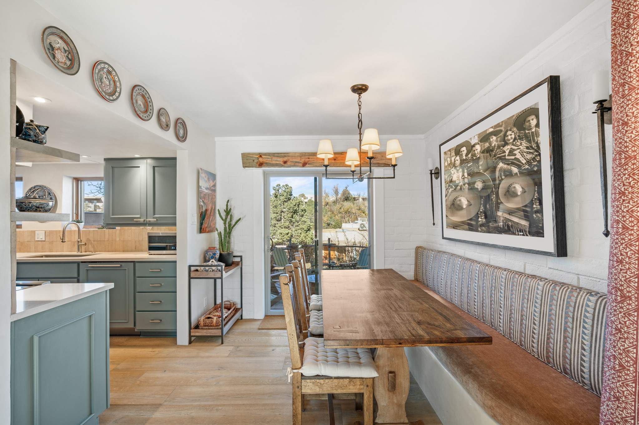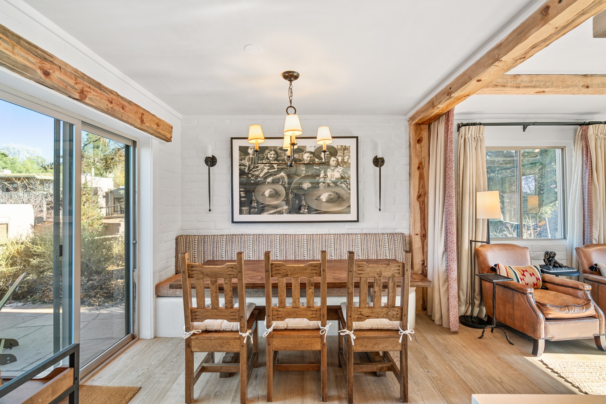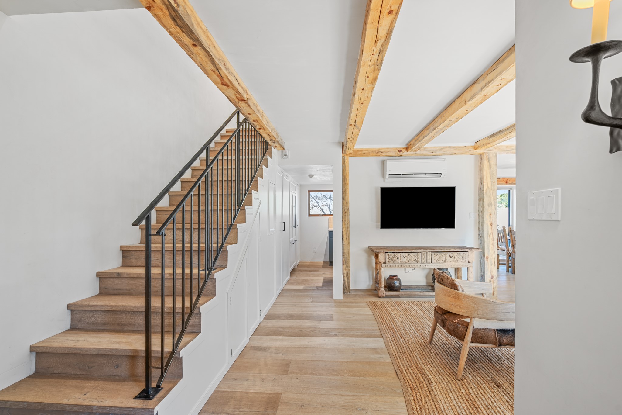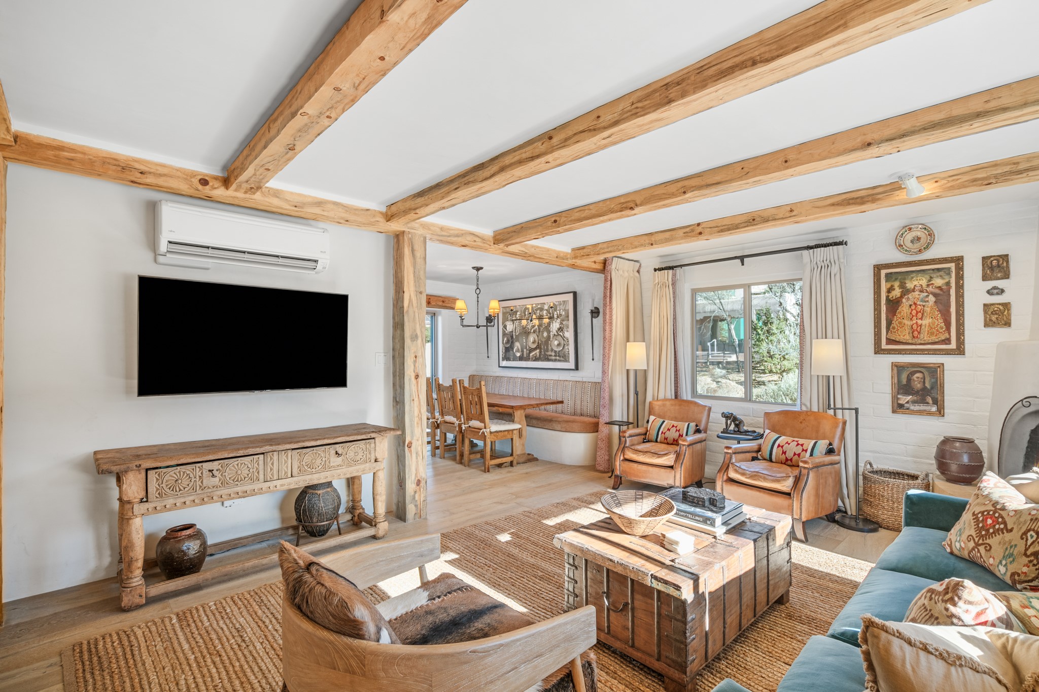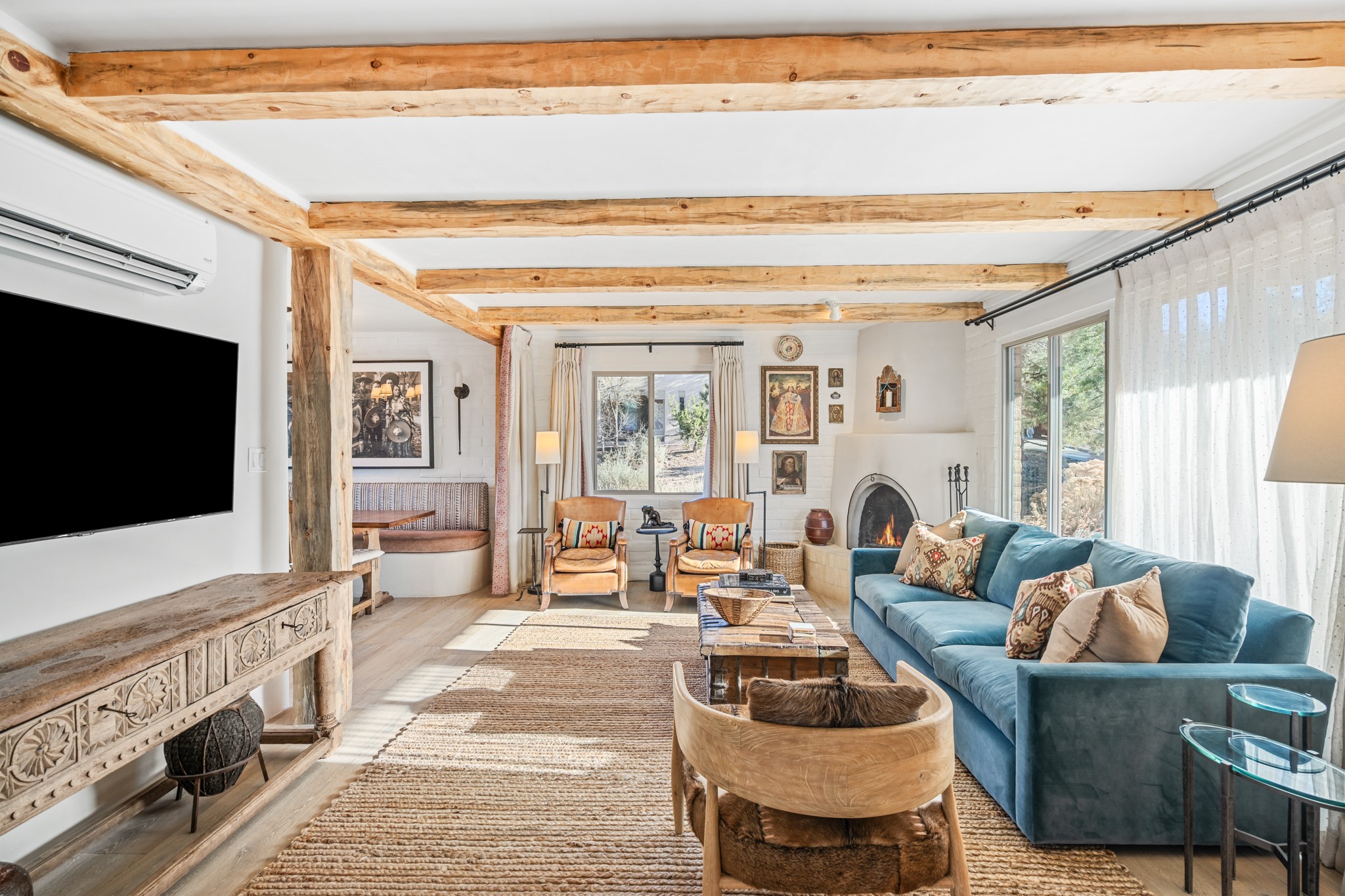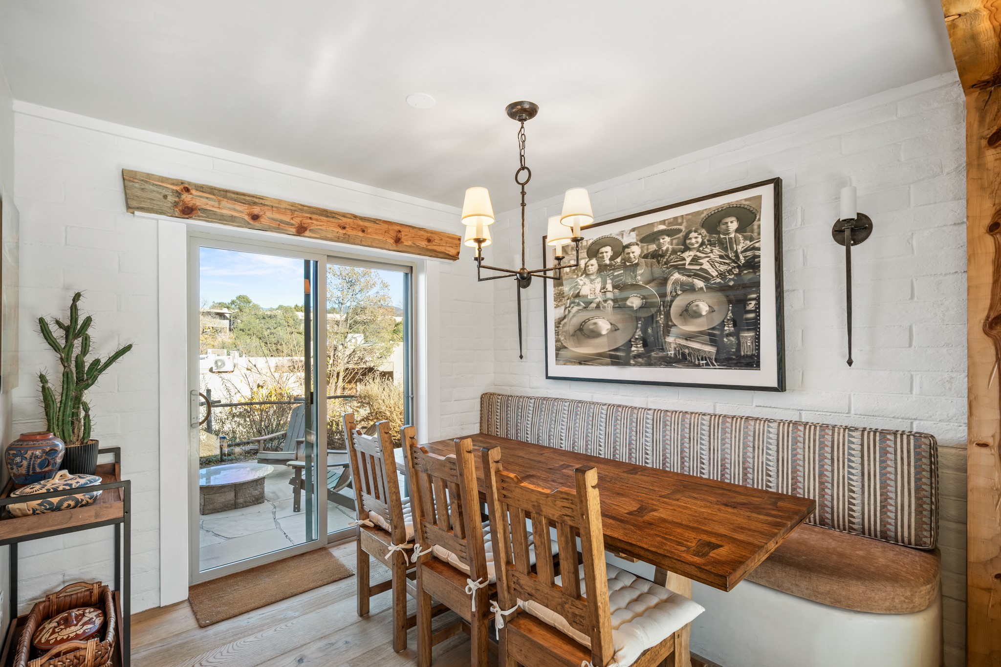 Exceptional Location & Impeccable Renovation in the Heart of Santa FeDiscover a beautifully transformed end-unit residence just moments from the Santa Fe Plaza, Canyon Road, Fort Marcy Park, and miles of scenic walking trails. This light-filled, open-concept home offers effortless living, plentiful parking, and two private outdoor spaces with sweeping mountain views, including breathtaking Jemez sunset views from the upstairs balcony.Every detail has been thoughtfully curated in this complete professional renovation. The home features engineered wood flooring, hand-troweled plaster walls throughout, custom solid wood doors, and new wood beams added to both levels for authentic Santa Fe warmth. The kitchen and half bath showcase new quartz countertops, custom cabinetry, paneled appliances, and modern fixtures. The kiva fireplace has been elegantly re-tiled, and new solar tubes illuminate the bathrooms and stairway.Additional upgrades include a tankless water heater, mini-splits, new light fixtures, and travertine tile in the bathroom. A professionally landscaped yard with irrigation enhances both beauty and ease of maintenance. The property also features a new roof with a 25-year warranty, offering peace of mind for years to come.With abundant windows, mountain views, and two inviting outdoor living spaces, this home offers an exceptional blend of comfort and convenience. Ideally located near downtown and Fort Marcy Park, which includes a gym with classes, pickleball courts, a pool, playground, and dog park, provides endless lifestyle opportunities. Luxury vacation rentals are permitted, offering outstanding flexibility for both owners and investors.