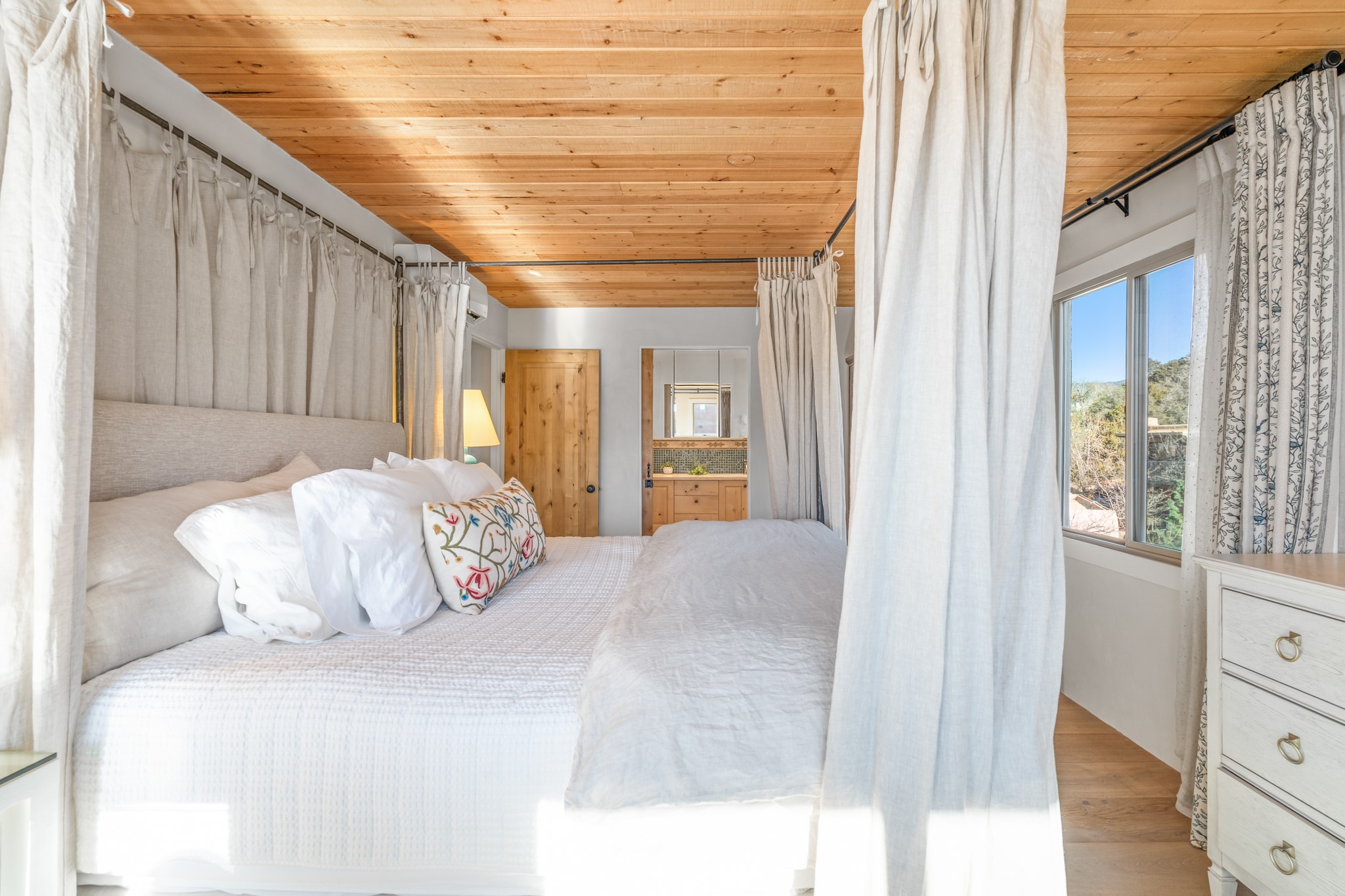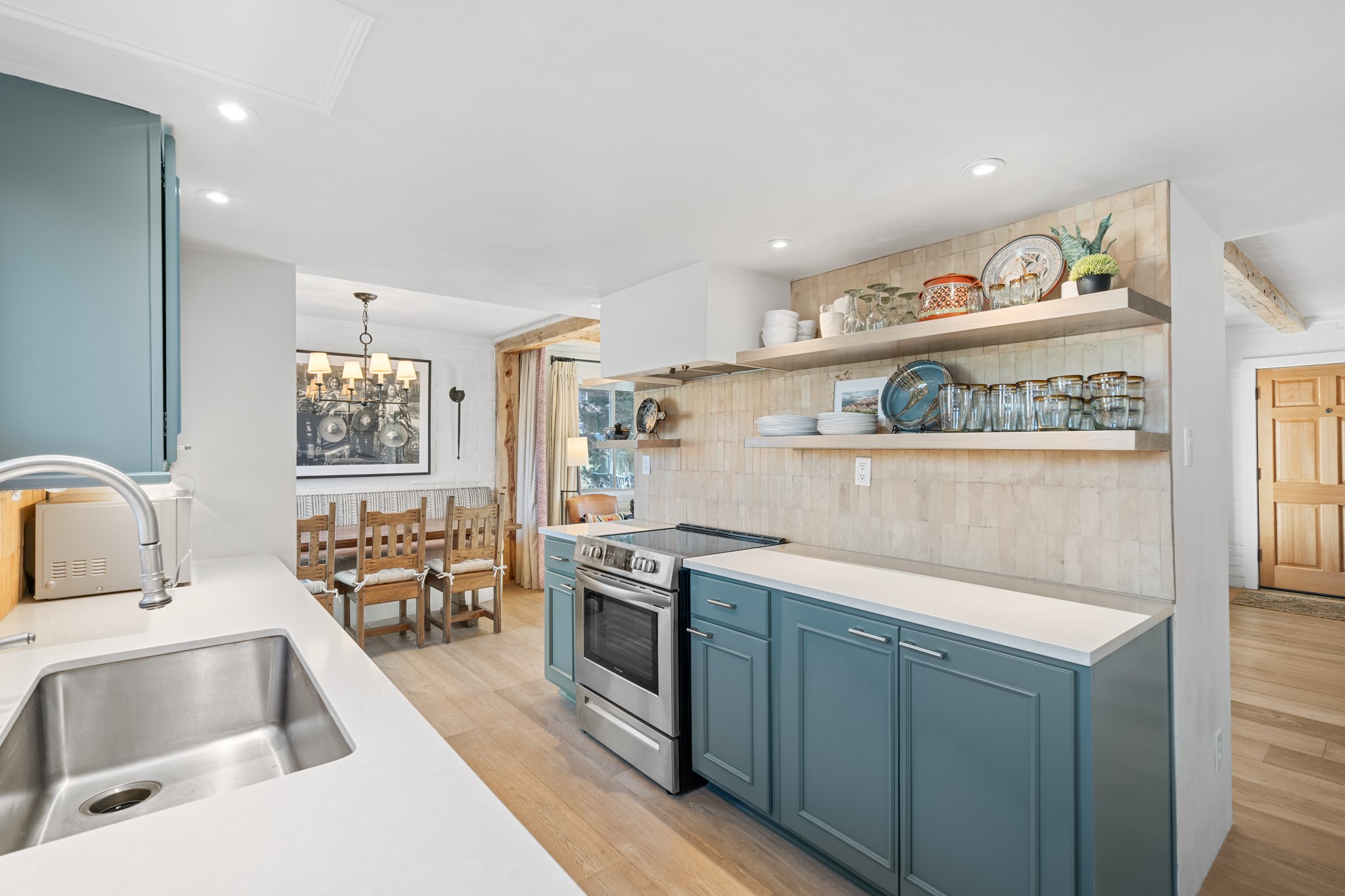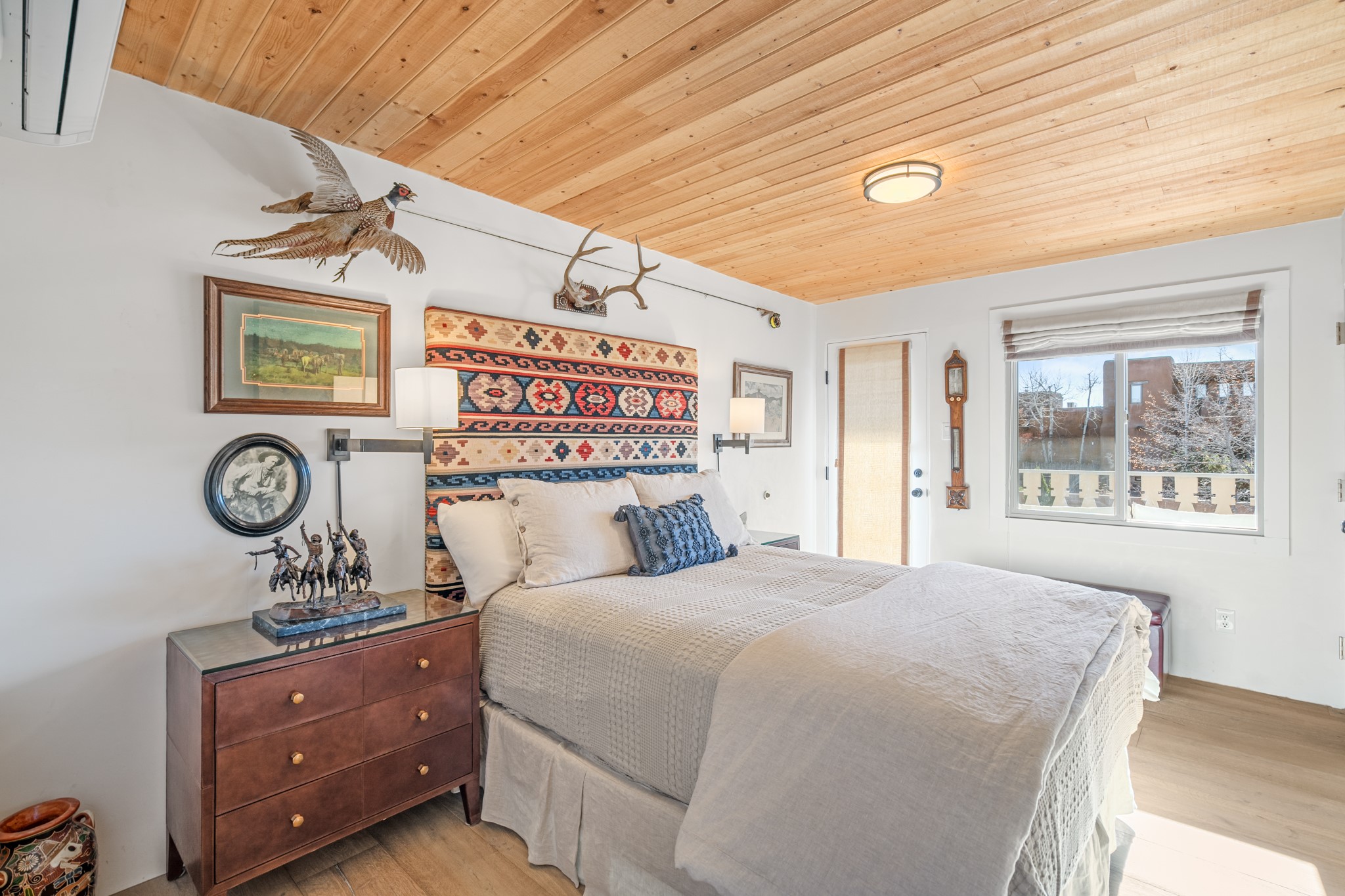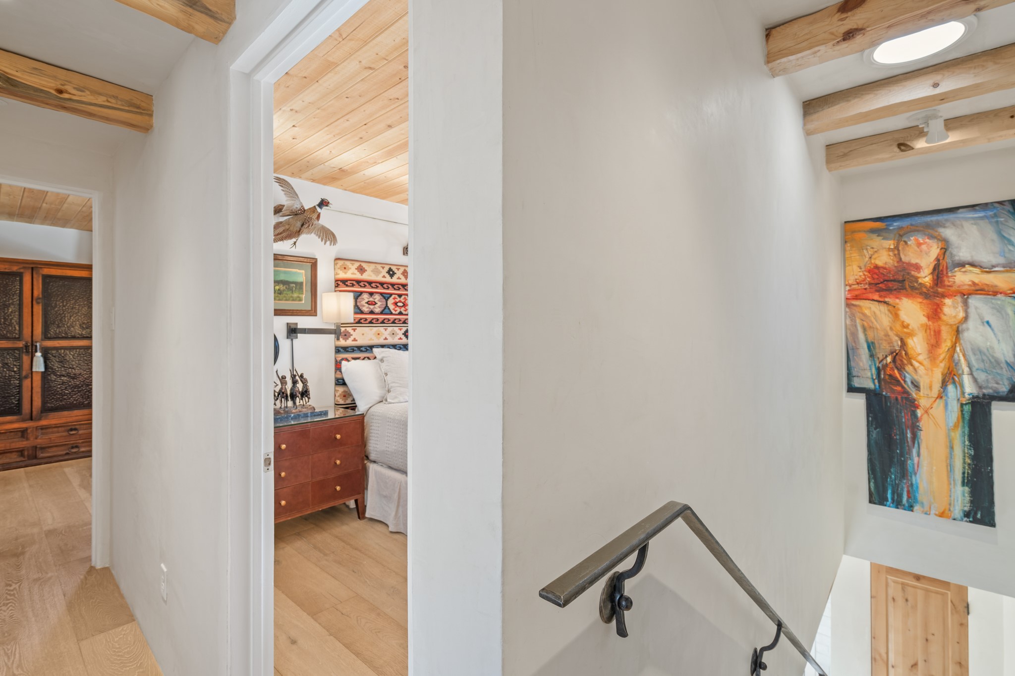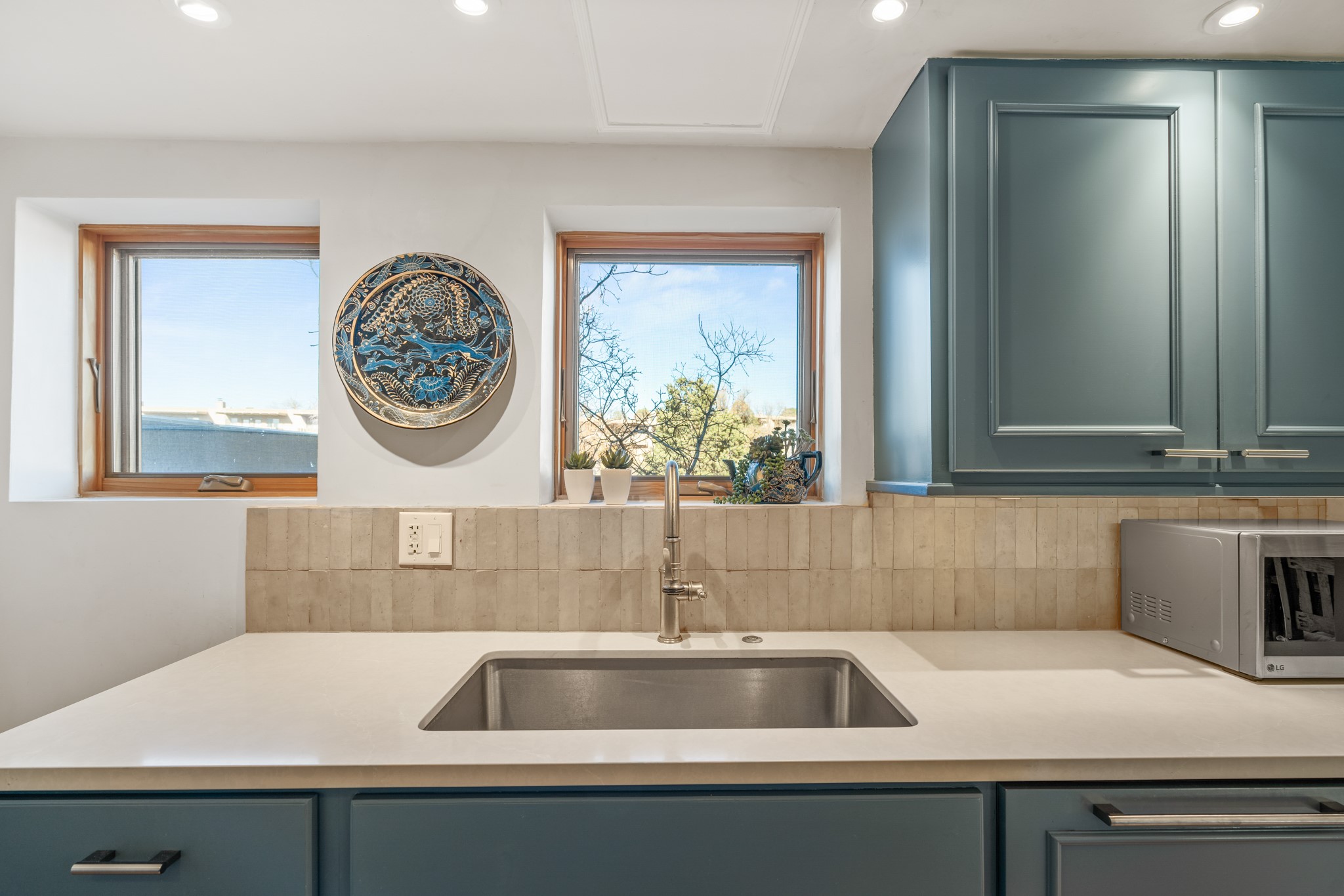 Exceptional Location & Impeccable Renovation in the Heart of Santa FeDiscover a beautifully transformed end-unit residence just moments from the Santa Fe Plaza, Canyon Road, Fort Marcy Park, and miles of scenic walking trails. This light-filled, open-concept home offers effortless living, plentiful parking, and two private outdoor spaces with sweeping mountain views, including breathtaking Jemez sunset views from the upstairs balcony.Every detail has been thoughtfully curated in this complete professional renovation. The home features engineered wood flooring, hand-troweled plaster walls throughout, custom solid wood doors, and new wood beams added to both levels for authentic Santa Fe warmth. The kitchen and half bath showcase new quartz countertops, custom cabinetry, paneled appliances, and modern fixtures. The kiva fireplace has been elegantly re-tiled, and new solar tubes illuminate the bathrooms and stairway.Additional upgrades include a tankless water heater, mini-splits, new light fixtures, and travertine tile in the bathroom. A professionally landscaped yard with irrigation enhances both beauty and ease of maintenance. The property also features a new roof with a 25-year warranty, offering peace of mind for years to come.With abundant windows, mountain views, and two inviting outdoor living spaces, this home offers an exceptional blend of comfort and convenience. Ideally located near downtown and Fort Marcy Park, which includes a gym with classes, pickleball courts, a pool, playground, and dog park, provides endless lifestyle opportunities. Luxury vacation rentals are permitted, offering outstanding flexibility for both owners and investors.