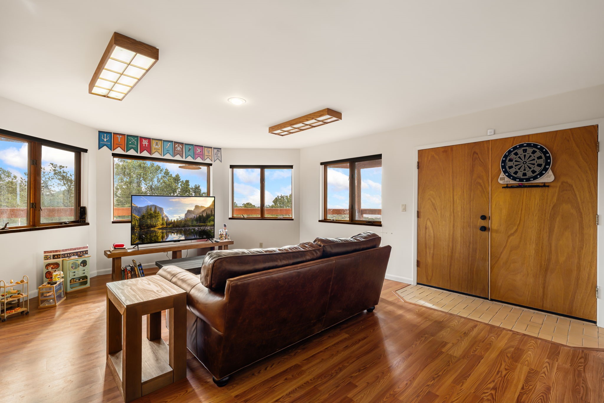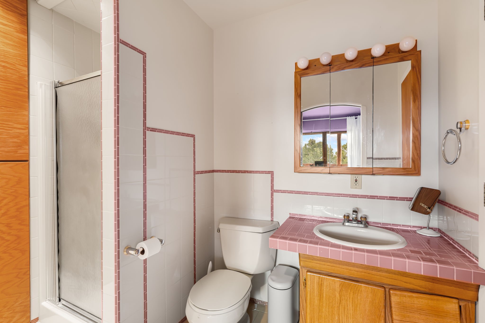 Imagine a stunning retreat atop the world, where the enchanting views of Santa Fe and the renowned New Mexico skies stretch out before you. Elevated at 8,000 feet, this home offers unforgettable western views with sunsets that paint the sky with vibrant colors. Inside, you'll find a blend of artistry and craftsmanship with diamond plaster walls, wooden beams, etched glass and cozy cork ceilings, all framed by a newer roof and stylish stucco that add to its charm. Every corner of this home exudes creativity from the original owners, from the beautifully situated kitchen and living room that bathe in westward light to an inviting pottery/art studio that doubles as a sun room or plant sanctuary. The thoughtful design embraces passive solar elements and solar panels, making it energy efficient. The versatile and separate studio is not just an area to create--it's a dream come true for writers, artists, designers or jewelry makers looking to bring their creativity to life. And with abundant storage throughout, you'll have room for all your inspirations. Located just moments away from the serene Santa Fe National Forest, thrilling slopes at the Santa Fe Ski Basin, and the scenic hiking/biking trails of Dale Ball, this home isn't just a place to live; it's a canvas for your life's next masterpiece.