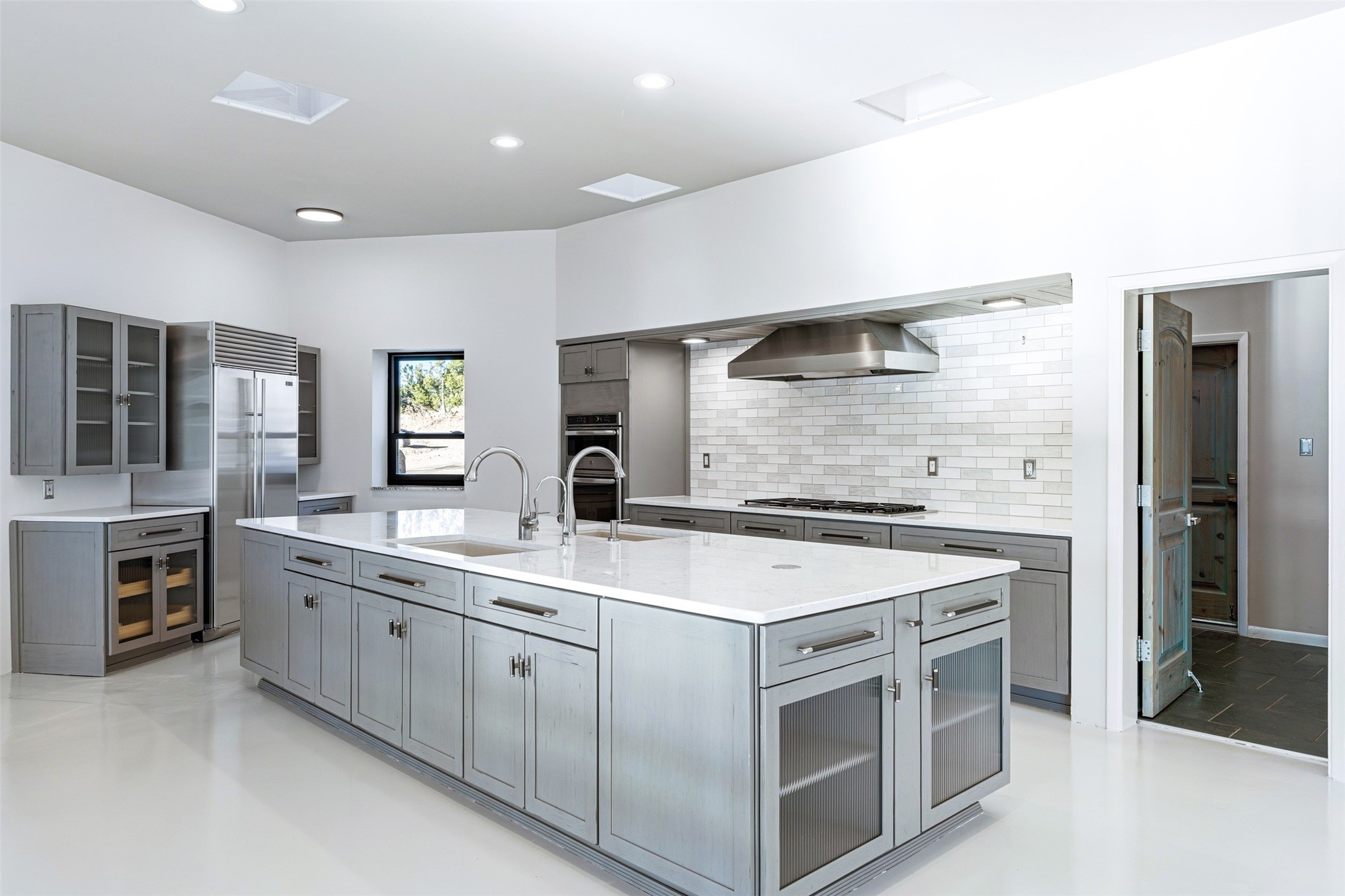 Designed by noted architect John Klee, this 4,300-square-foot 4 bedroom residence embodies the clean lines and luminous spaces of late-century modern design. The home rests gracefully within the contours of Arroyo Hondo Vistas, opening to generous portals and patios that frame sweeping mountain and high-desert views. A landscaped approach sets the tone--mature trees, natural stone, and a low-profile stucco and rock faade emerges as the home comes into sight. Tucked into the terrain, a series of descending steps leads to the front entry. Inside, an expansive great room unfolds beneath high ceilings, where slate floors, a fireplace, and a full wall of custom shelving anchor the space. Huge glass doors and windows dissolve the boundary between indoors and out, creating a luminous, seamless connection to the surrounding landscape. The grand kitchen features generous granite surfaces, a breakfast bar, and excellent flow for both cooking and entertaining. Nearby, the formal dining area offers the first view of one of the home's most distinctive architectural elements: a conservatory crowned by a softly arched, translucent ceiling. The expansive owner's suite includes a sitting area, a walk-in closet, large fireplace, and a well-appointed bath with free-standing tub, double vanity, and walk-in shower. Returning to the main living area, a gently sweeping hallway leads to a wing with two bedrooms, each with walk-in closets, a guest bathroom, and a flexible room that can be used as an office, studio, or exercise room. Nearly every room features large windows and/or patio doors opening to the expansive, view-rich outdoor spaces, creating a lifestyle centered on indoor-outdoor living and quiet retreat. Numerous skylights illuminate the interior throughout. Other features include central air conditioning, forced-air heating, and a gated entry. Some rooms have been digitally staged.