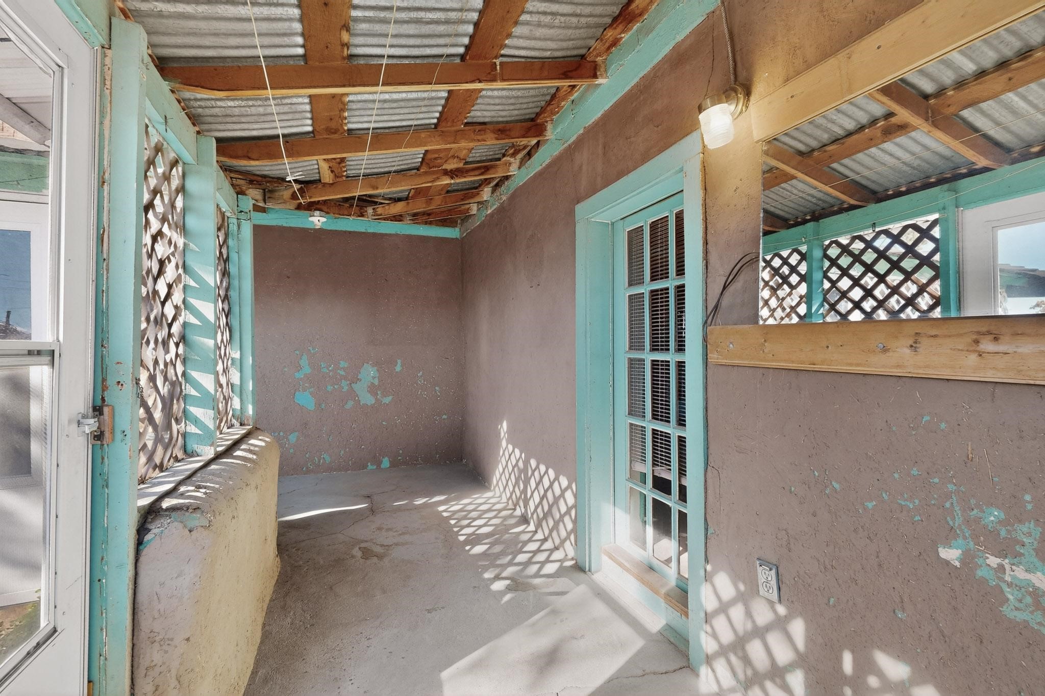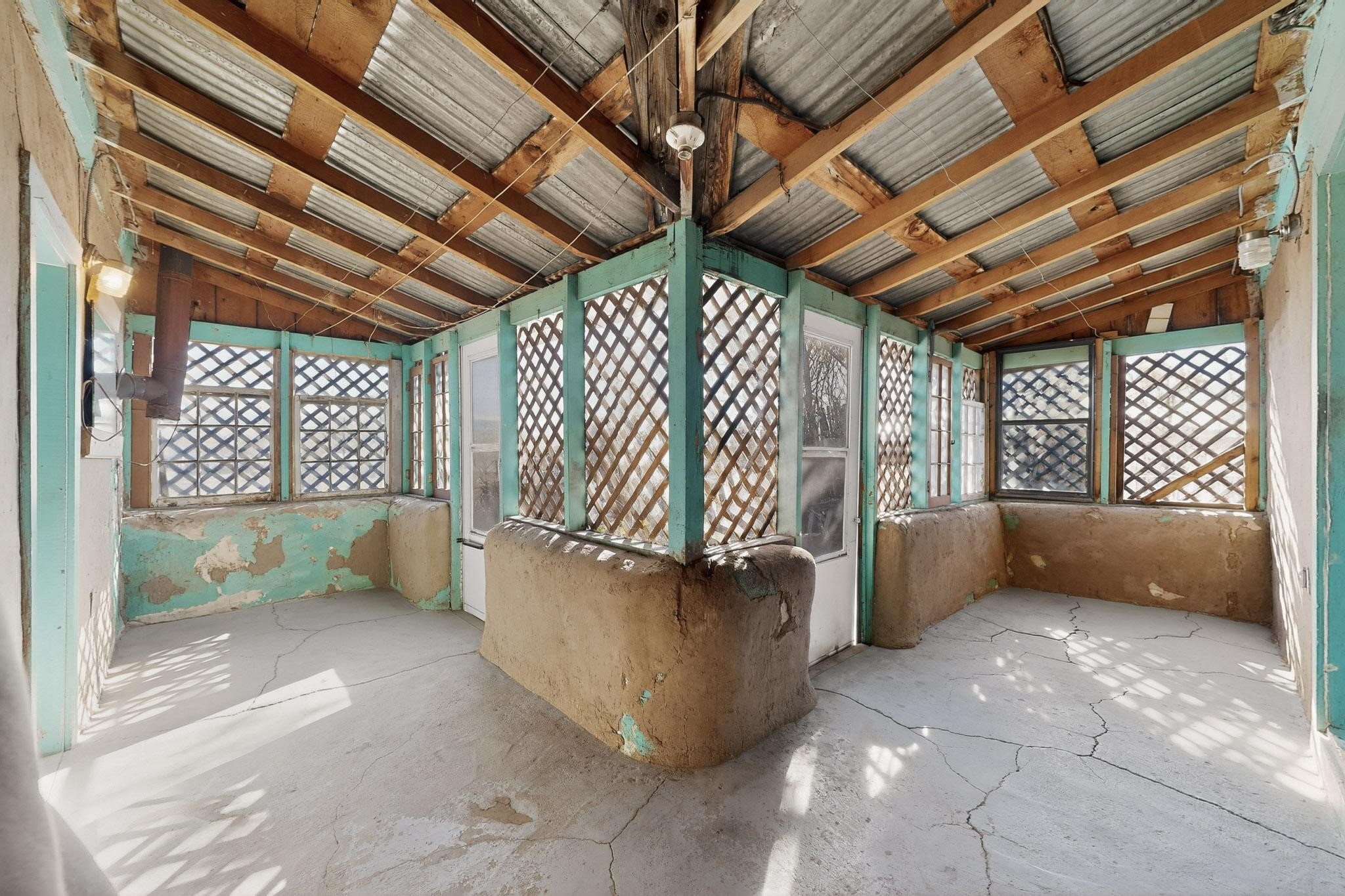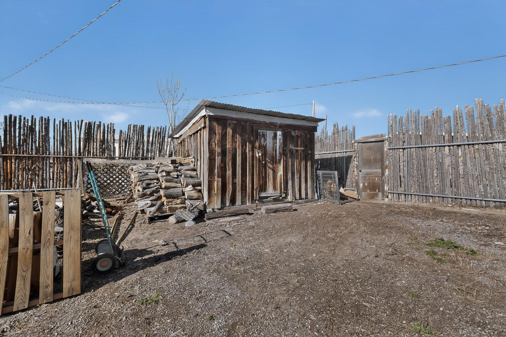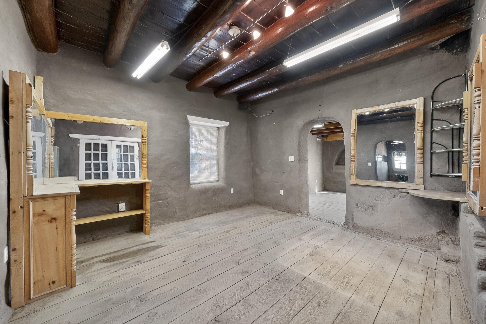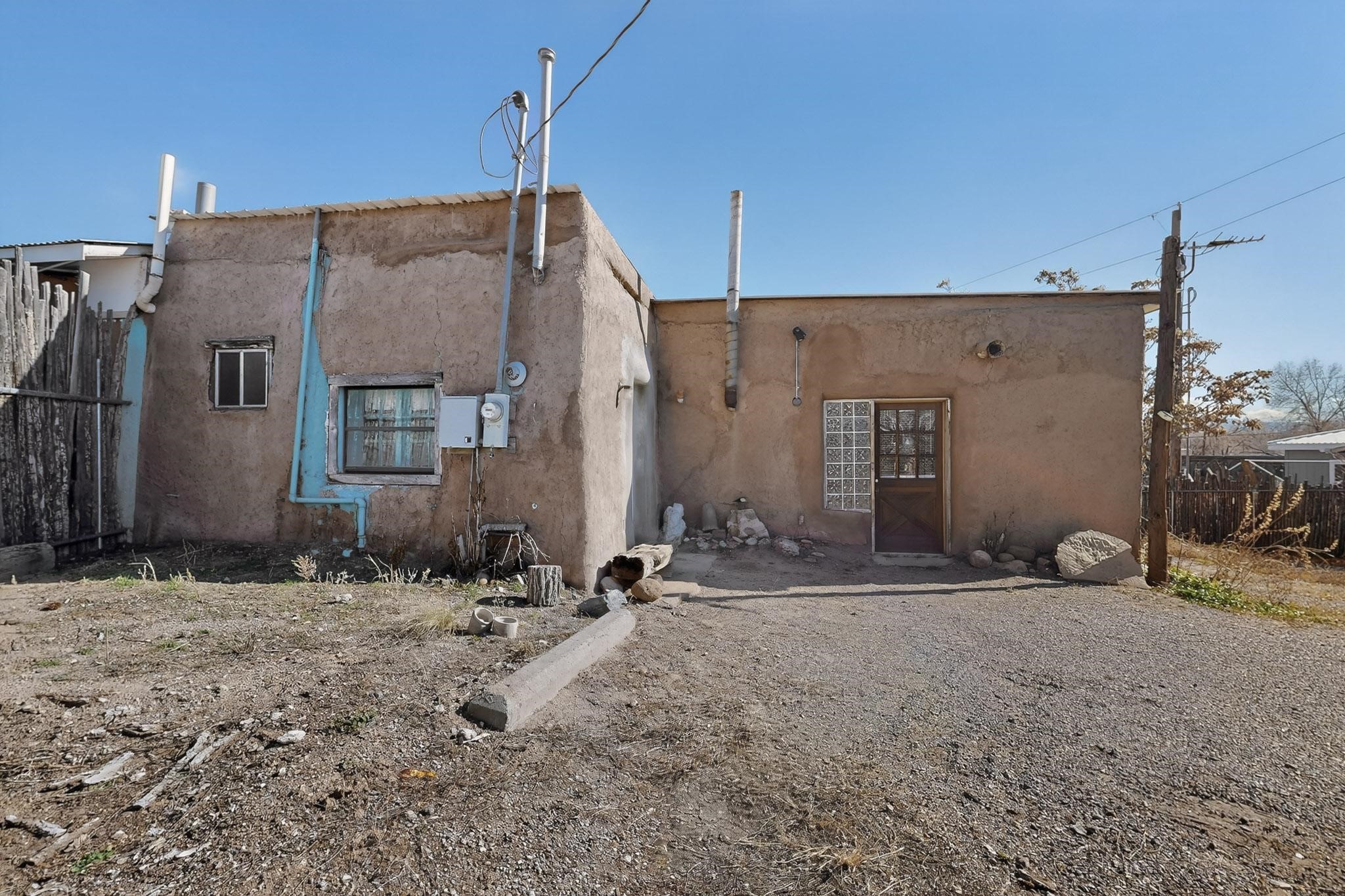 A truly unique adobe town home, perched on a small hill in Espaola, offers breathtaking views of the valley and the Sangre de Cristo Mountains. This property presents an exciting opportunity for a visionary buyer to transform it into an incredible home. Previously used as a beauty salon and massage parlor, the structure itself is remarkable. Its appeal lies in the semi-exposed adobe walls, beautiful plank flooring, and artistic walls, all awaiting a creative touch to make it a showcase residence. The original home was previously divided by a false wall, and into two separate units, each with its own front and back door. Removing this wall would easily restore the property to its original single-family configuration. The property currently features two bathrooms, one of which has been recently remodeled. Guests are welcomed by a charming porch bordered by small gardens. The front yard offers parking with a graveled pathway leading to the gardens and porch. The private backyard provides additional parking and ample secluded outdoor space. This is not a home for just anyone, but it is the perfect canvas for someone with vision.