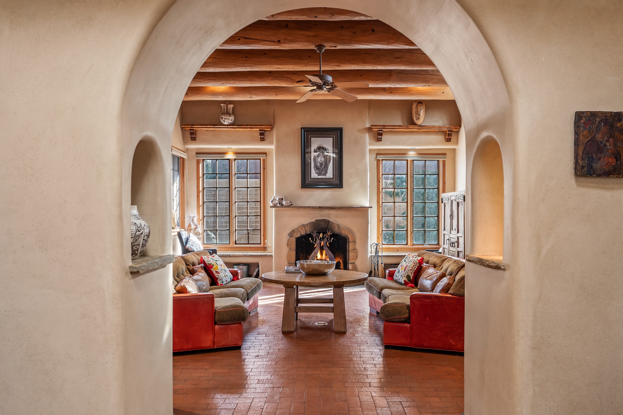 Nestled on a quiet cul-de-sac in Santa Fe's coveted South Capitol neighborhood, this beautifully crafted 3,600 sq. ft. single-level home offers 5 bedrooms, 3 bathrooms, and an attached studio/workshop. Sited on a rare 0.4-acre lot, the home provides generous space for entertaining while still maintaining an intimate, welcoming feel. Enclosed by a handsome adobe wall, the property offers both privacy and timeless Southwestern character--all just minutes from downtown and Wood Gormley Elementary.The home's central living space features a warm and inviting blend of Santa Fe style and spacious flow. Vigas, rough cut wood ceilings, and a commanding fireplace define the living room, while classically arched openings with corbels subtly distinguish the open kitchen, dining, and den areas--offering connectivity with architectural charm. A large den--just off the living room--provides additional living space, perfect for a media room or library/office space. A separate studio/workshop is another perfect space for an in-home office, gym or studio. The home's thoughtful floor plan includes two guest wings, with 2 bedrooms/1 bathroom in each guest area. The primary suite is privately situated in the SouthEast corner of the property with plenty of light and outdoor connectivity and features a wood-burning kiva fireplace, a spacious bathroom with a jetted soaking tub and walk-in shower. Outdoor spaces include a wraparound portal, a thoughtfully landscaped South yard area with a large kiva firepit and a North yard has a second outdoor fireplace, a built-in barbecue and portal that is perfect for outdoor dining. The home features an attached 2-car garage, in-floor radiant heat throughout and mini-splits for cooling. This special property combines scale, privacy, and Santa Fe charm in one of the city's most desirable neighborhoods--truly a rare find.