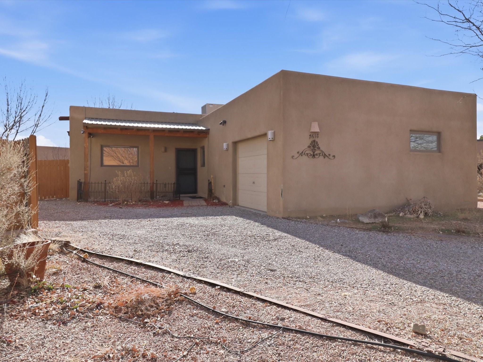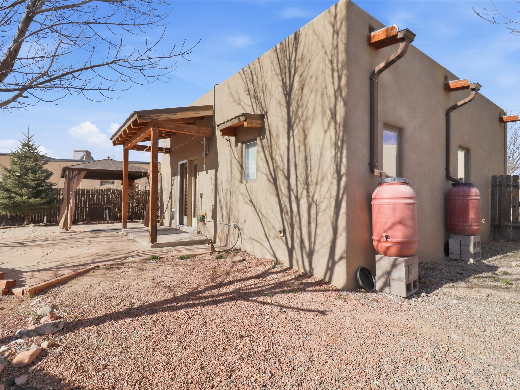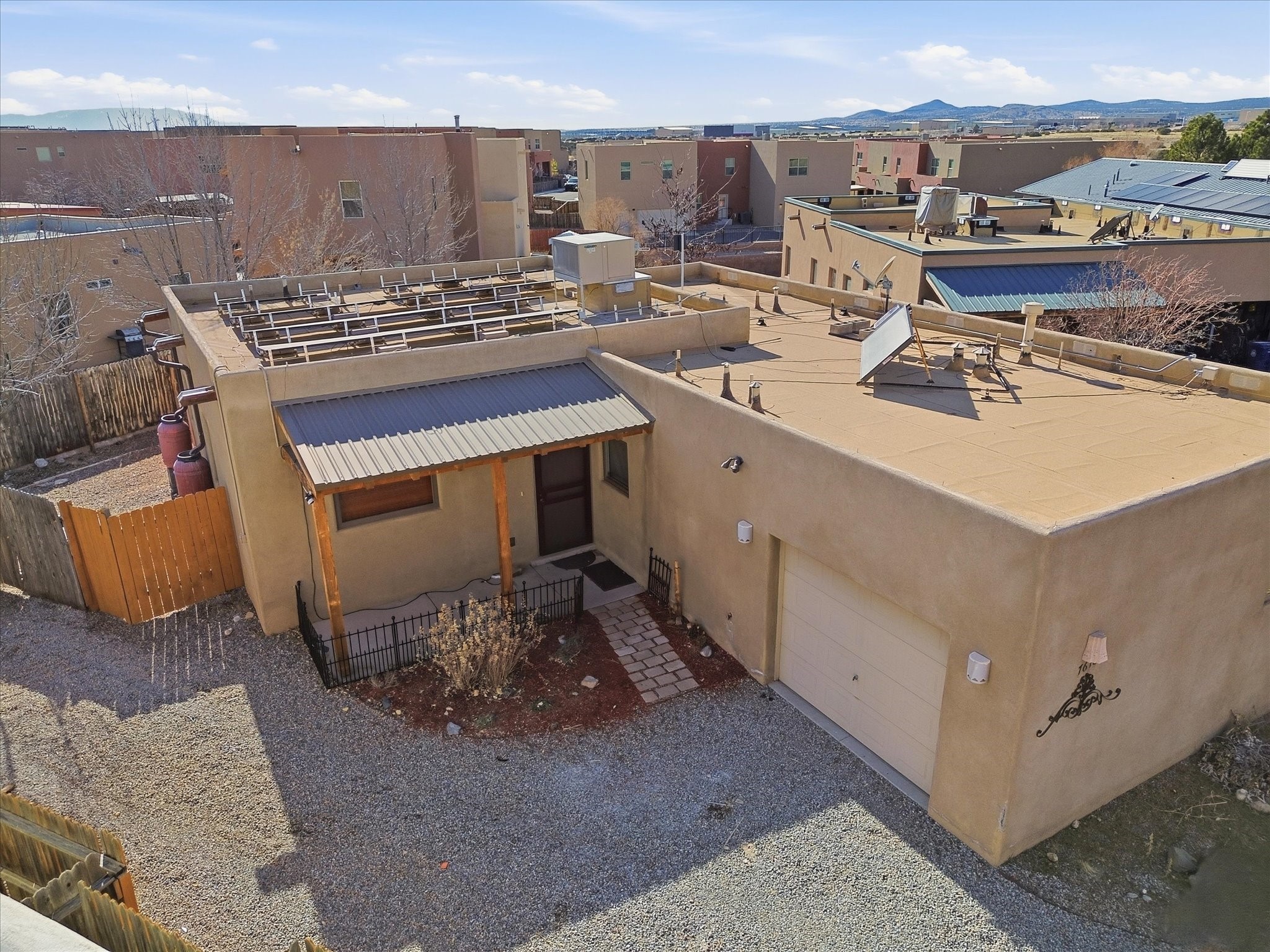 Not far from Santa Fe Country Club, this home offers a blend of comfort, style, renewable energy and Affordability. The practical open floor concept seamlessly connects the kitchen, living room, and dining area, allowing natural light to fill the space and creating a warm, inviting atmosphere.From the main entrance, you're greeted with thoughtful flow--to your right, a private kitchen area featuring ample cabinets for storage, a dishwasher, gas stove, and fridge, and direct access to the laundry room, making daily chores effortless. From the kitchen, step straight into the living space, which opens through a small, covered portal to the backyard with a flagstone patio and pergola, ideal for outdoor gatherings or peaceful afternoons in the garden. The home's two wings provide privacy and functionality: Primary suite: A serene retreat with an attached bathroom and open walk-in closet, offering comfort and style in equal measure. Second wing: A hallway leading to two additional bedrooms and a full bathroom with direct access from the second bedroom, perfect for family or guests. Additional highlights include radiant heating to keep you cozy during chilly winters, tile flooring to keep feet cool in summer, and an attached garage accessible via the kitchen through the pantry/washroom for easy grocery unloading. Located close to Highway 599 for convenient commuting to Santa Fe downtown, Los Alamos, Albuquerque and airport access, this home is a true Santa Fe gem, combining indoor-outdoor living, natural light, and thoughtful design in a tranquil neighborhood setting.