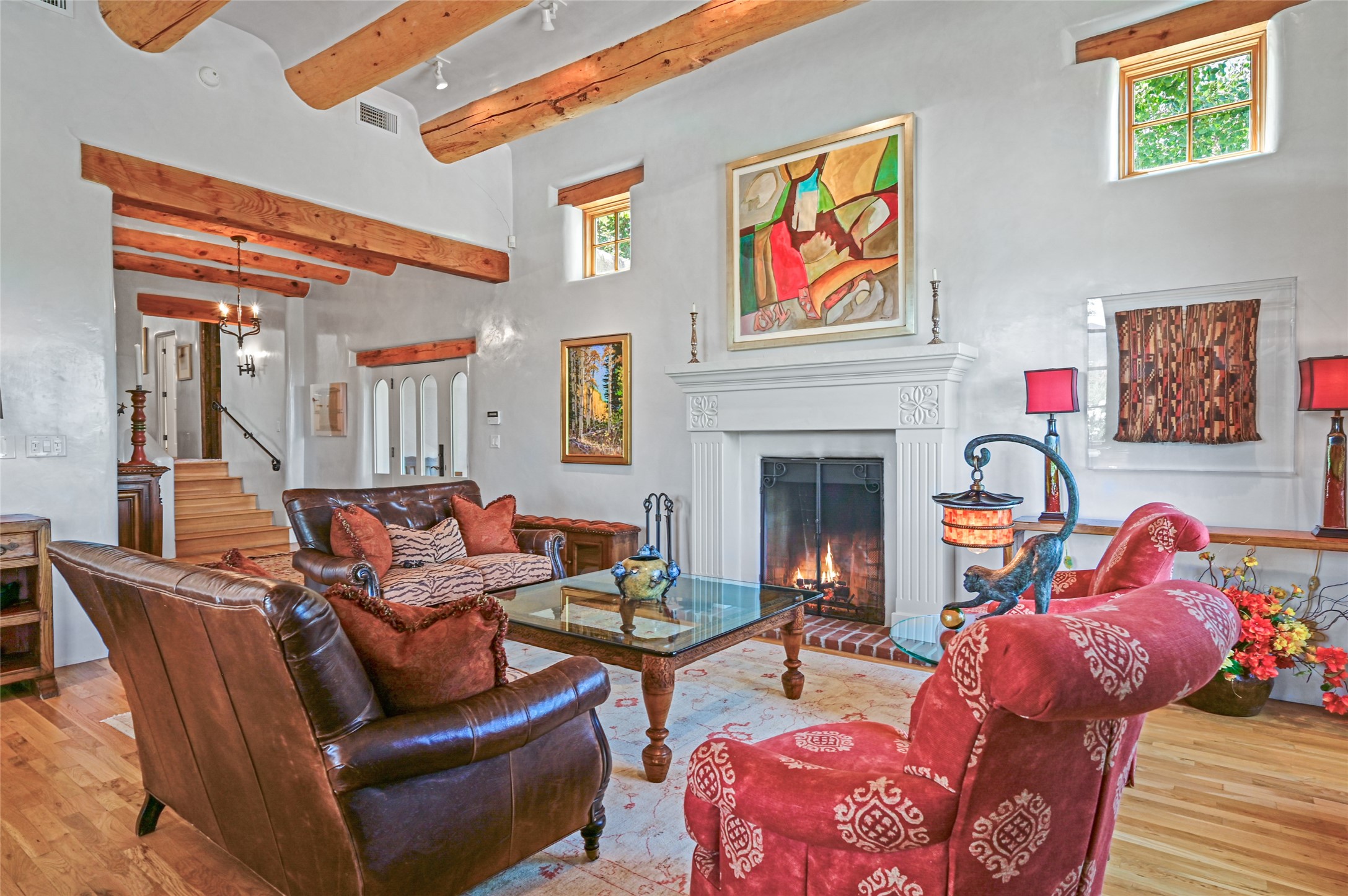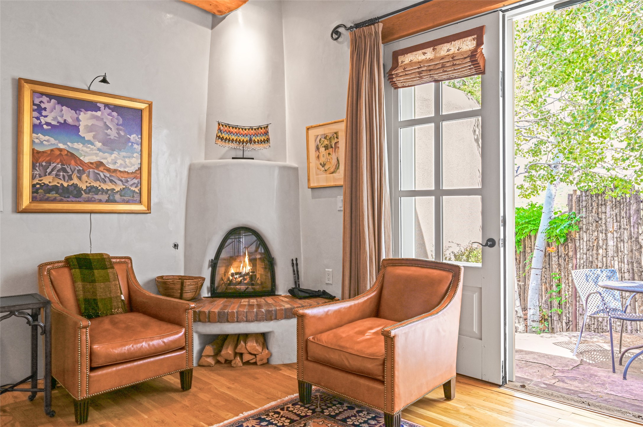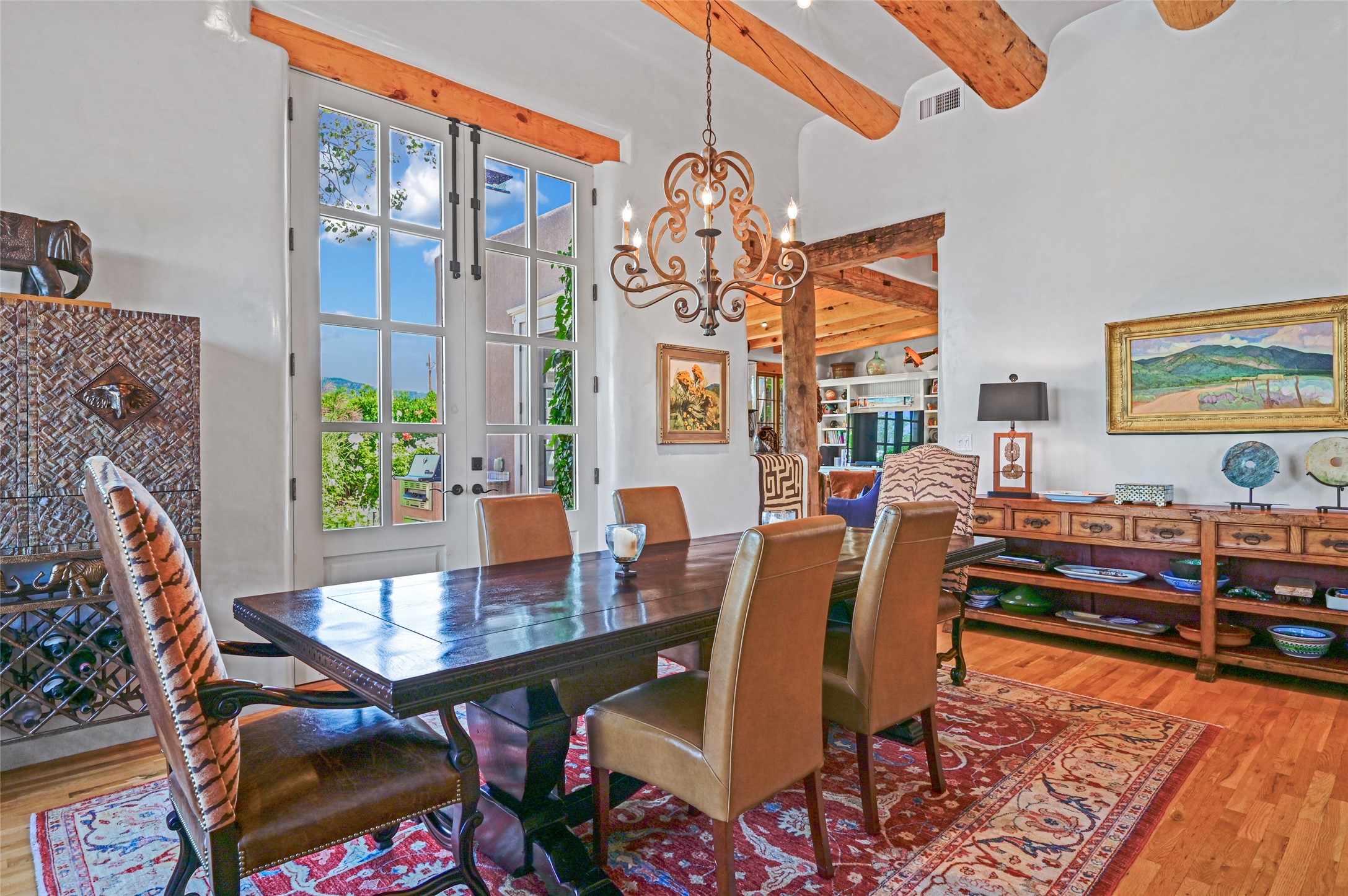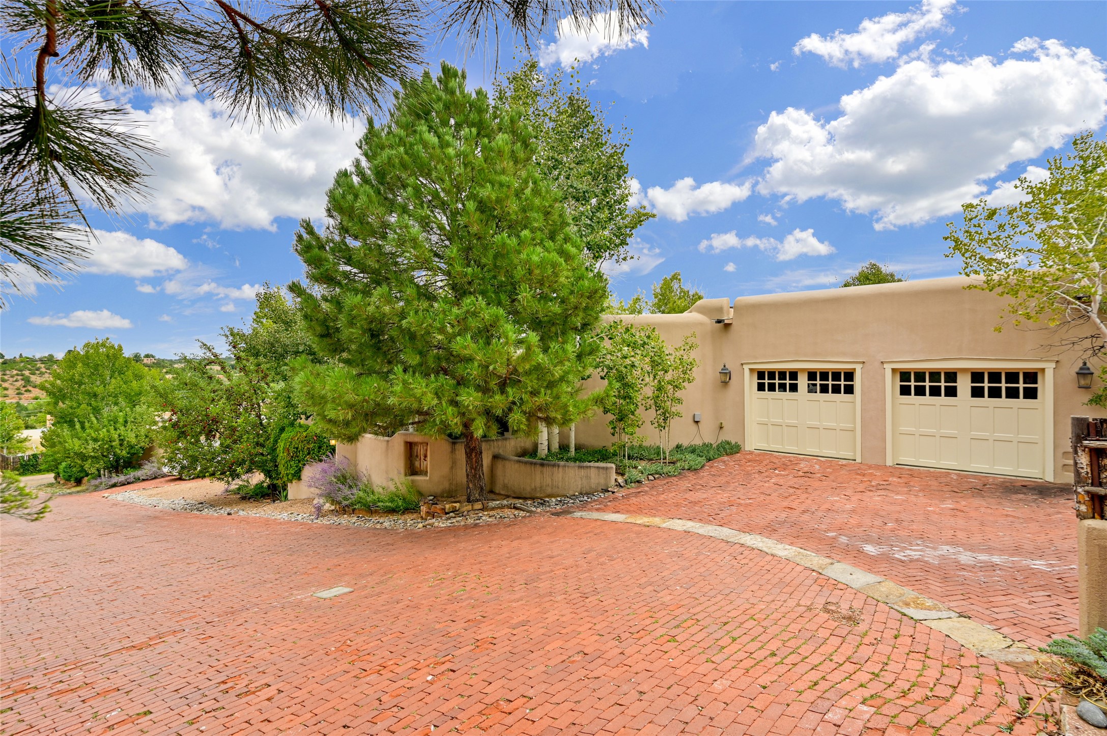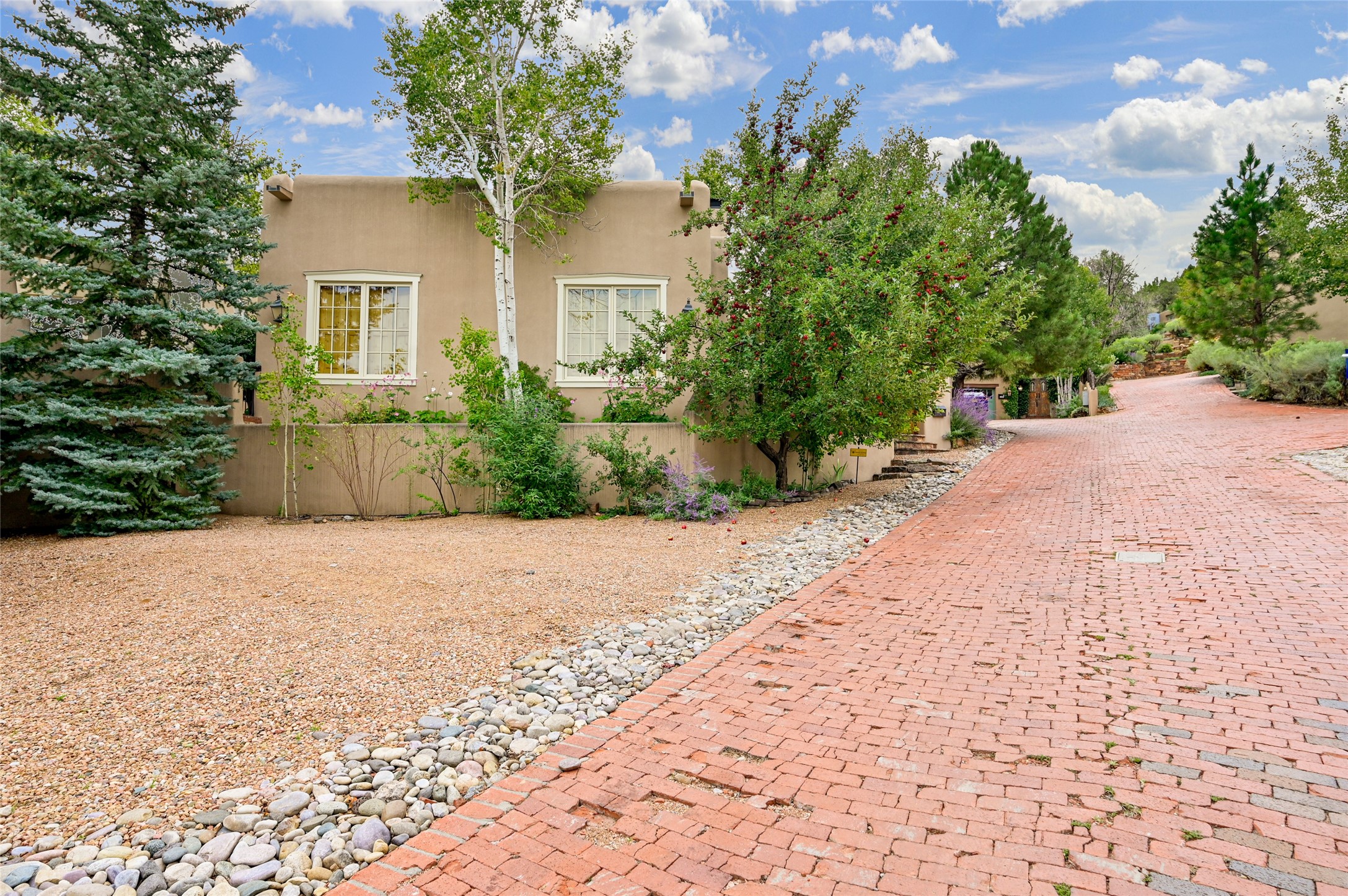 Amazing Eastside, mostly adobe home on a private brick lane. Well-known Builder Jay Park construction.Beautifully designed with all wood flooring, tall beamed ceilings, and a fabulous kitchen space. Sangre De Christo mountain views from the landscaped back patio/garden area. Central heat and air, and a workout room. 3 bedrooms, 3 baths with a direct-access 2-car garage. 2nd home that has been immaculately maintained. Some interior steps. Sangre views off the back patio.