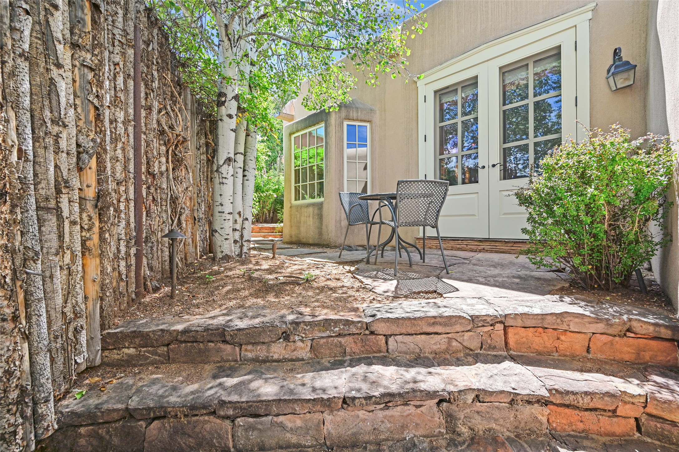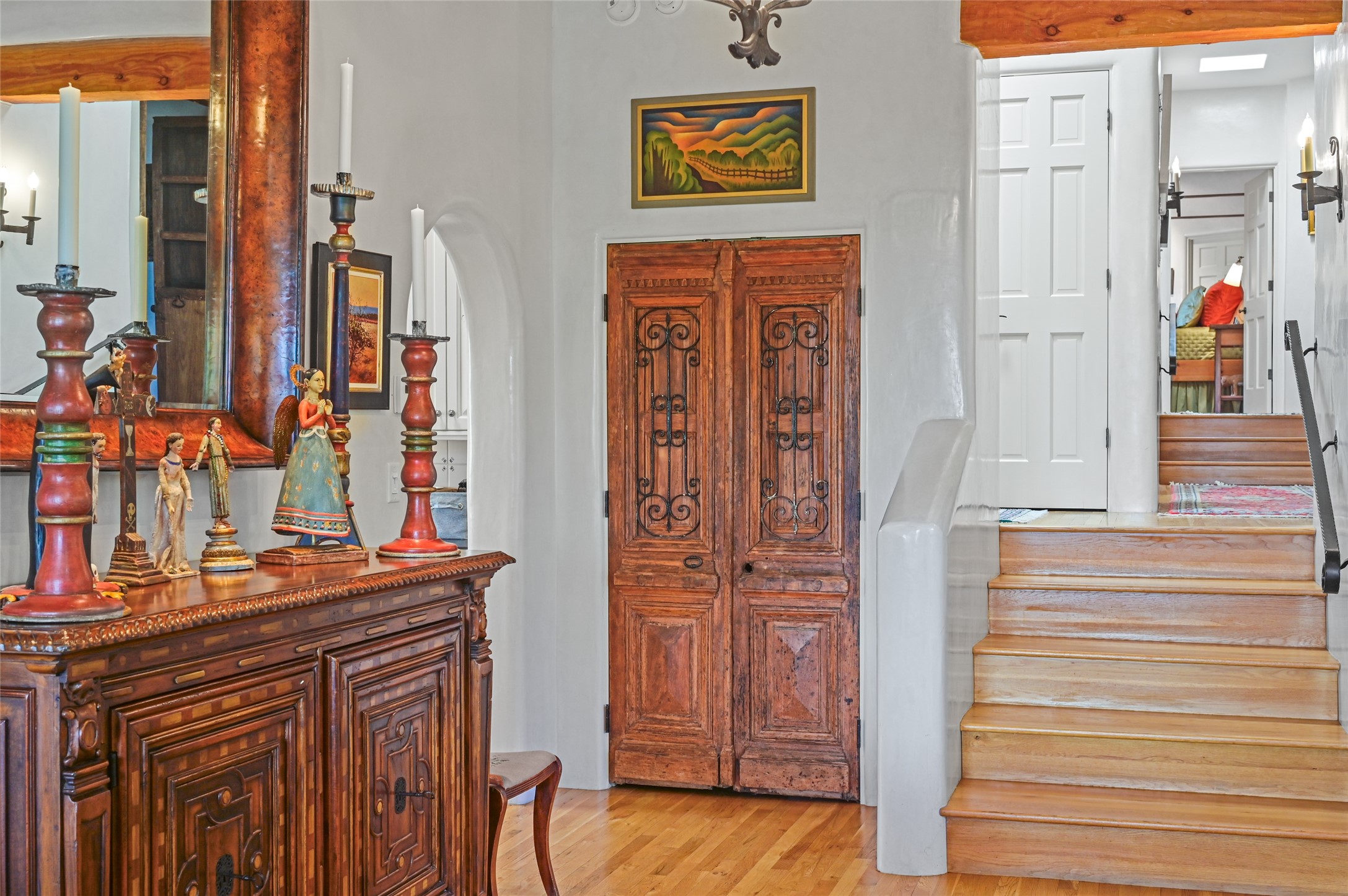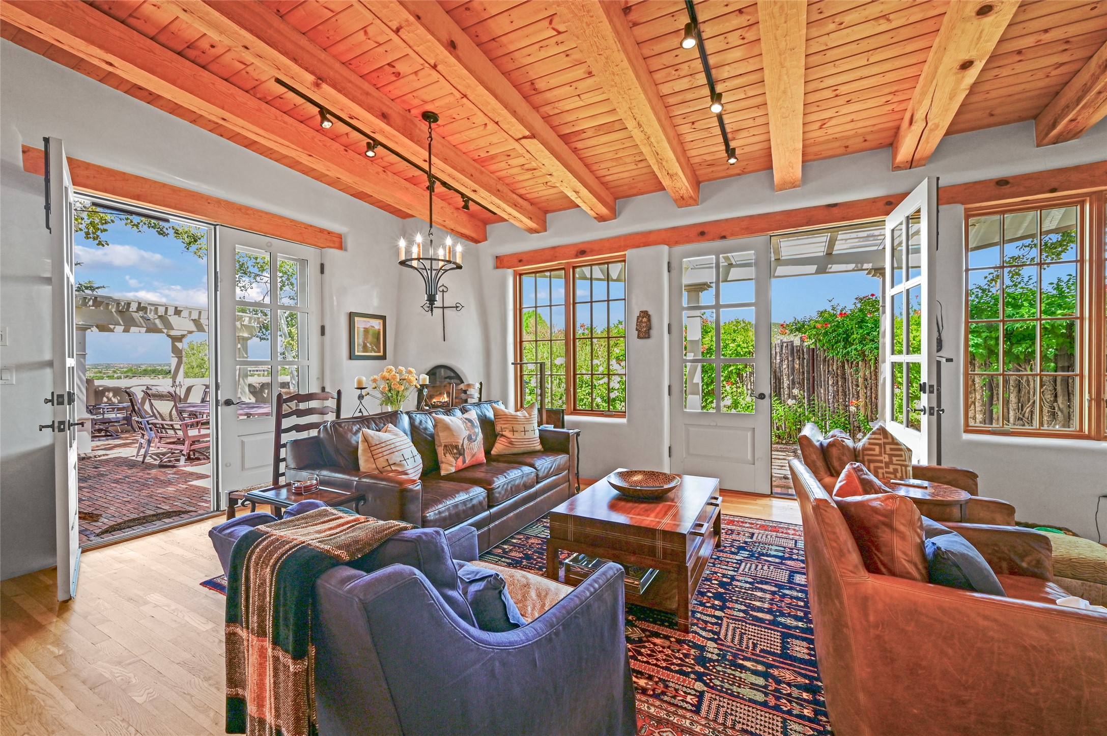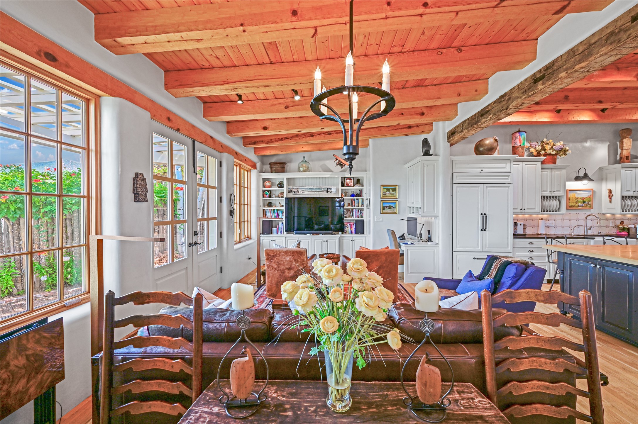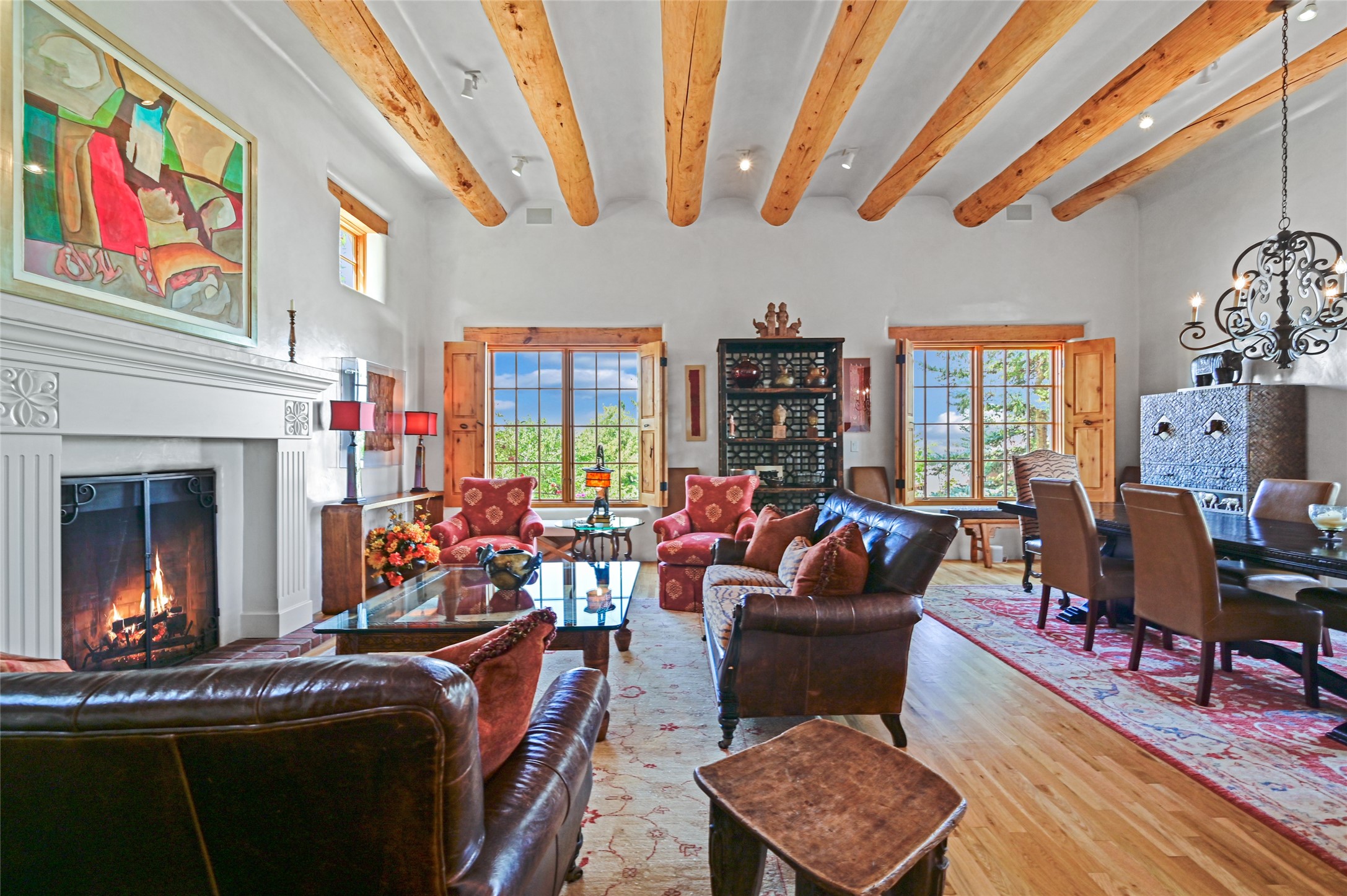 Amazing Eastside, mostly adobe home on a private brick lane. Well-known Builder Jay Park construction.Beautifully designed with all wood flooring, tall beamed ceilings, and a fabulous kitchen space. Sangre De Christo mountain views from the landscaped back patio/garden area. Central heat and air, and a workout room. 3 bedrooms, 3 baths with a direct-access 2-car garage. 2nd home that has been immaculately maintained. Some interior steps. Sangre views off the back patio.