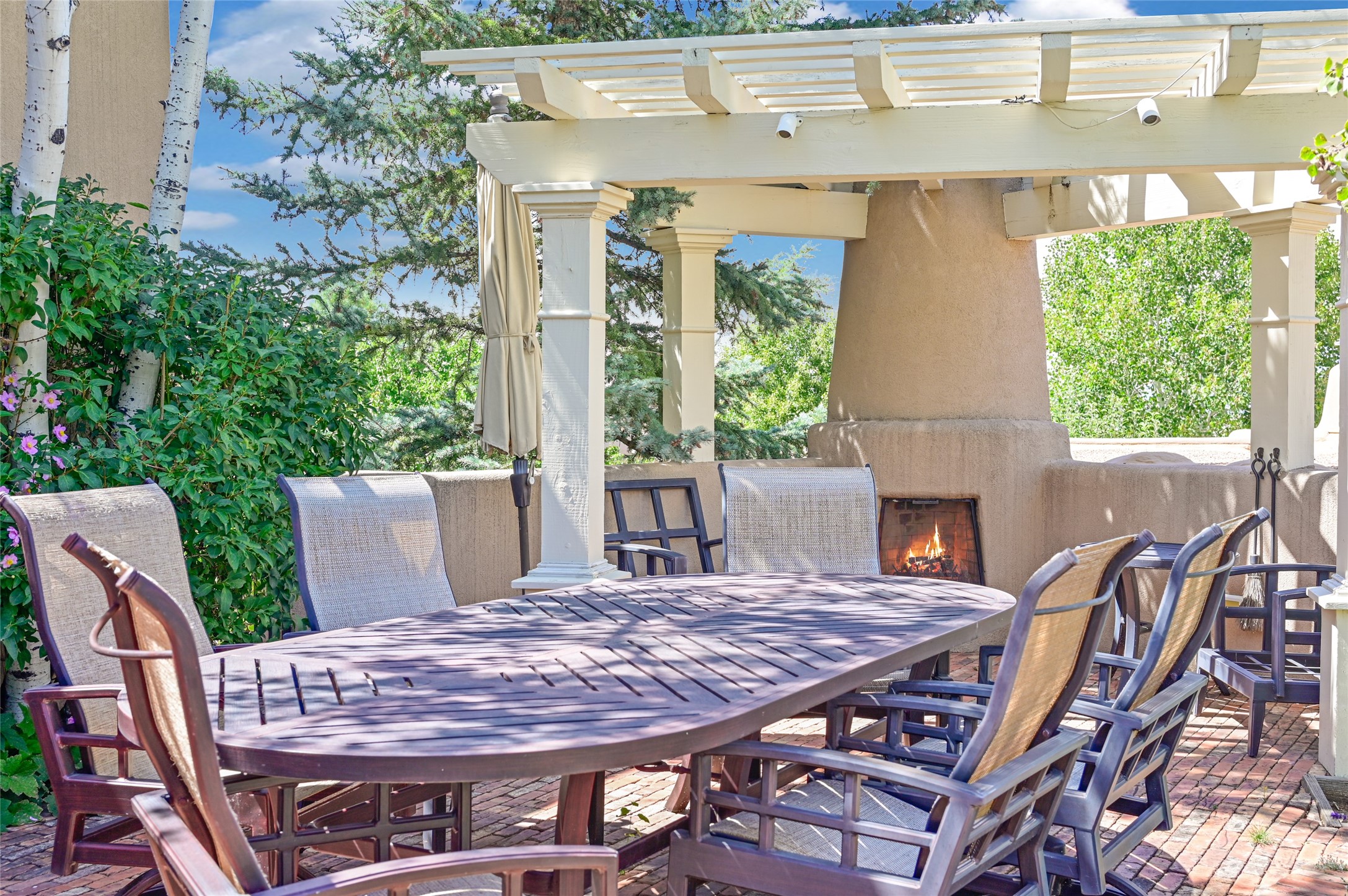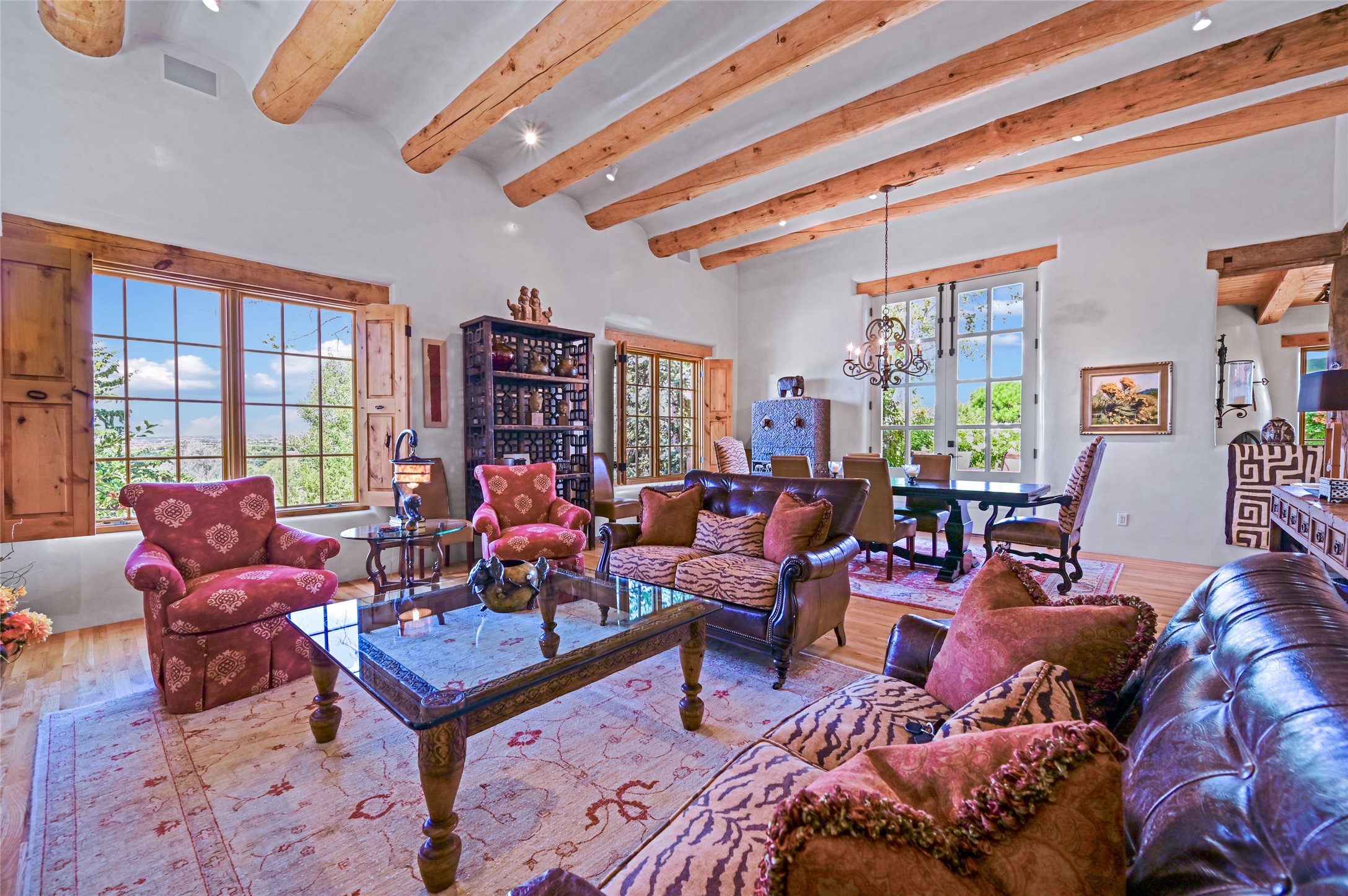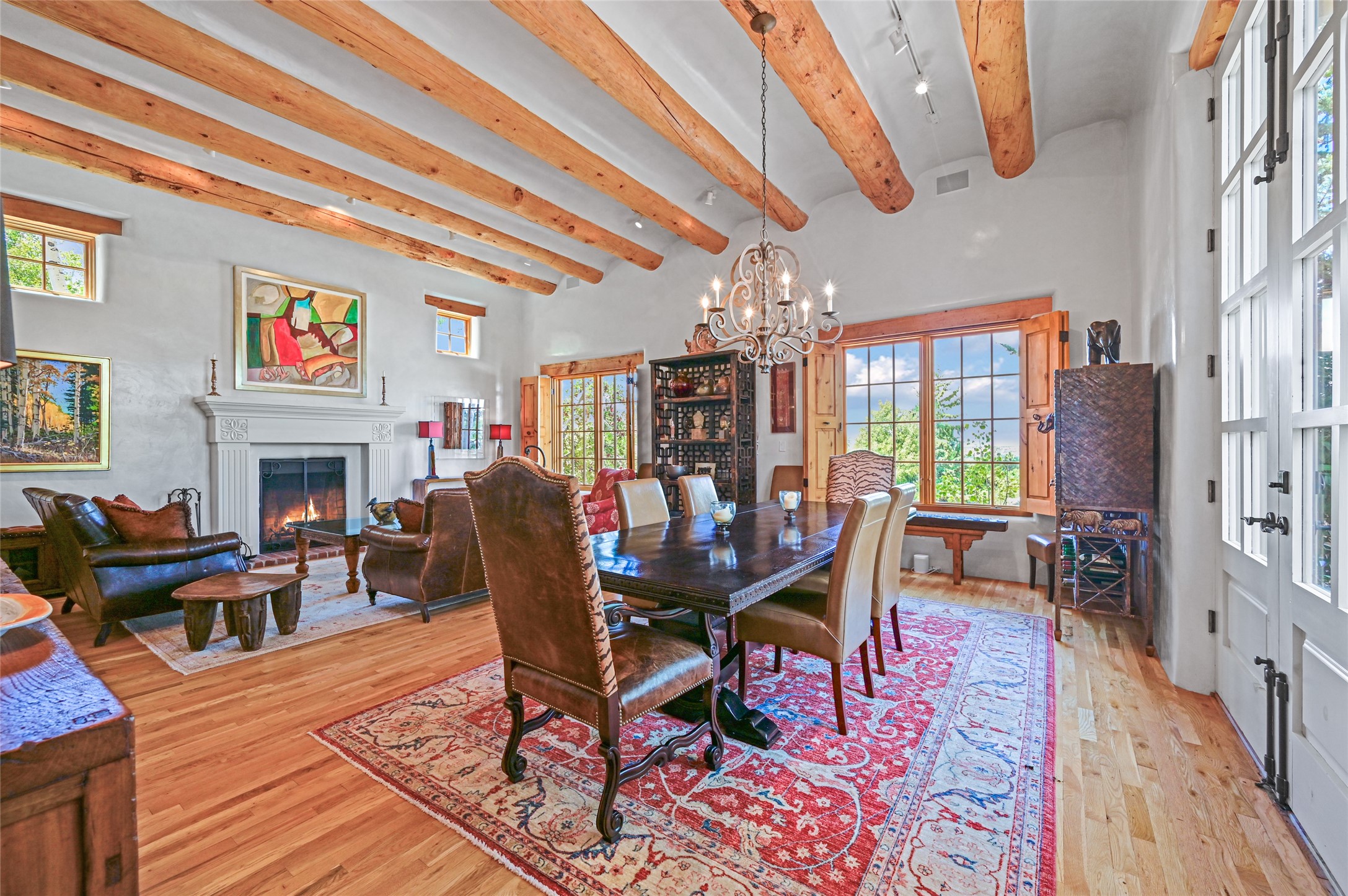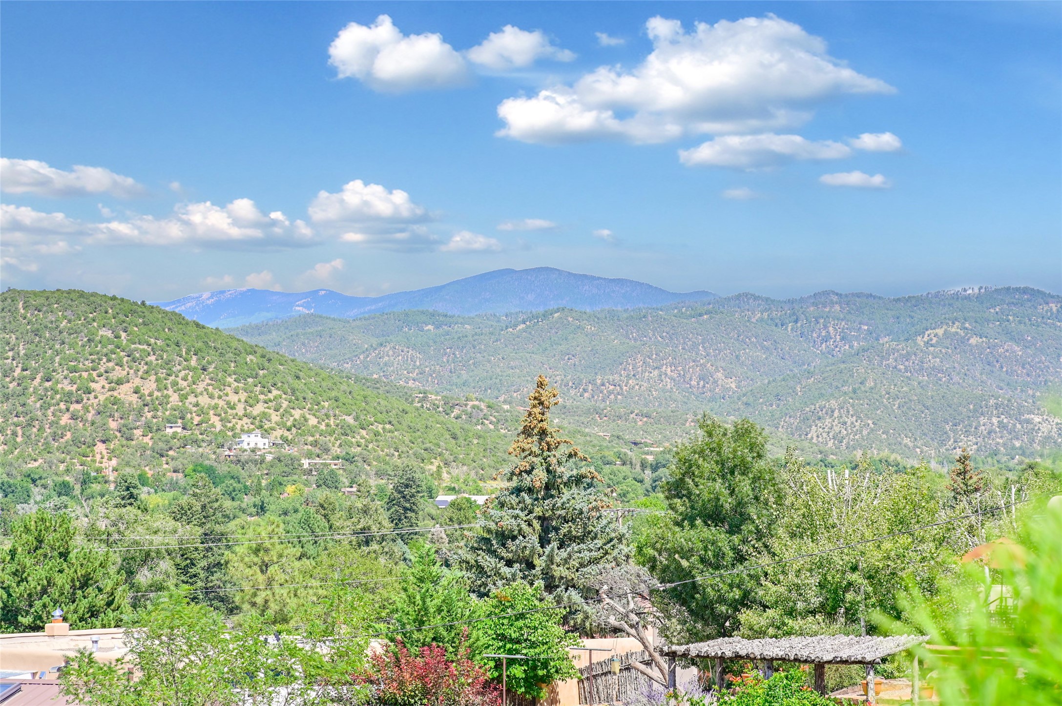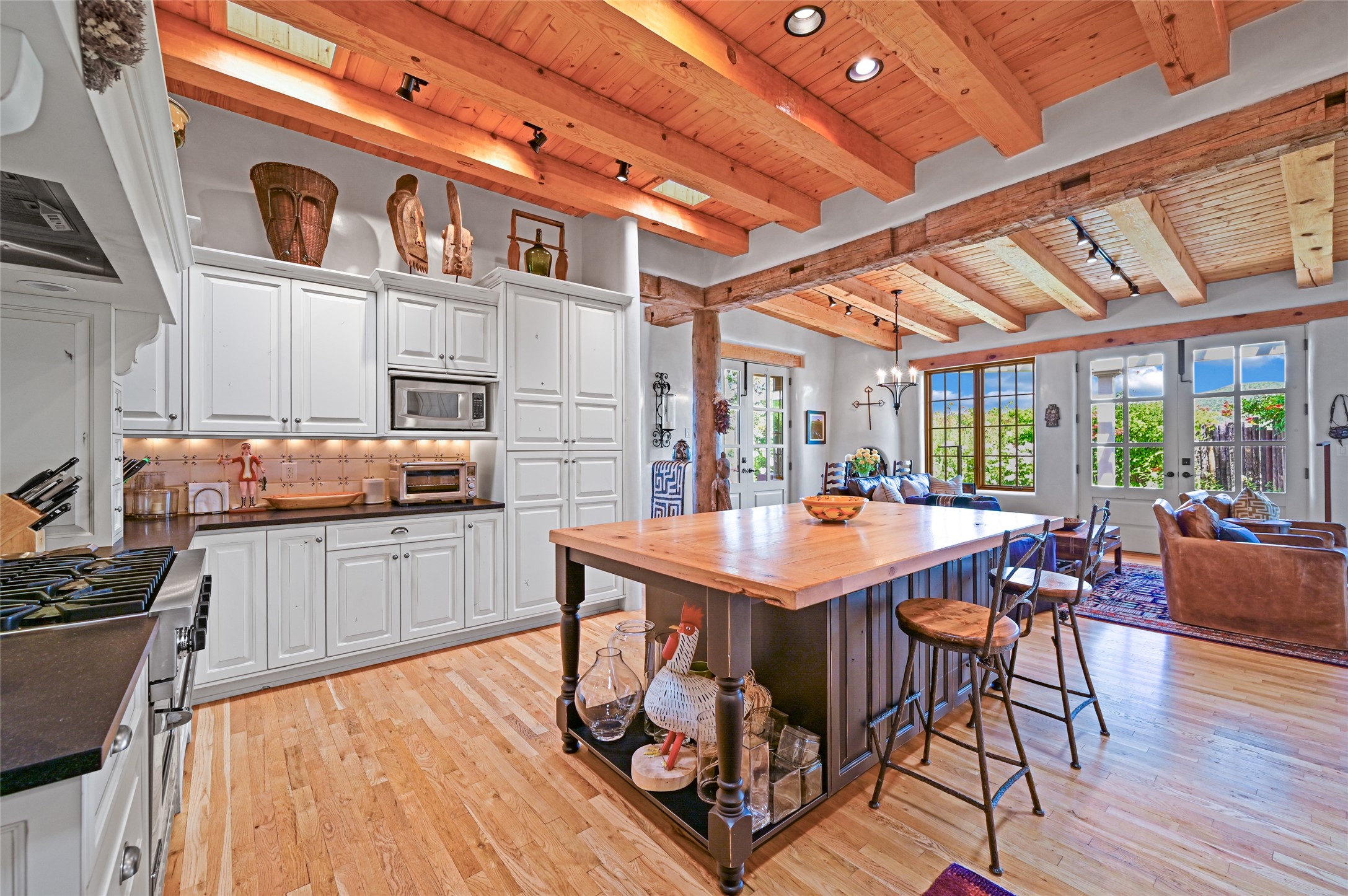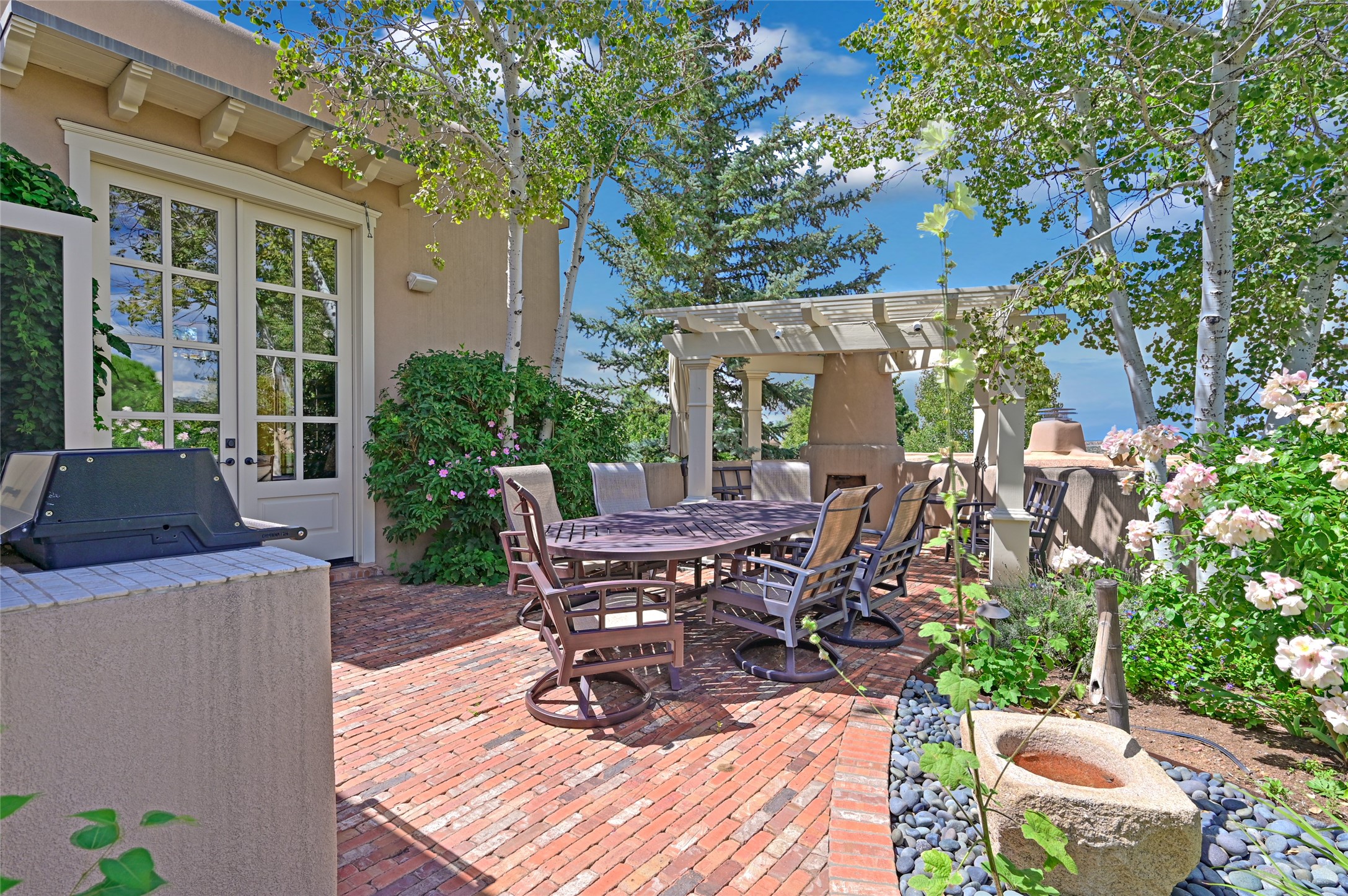 Amazing Eastside, mostly adobe home on a private brick lane. Well-known Builder Jay Park construction.Beautifully designed with all wood flooring, tall beamed ceilings, and a fabulous kitchen space. Sangre De Christo mountain views from the landscaped back patio/garden area. Central heat and air, and a workout room. 3 bedrooms, 3 baths with a direct-access 2-car garage. 2nd home that has been immaculately maintained. Some interior steps. Sangre views off the back patio.