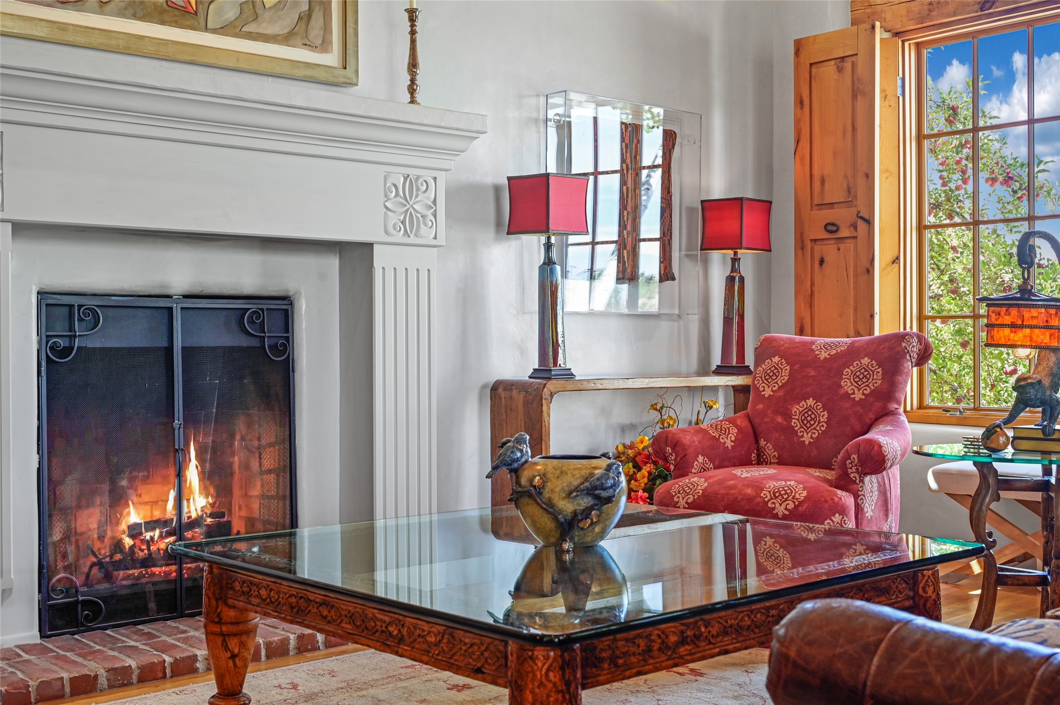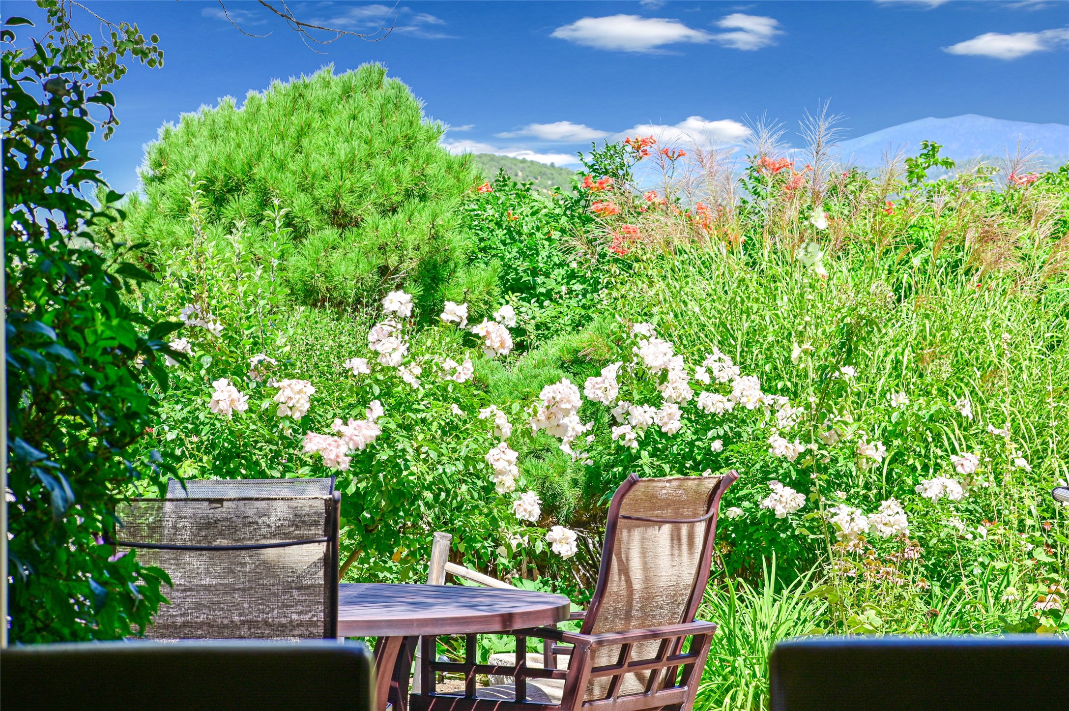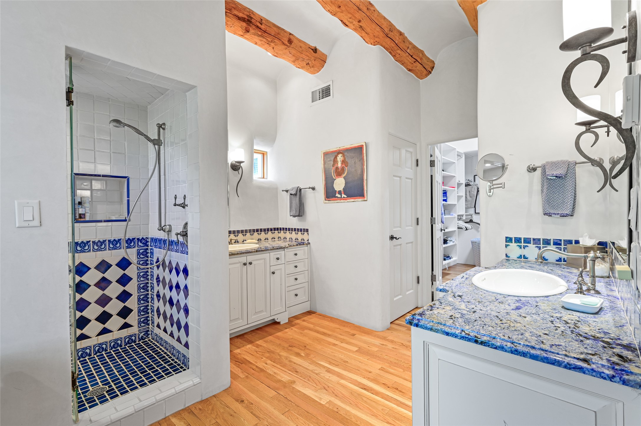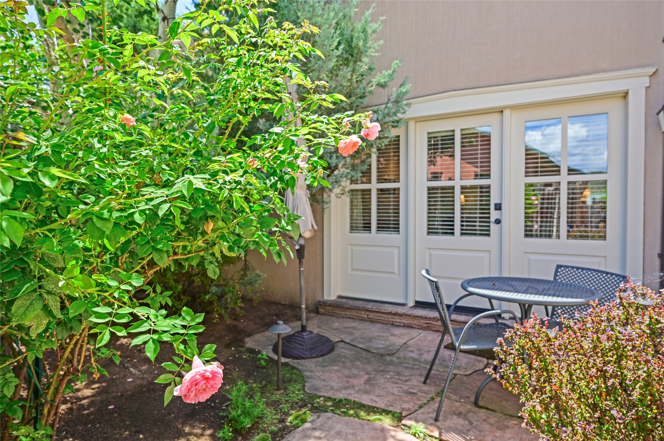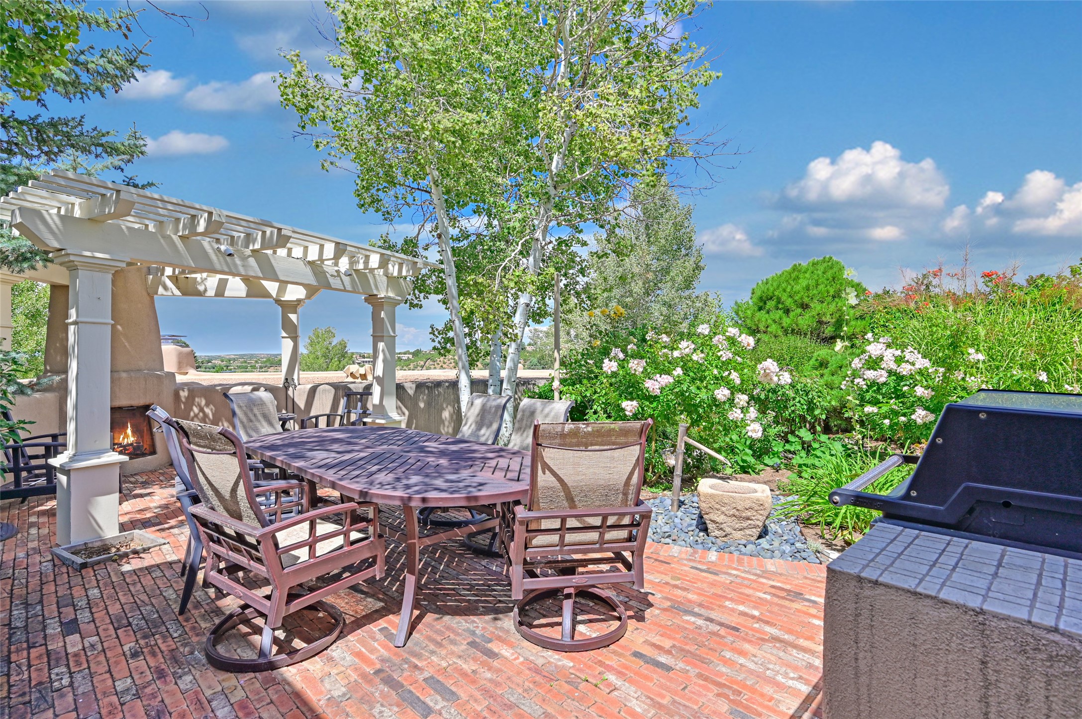 Amazing Eastside, mostly adobe home on a private brick lane. Well-known Builder Jay Park construction.Beautifully designed with all wood flooring, tall beamed ceilings, and a fabulous kitchen space. Sangre De Christo mountain views from the landscaped back patio/garden area. Central heat and air, and a workout room. 3 bedrooms, 3 baths with a direct-access 2-car garage. 2nd home that has been immaculately maintained. Some interior steps. Sangre views off the back patio.