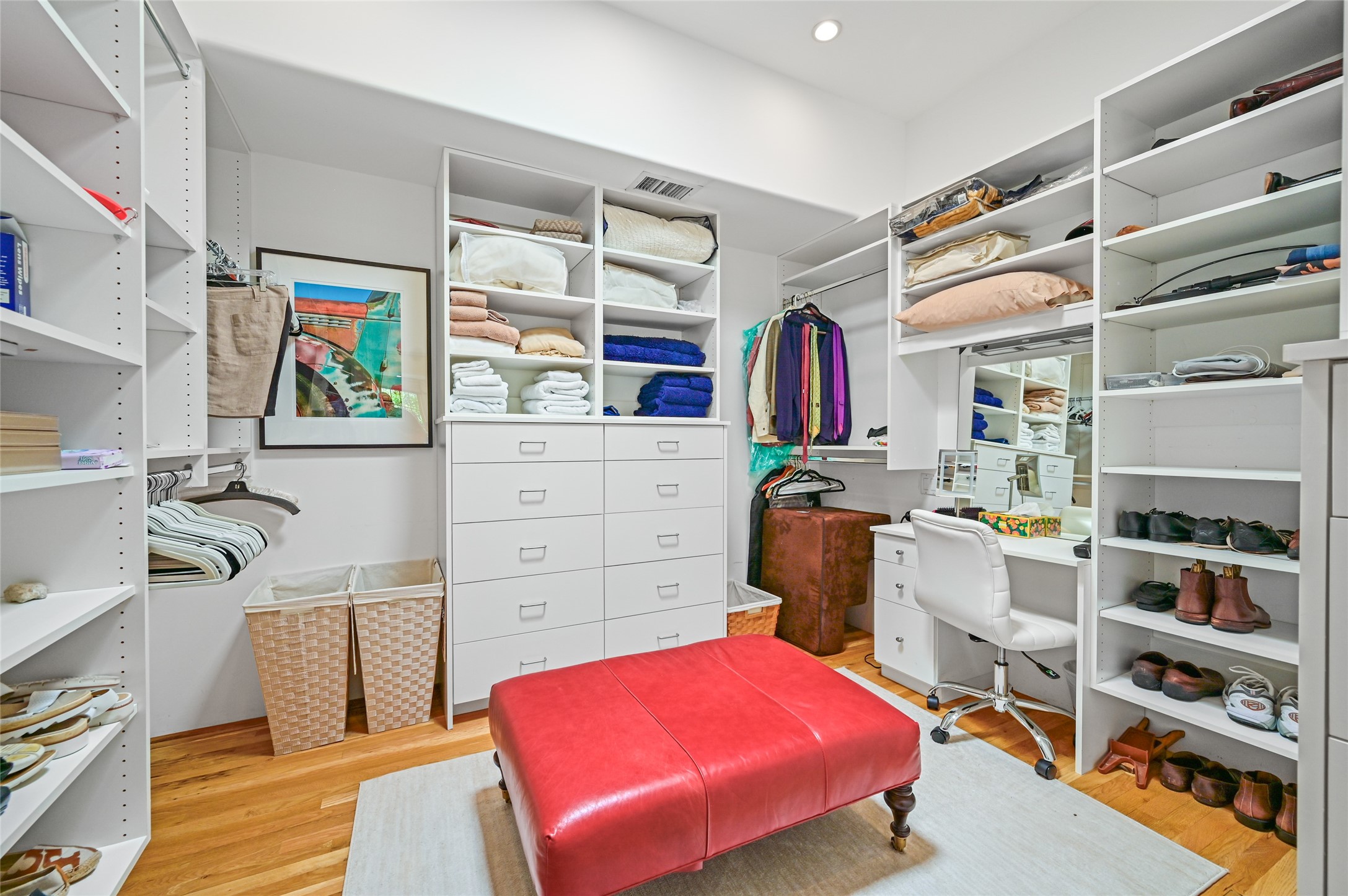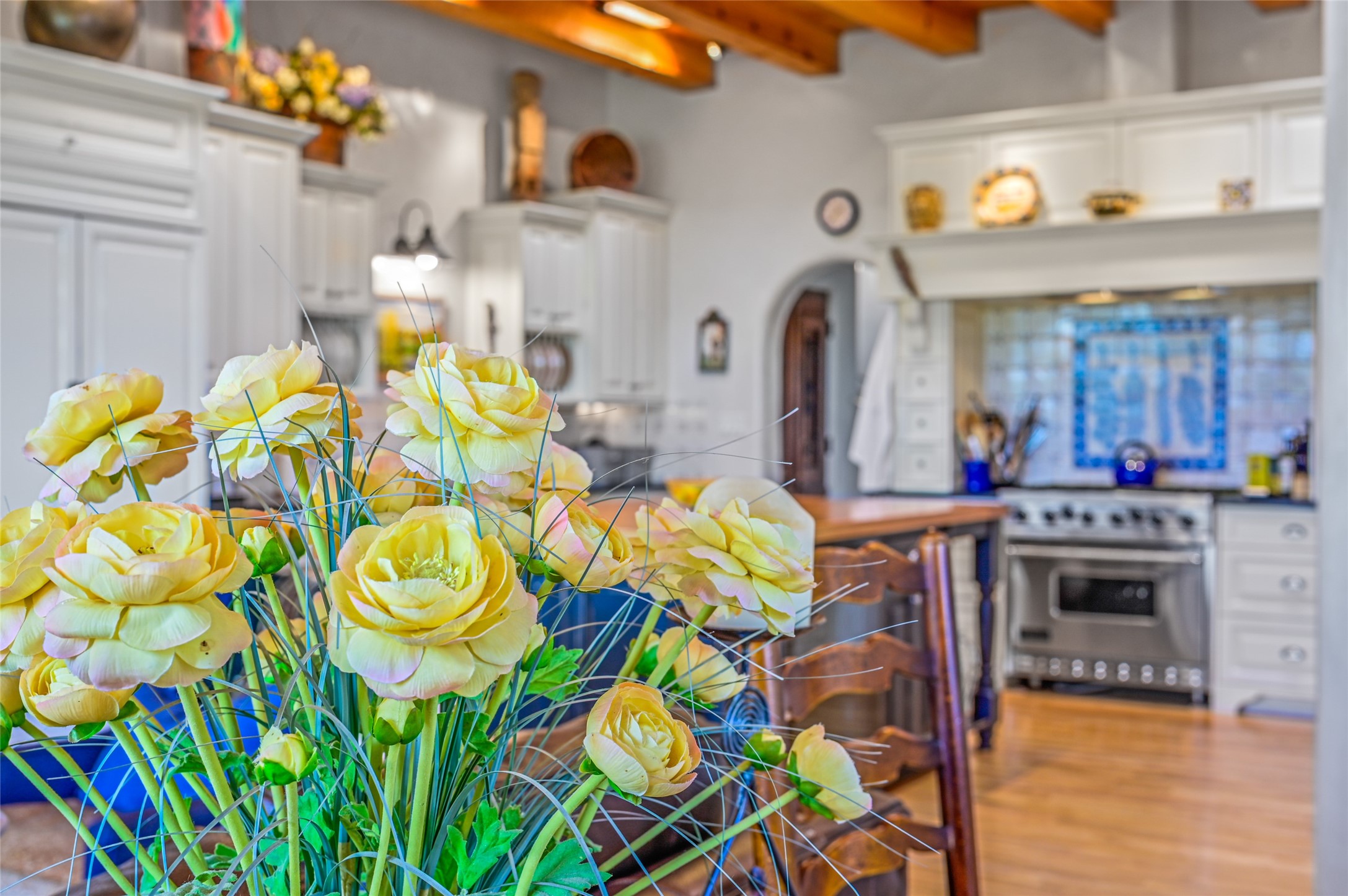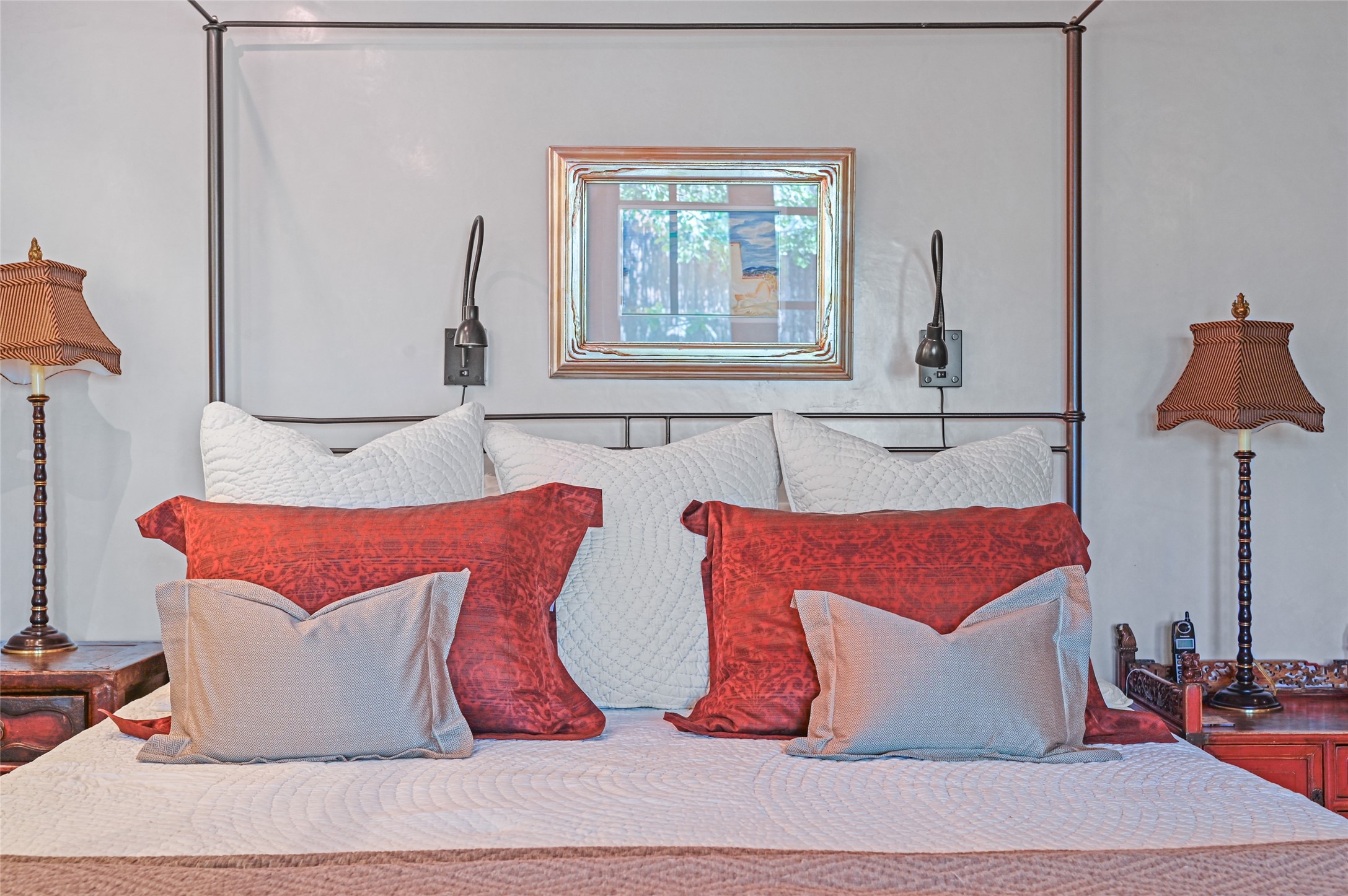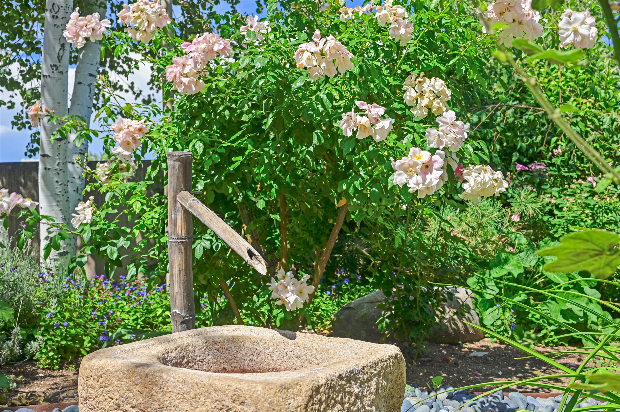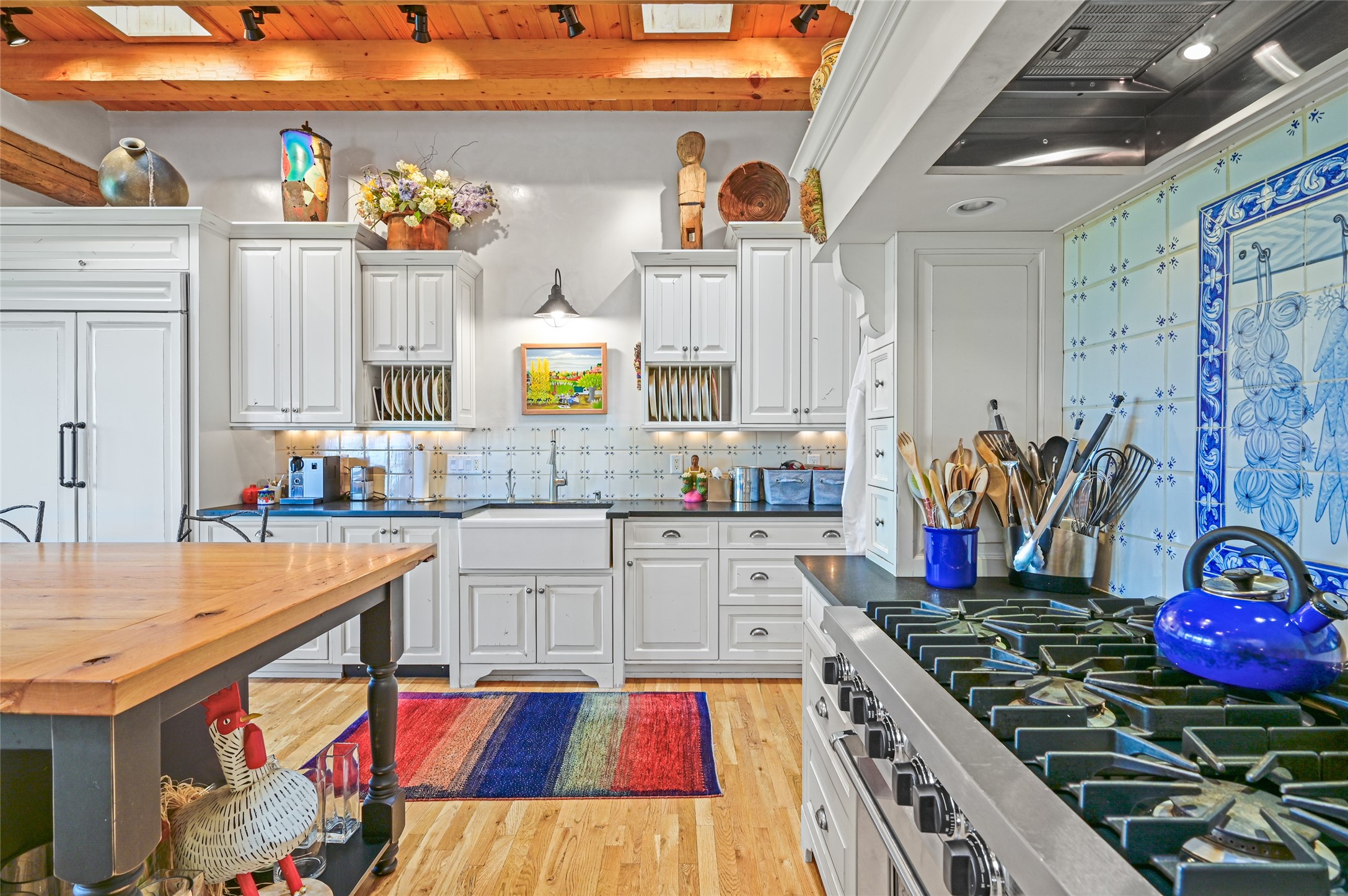 Amazing Eastside, mostly adobe home on a private brick lane. Well-known Builder Jay Park construction.Beautifully designed with all wood flooring, tall beamed ceilings, and a fabulous kitchen space. Sangre De Christo mountain views from the landscaped back patio/garden area. Central heat and air, and a workout room. 3 bedrooms, 3 baths with a direct-access 2-car garage. 2nd home that has been immaculately maintained. Some interior steps. Sangre views off the back patio.