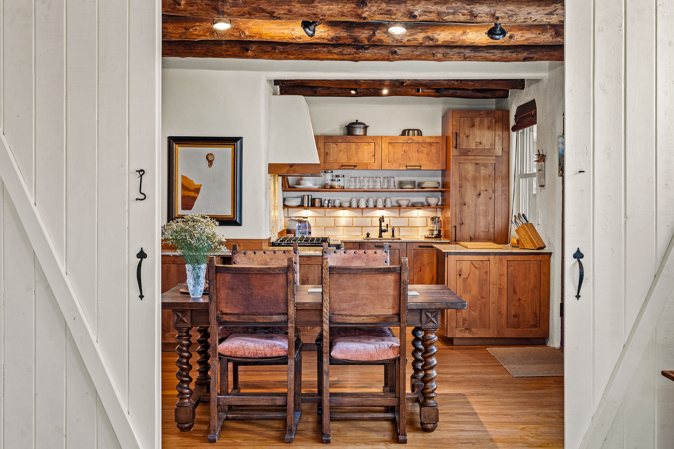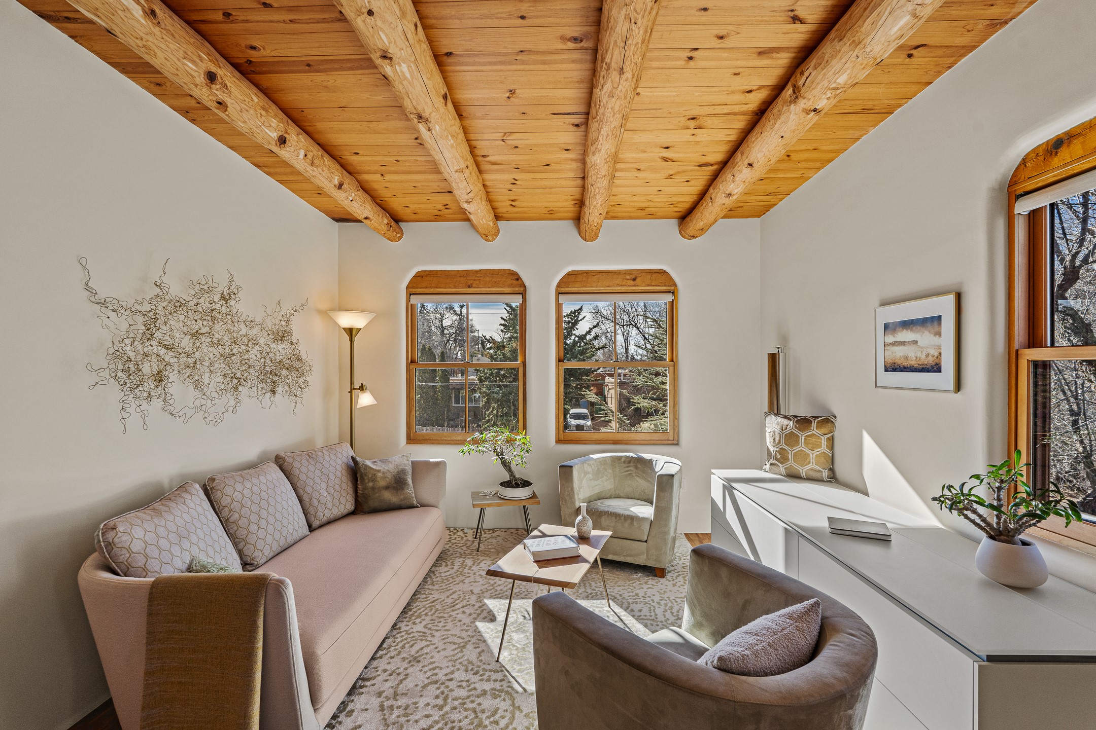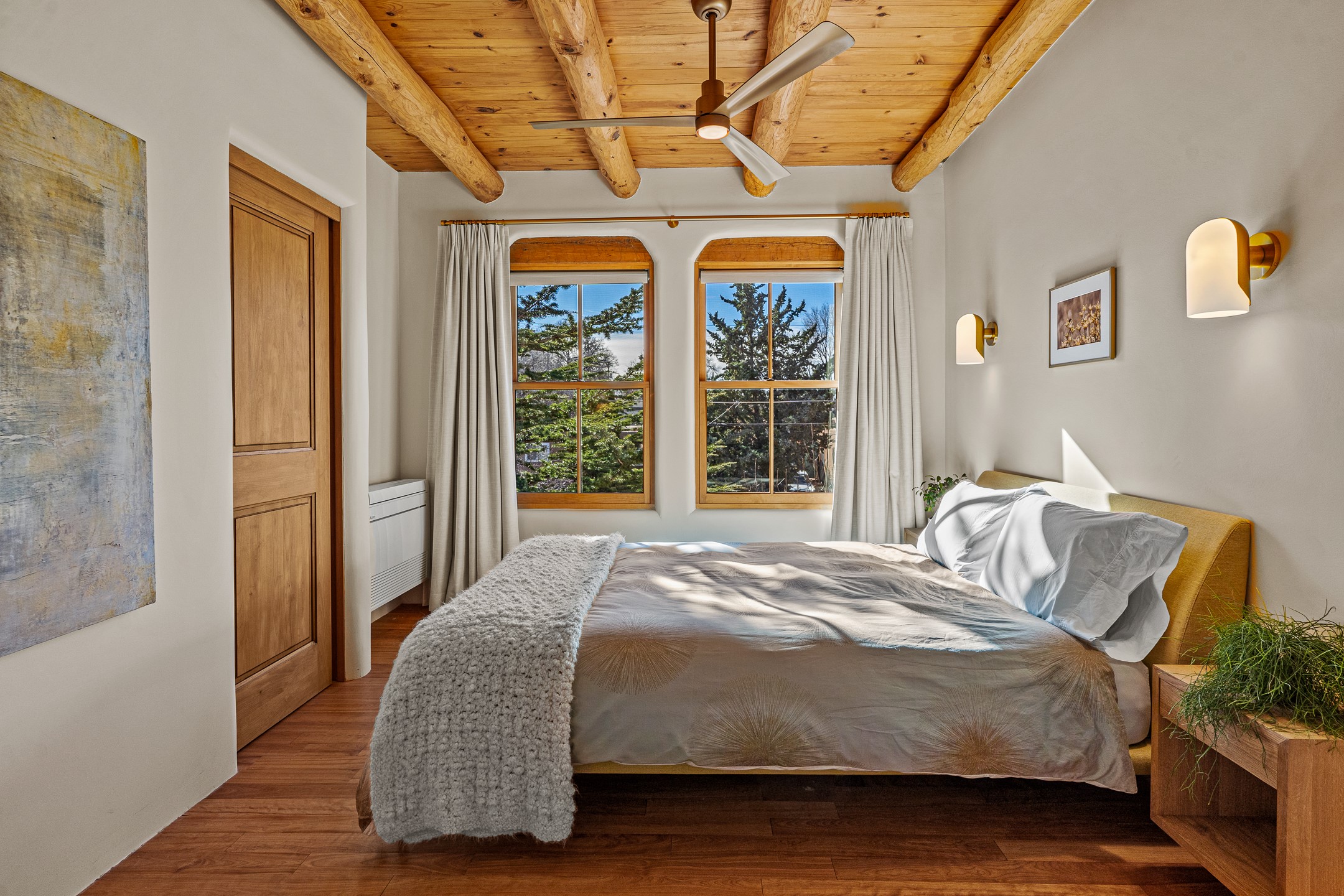 Tucked away on a quiet street in South Capitol, this charming 2-bedroom, 2-bathroom condo has been thoughtfully transformed by Santa Fe Kitchen Design. Every detail of the home reflects quality and craftsmanship with high-end finishes and an integrated design that maximizes style as well as space. The ground level includes the designer kitchen, dining area, a bath with laundry, and a flexible guest bedroom with a walk-in closet which is currently used as an office/sitting room--easily closed off with sliding barn doors. Beautiful hardwood floors run throughout and comfort is ensured year-round with mini-split heating and cooling. Upstairs, the sunny living room offers a warm and inviting retreat, perfect for relaxing or entertaining. The primary suite features a stylish built-in desk, a custom walk-in closet, and a beautifully renovated (2025) bathroom complete with a wall-mounted vanity, an onyx vessel sink, Toto wall-mounted toilet, floor-to-ceiling tiled walk-in shower, and radiant heat flooring. Solar panels, installed in 2023 and backed by a 20-year warranty, enhance energy efficiency and sustainability, while a curbside EV outlet is pre-wired for convenient electric vehicle charging. Located just minutes from downtown Santa Fe, this home is a rare opportunity to own a turnkey, design-forward residence in one of the city's most beloved neighborhoods.