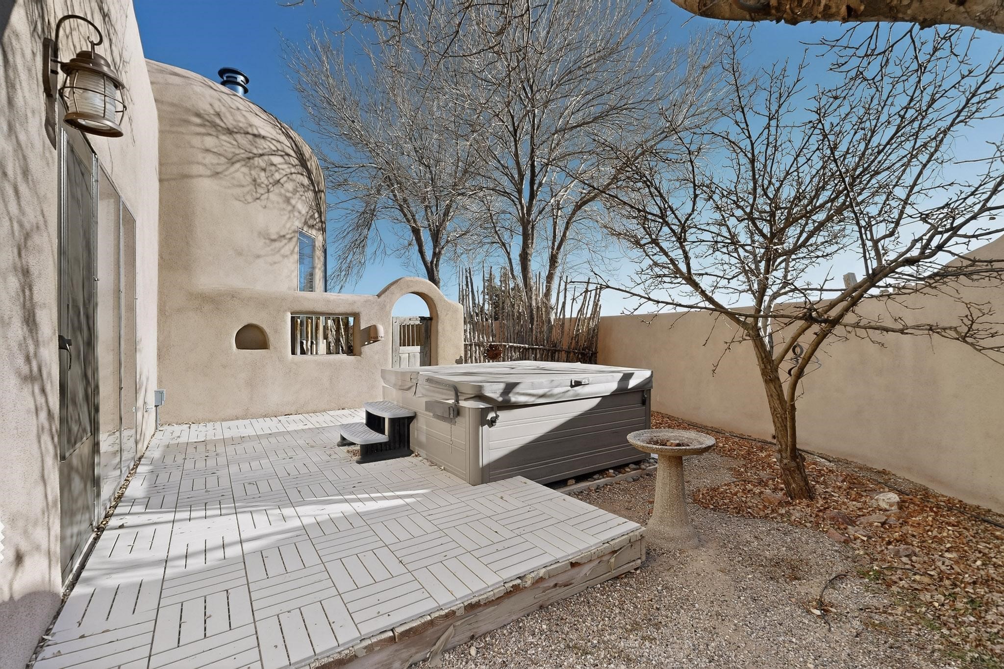 Custom designed and built for the first owner, this 4 bedroom 3 bath home is filled with eye catching hand carved details throughout. An excellent potential for multi family living with great separation of main bedroom and 2 guest wings. A sunny open plan concept with many extra rooms to expand your hobbies or private enjoyment areas. There is a new solar array, boiler, hot water heater and new above ground hot tub installed 2022/2023. New stucco, partial new roof and the 6 mini splits serviced in 2025. An oversized 2 car garage plus a studio bay with garage doors at both ends for easy access and plenty of guest parking. Two walled in private gardens for outside enjoyment accessed from north and south sides of the home. Ideally located bordering a large greenbelt, close to the community centre, hike bike trails, K-8 school, library, senior centre, 2 shopping plazas and only minutes into Santa Fe.