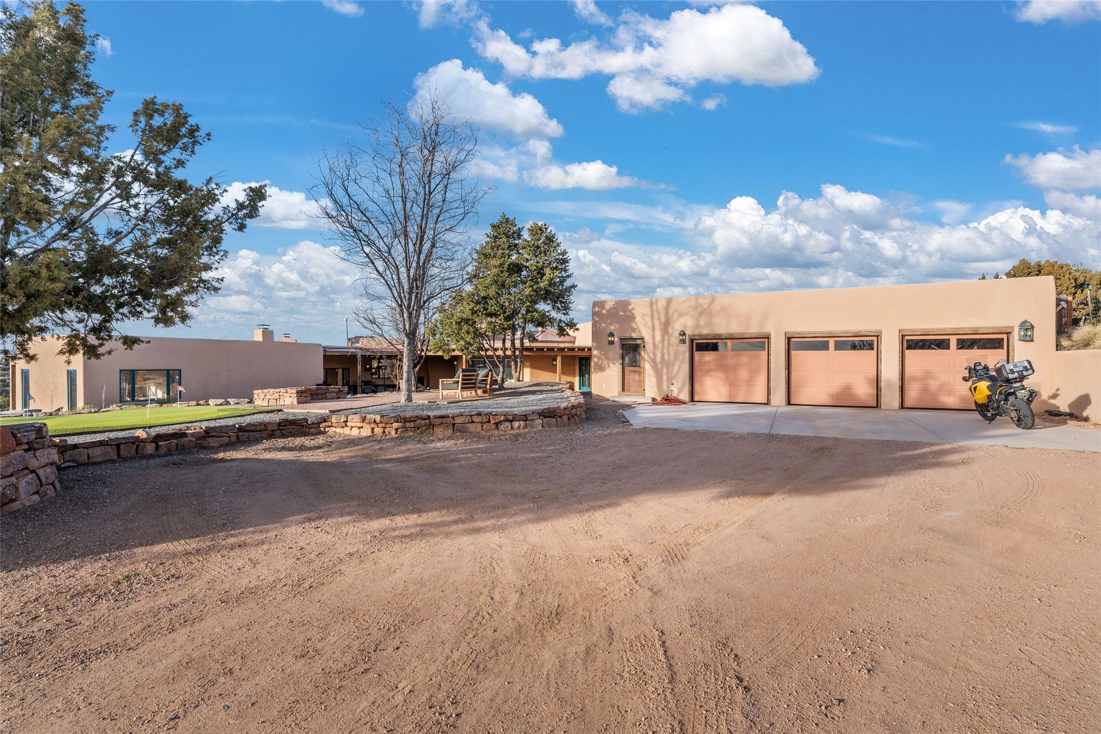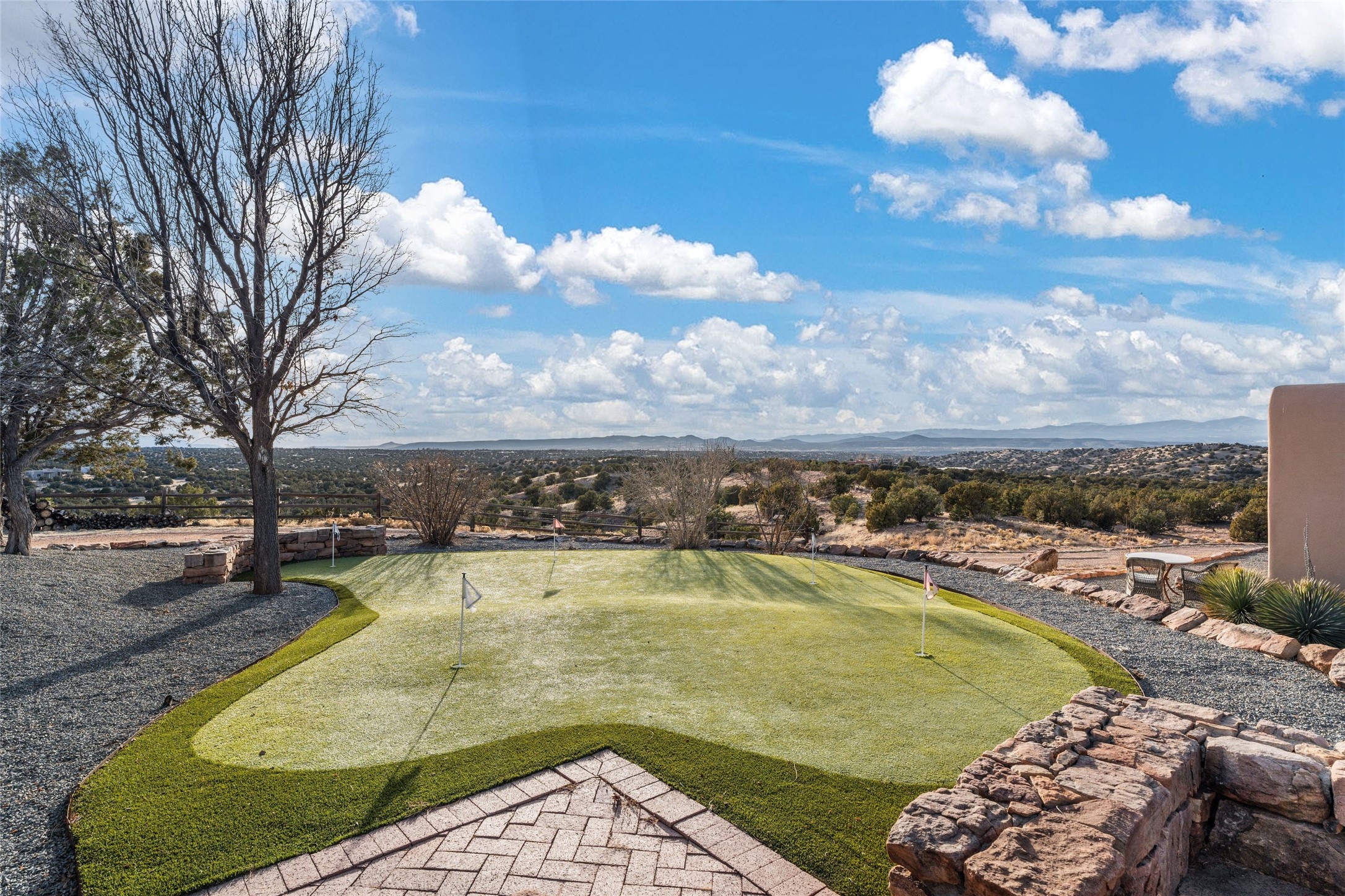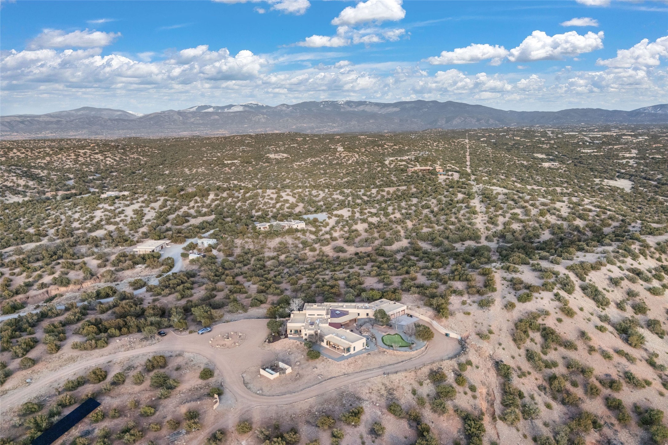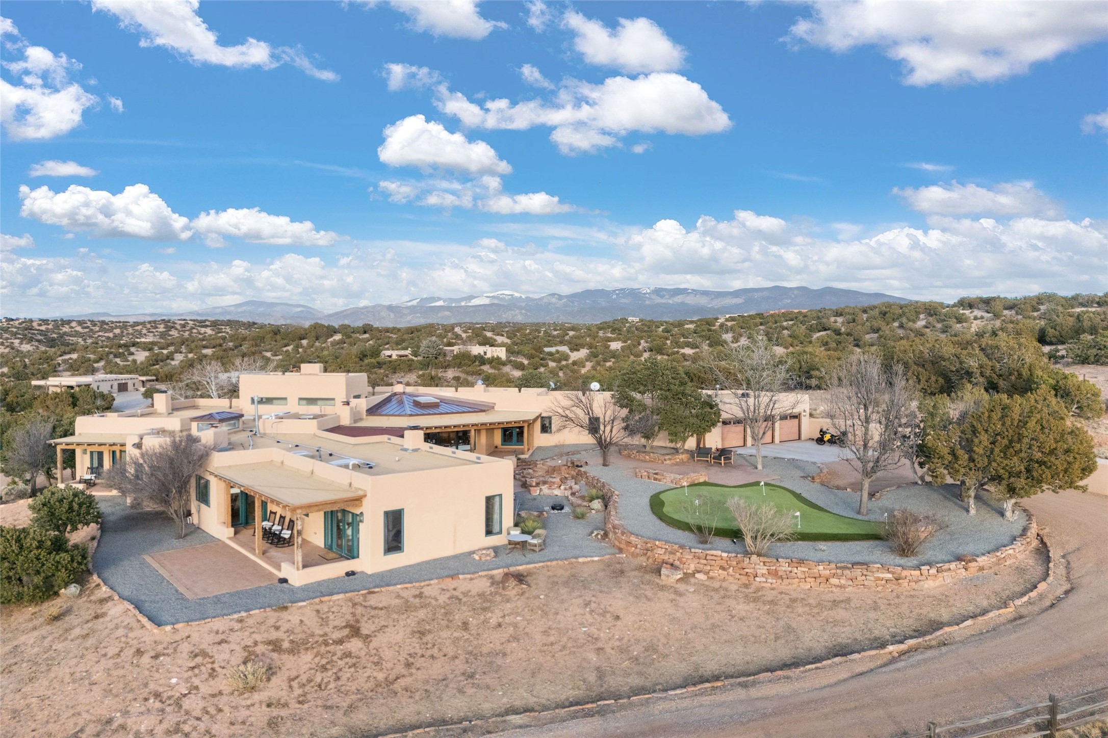 Remarkable 3-bedroom, 4.5-bath luxury retreat set on nearly 12 acres in the desirable La Tierra community. This stunning property offers breathtaking views and a unique 6-hole putting green, making it a golfer's paradise right in your backyard. Diamond plaster walls, vigas and beams, and expansive brick-lined portals add character. Enter through carved wood doors and be greeted by a grand foyer that seamlessly flows into an open-concept living space. Living and dining areas are adorned with soaring 12-ft. ceilings, large-scale windows, and French doors that invite natural light and the beauty of the outdoors into your home. Gourmet kitchen features high-end appliances, a center island with 6-burner cooktop, and a stylish bar area complete with a wine cooler. Retreat to the primary suite, which includes sitting area, fireplace, and a luxurious bath with divided 2 vanities and sinks, 2 water closets, and 2 walk-in closets for ample storage. A versatile studio/media room offers flex space as a 4th bedroom complete with a bathroom with shower. 3-car garage and an extra 10,000-gallon water storage tank. Recent upgrades such as solar photovoltaic electric, 2 new water heaters, window screens, motorized awnings in the living and dining rooms, and all new skylights enhance the home's efficiency. Enjoy awe-inspiring sunset views that will take your breath away, all while being conveniently located just 10-15 minutes from the Santa Fe Plaza, Ten Thousand Waves, and the Santa Fe Opera.