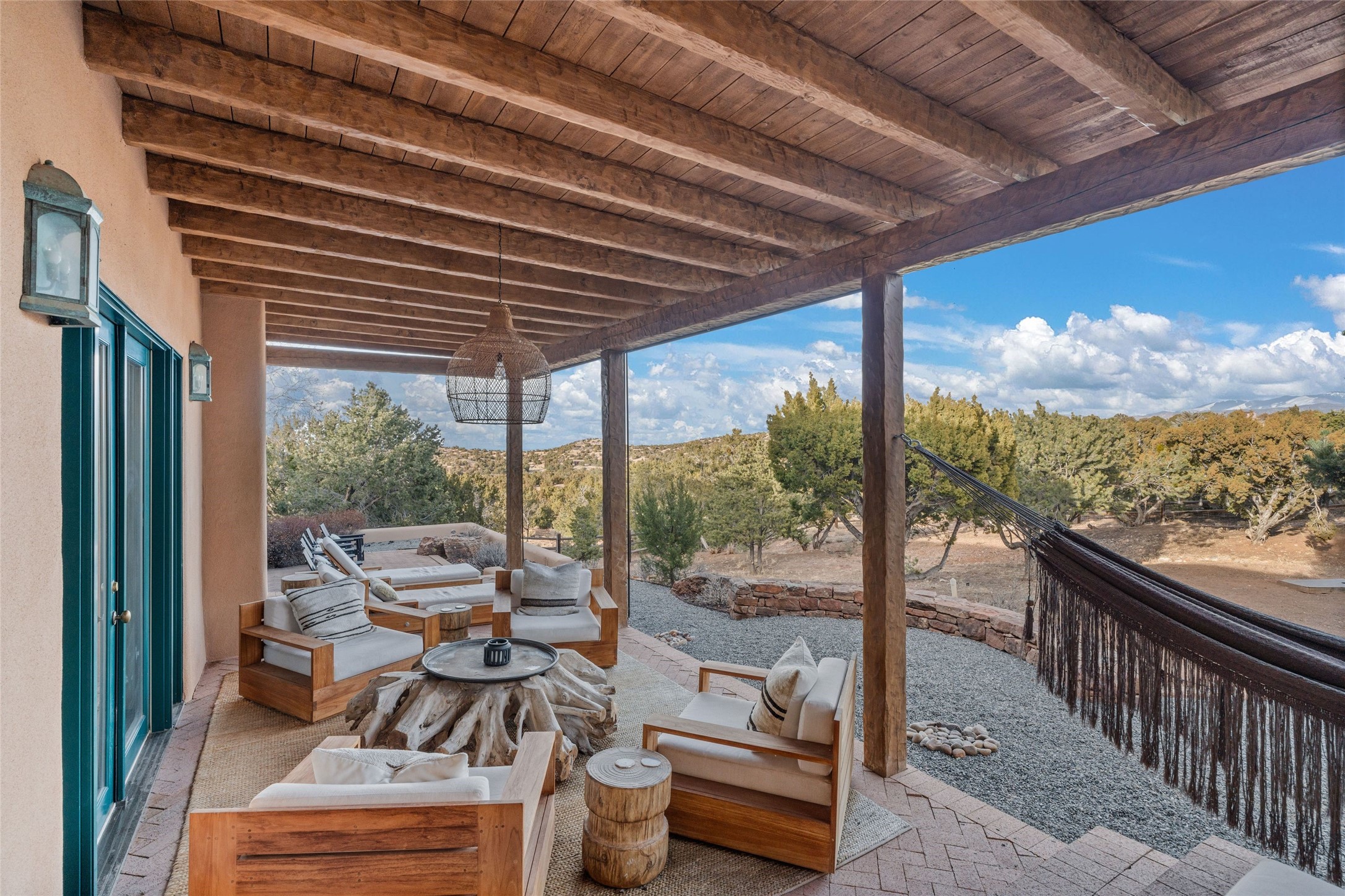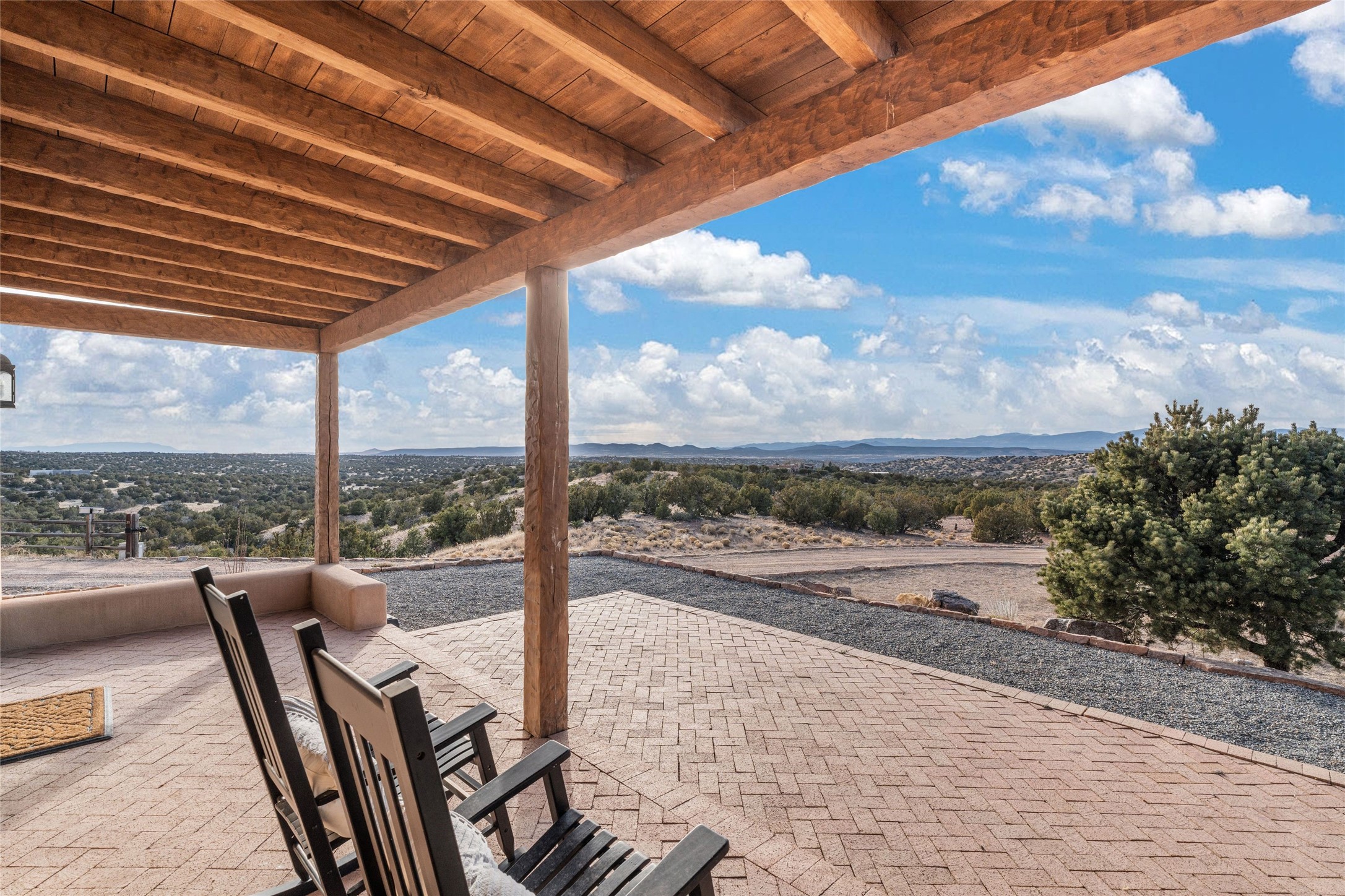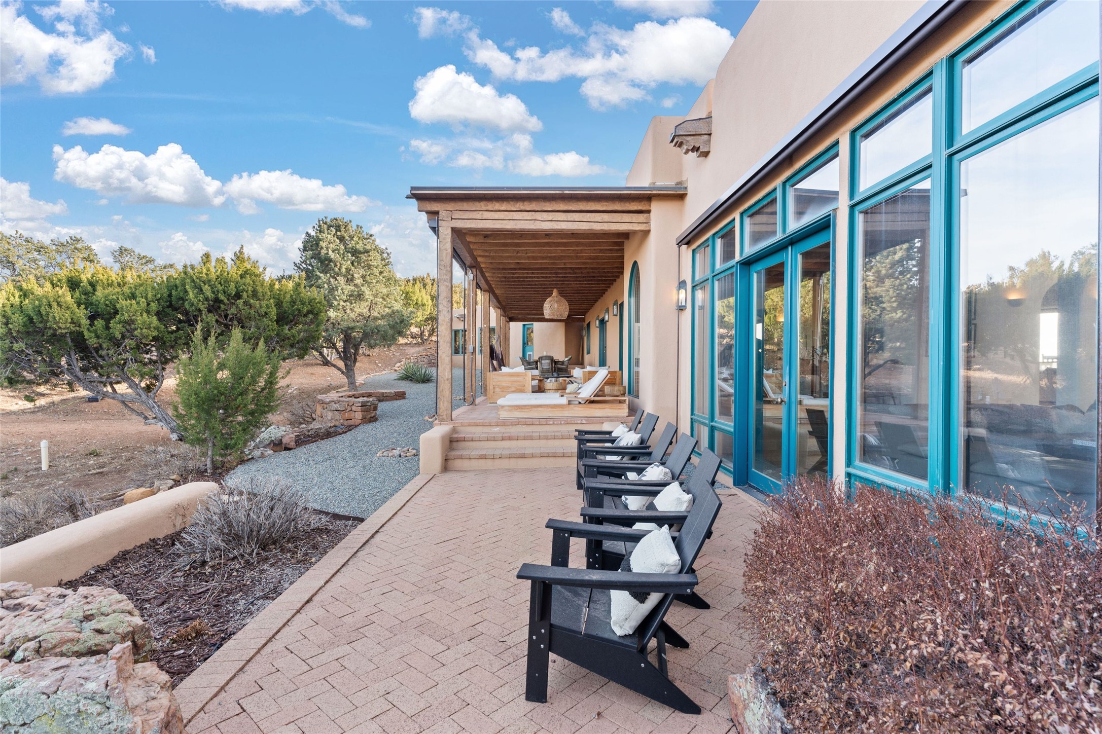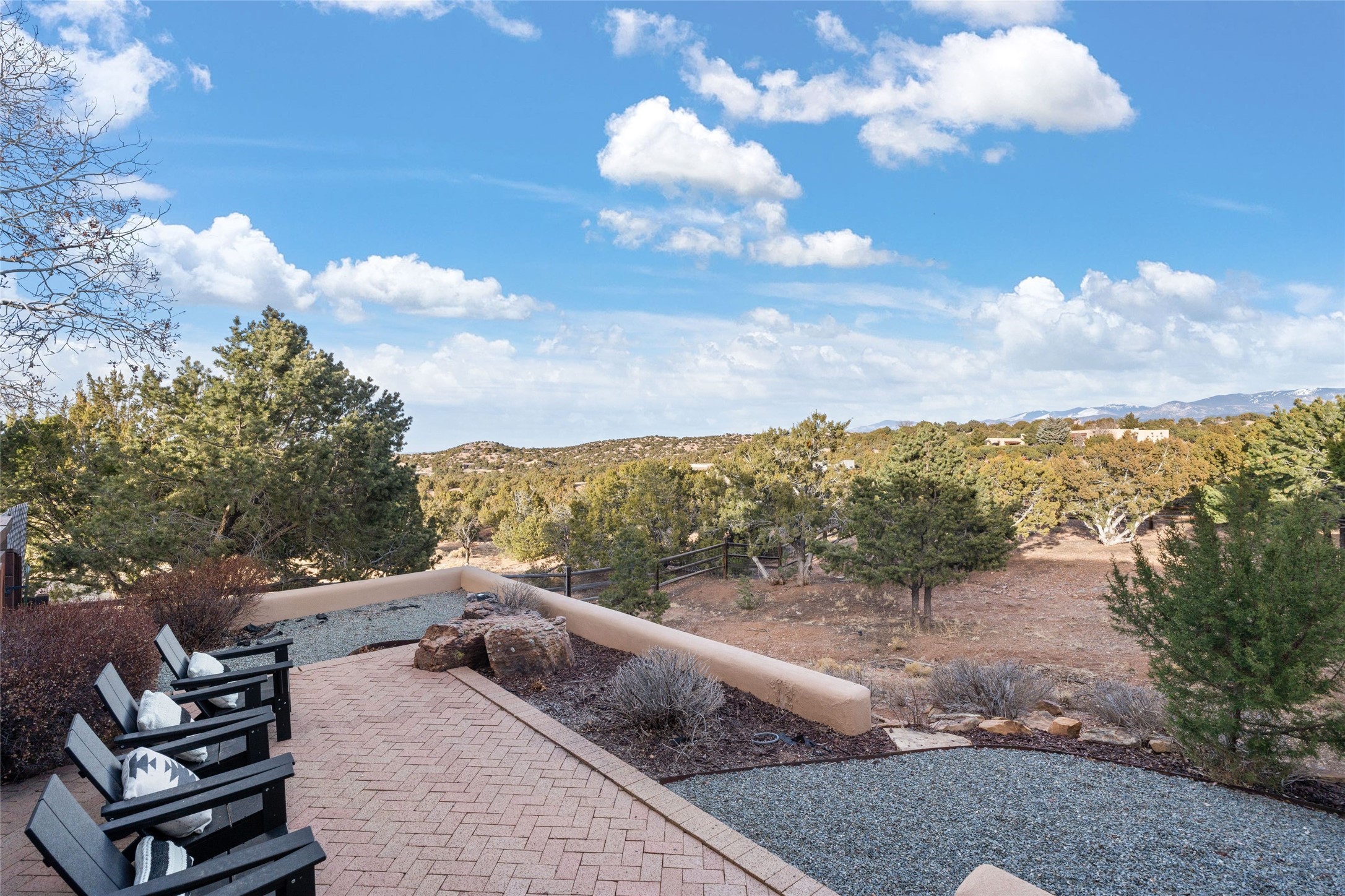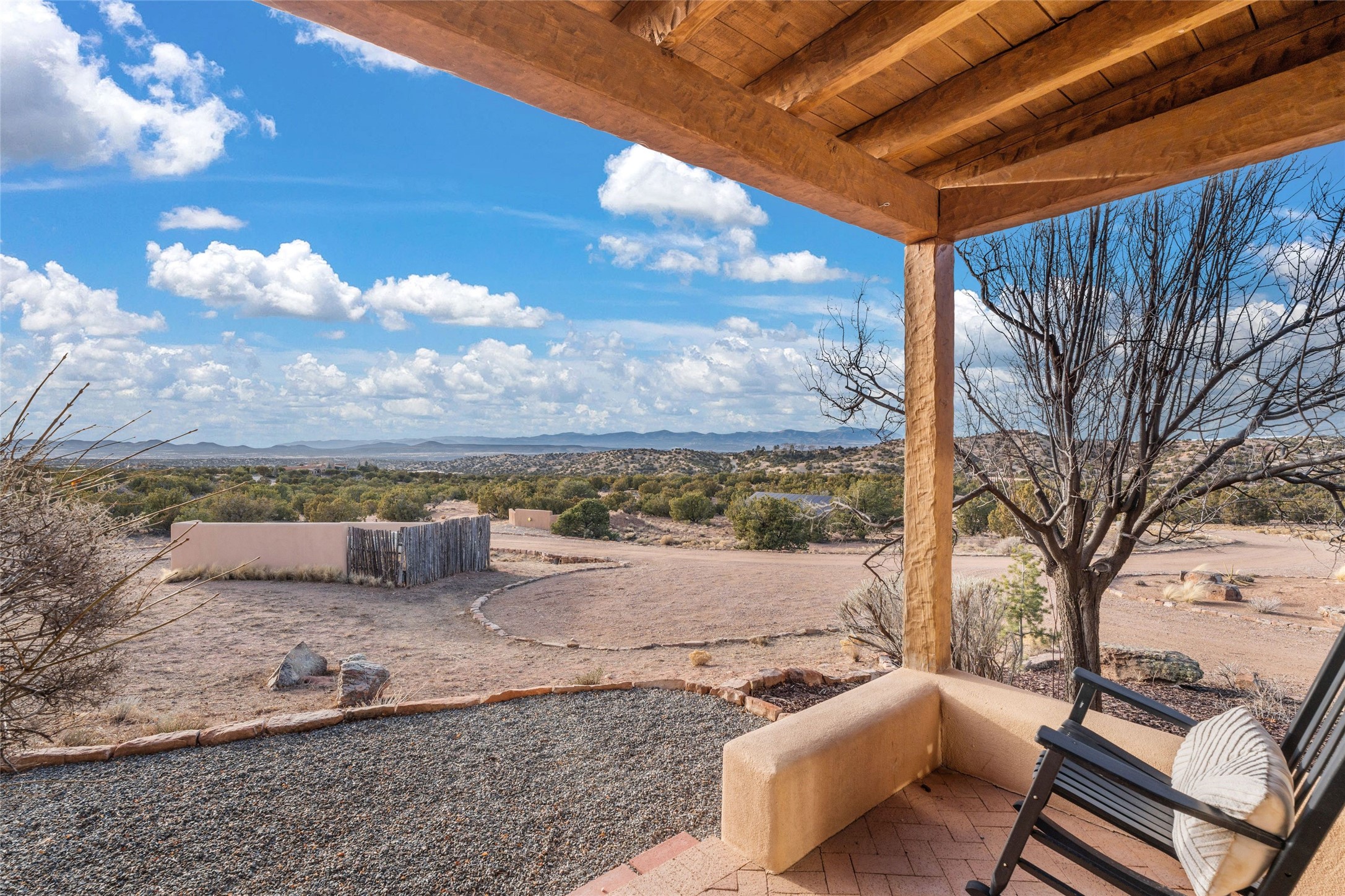 Remarkable 3-bedroom, 4.5-bath luxury retreat set on nearly 12 acres in the desirable La Tierra community. This stunning property offers breathtaking views and a unique 6-hole putting green, making it a golfer's paradise right in your backyard. Diamond plaster walls, vigas and beams, and expansive brick-lined portals add character. Enter through carved wood doors and be greeted by a grand foyer that seamlessly flows into an open-concept living space. Living and dining areas are adorned with soaring 12-ft. ceilings, large-scale windows, and French doors that invite natural light and the beauty of the outdoors into your home. Gourmet kitchen features high-end appliances, a center island with 6-burner cooktop, and a stylish bar area complete with a wine cooler. Retreat to the primary suite, which includes sitting area, fireplace, and a luxurious bath with divided 2 vanities and sinks, 2 water closets, and 2 walk-in closets for ample storage. A versatile studio/media room offers flex space as a 4th bedroom complete with a bathroom with shower. 3-car garage and an extra 10,000-gallon water storage tank. Recent upgrades such as solar photovoltaic electric, 2 new water heaters, window screens, motorized awnings in the living and dining rooms, and all new skylights enhance the home's efficiency. Enjoy awe-inspiring sunset views that will take your breath away, all while being conveniently located just 10-15 minutes from the Santa Fe Plaza, Ten Thousand Waves, and the Santa Fe Opera.