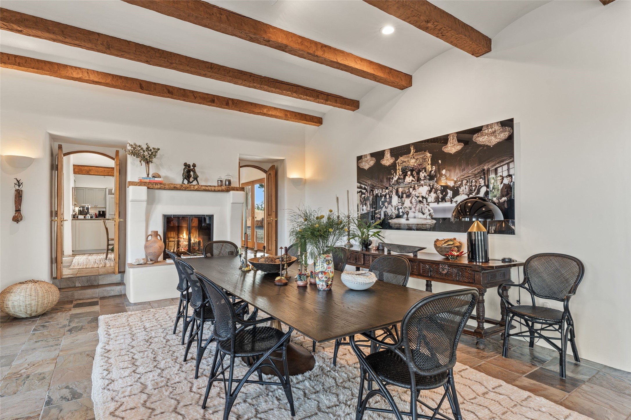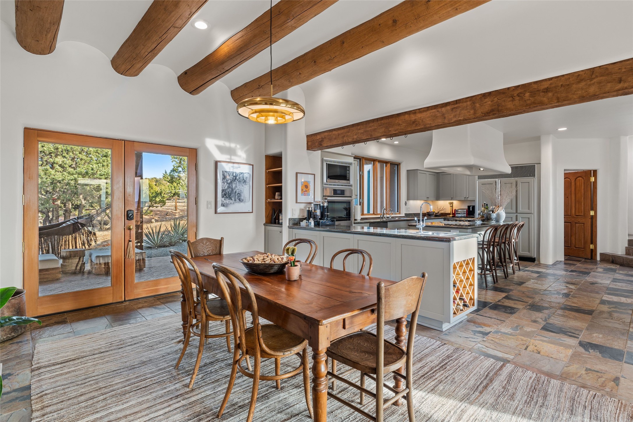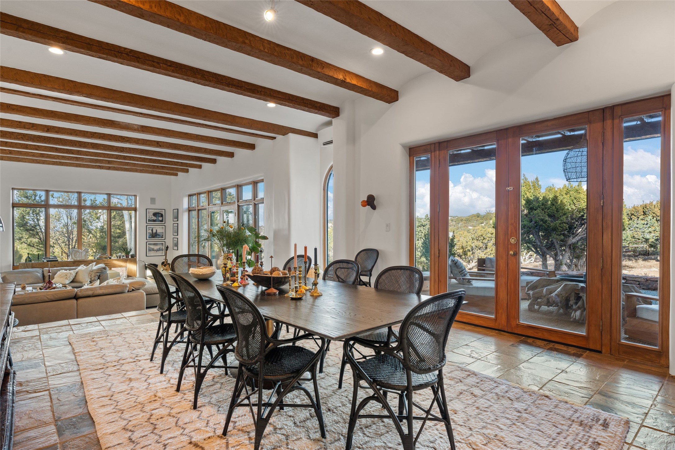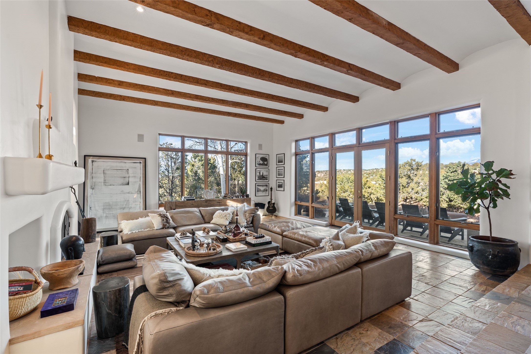 Remarkable 3-bedroom, 4.5-bath luxury retreat set on nearly 12 acres in the desirable La Tierra community. This stunning property offers breathtaking views and a unique 6-hole putting green, making it a golfer's paradise right in your backyard. Diamond plaster walls, vigas and beams, and expansive brick-lined portals add character. Enter through carved wood doors and be greeted by a grand foyer that seamlessly flows into an open-concept living space. Living and dining areas are adorned with soaring 12-ft. ceilings, large-scale windows, and French doors that invite natural light and the beauty of the outdoors into your home. Gourmet kitchen features high-end appliances, a center island with 6-burner cooktop, and a stylish bar area complete with a wine cooler. Retreat to the primary suite, which includes sitting area, fireplace, and a luxurious bath with divided 2 vanities and sinks, 2 water closets, and 2 walk-in closets for ample storage. A versatile studio/media room offers flex space as a 4th bedroom complete with a bathroom with shower. 3-car garage and an extra 10,000-gallon water storage tank. Recent upgrades such as solar photovoltaic electric, 2 new water heaters, window screens, motorized awnings in the living and dining rooms, and all new skylights enhance the home's efficiency. Enjoy awe-inspiring sunset views that will take your breath away, all while being conveniently located just 10-15 minutes from the Santa Fe Plaza, Ten Thousand Waves, and the Santa Fe Opera.