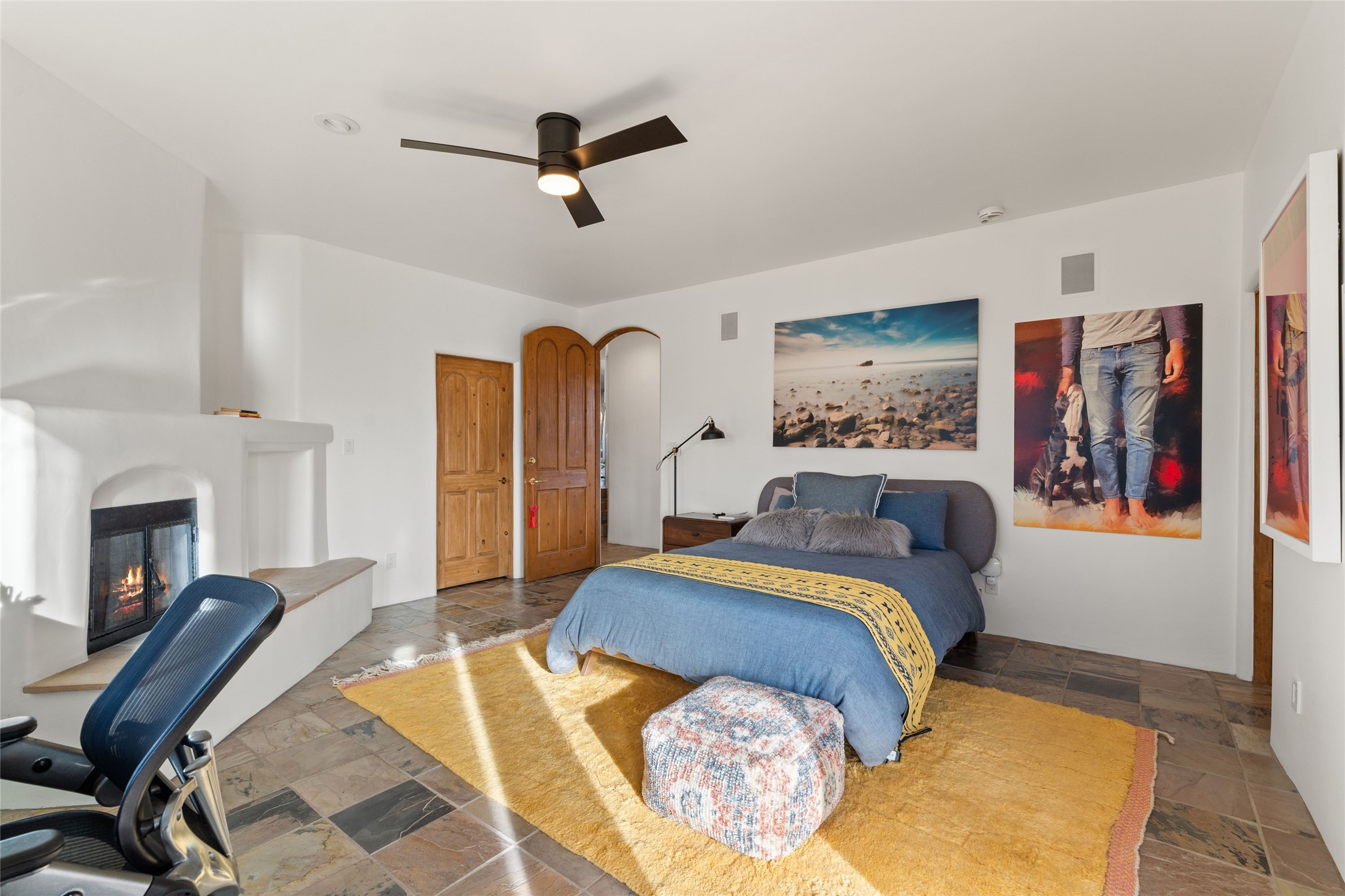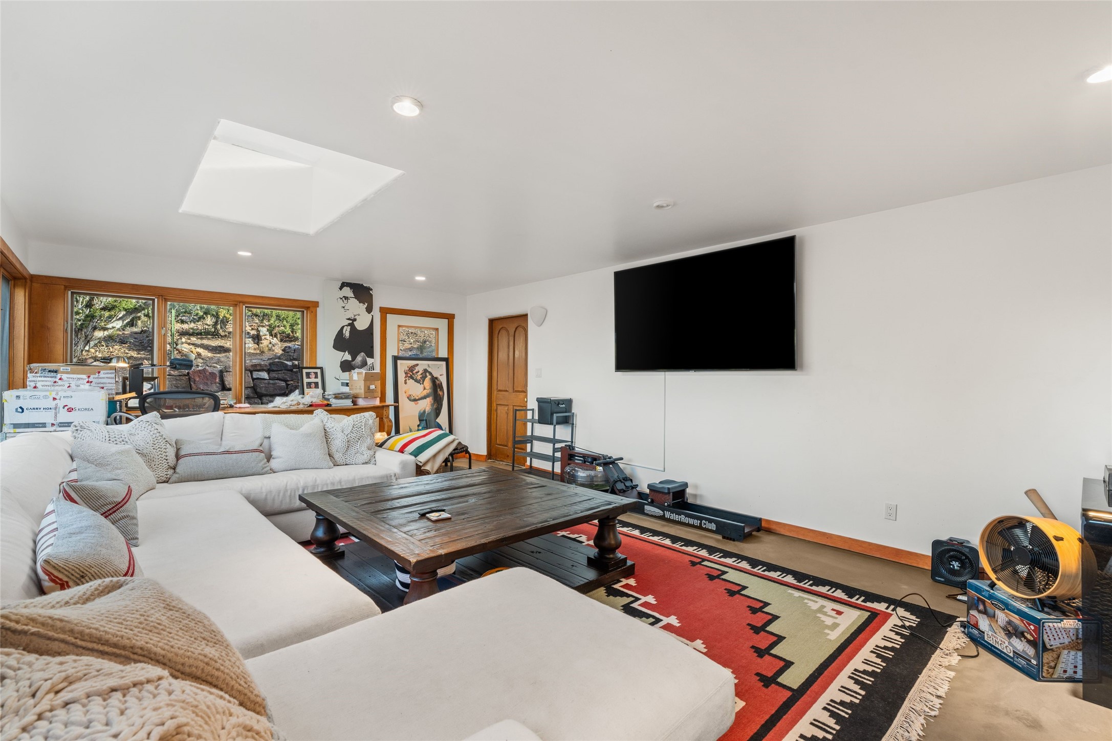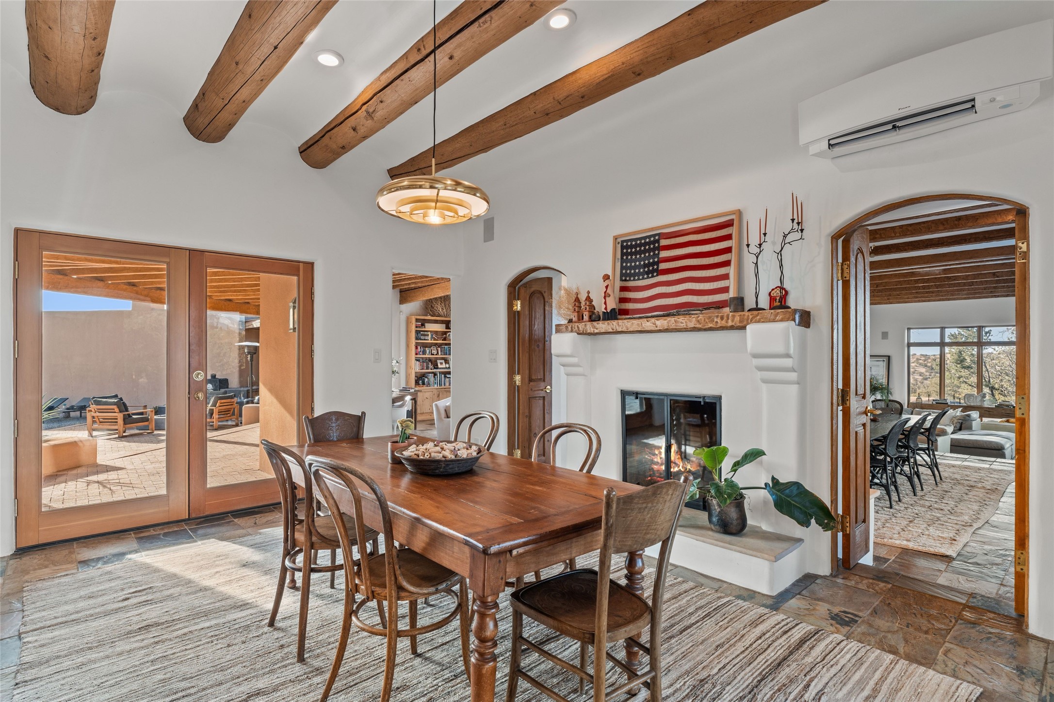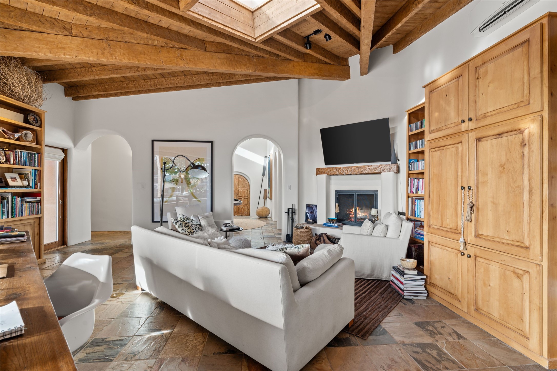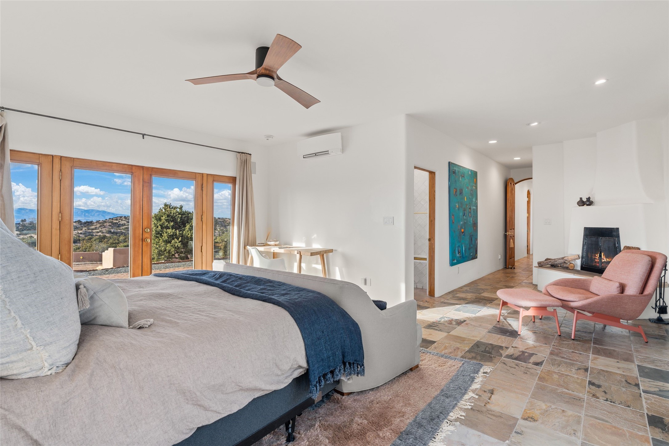 Remarkable 3-bedroom, 4.5-bath luxury retreat set on nearly 12 acres in the desirable La Tierra community. This stunning property offers breathtaking views and a unique 6-hole putting green, making it a golfer's paradise right in your backyard. Diamond plaster walls, vigas and beams, and expansive brick-lined portals add character. Enter through carved wood doors and be greeted by a grand foyer that seamlessly flows into an open-concept living space. Living and dining areas are adorned with soaring 12-ft. ceilings, large-scale windows, and French doors that invite natural light and the beauty of the outdoors into your home. Gourmet kitchen features high-end appliances, a center island with 6-burner cooktop, and a stylish bar area complete with a wine cooler. Retreat to the primary suite, which includes sitting area, fireplace, and a luxurious bath with divided 2 vanities and sinks, 2 water closets, and 2 walk-in closets for ample storage. A versatile studio/media room offers flex space as a 4th bedroom complete with a bathroom with shower. 3-car garage and an extra 10,000-gallon water storage tank. Recent upgrades such as solar photovoltaic electric, 2 new water heaters, window screens, motorized awnings in the living and dining rooms, and all new skylights enhance the home's efficiency. Enjoy awe-inspiring sunset views that will take your breath away, all while being conveniently located just 10-15 minutes from the Santa Fe Plaza, Ten Thousand Waves, and the Santa Fe Opera.