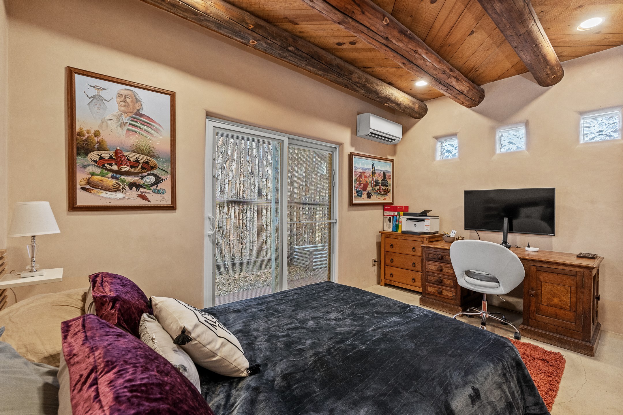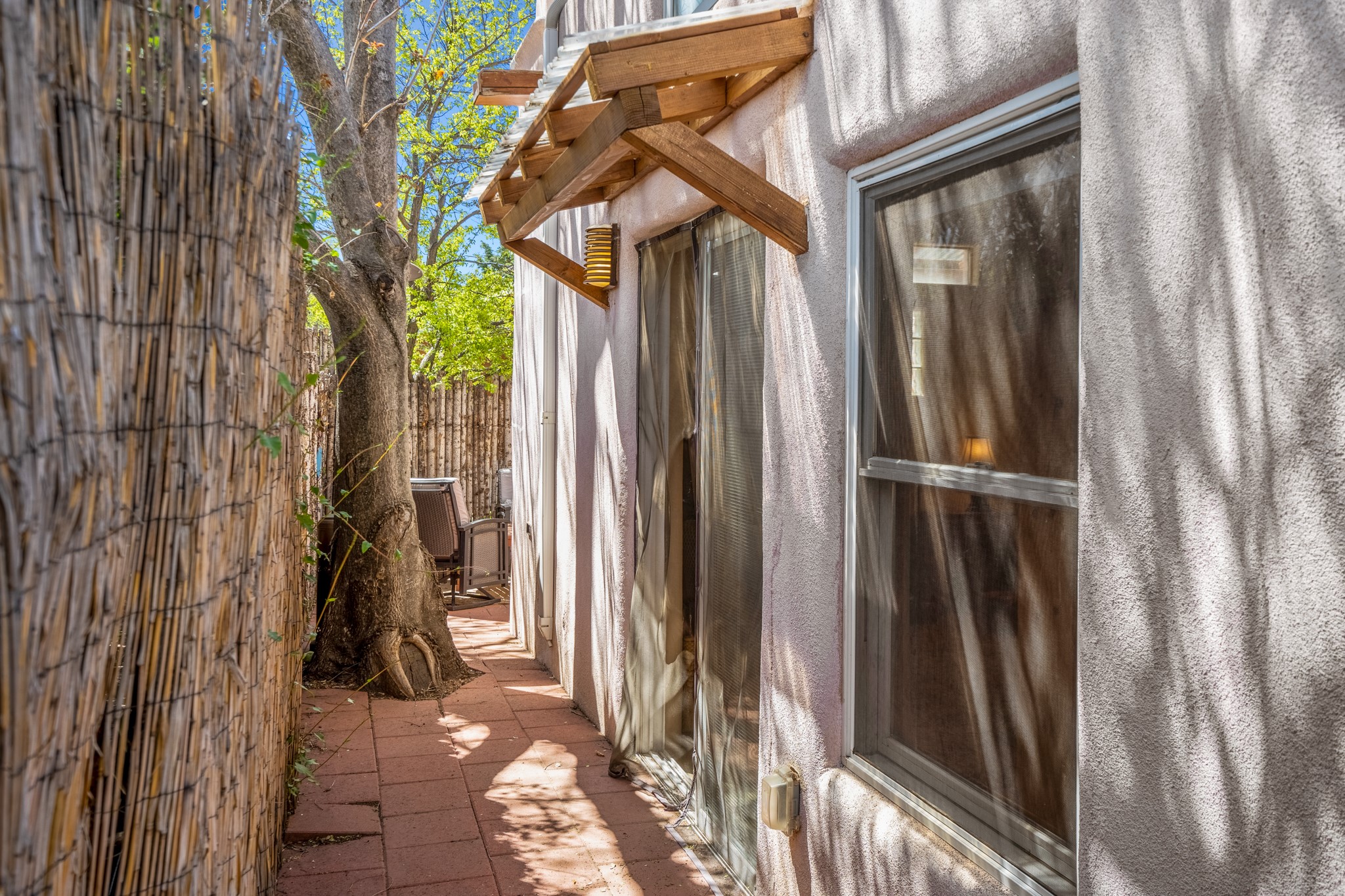 Just minutes from the historic Plaza, this freestanding condo with no shared walls offers the perfect blend of privacy, charm, and location. Situated at 107A Moore, you're ideally positioned near the Casa Solana Shopping Center, the Santa Fe River, and scenic trails that effortlessly lead you downtown. This sweet and sophisticated 1-bedroom residence is rich in authentic Santa Fe character and thoughtful upgrades. The open living space features a cozy kiva fireplace, vigas, tongue-and-groove ceilings, smooth plaster walls, and sleek concrete flooring throughout. The kitchen is appointed with granite countertops and stainless steel appliances, while the spa-like bathroom showcases a striking tiger's eye sink paired with white quartz counter. Comfort is ensured year-round with mini-split heating and cooling, and a washer and dryer convey for added convenience. A compact lofted storage area provides bonus space and is accessed via pull-down stairs through the laundry room. Outside, enjoy your own private courtyard, beautifully enclosed by coyote fencing an ideal setting for outdoor dining, morning coffee, or evening wine under the Santa Fe sky.A rare opportunity to own a private, freestanding condo in a highly desirable and walkable location close to everything Santa Fe has to offer.