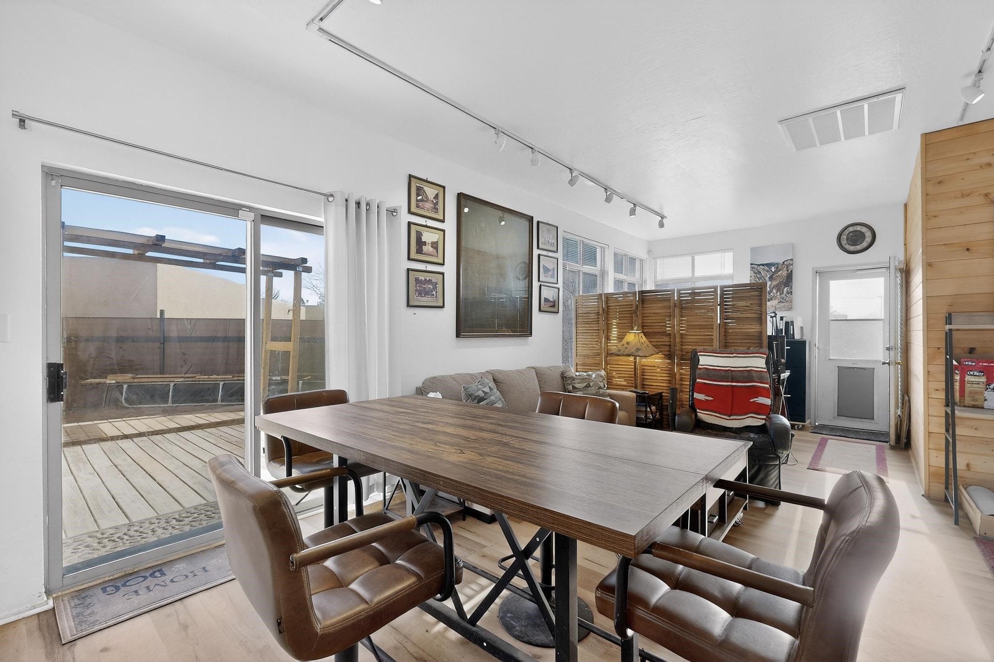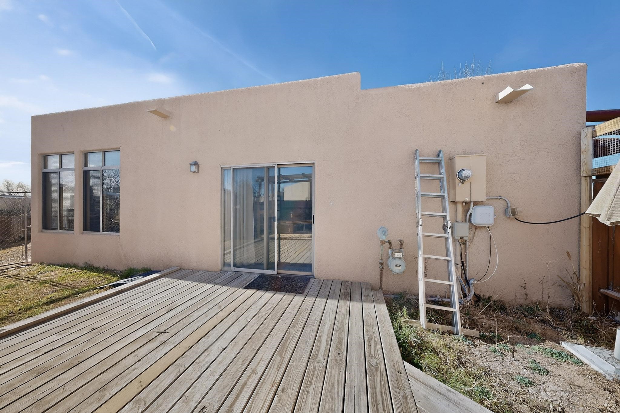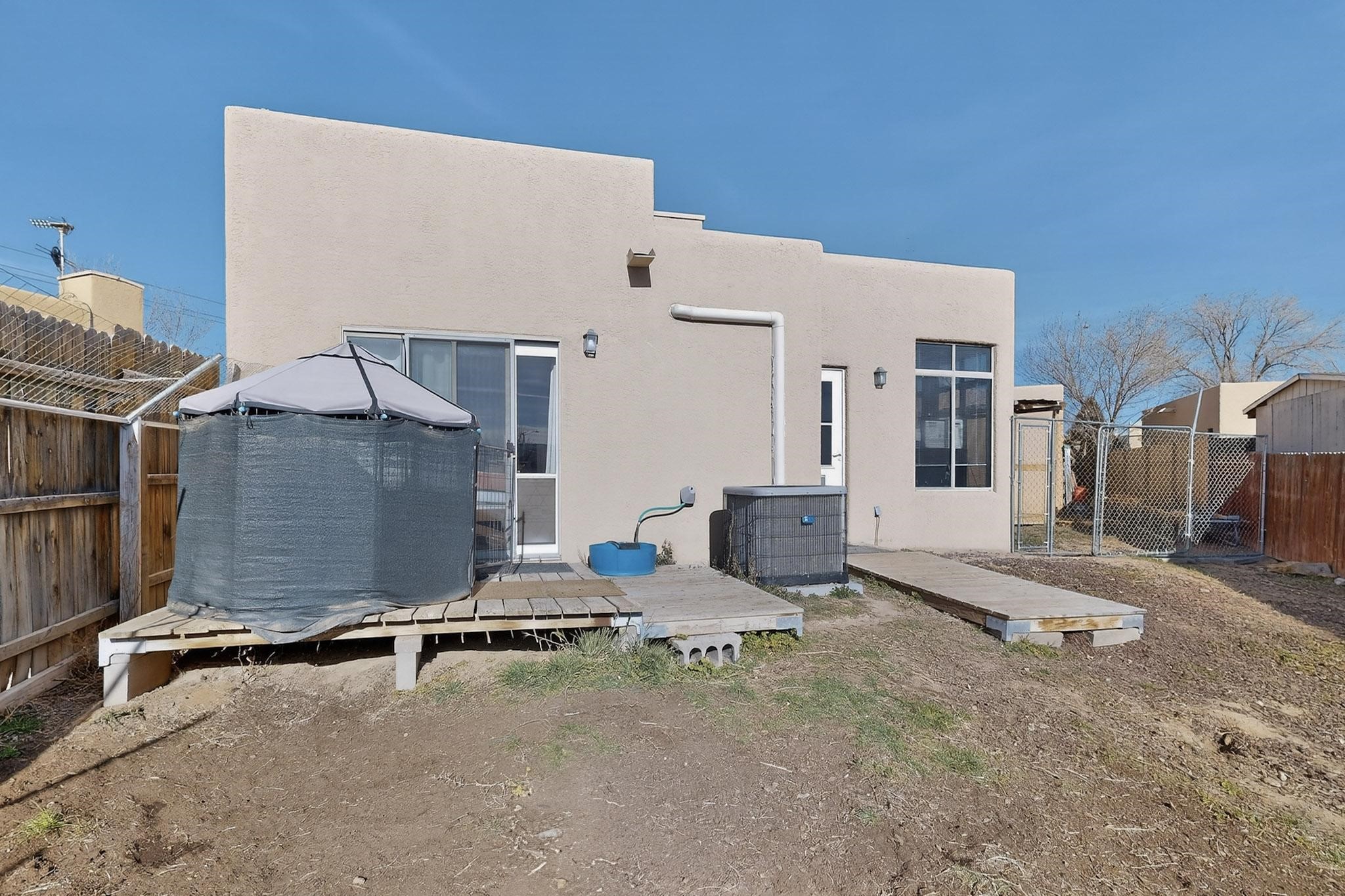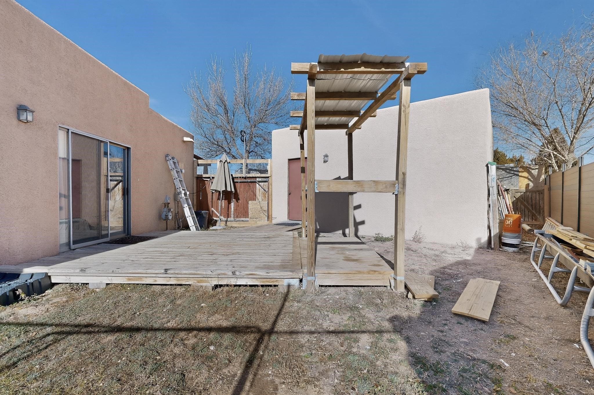 This two bedroom, two bathroom, all one level home with a two car detached garage is the Perfect and Best Value in Santa Fe! The open concept living and dining area is flooded with natural light and has easy to care for flooring. The dining area offers patio access to the east yard and a custom trellis awaiting a porch swing. Quick access to a separated backyard allows for pets to enjoy their own space. Lots of great outdoor areas awaiting your ideas. The primary suite has a custom closet with a sliding barn door, private access to the backyard with a deck and a primary bathroom with a sliding barn door as well, to allow for maximum use of the space. Bedroom #2 sits at the entry of the home with a cul-de-sac view and access to the guest's full bathroom. The stackable washer and dryer save space and are tucked away from view. Lots of great perks, including the refrigerated A/C that was added and the storage shed in the backyard that will convey. The Seller is offering a $3,000 credit towards a carpet allowance and a $2,000 paint allowance with a reasonable and accepted offer.