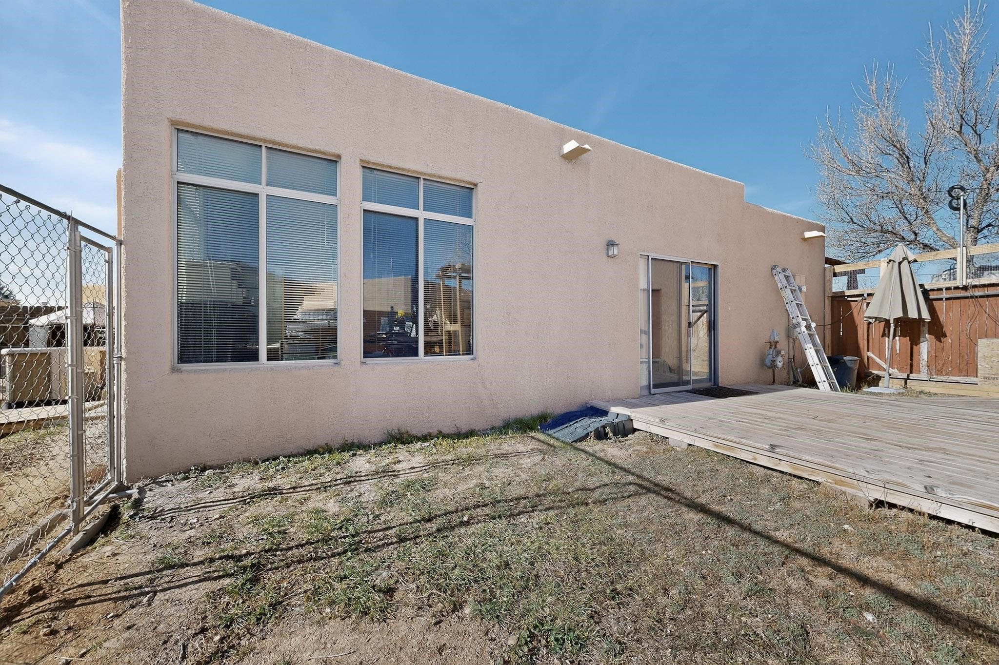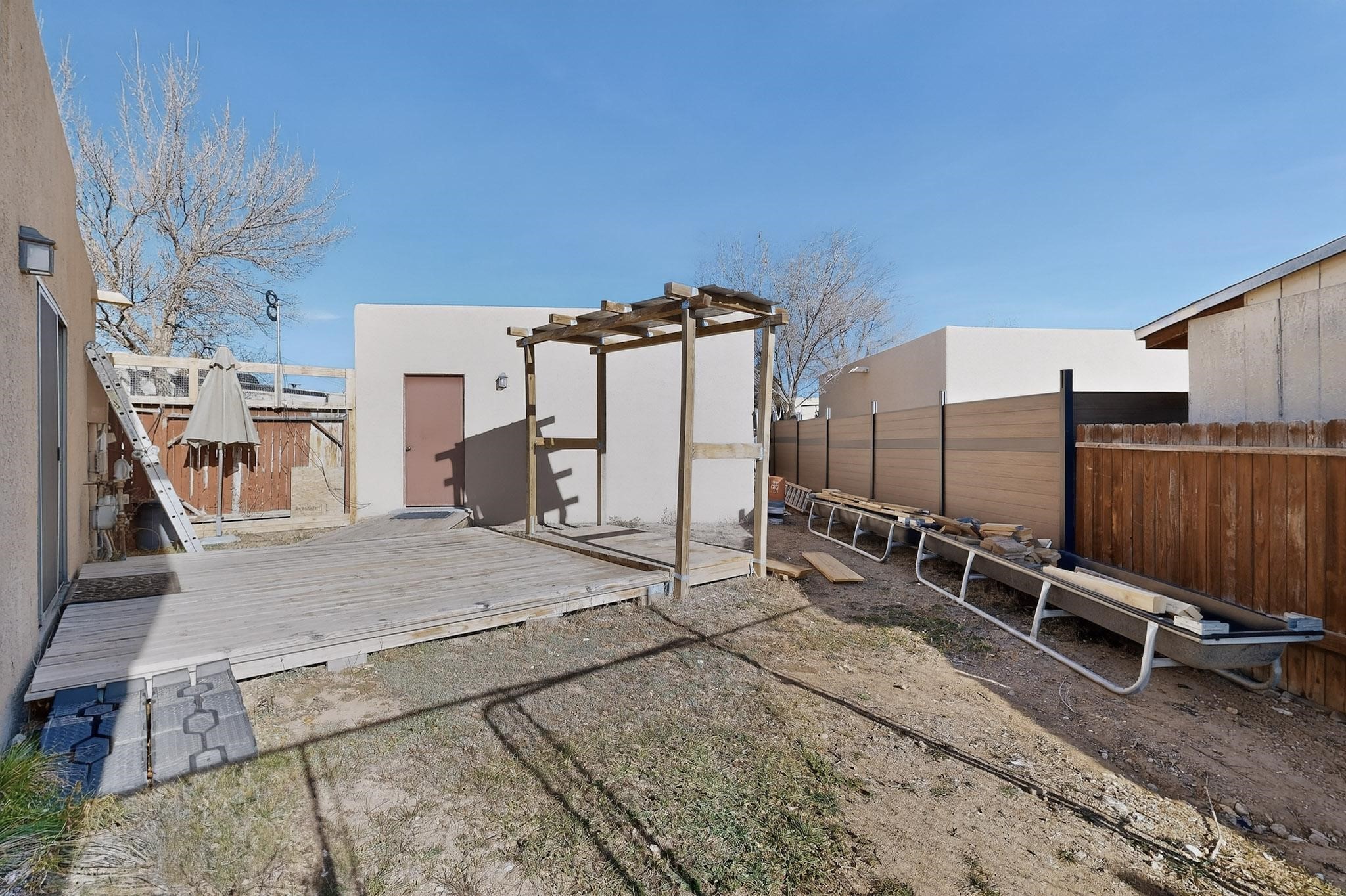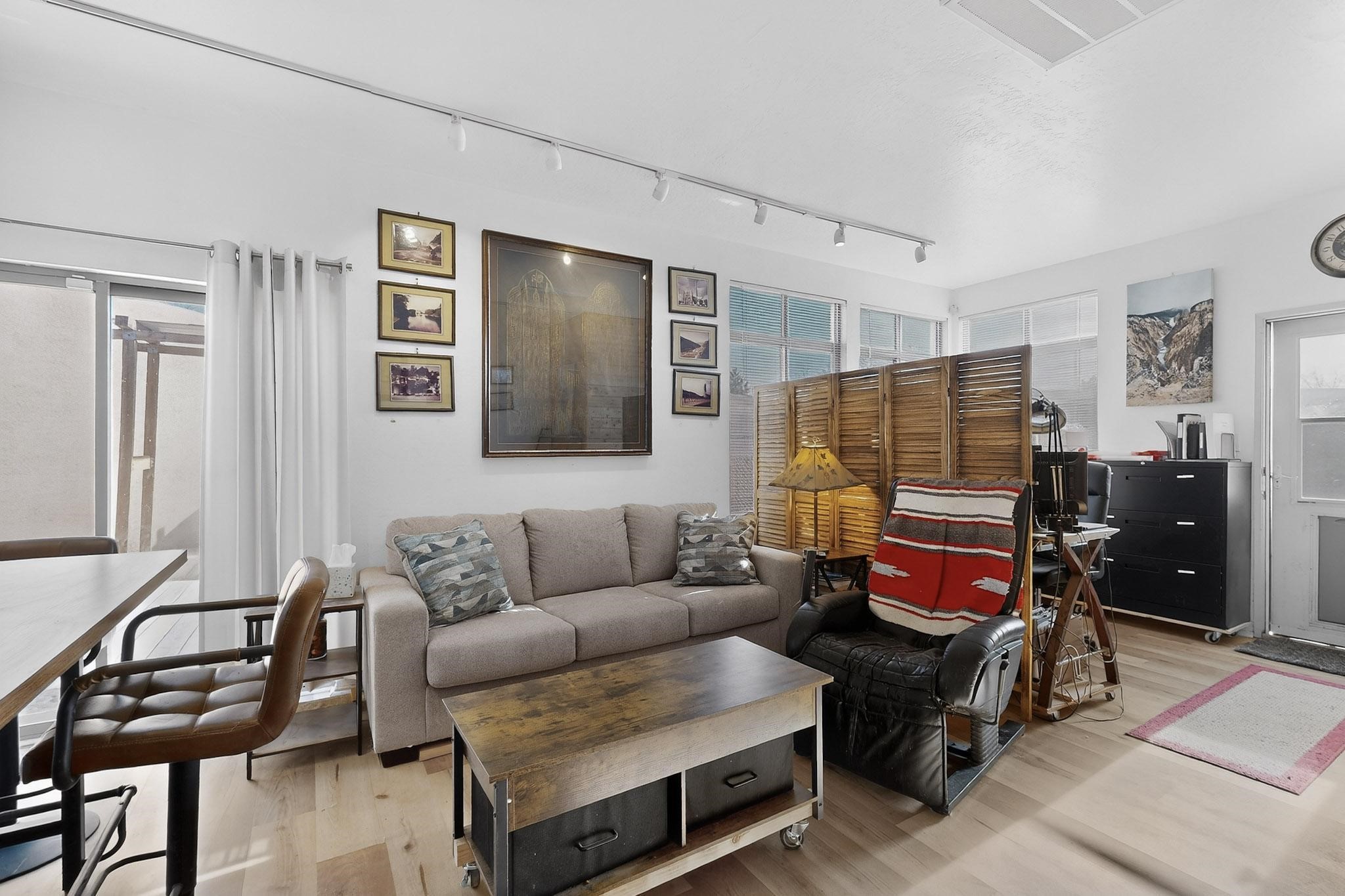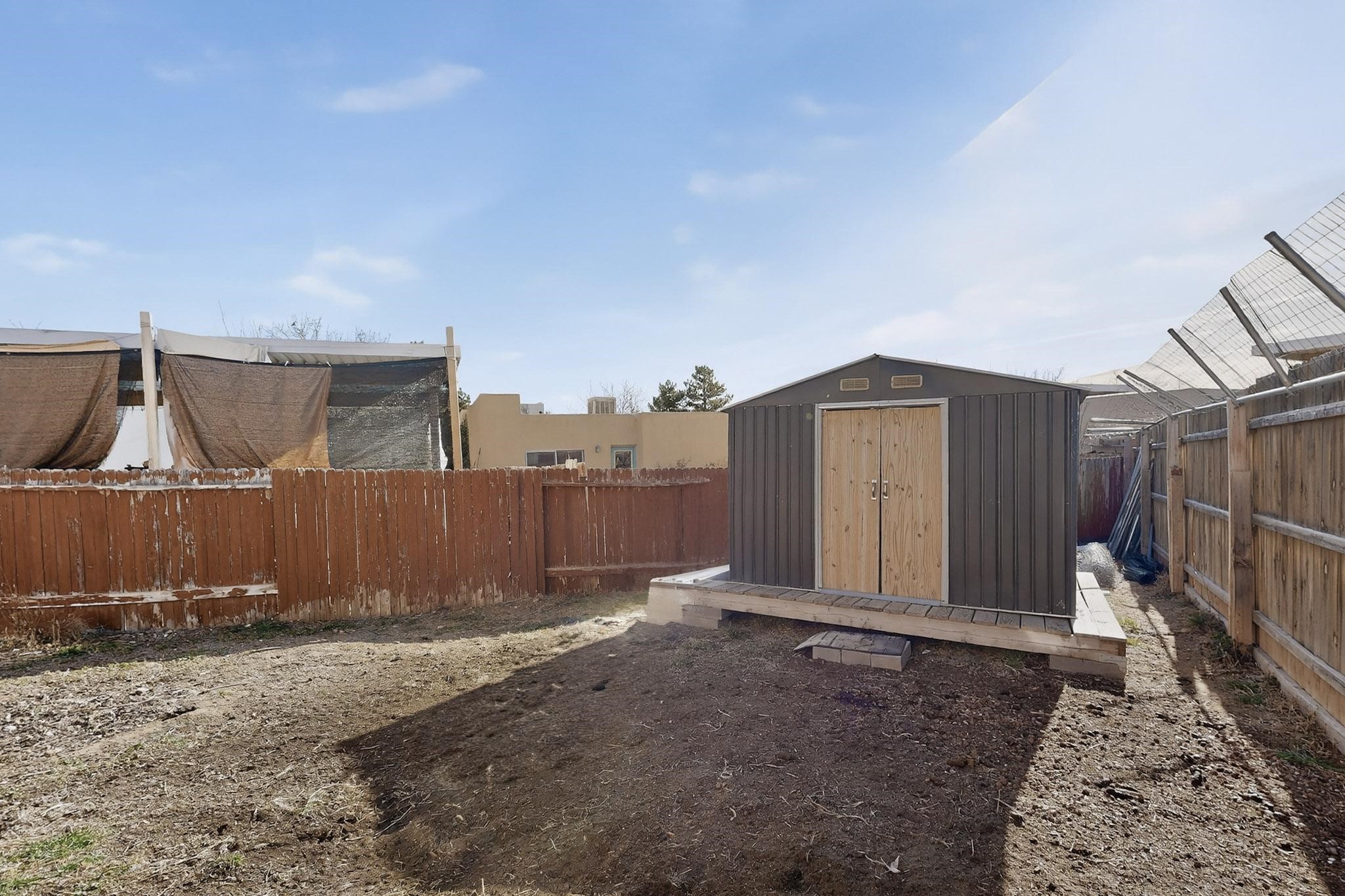 This two bedroom, two bathroom, all one level home with a two car detached garage is the Perfect and Best Value in Santa Fe! The open concept living and dining area is flooded with natural light and has easy to care for flooring. The dining area offers patio access to the east yard and a custom trellis awaiting a porch swing. Quick access to a separated backyard allows for pets to enjoy their own space. Lots of great outdoor areas awaiting your ideas. The primary suite has a custom closet with a sliding barn door, private access to the backyard with a deck and a primary bathroom with a sliding barn door as well, to allow for maximum use of the space. Bedroom #2 sits at the entry of the home with a cul-de-sac view and access to the guest's full bathroom. The stackable washer and dryer save space and are tucked away from view. Lots of great perks, including the refrigerated A/C that was added and the storage shed in the backyard that will convey. The Seller is offering a $3,000 credit towards a carpet allowance and a $2,000 paint allowance with a reasonable and accepted offer.