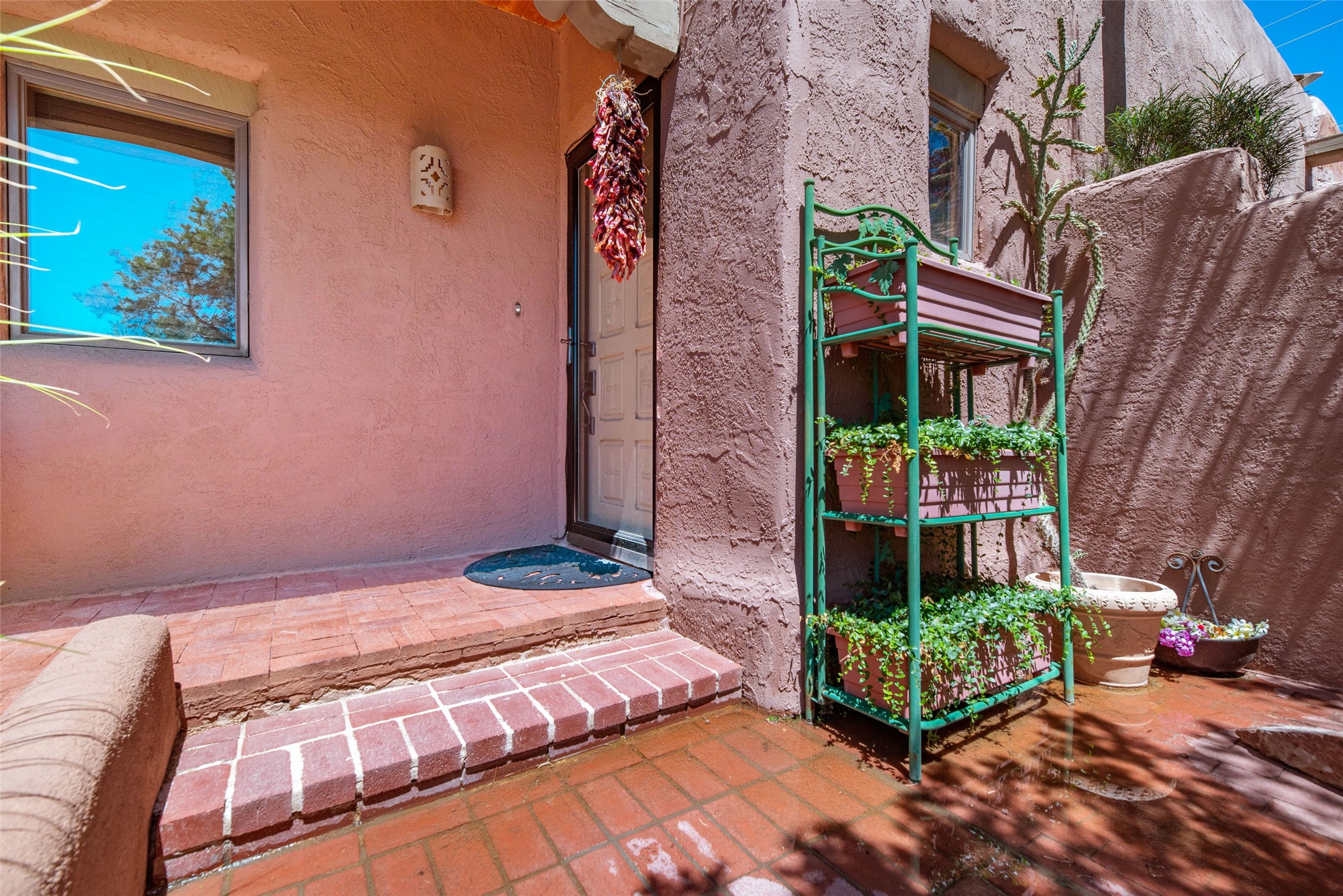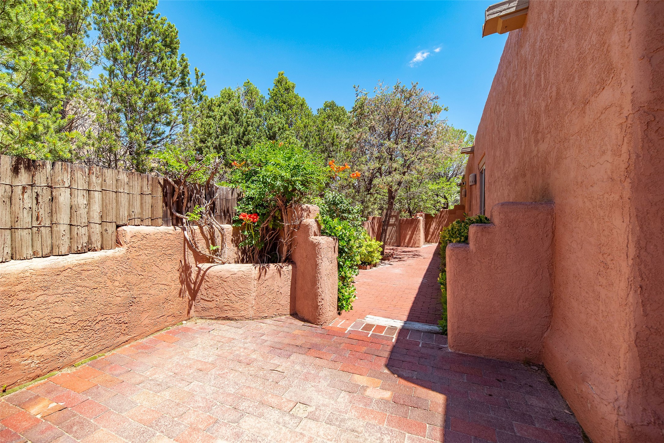 This home is in the prestigious Las Barrancas neighborhood on a property that is tree covered affording complete privacy to 3 walled courtyards, 3 steps up is a fourth ready to accommodate a large hot tub. This is one of the last modern homes constructed with authentic New Mexican materials - kivas, vigas,latillas, and saltillo tile floors. The 2-car garage is 1 1/2 stories with plenty of storage for an extra freezer and refrigerator. Entertaining is smooth and relaxing with the kitchen bar open to living & dining rooms. The 3 bedrooms, 2 baths, and laundry room -spacious & lovely! (No Interior Steps) It has Refrigerated A/C and forced air heat. Immerse yourself & your guests in the culture & vibe of the city of Santa Fe while living in a peaceful country setting. New stucco and roof maintenance. Easy access to downtown, Ten Thousand Waves, Hyde Park hiking/biking, and Ski Santa Fe!