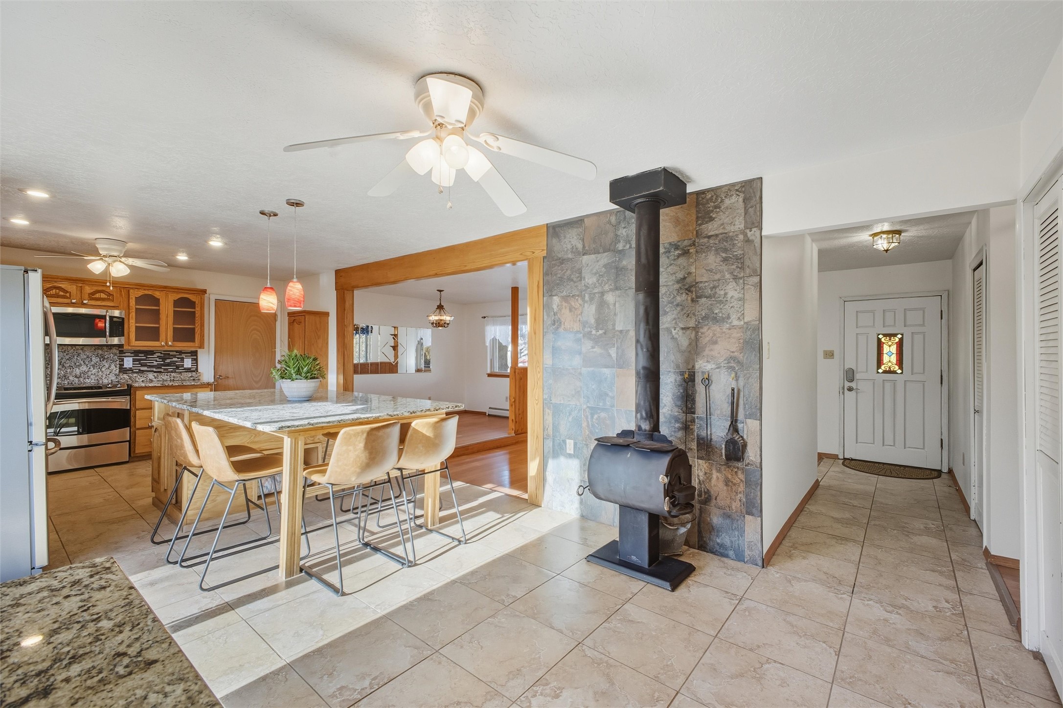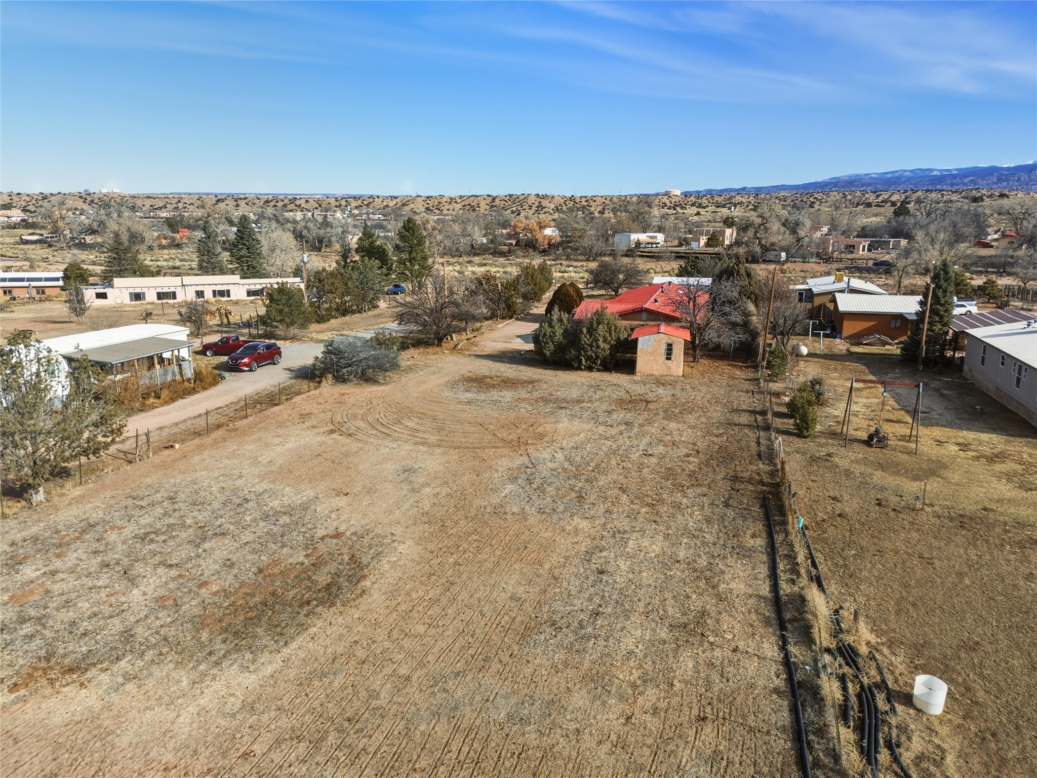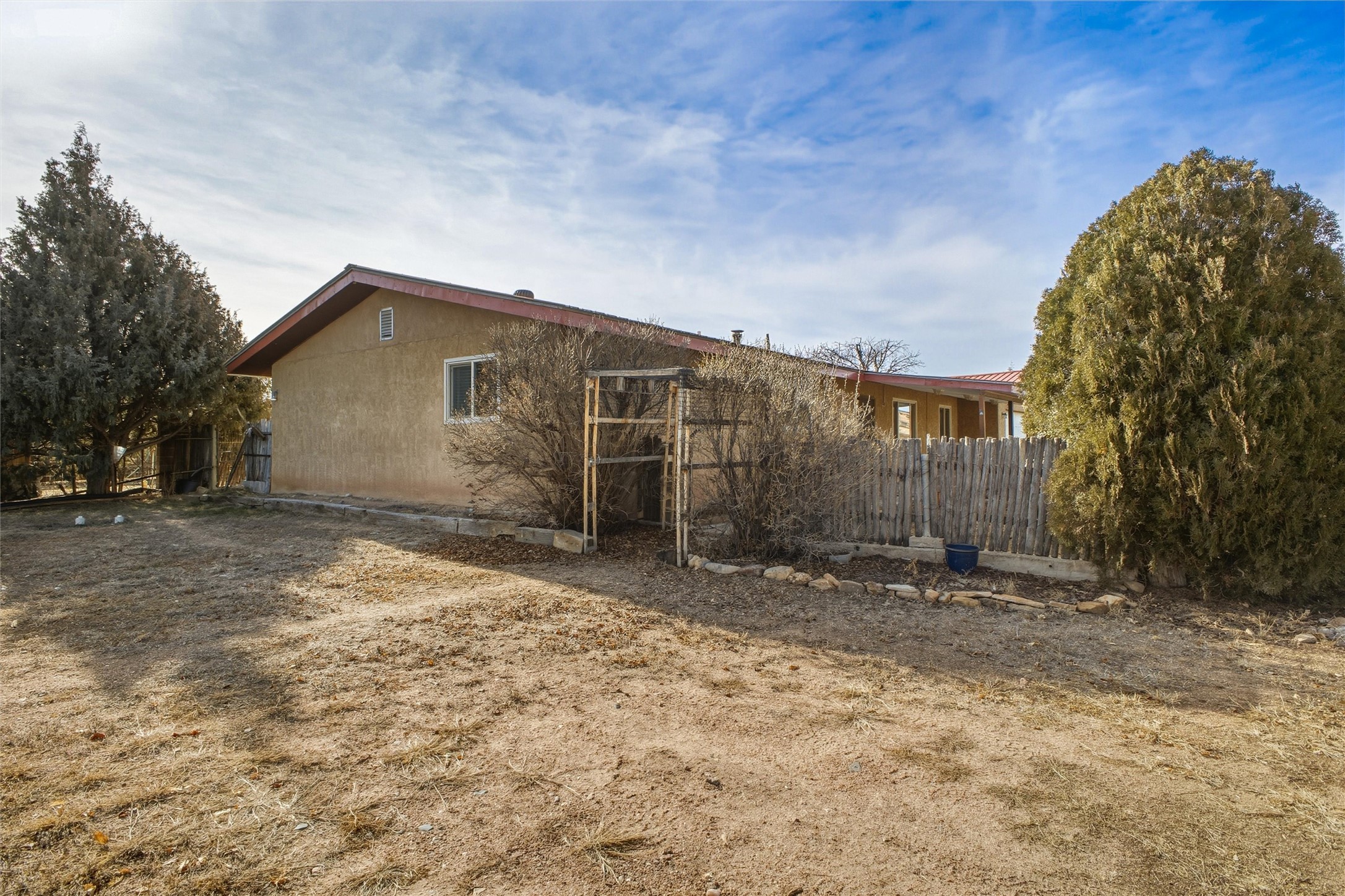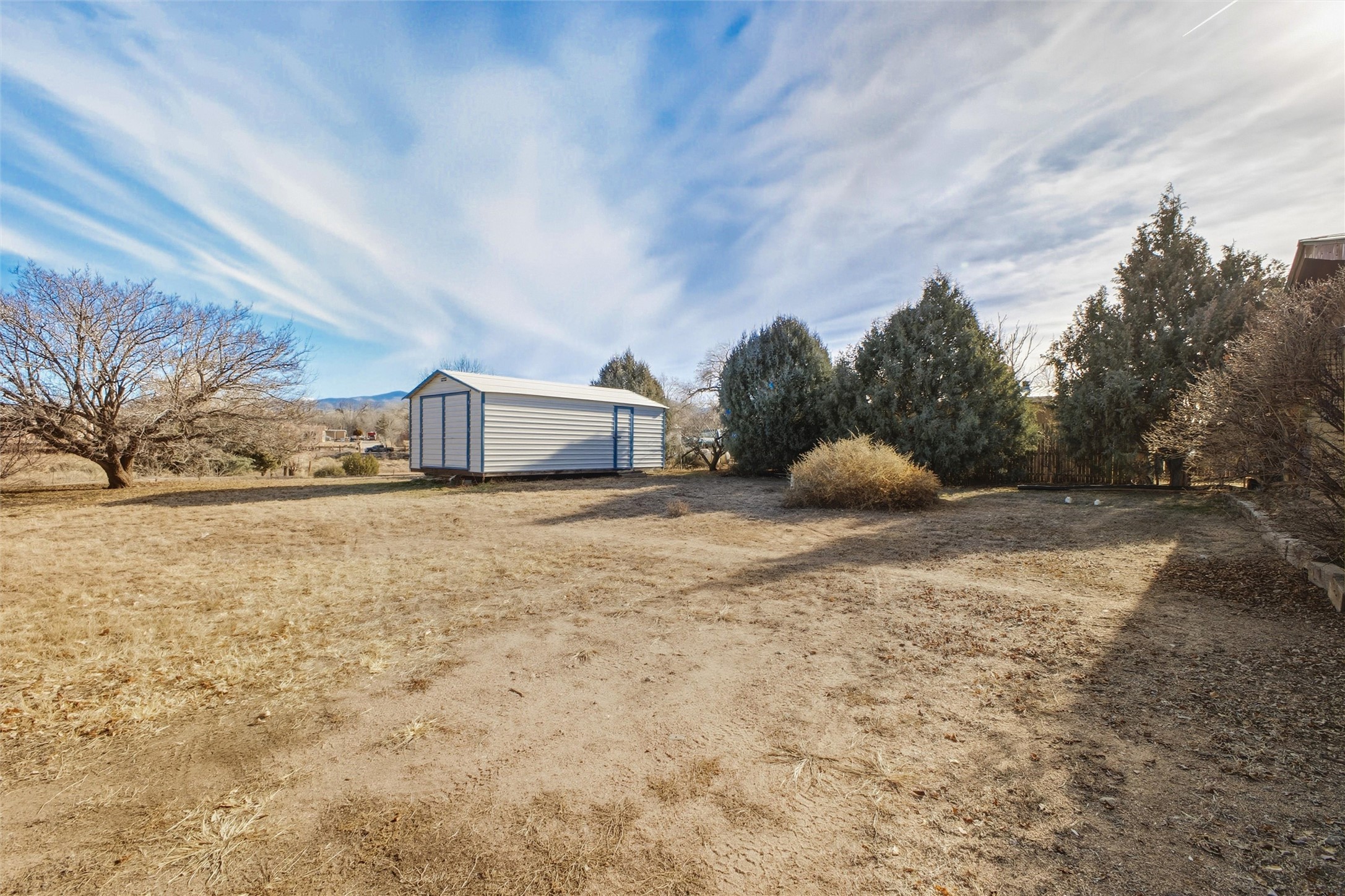 Nestled on over an acre of land with breathtaking mountain views, this updated and well-maintained home offers the perfect blend of modern convenience and rustic charm. From its spacious, light-filled interiors to its serene outdoor setting, this property provides the ideal environment for both relaxation and creativity. With a short commute to Los Alamos and Santa Fe, you can enjoy the peace and privacy of rural living without sacrificing convenience. The heart of the home is the expansive, modern kitchen. Featuring luxurious granite countertops, a large central island with extra storage, and stainless steel appliances, this kitchen is designed for both function and style. Whether you're preparing meals for the family or hosting friends, the layout is perfect for food prep and entertaining, with ample room to gather around the island. A charming wood burning stove located in the kitchen adds warmth and ambiance, creating a cozy focal point for winter mornings and evenings spent cooking and connecting. The kitchen flows seamlessly into the main living areas, offering an open and comfortable layout. The property offers an incredible amount of space for gardening, hobbies, or projects. Mature fruit trees add charm and productivity to the landscape, while the insulated shed provides excellent space for storage or can easily be used as a workshop. The home features an updated bathroom with modern fixtures and stylish finishes, offering both comfort and functionality. This is a rare opportunity to own a well-cared-for home with space to grow, stunning views, and easy access to nearby communities. A perfect balance of comfort, functionality, and location.