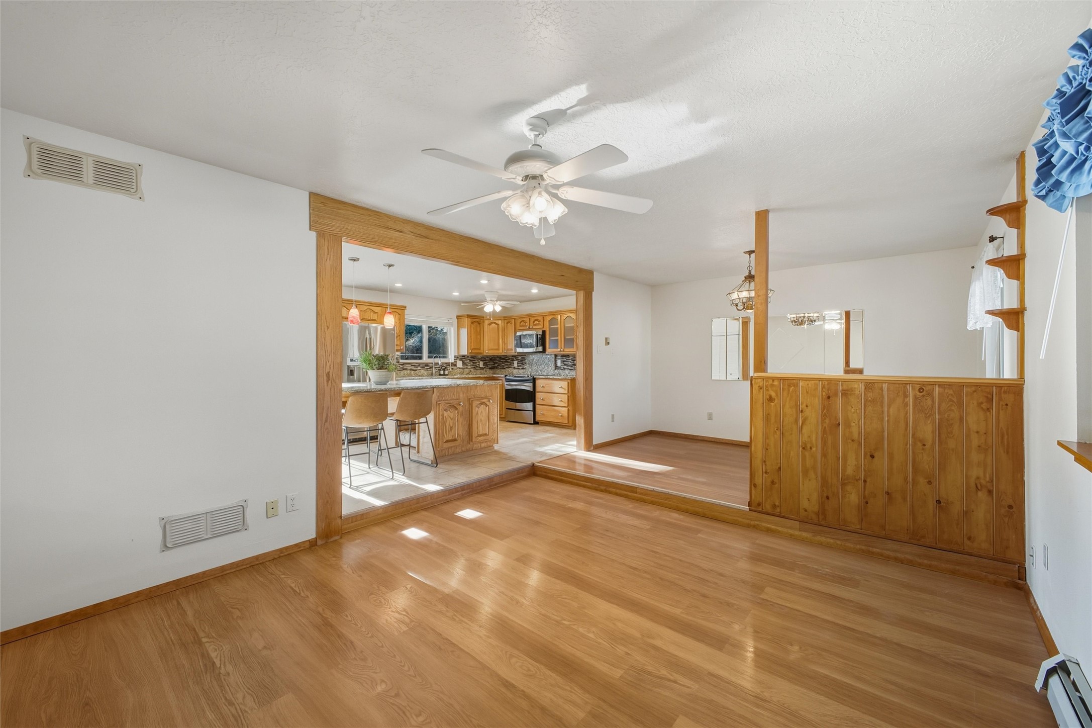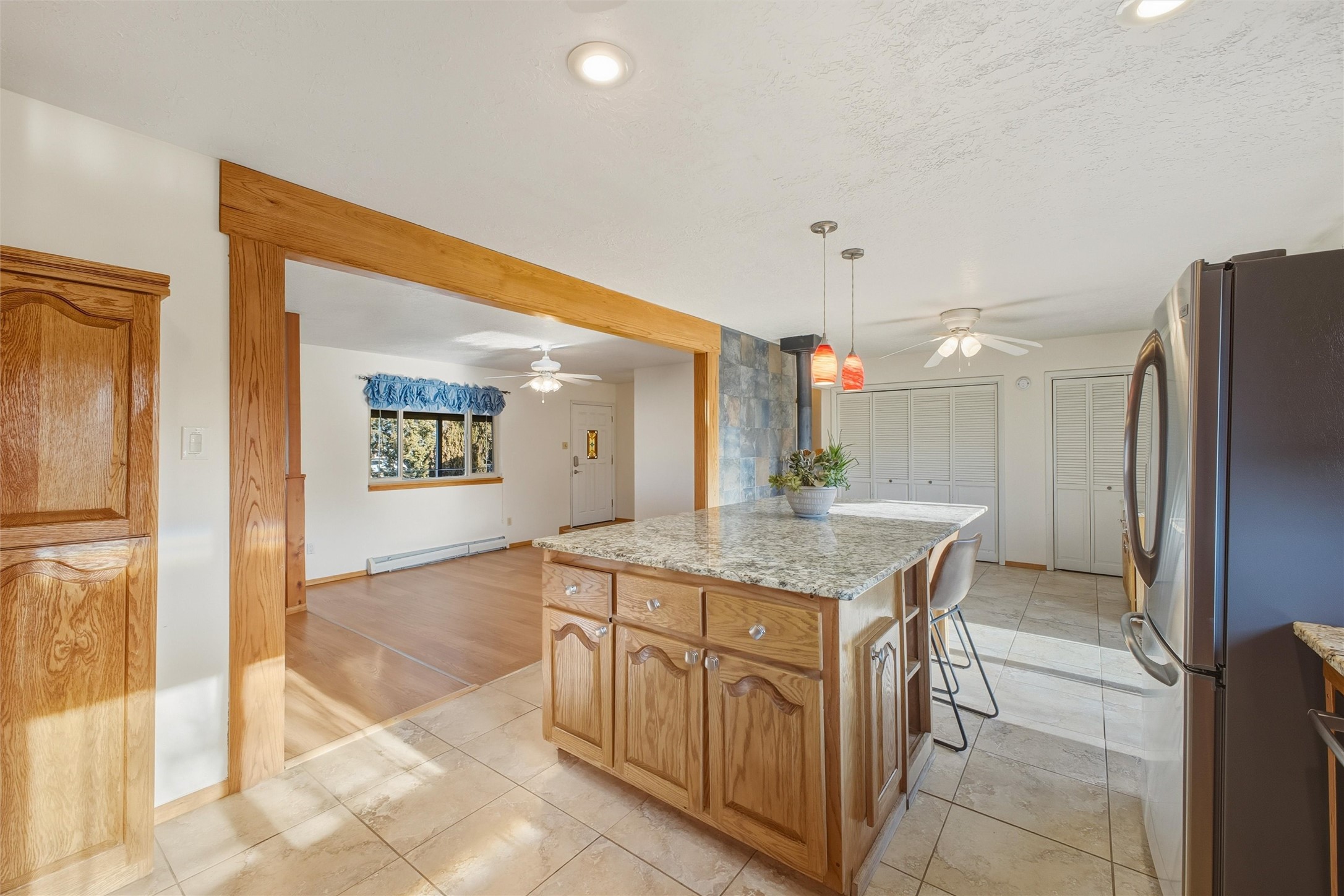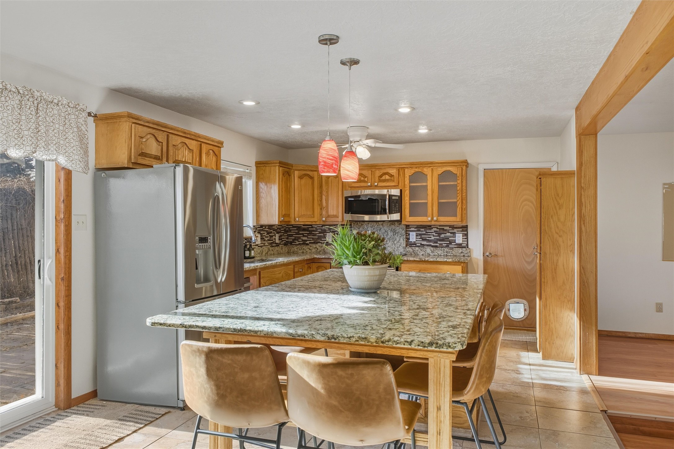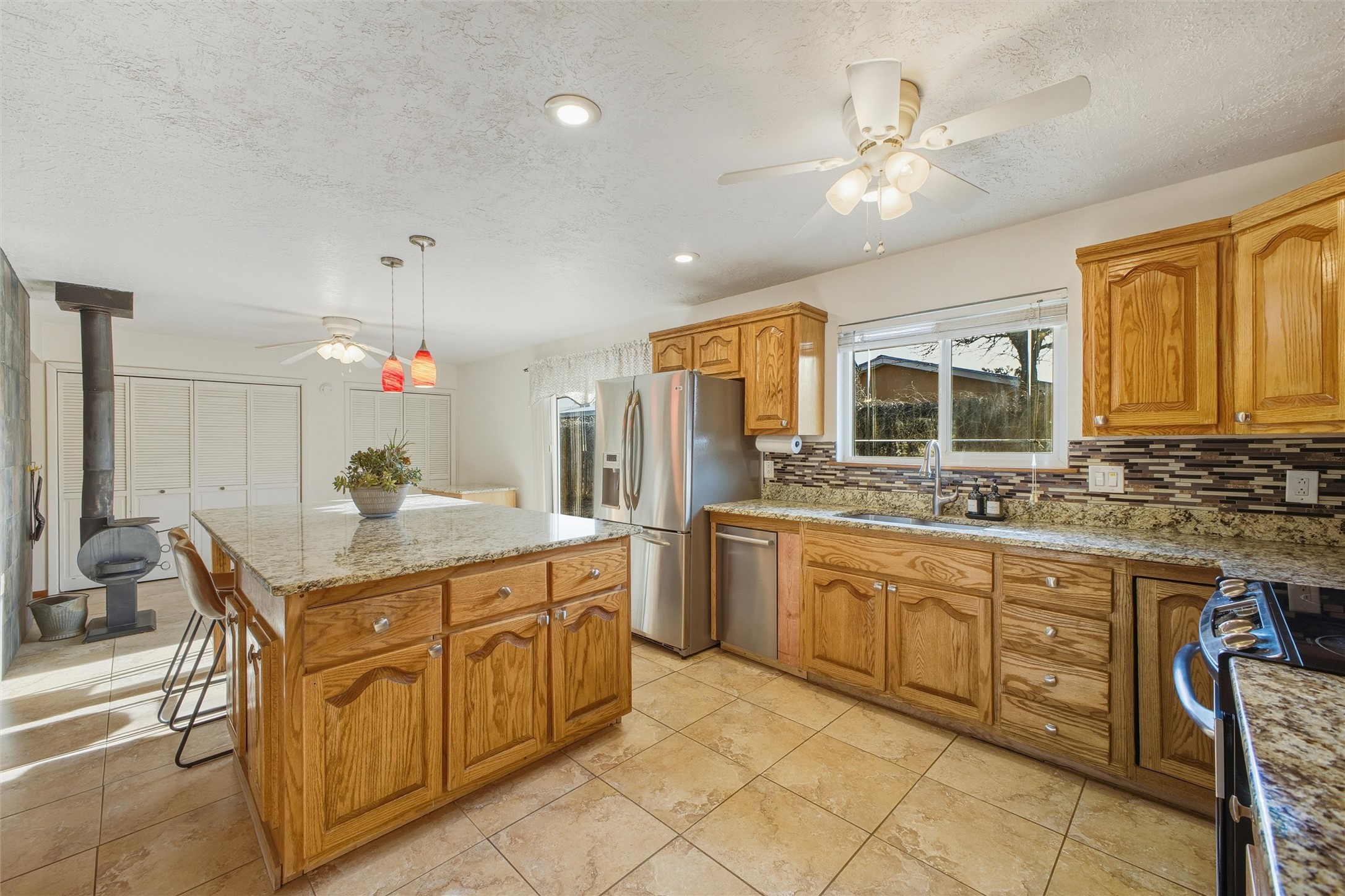 Nestled on over an acre of land with breathtaking mountain views, this updated and well-maintained home offers the perfect blend of modern convenience and rustic charm. From its spacious, light-filled interiors to its serene outdoor setting, this property provides the ideal environment for both relaxation and creativity. With a short commute to Los Alamos and Santa Fe, you can enjoy the peace and privacy of rural living without sacrificing convenience. The heart of the home is the expansive, modern kitchen. Featuring luxurious granite countertops, a large central island with extra storage, and stainless steel appliances, this kitchen is designed for both function and style. Whether you're preparing meals for the family or hosting friends, the layout is perfect for food prep and entertaining, with ample room to gather around the island. A charming wood burning stove located in the kitchen adds warmth and ambiance, creating a cozy focal point for winter mornings and evenings spent cooking and connecting. The kitchen flows seamlessly into the main living areas, offering an open and comfortable layout. The property offers an incredible amount of space for gardening, hobbies, or projects. Mature fruit trees add charm and productivity to the landscape, while the insulated shed provides excellent space for storage or can easily be used as a workshop. The home features an updated bathroom with modern fixtures and stylish finishes, offering both comfort and functionality. This is a rare opportunity to own a well-cared-for home with space to grow, stunning views, and easy access to nearby communities. A perfect balance of comfort, functionality, and location.