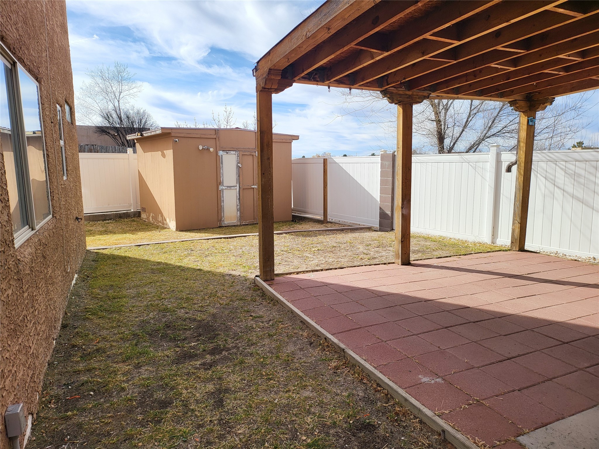 Fantastic location, 4 bedroom, 2.5 baths two story home in the Tierra Contenta neighborhood. Large corner lot and spacious floor plan. Main bedroom is on the ground level with full bath and walk-in closet. Upstairs are three bedrooms and a full bath. High ceilings in the living room, corner gas Kiva fireplace, 2 car garage and extra parking behind the gated drive. Fully fenced private yard with newer white vinyl fencing topped with solar lights. Covered patio area off the garage and shed for extra storage. Additional open space behind fence line, see aerial view for full lot size. No HOA fees, easy access to 599, I-25, Presbyterian Hospital, trails, schools, library, shopping, and restaurants.