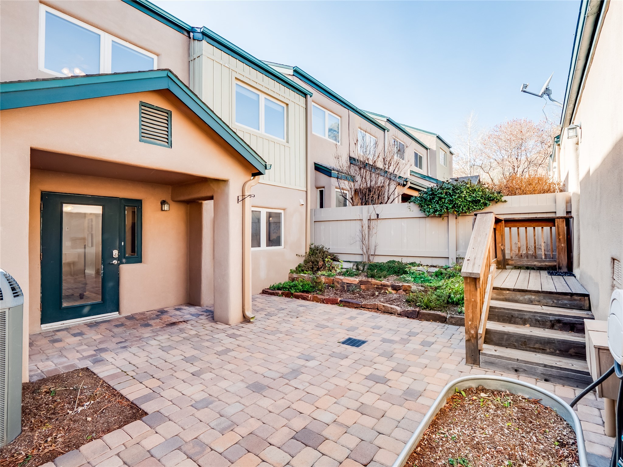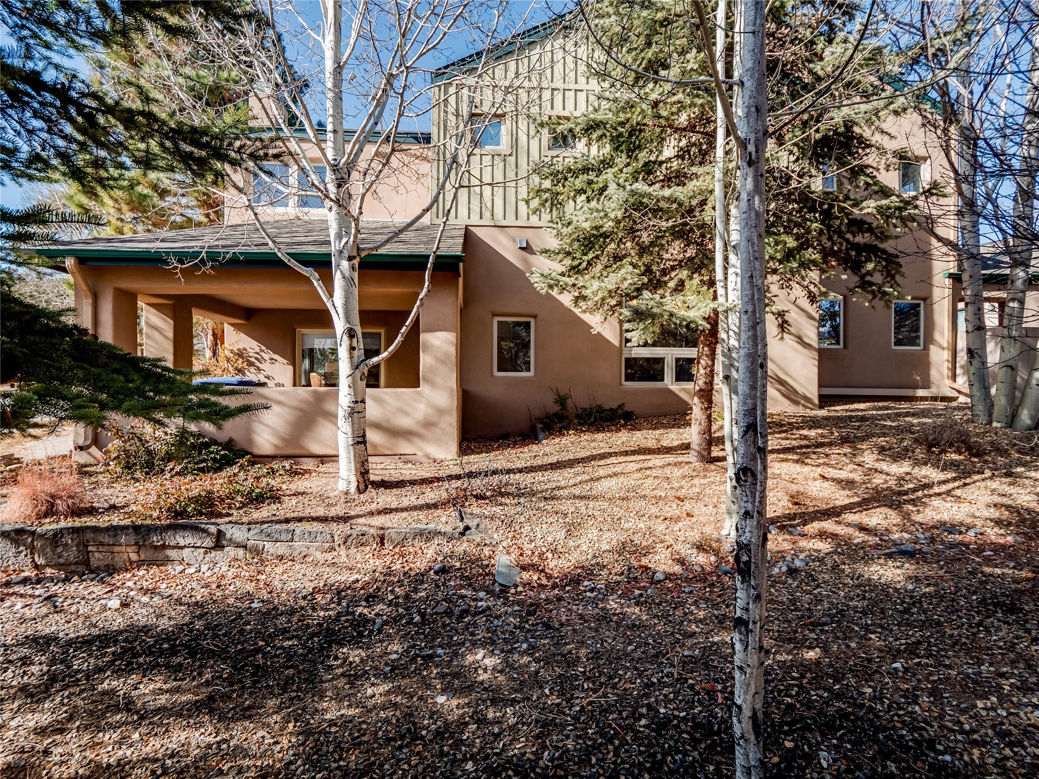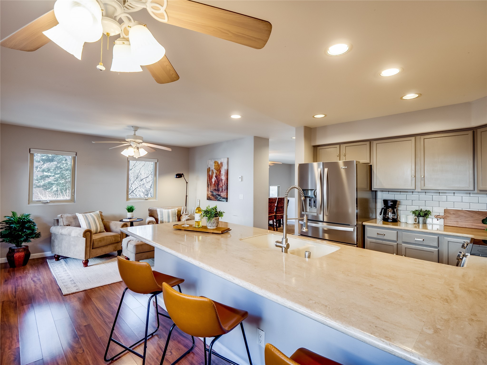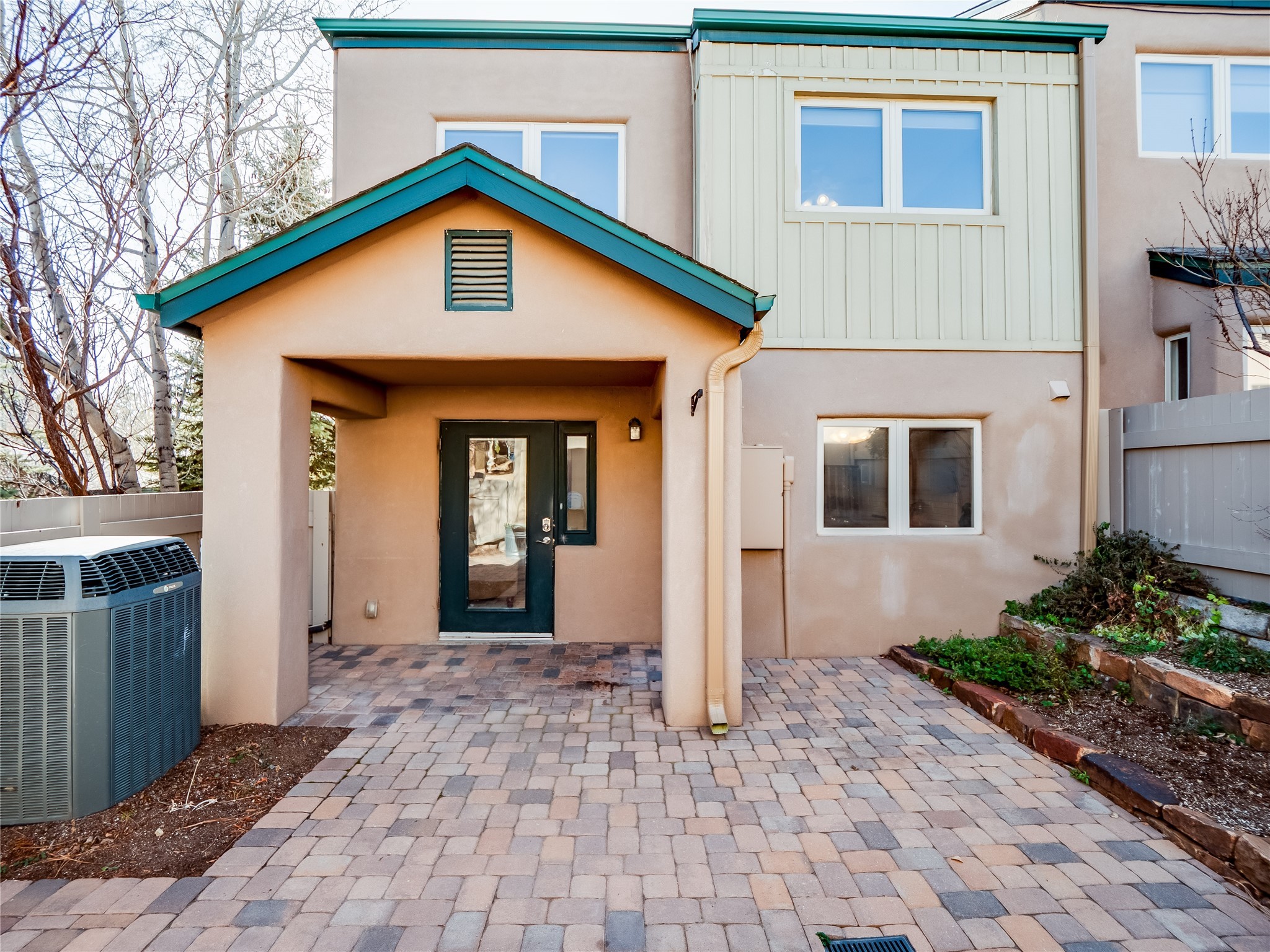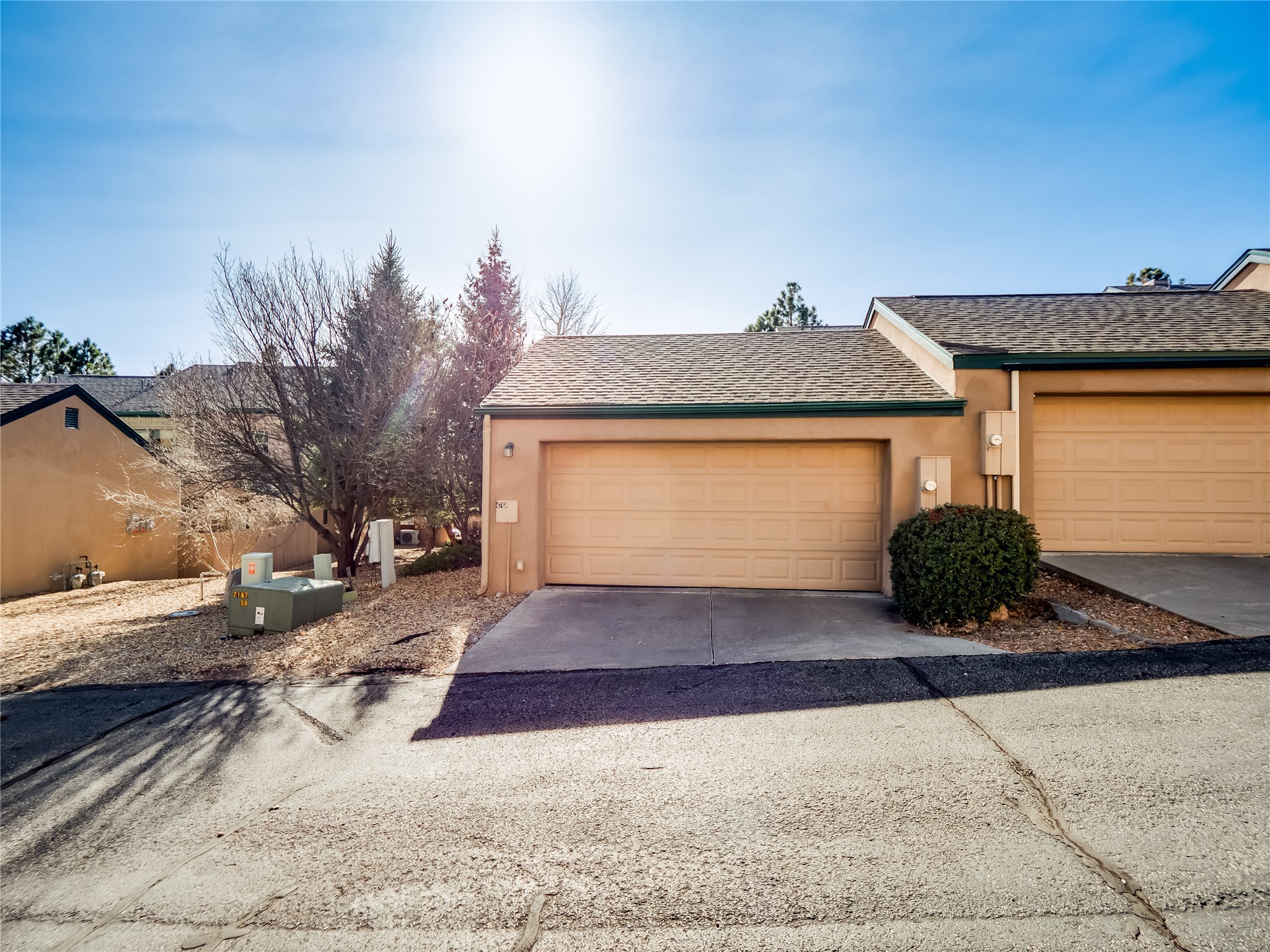 Set in the desirable Quemazon community, this modern two-story townhome offers canyon-edge living surrounded by natural beauty. The mature front yard welcomes you with tall aspens, soft landscaping, and a covered patio leading to the main entrance. Step inside to a large foyer that opens into a bright, living room featuring rich laminate flooring throughout the main living areas. A wood-burning fireplace anchors the living room, framed by windows that capture views of the surrounding forested terrain. Sliding glass doors extend the space onto the front patio for seamless indoor-outdoor living. Just a short set of stairs up, the dining room awaits, complete with a spacious walk-in pantry and storage closet, plus a convenient powder room on the same level. Toward the back of the home, the kitchen blends modern style and function with granite countertops, painted gray cabinetry, and durable tile flooring. Stainless steel appliances, a peninsula island with bar seating, and flexible layout options, including room for a sit-down dining table or casual breakfast area. Step out to the private back courtyard patio, finished with pavers, planter beds, and space for outdoor dining or gardening. Stairs lead directly to the attached two-car garage for everyday convenience. Upstairs, two well-sized guest bedrooms include carpet flooring, walk-in closets, and generous natural light. A full guest bathroom features a double-sink vanity and tiled shower and tub surround. The hallway also includes a dedicated laundry closet for easy access. The primary en-suite offers a peaceful retreat with vaulted ceilings, plush carpet flooring, a large walk-in closet, and a spa-inspired bathroom. Relax in the separate tiled soaking tub or unwind in the oversized walk-in tiled shower. A double-sink vanity completes the space with elevated style and functionality. Move-in ready and thoughtfully designed, this home enjoys an exceptional location close to trails, and parks. Book your showing today!