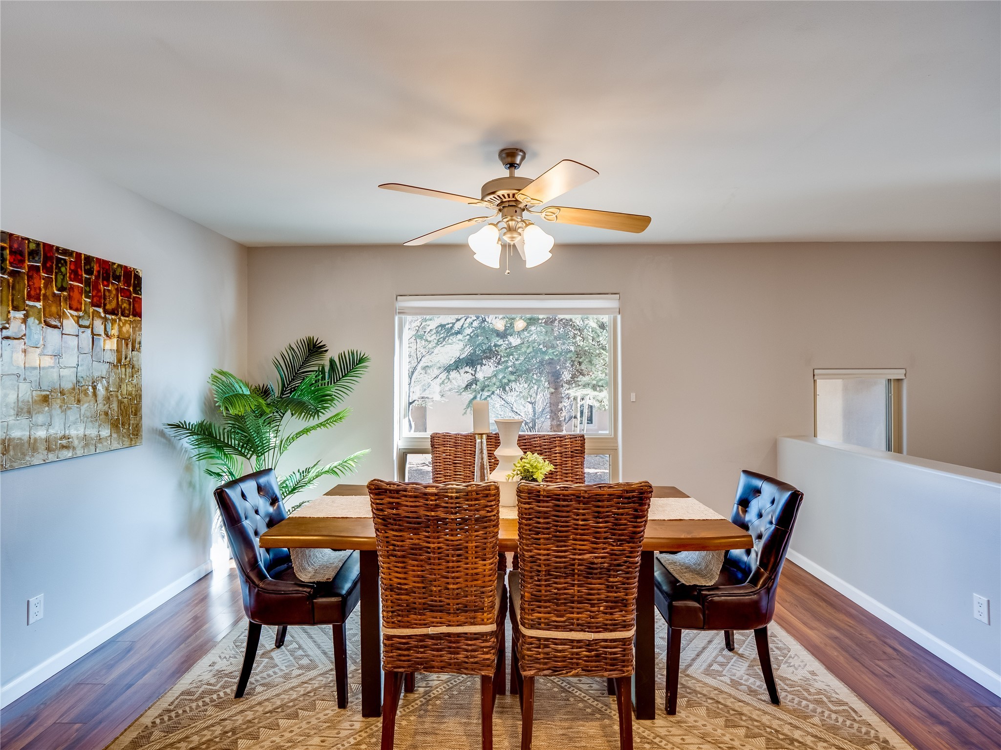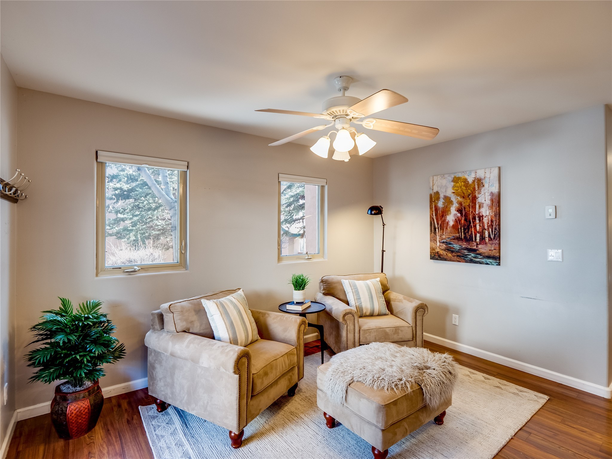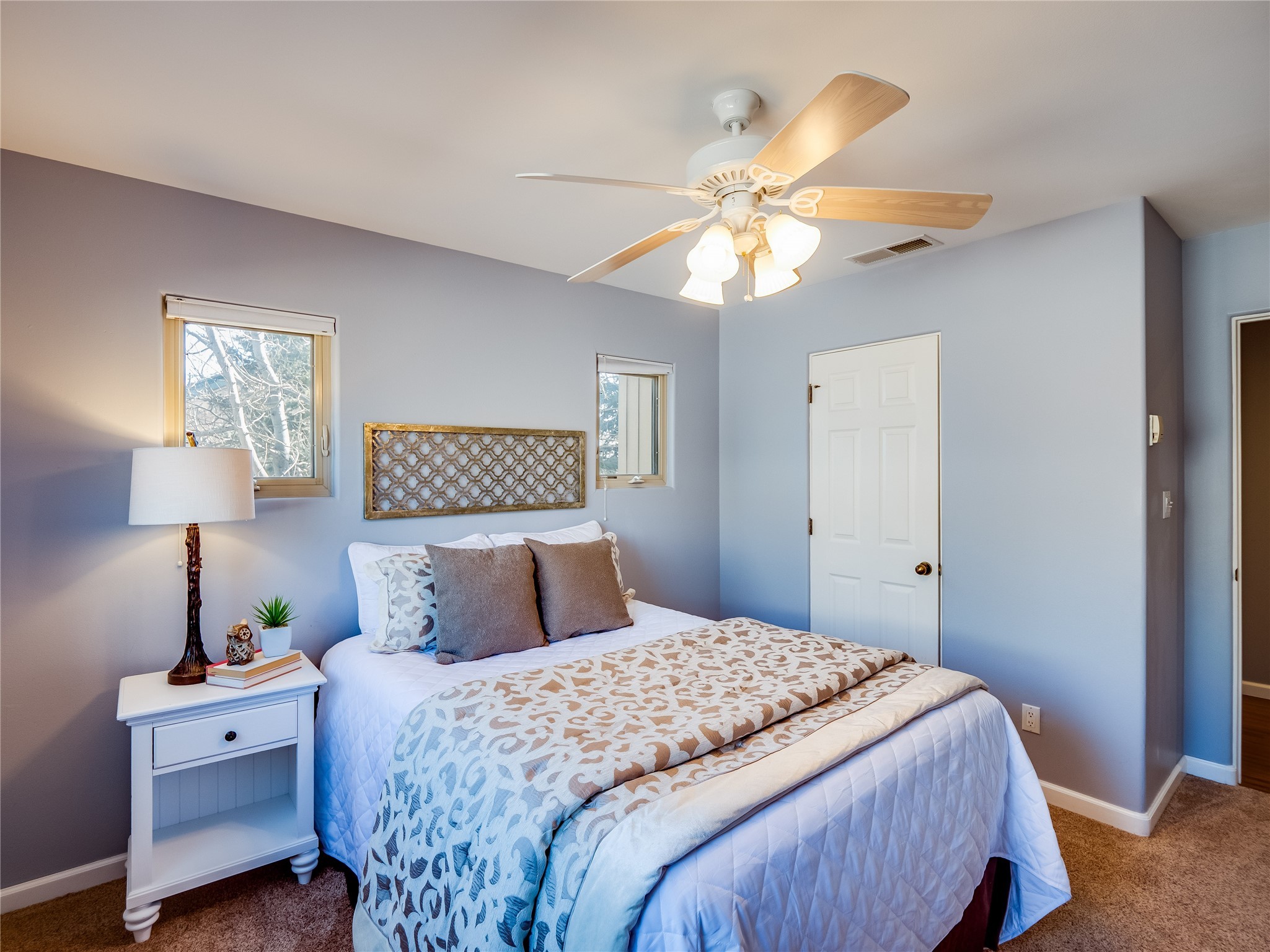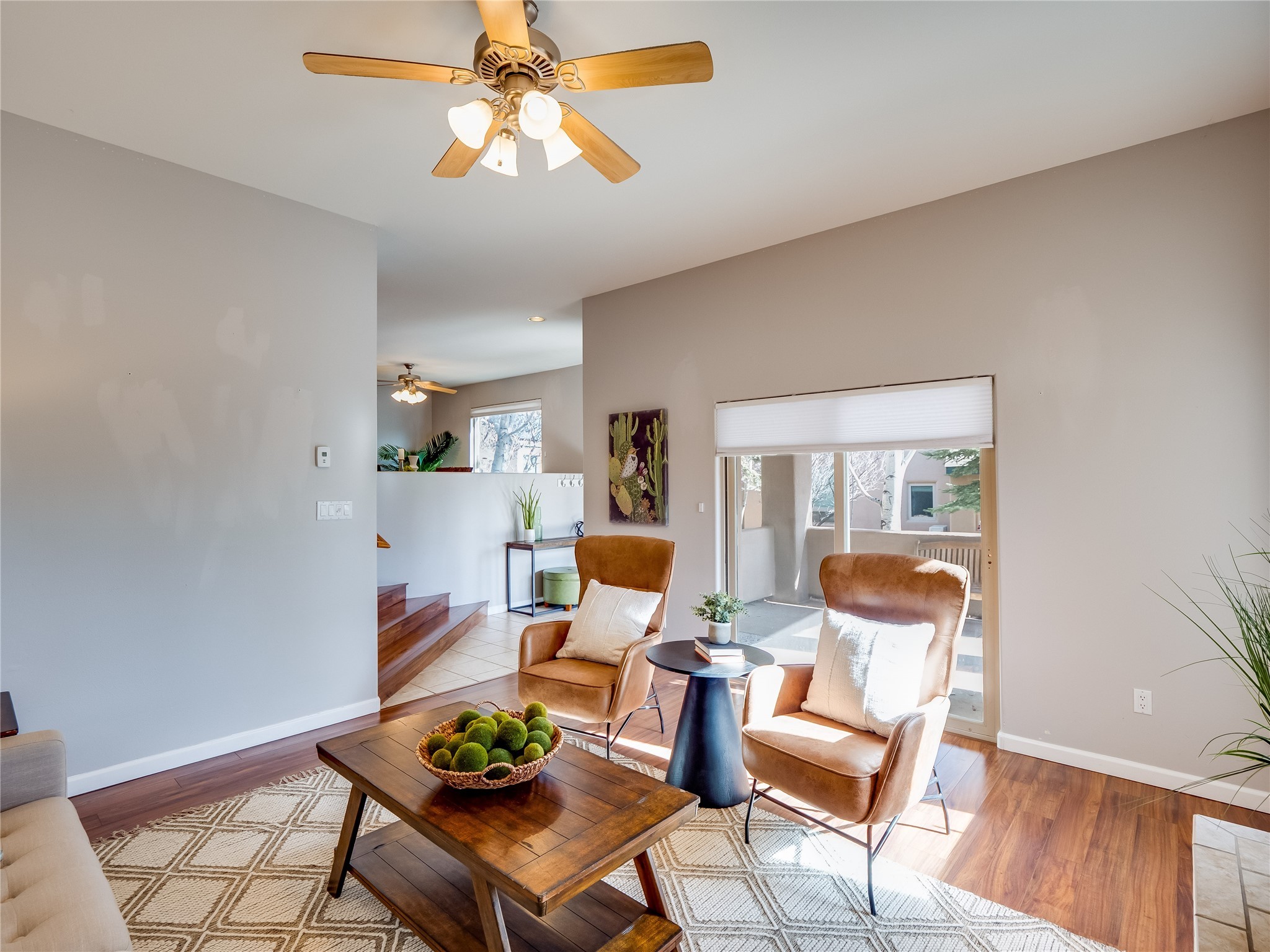 Set in the desirable Quemazon community, this modern two-story townhome offers canyon-edge living surrounded by natural beauty. The mature front yard welcomes you with tall aspens, soft landscaping, and a covered patio leading to the main entrance. Step inside to a large foyer that opens into a bright, living room featuring rich laminate flooring throughout the main living areas. A wood-burning fireplace anchors the living room, framed by windows that capture views of the surrounding forested terrain. Sliding glass doors extend the space onto the front patio for seamless indoor-outdoor living. Just a short set of stairs up, the dining room awaits, complete with a spacious walk-in pantry and storage closet, plus a convenient powder room on the same level. Toward the back of the home, the kitchen blends modern style and function with granite countertops, painted gray cabinetry, and durable tile flooring. Stainless steel appliances, a peninsula island with bar seating, and flexible layout options, including room for a sit-down dining table or casual breakfast area. Step out to the private back courtyard patio, finished with pavers, planter beds, and space for outdoor dining or gardening. Stairs lead directly to the attached two-car garage for everyday convenience. Upstairs, two well-sized guest bedrooms include carpet flooring, walk-in closets, and generous natural light. A full guest bathroom features a double-sink vanity and tiled shower and tub surround. The hallway also includes a dedicated laundry closet for easy access. The primary en-suite offers a peaceful retreat with vaulted ceilings, plush carpet flooring, a large walk-in closet, and a spa-inspired bathroom. Relax in the separate tiled soaking tub or unwind in the oversized walk-in tiled shower. A double-sink vanity completes the space with elevated style and functionality. Move-in ready and thoughtfully designed, this home enjoys an exceptional location close to trails, and parks. Book your showing today!