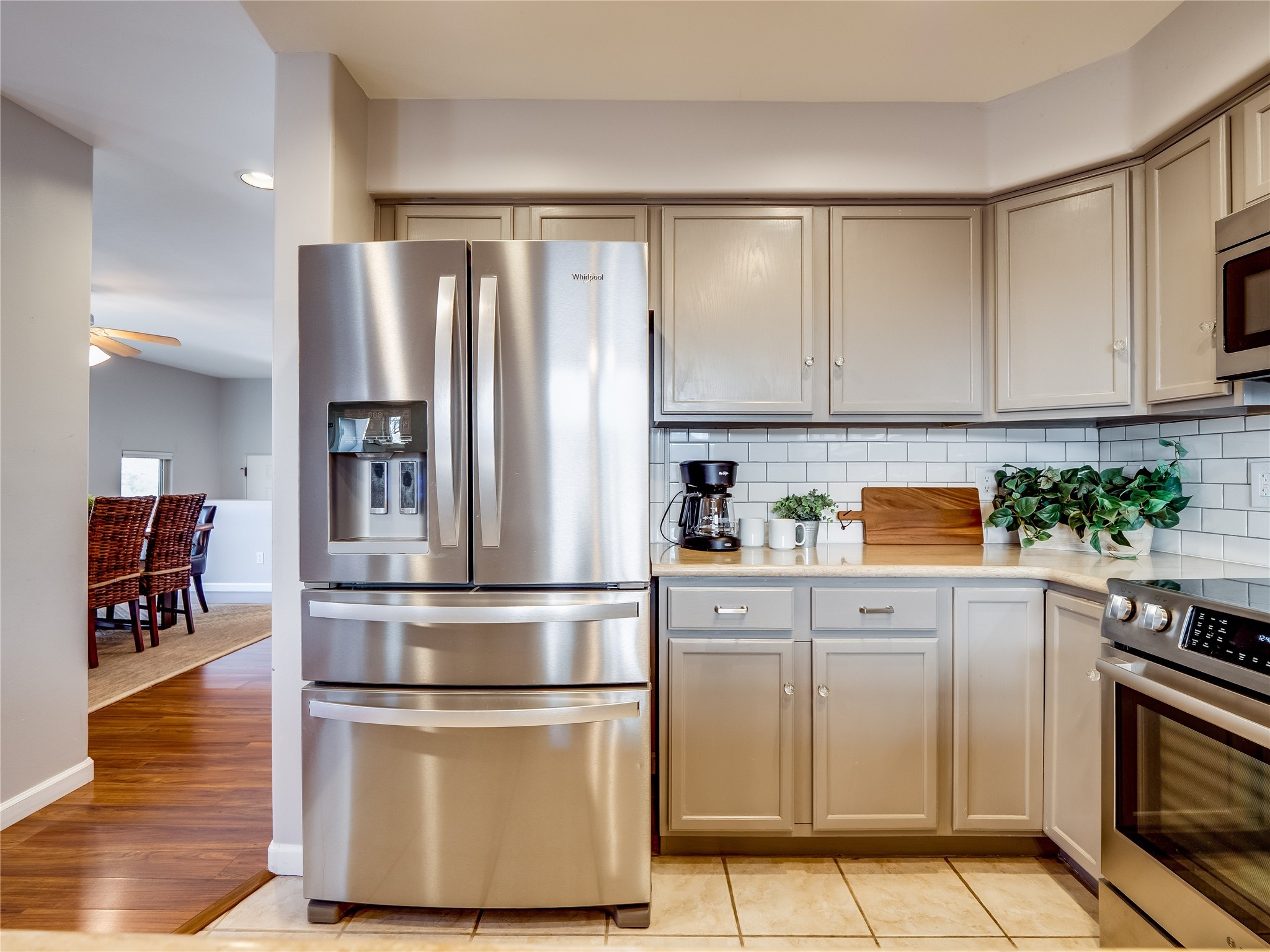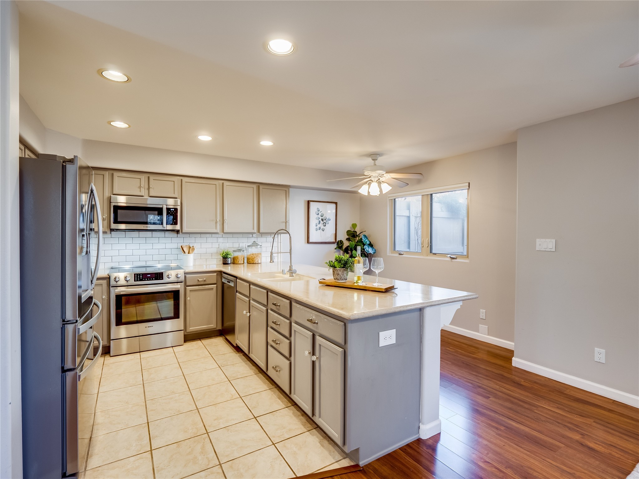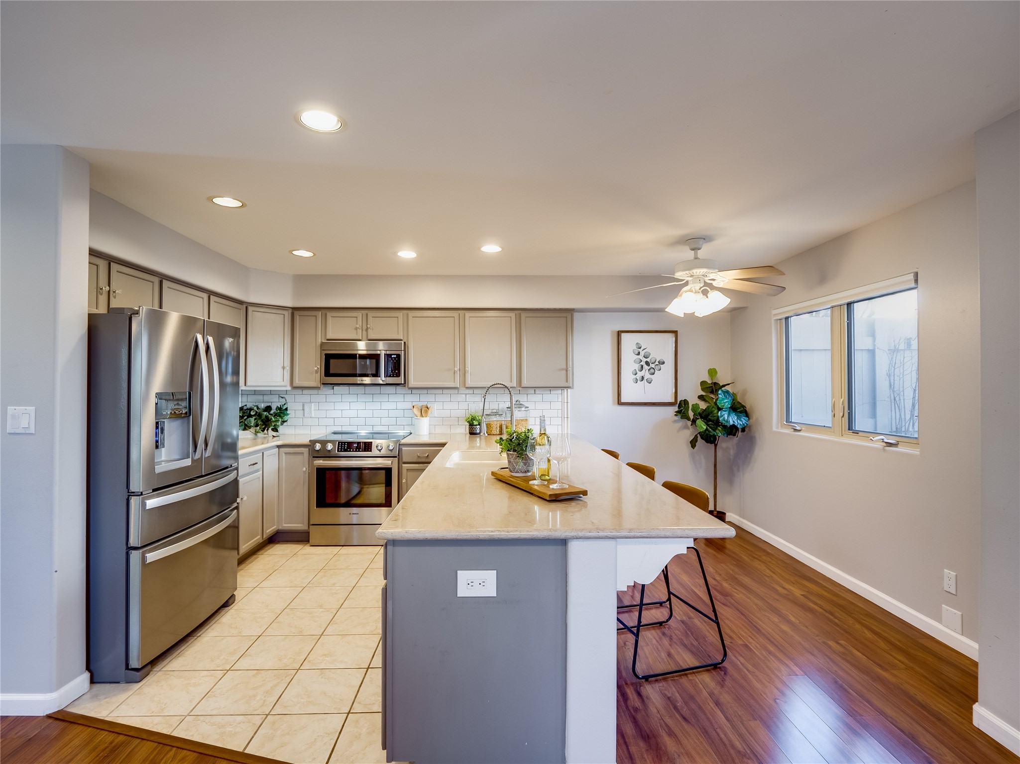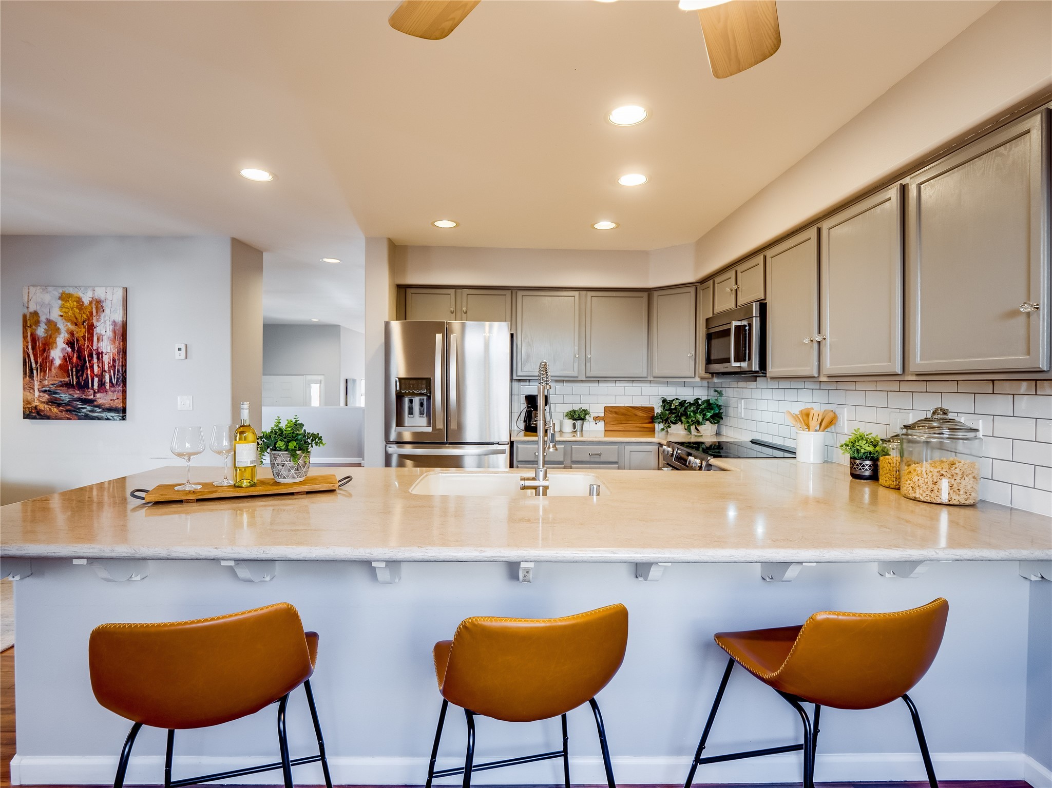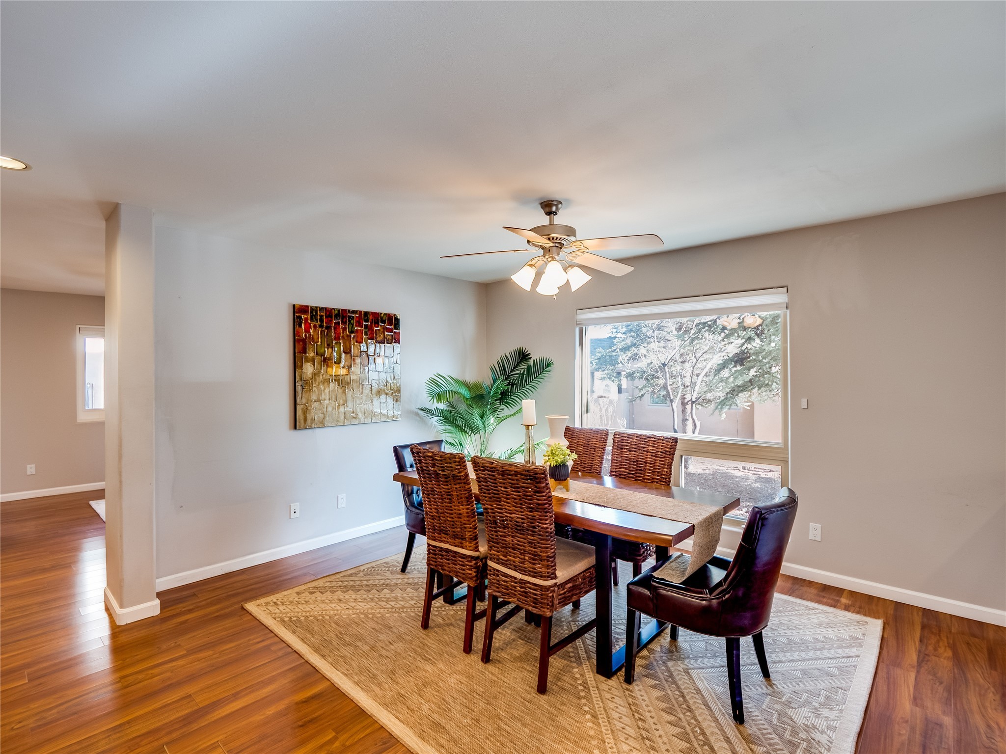 Set in the desirable Quemazon community, this modern two-story townhome offers canyon-edge living surrounded by natural beauty. The mature front yard welcomes you with tall aspens, soft landscaping, and a covered patio leading to the main entrance. Step inside to a large foyer that opens into a bright, living room featuring rich laminate flooring throughout the main living areas. A wood-burning fireplace anchors the living room, framed by windows that capture views of the surrounding forested terrain. Sliding glass doors extend the space onto the front patio for seamless indoor-outdoor living. Just a short set of stairs up, the dining room awaits, complete with a spacious walk-in pantry and storage closet, plus a convenient powder room on the same level. Toward the back of the home, the kitchen blends modern style and function with granite countertops, painted gray cabinetry, and durable tile flooring. Stainless steel appliances, a peninsula island with bar seating, and flexible layout options, including room for a sit-down dining table or casual breakfast area. Step out to the private back courtyard patio, finished with pavers, planter beds, and space for outdoor dining or gardening. Stairs lead directly to the attached two-car garage for everyday convenience. Upstairs, two well-sized guest bedrooms include carpet flooring, walk-in closets, and generous natural light. A full guest bathroom features a double-sink vanity and tiled shower and tub surround. The hallway also includes a dedicated laundry closet for easy access. The primary en-suite offers a peaceful retreat with vaulted ceilings, plush carpet flooring, a large walk-in closet, and a spa-inspired bathroom. Relax in the separate tiled soaking tub or unwind in the oversized walk-in tiled shower. A double-sink vanity completes the space with elevated style and functionality. Move-in ready and thoughtfully designed, this home enjoys an exceptional location close to trails, and parks. Book your showing today!